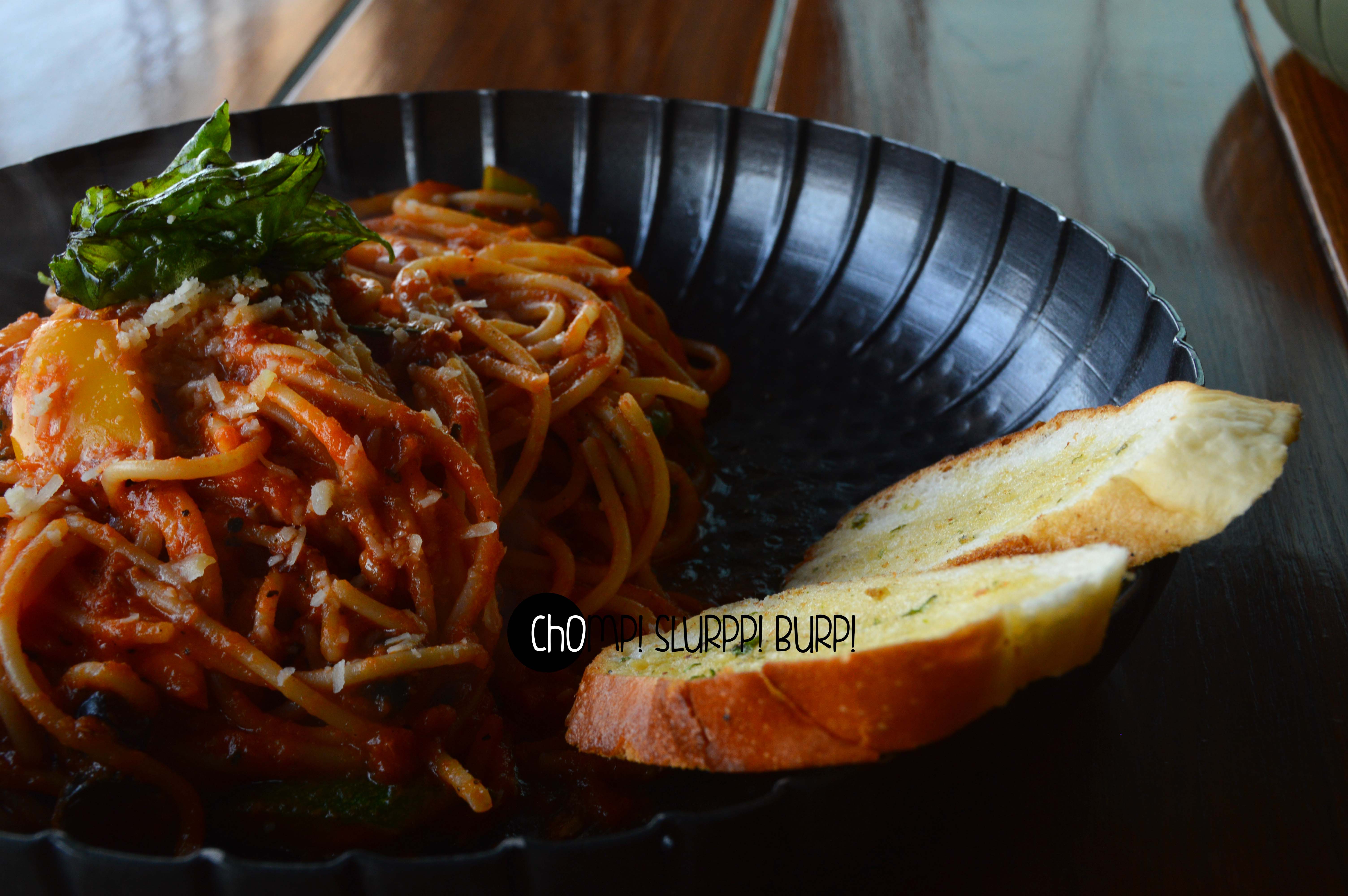 The menu is beautiful and pretty extensive – from some pretty interesting fusion appetizers to a sumptuous main course menu. We went overboard and ordered a portion of chicken and jalapeno bruschettas, Molecular puchka shots, spaghetti arabiata and a chicken lababdar meal combo.