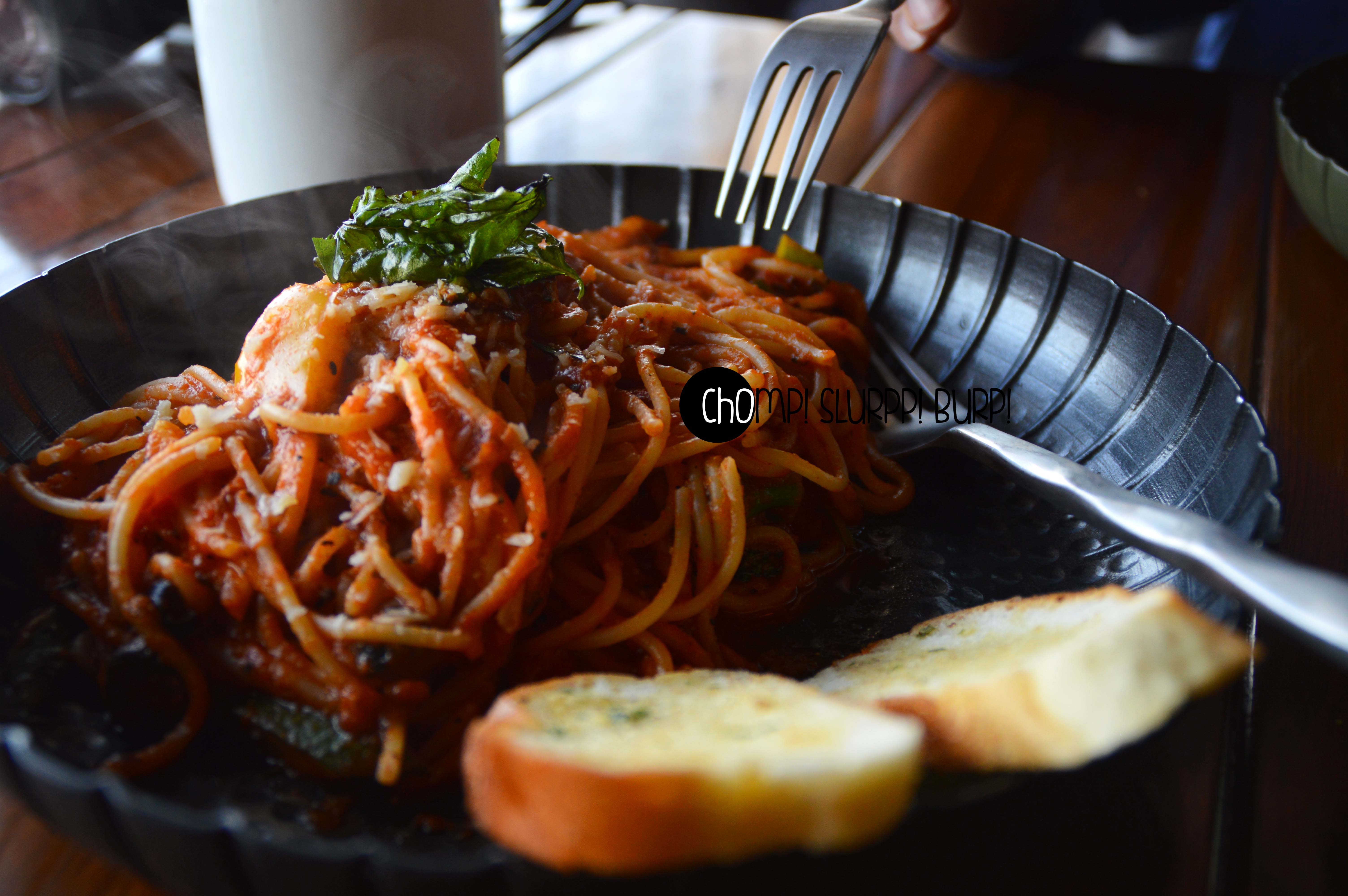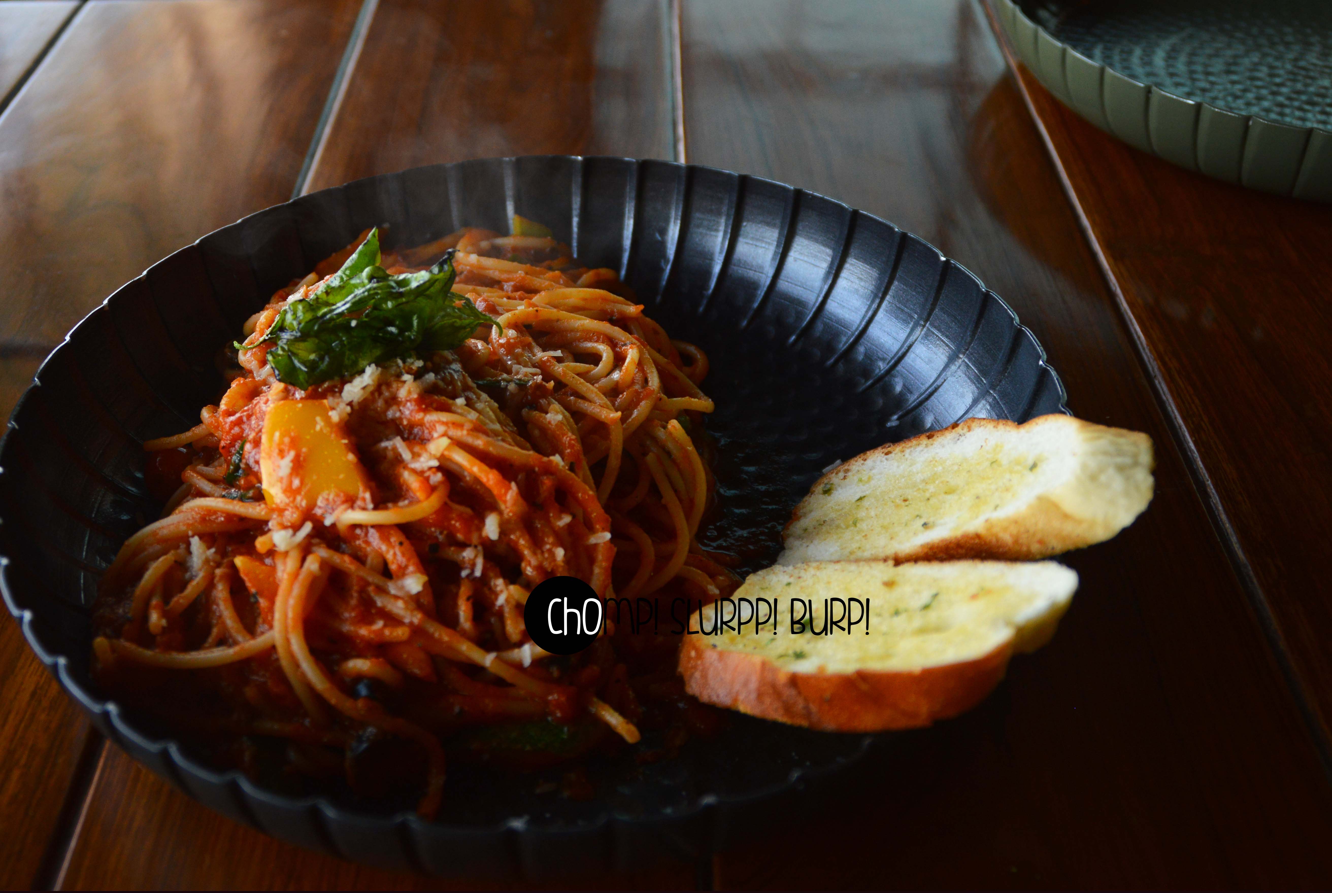 The spaghetti came in a barrel top shaped plate topped with a basil leaf. The pasta was done al dente – the creamy crushed tomato sauce, crunchy zucchini, broccoli, olives and bell pepper and slight flavours of parmesean – very toothsome.