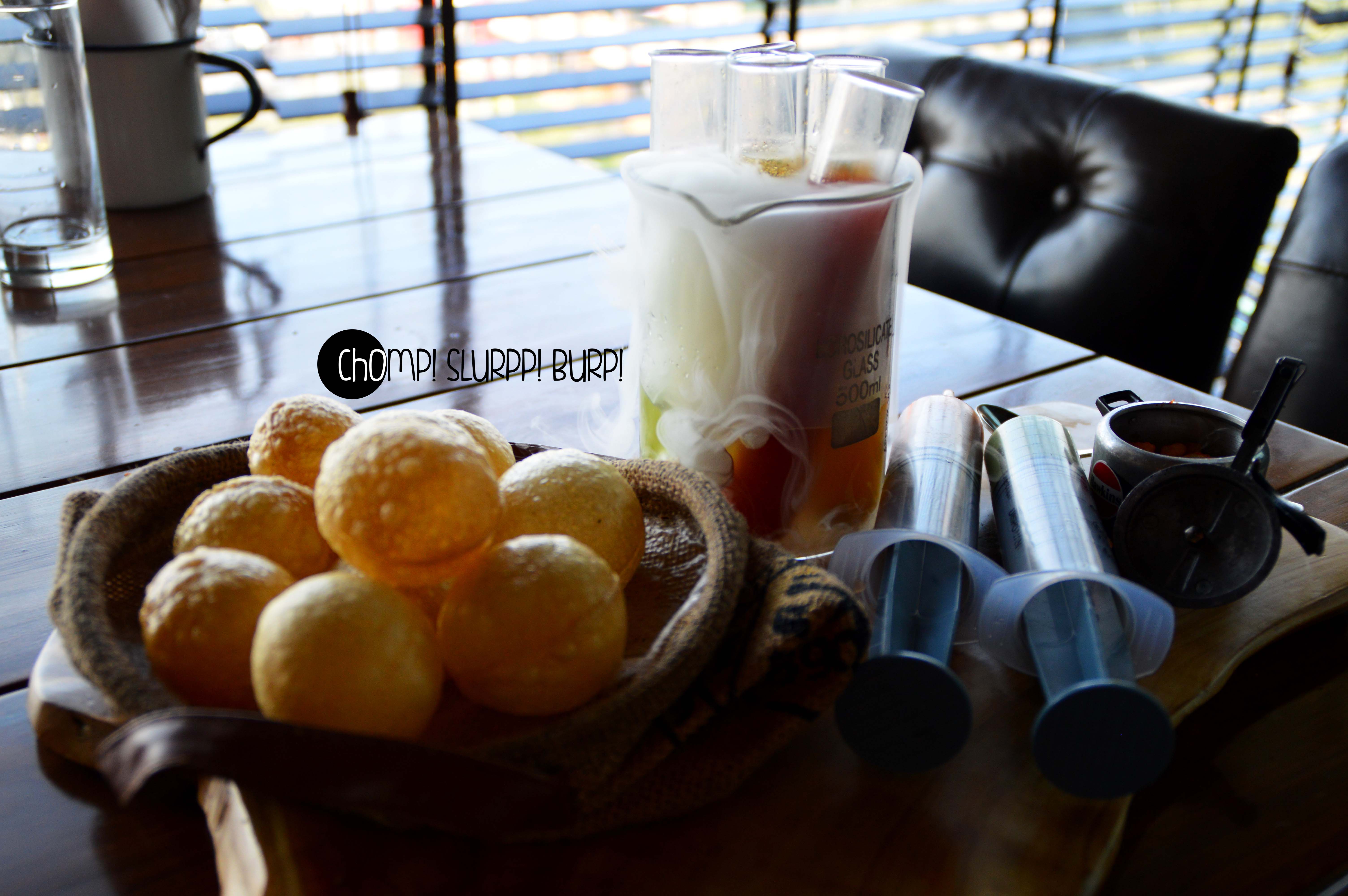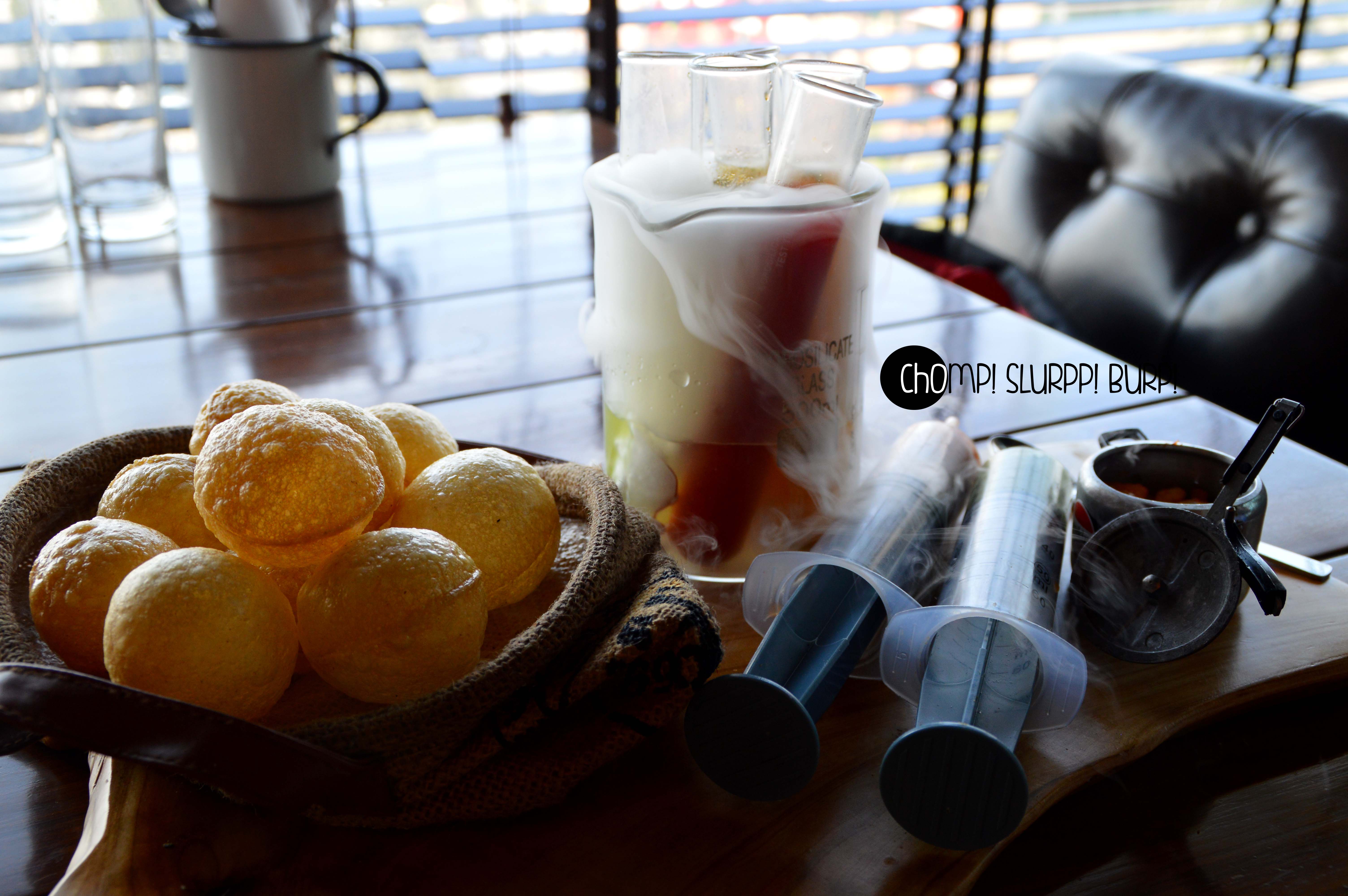The puchka shots were like the future of the street favourite gol gappe. The ensemble came on a wooden platter with gol gappas in a gunny bag, syringes full of mint and tamarind chutneys, the masala in a cute little cooker (that instantly reminded me of the tiny Hawkins I had when I was a kid) and test tubes full of 5 different kinds of flavoured water. The dry ice evaporating created a beautiful mystical effect. The off-beat zests of the water was amaze-balls – the pineapple, mango and beetroot were my favourite!