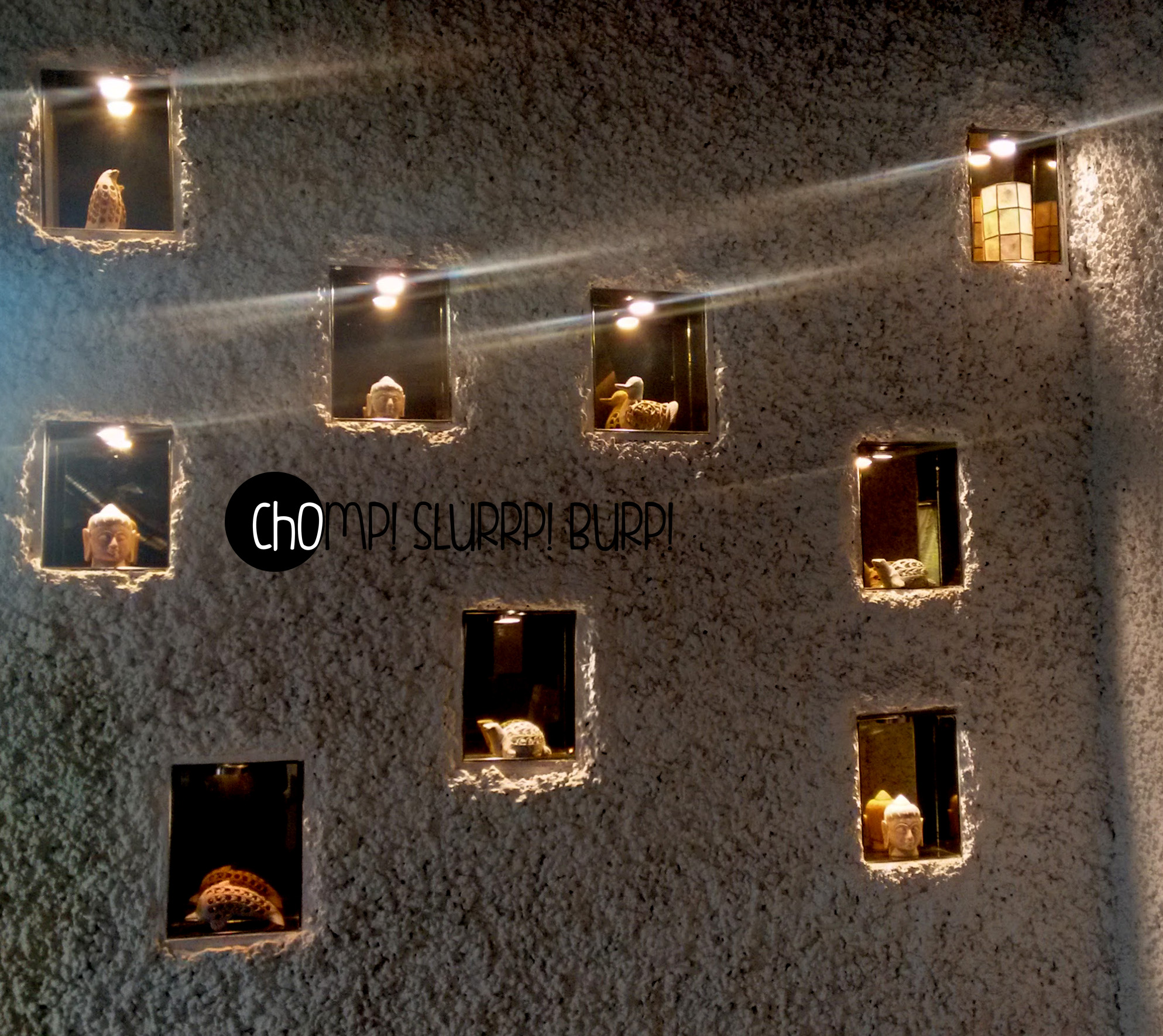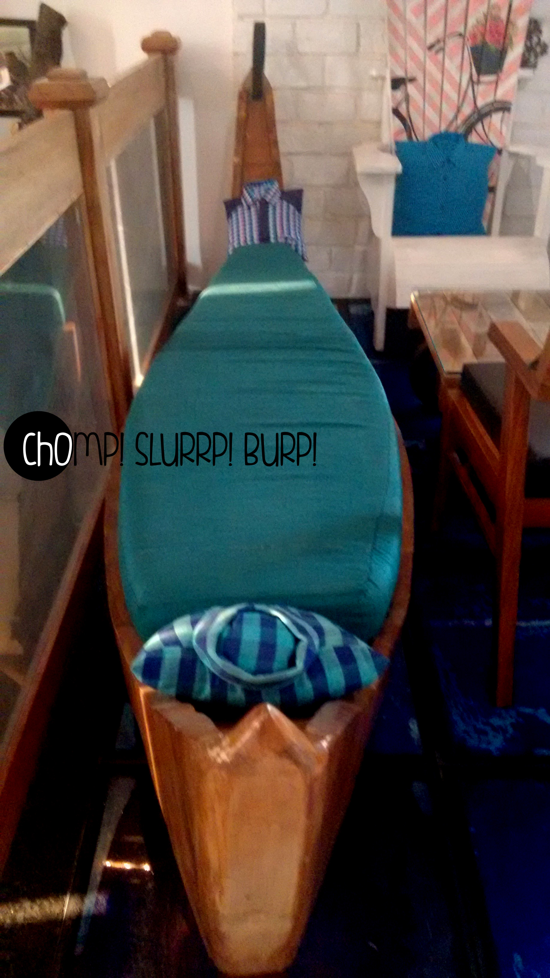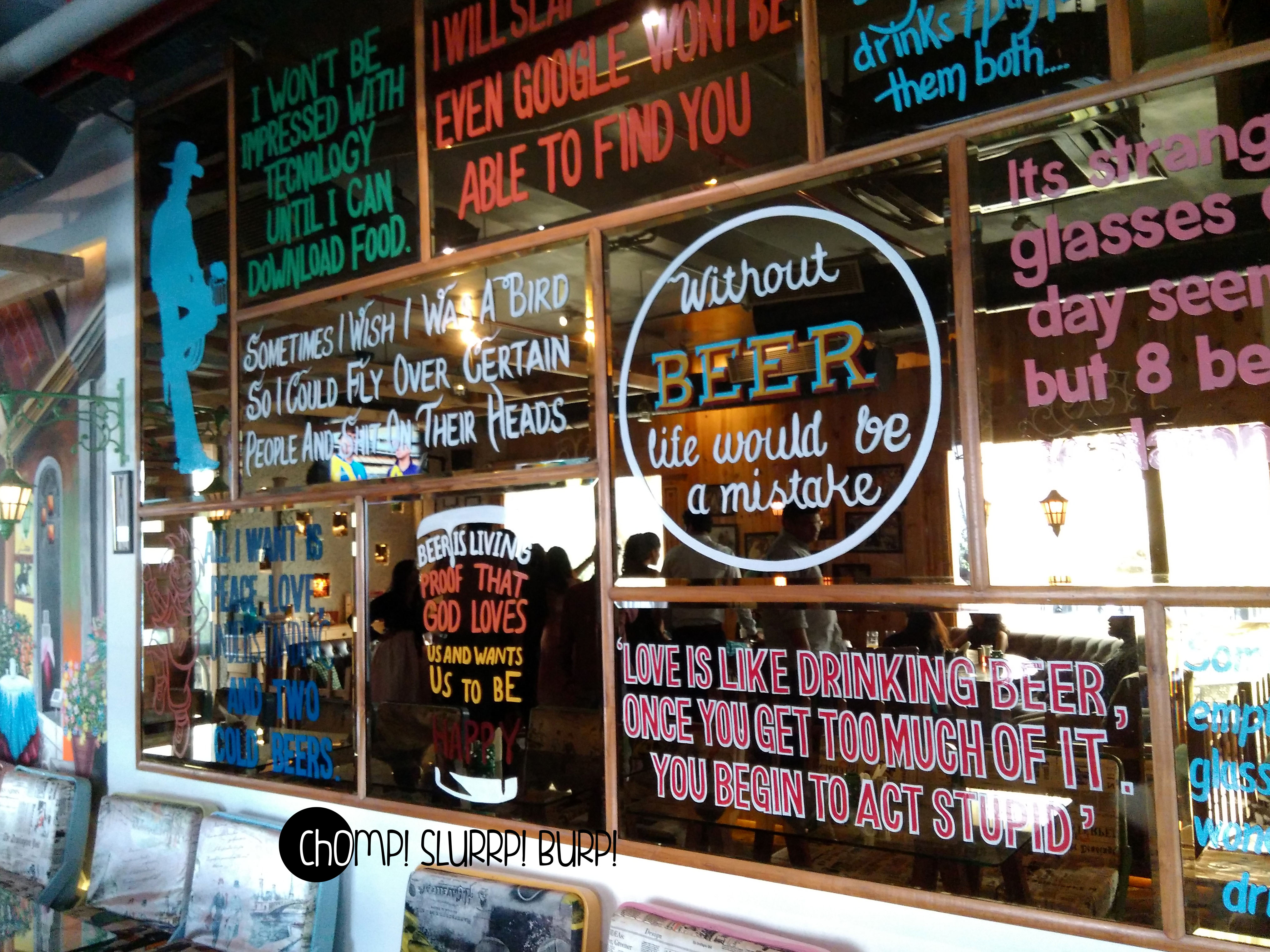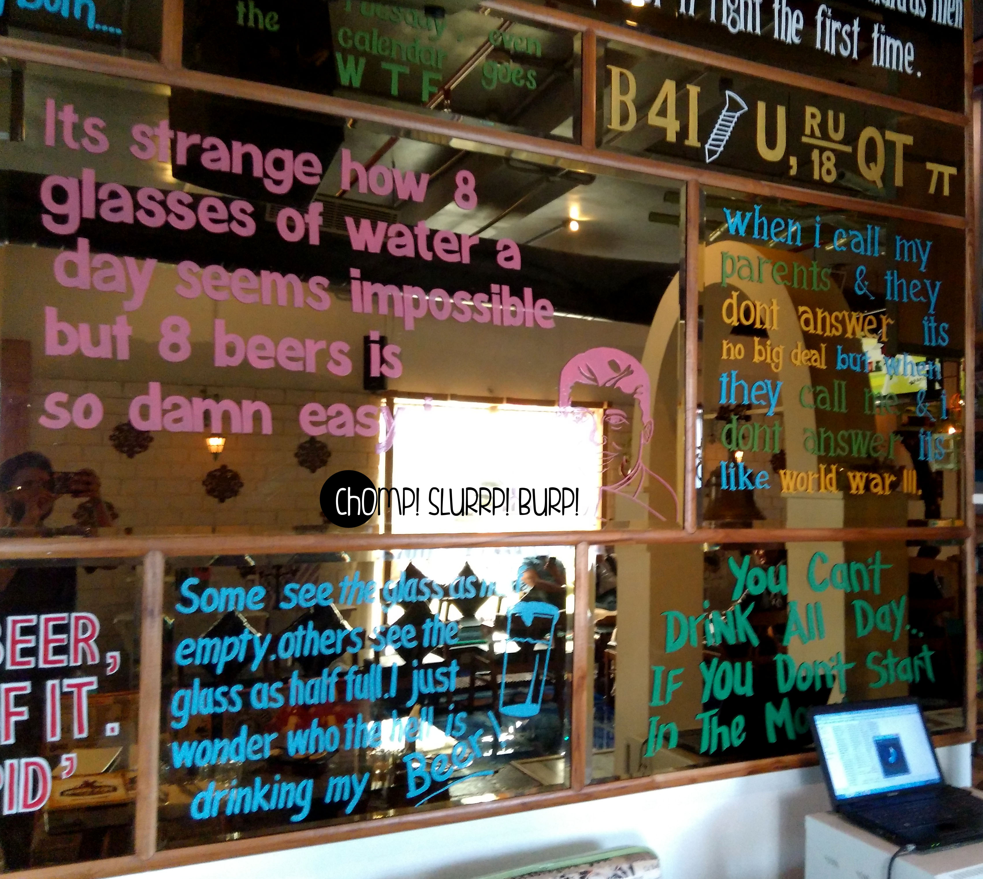 A standalone building with an eating area on the ground floor, a clubbing area in the basement and the brewery on the first floor. Towards their left, they have a garden with painted bicycles and white garden chairs. The ambiance inside is an exquisite amalgamation. Circular couches, glass top tables, chairs made up of painted suitcases with printed cushion tops. They have a glass wall with quirky quotes written in bright colours. A white textured wall holds lighted lamps. White, flowy curtains complementing this wall hang around the windows. There is a faux tree with bird cages hanging from its branches. A more interesting seating option is the cushioned canoe (which immediately made me think of that’s exactly how Joey and Chandler should have put theirs to use. :P) The place is full of interesting props and you will not have a riot spotting each one of them – my favourites – the shirt dressed cushions and the beer pong cap which reminded me of the one owned by Seeley Booth from popular TV show, BONES.
