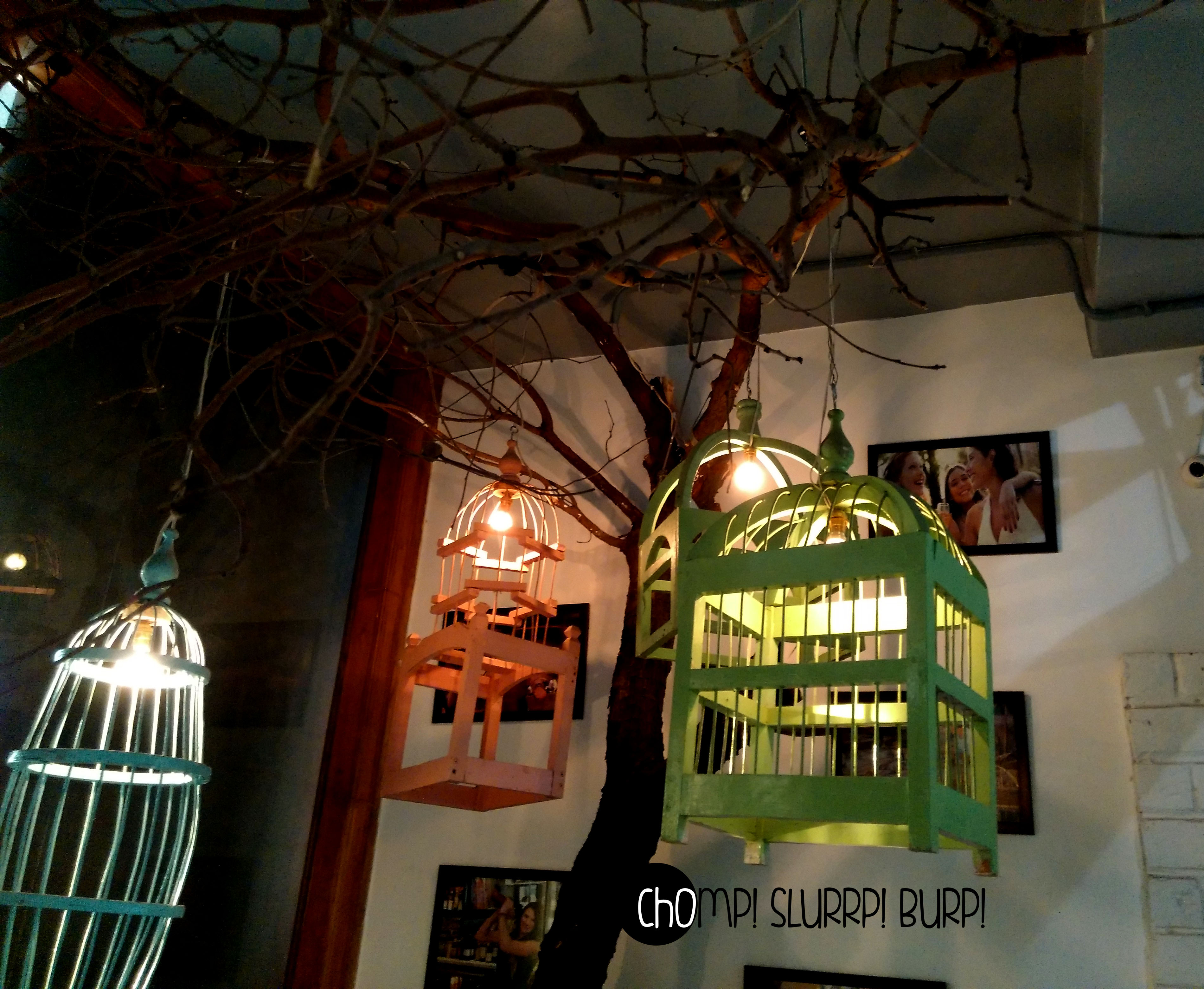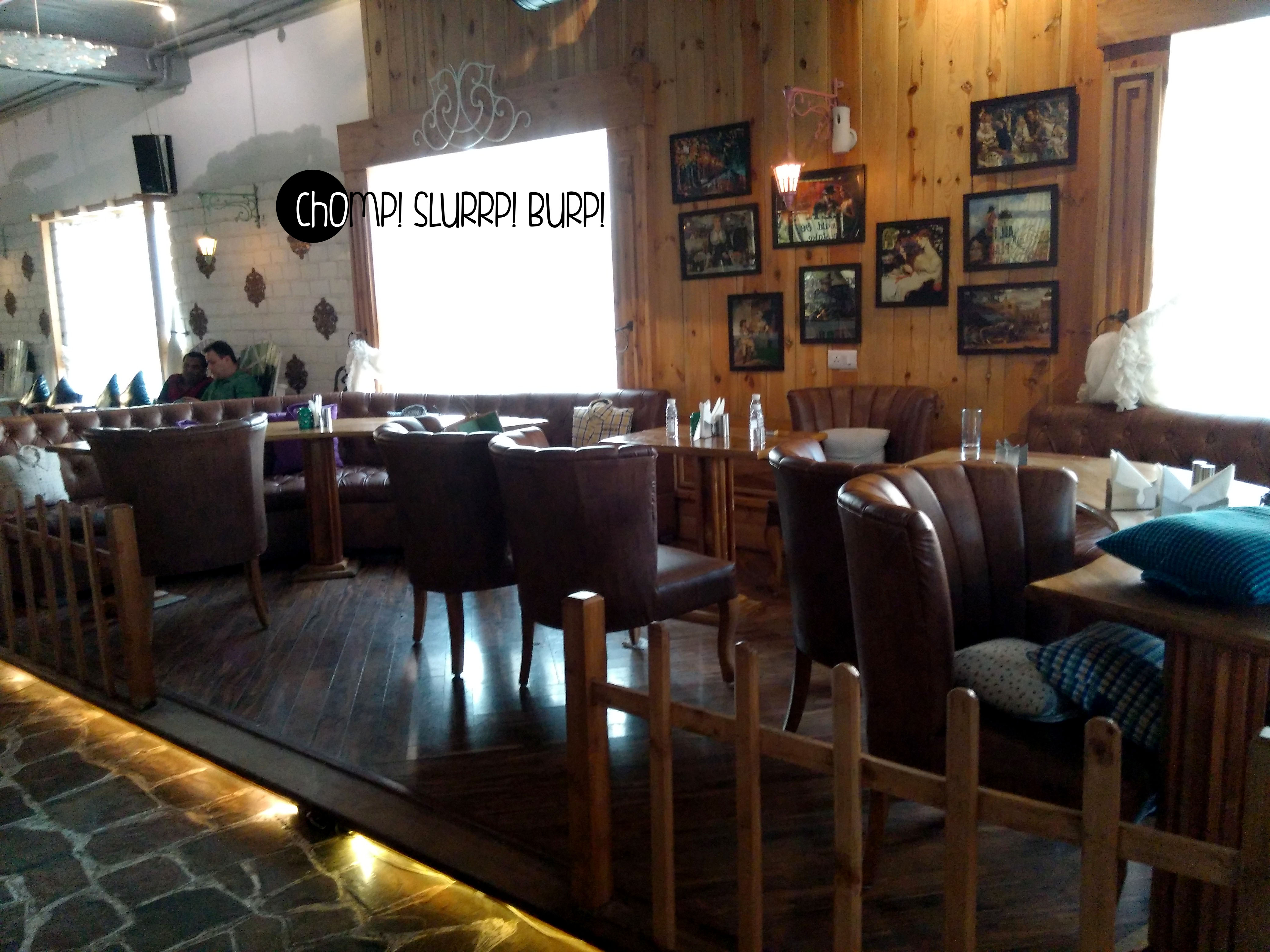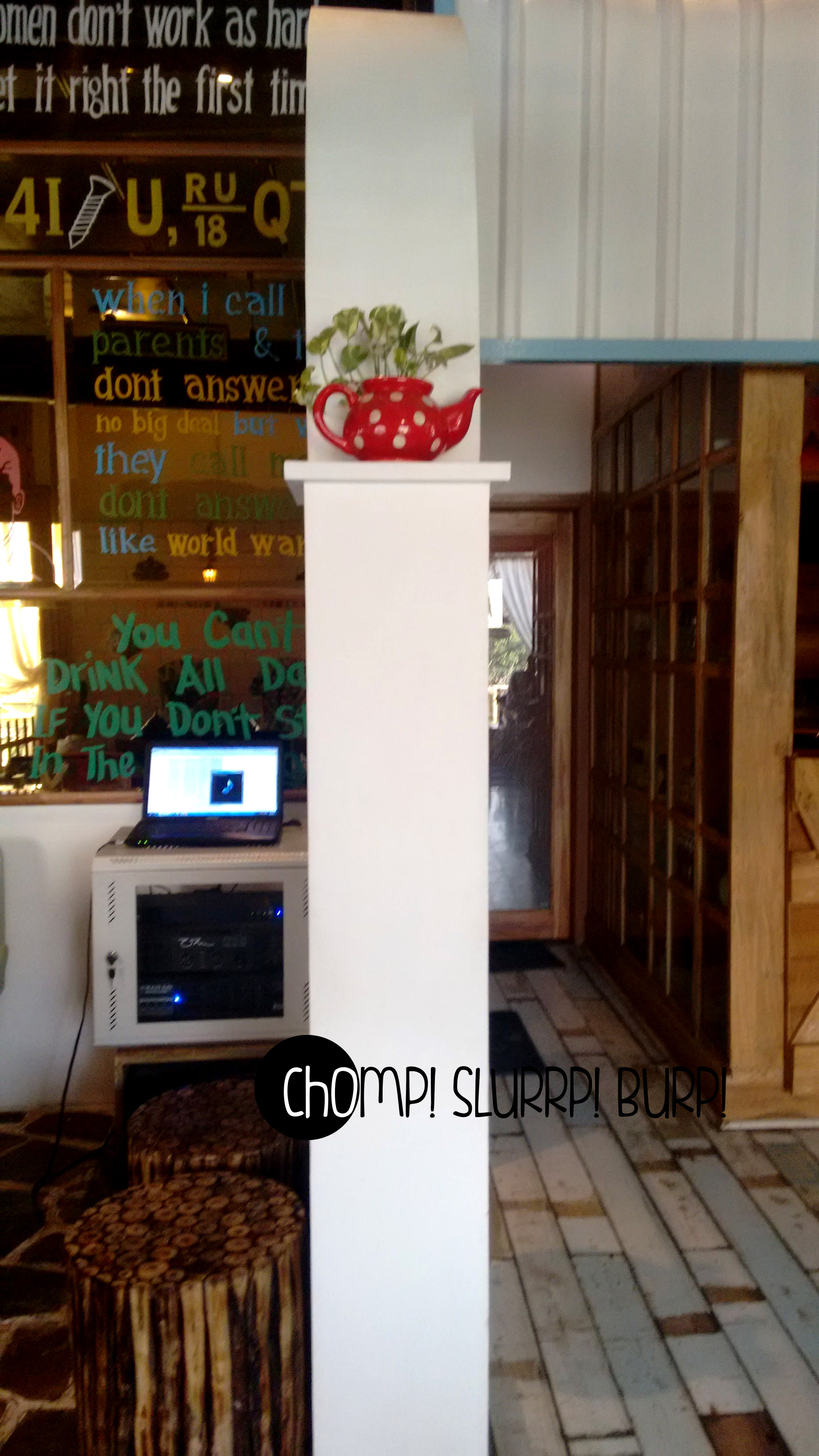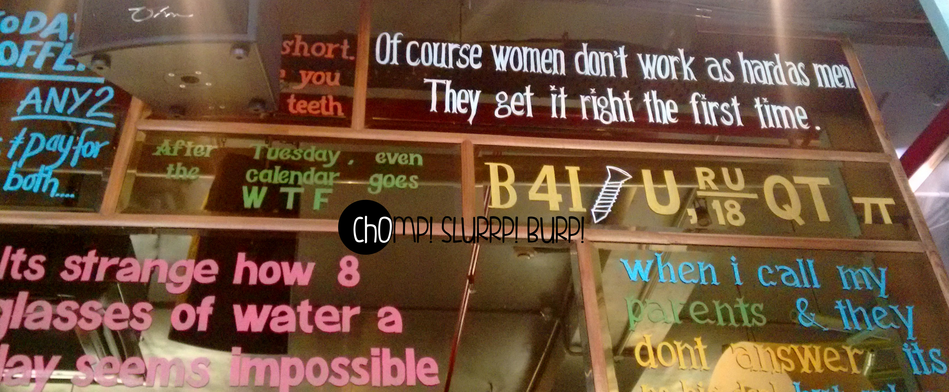 A standalone building with an eating area on the ground floor, a clubbing area in the basement and the brewery on the first floor. Towards their left, they have a garden with painted bicycles and white garden chairs. The ambiance inside is an exquisite amalgamation. Circular couches, glass top tables, chairs made up of painted suitcases with printed cushion tops. They have a glass wall with quirky quotes written in bright colours. A white textured wall holds lighted lamps. White, flowy curtains complementing this wall hang around the windows. There is a faux tree with bird cages hanging from its branches. A more interesting seating option is the cushioned canoe (which immediately made me think of that’s exactly how Joey and Chandler should have put theirs to use. :P) The place is full of interesting props and you will not have a riot spotting each one of them – my favourites – the shirt dressed cushions and the beer pong cap which reminded me of the one owned by Seeley Booth from popular TV show, BONES.