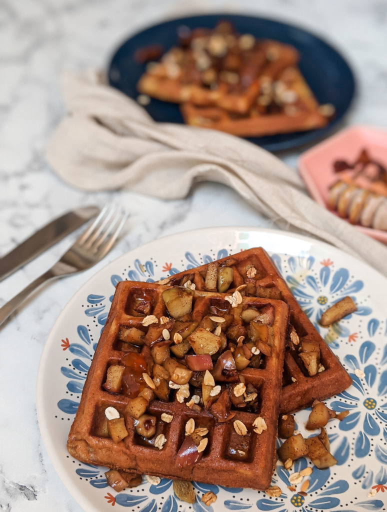 - Plate 2 waffles each on a plate. Pour some of the apple-cinnamon mixture on top.