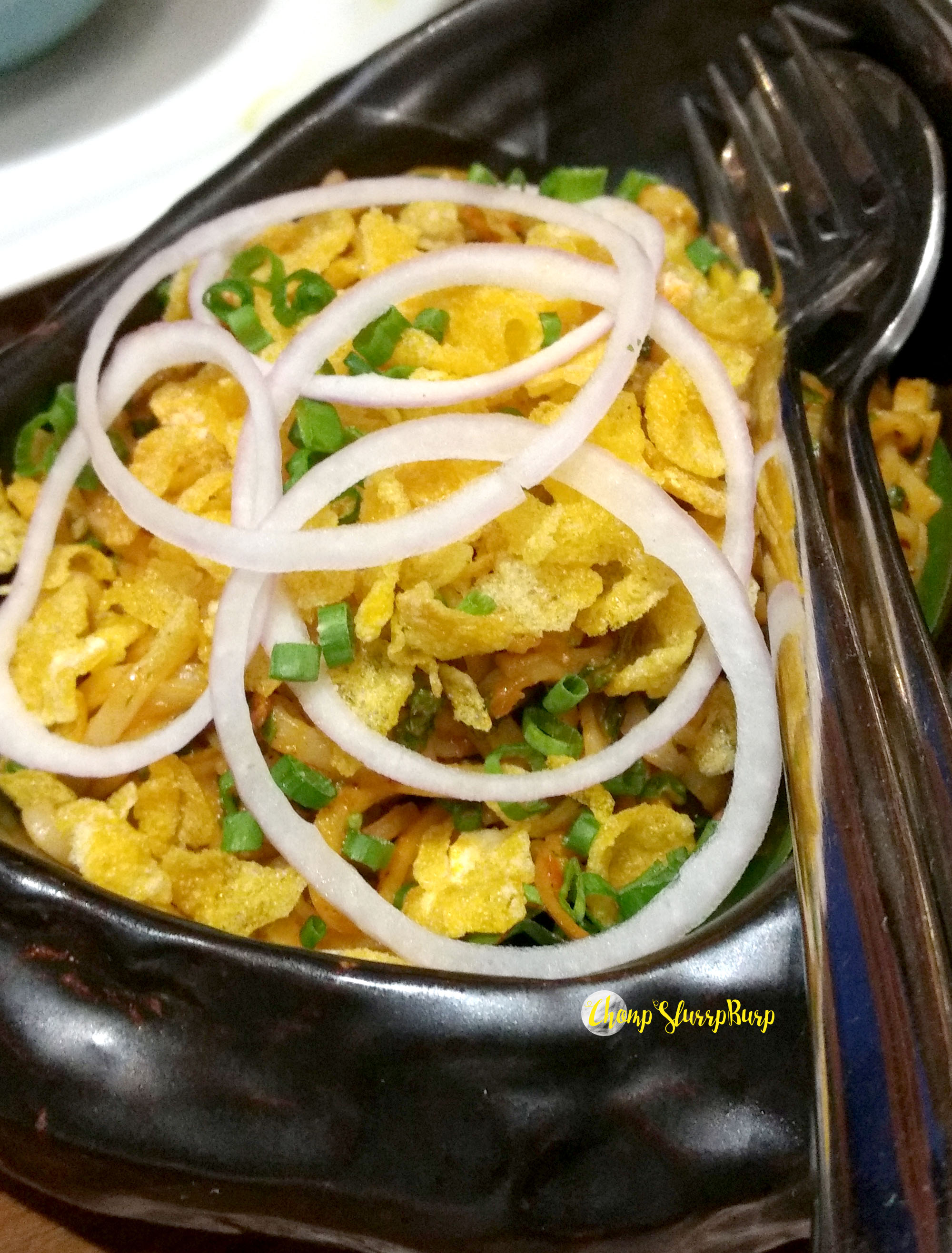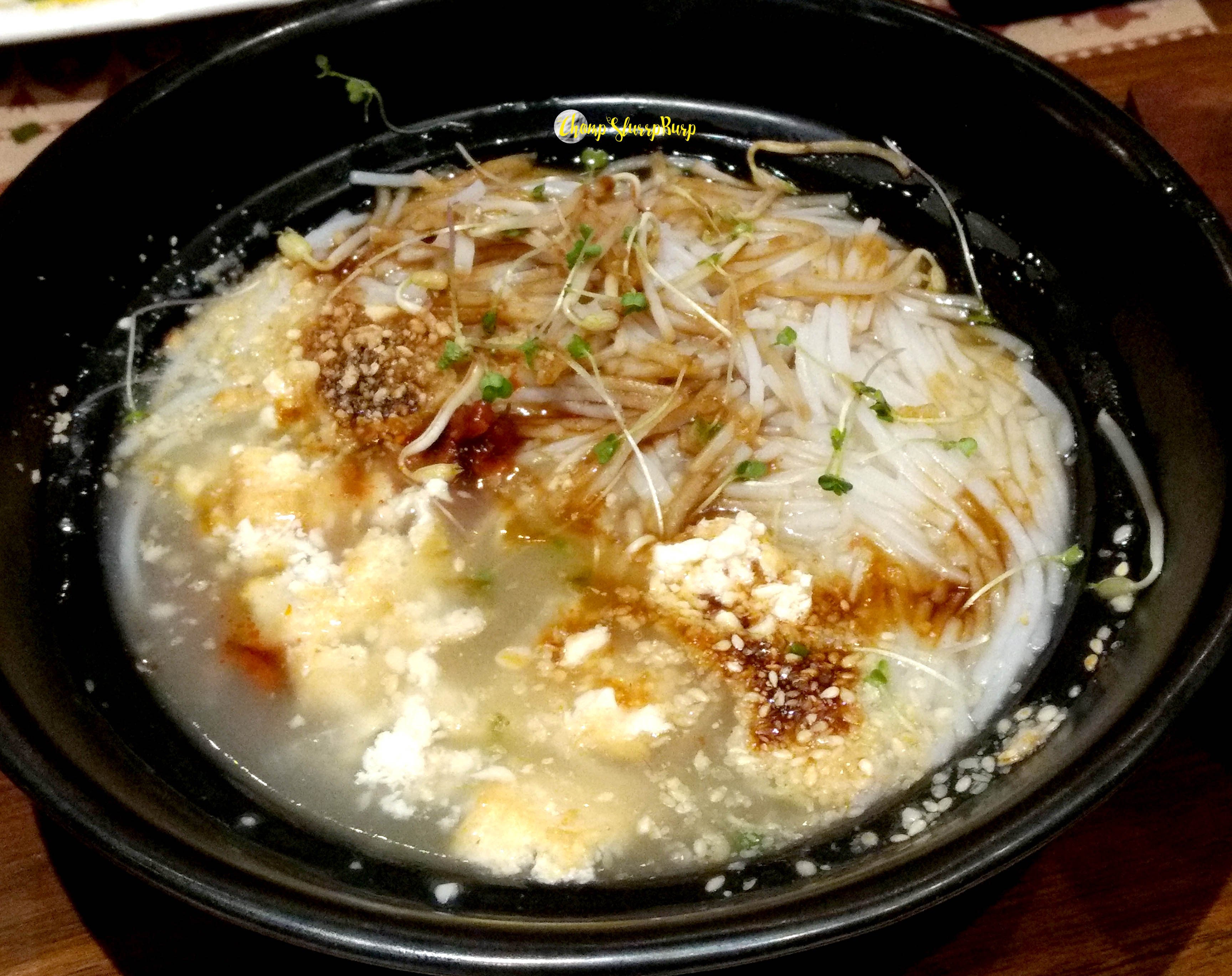 Appetizers included mock meat steamed buns and brown onion and roasted chilli buns, pan fried rice and sesame seed dumplings topped with spicy raw papaya salad (the mingling textures are delectable), lotus stems dusted with paprika and curry leaves (fried lotus stem with a tadka of crunchy curry leaves and spiked with paprika) and my favourite – Tohu Mok Palata – puffed rice cooked with onions, tomatoes and spices, what seemed almost like a a spicy version of poha and served with a flaky Burmese (Malabari) parantha.