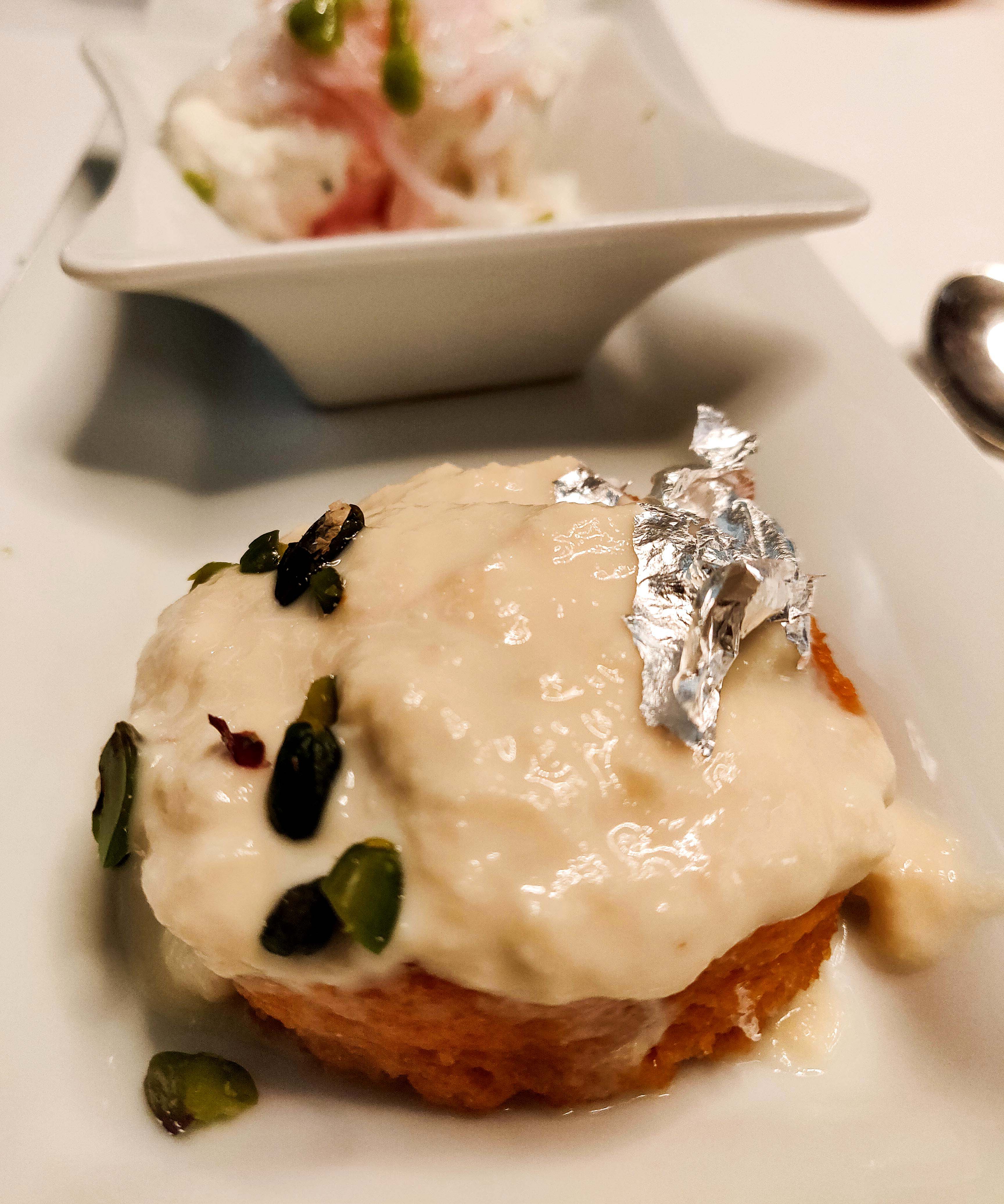 Desserts included one of the BEST Shahi Tukda, Imtiazi Poran Poli , and Kulfi Badshah Pasand. My favorite, Shahi Tukda was thick, flaky homemade bread, sheera and topped with rabri, finely chopped pistachios and vark.