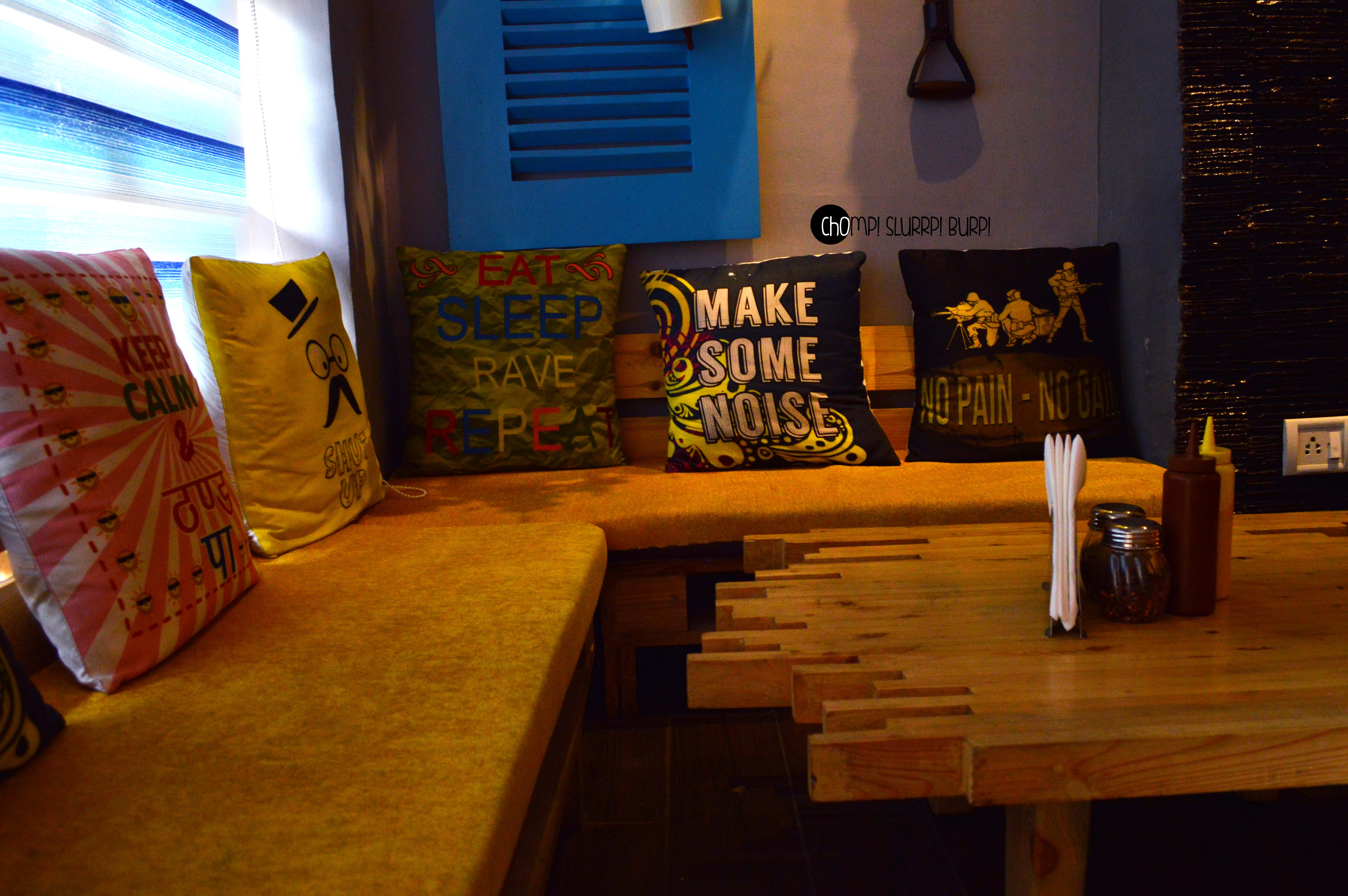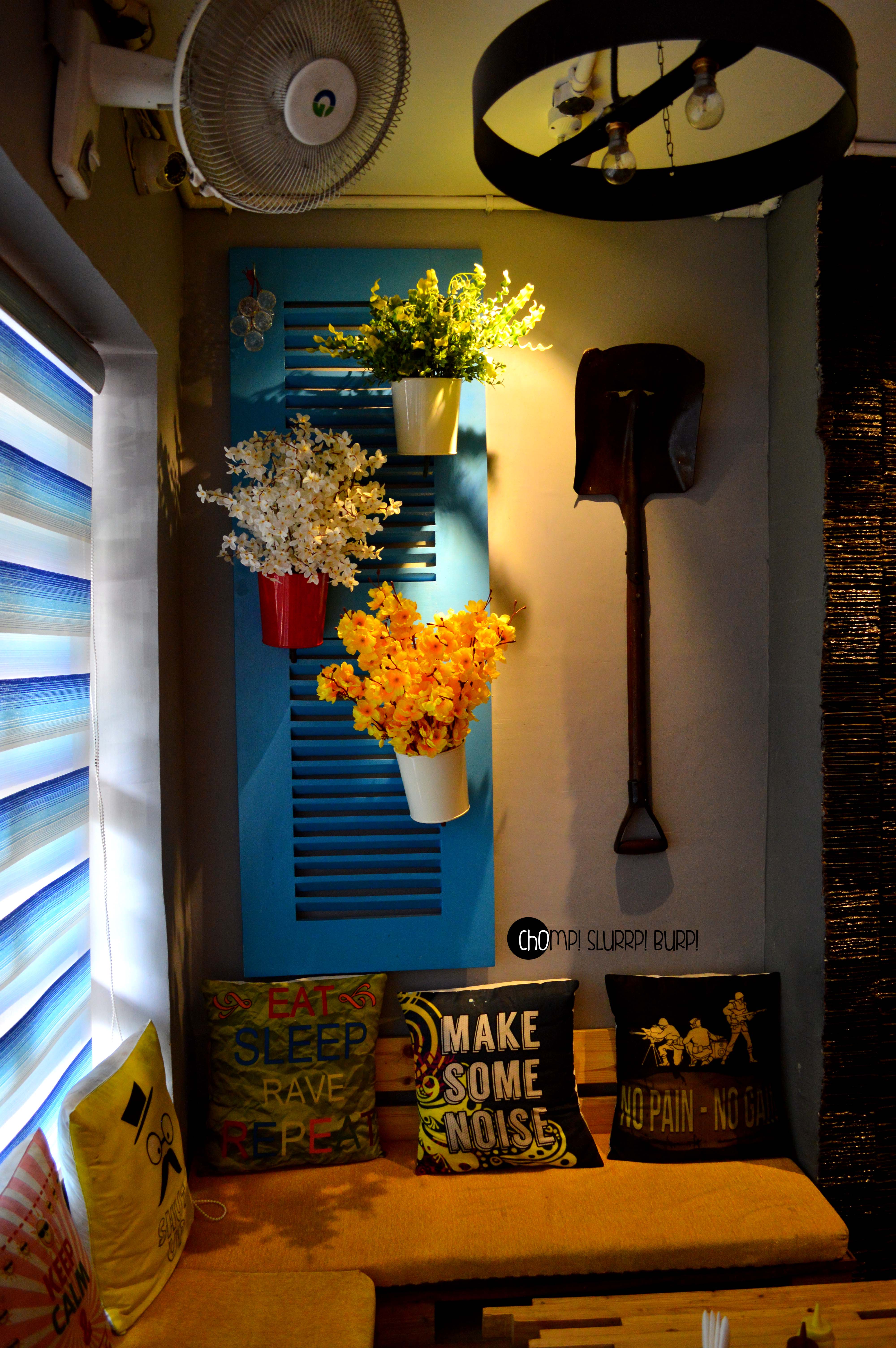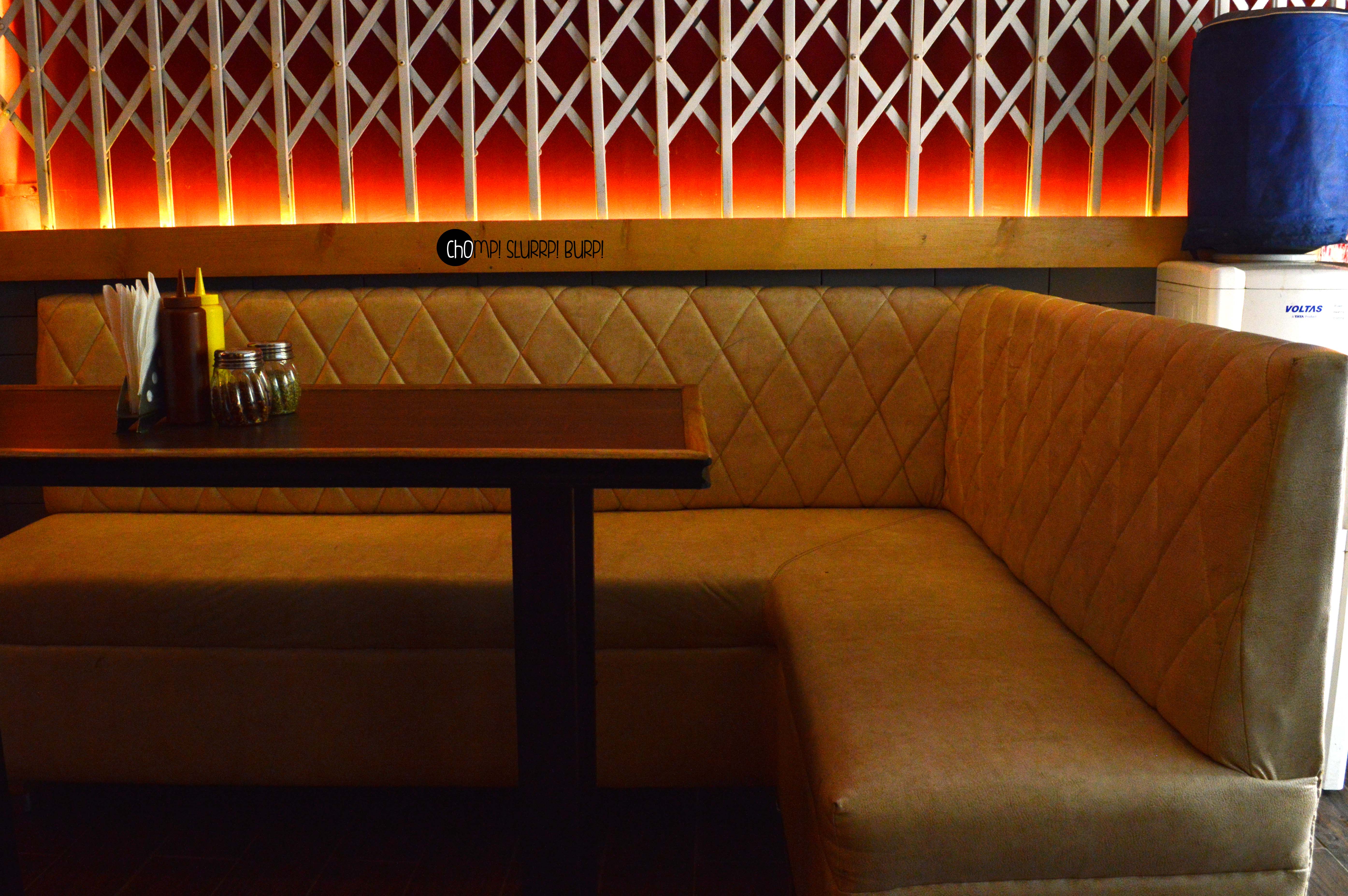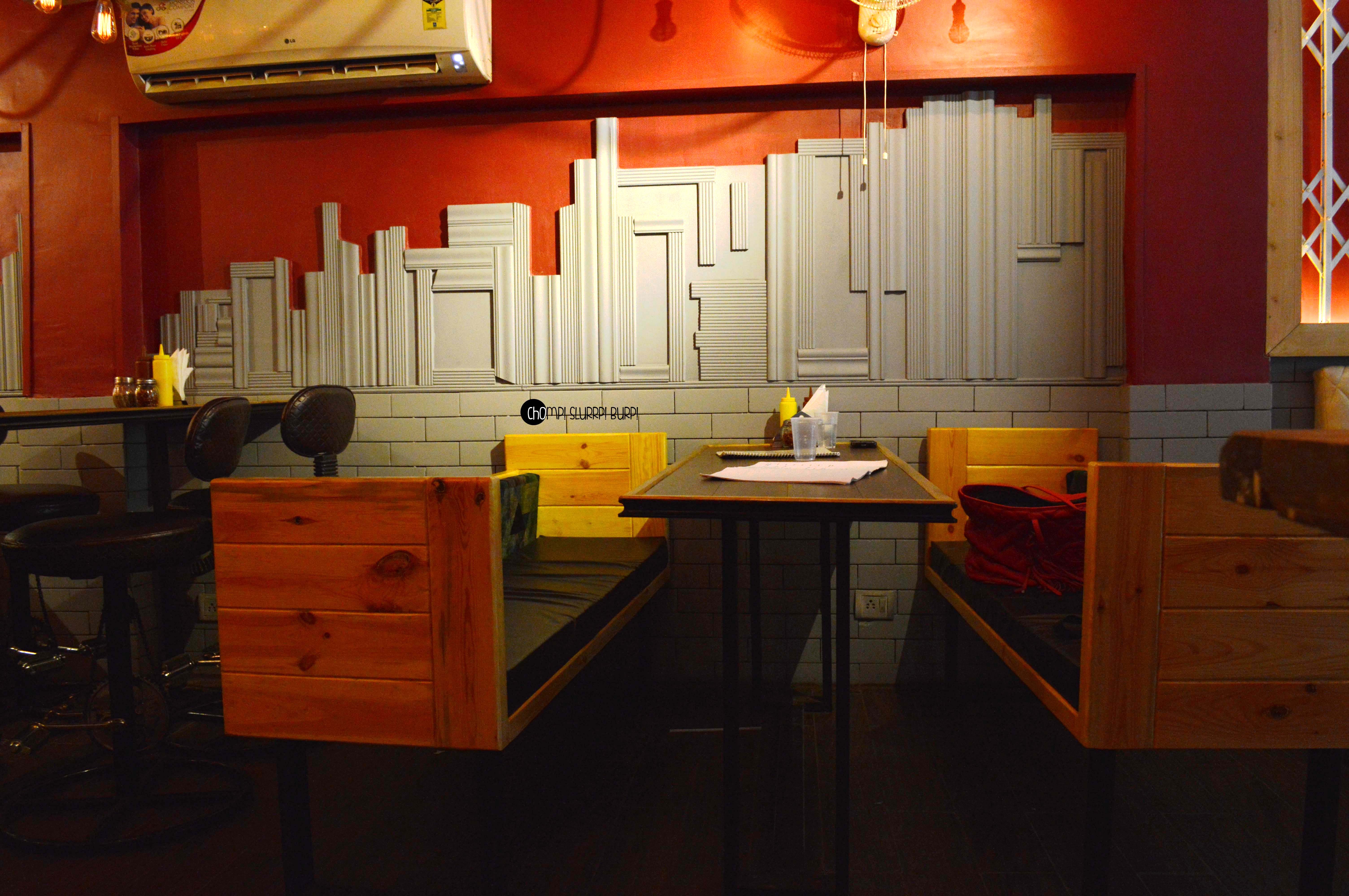 The interiors are done up most exquisitely. Leather clad couches, low seating, textured walls added with rustic pieces – flower pots, jute ropes, filament lamps and Edwardian carved chair backs. The amalgamation of colors and textures work very well together.