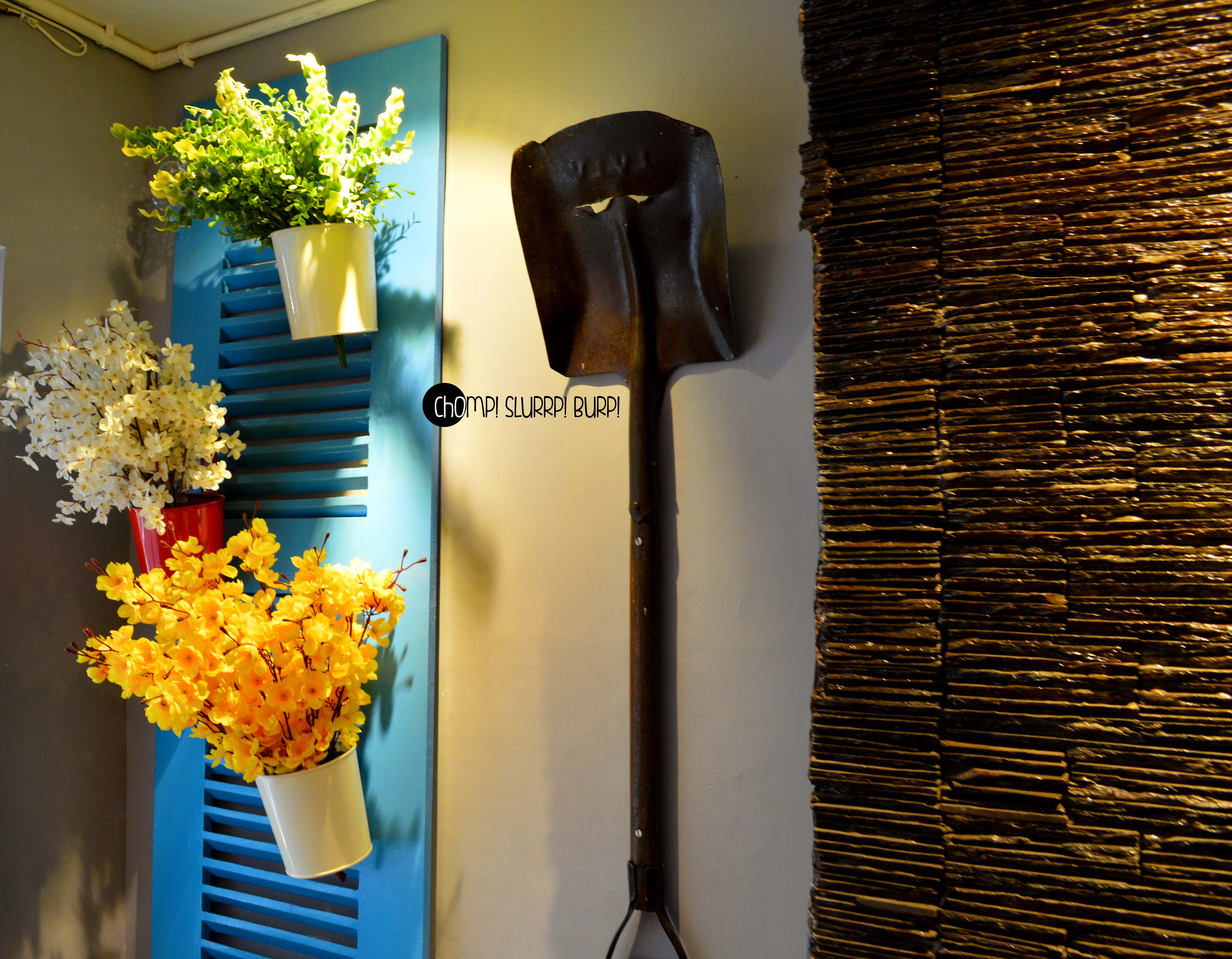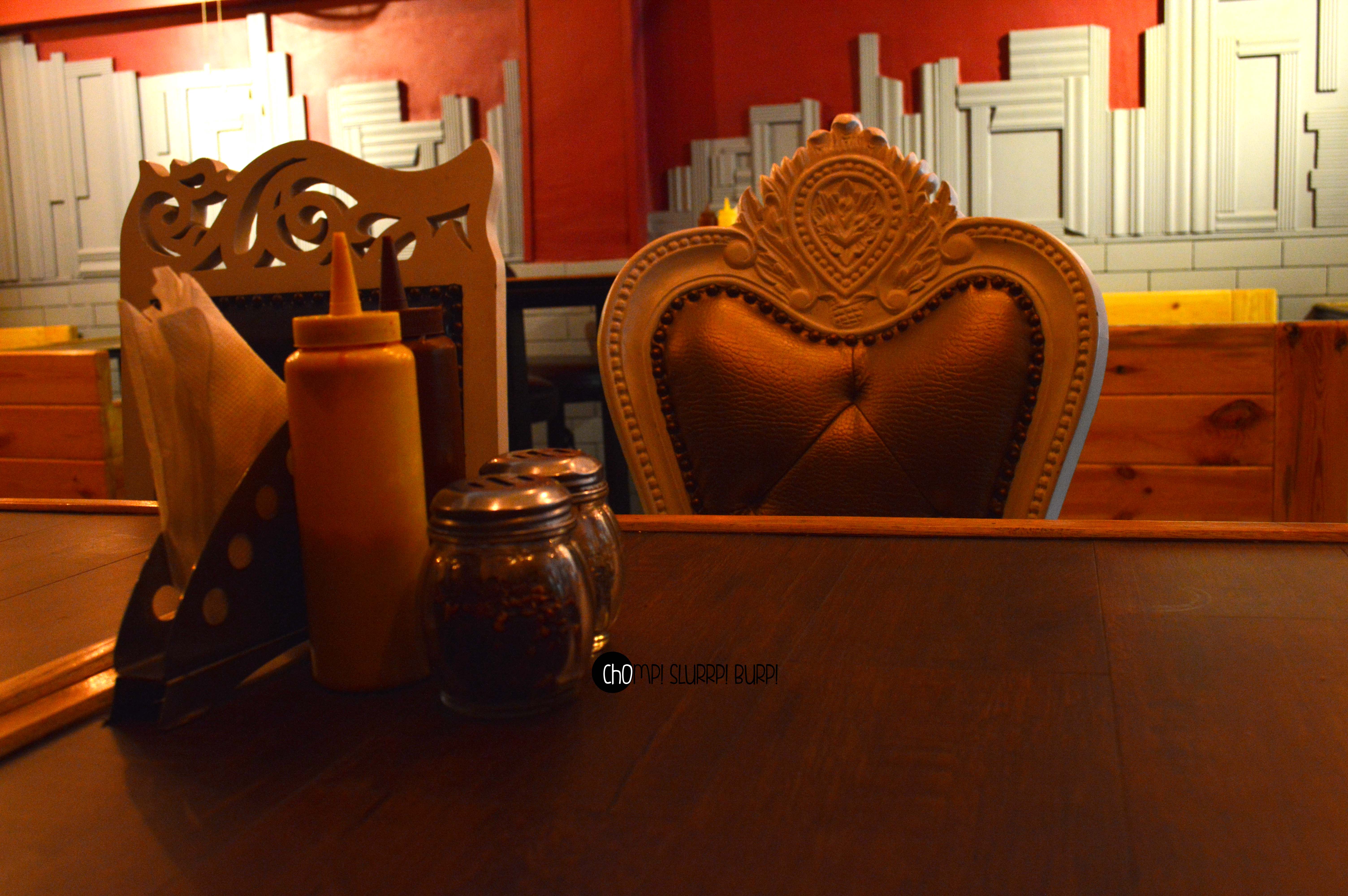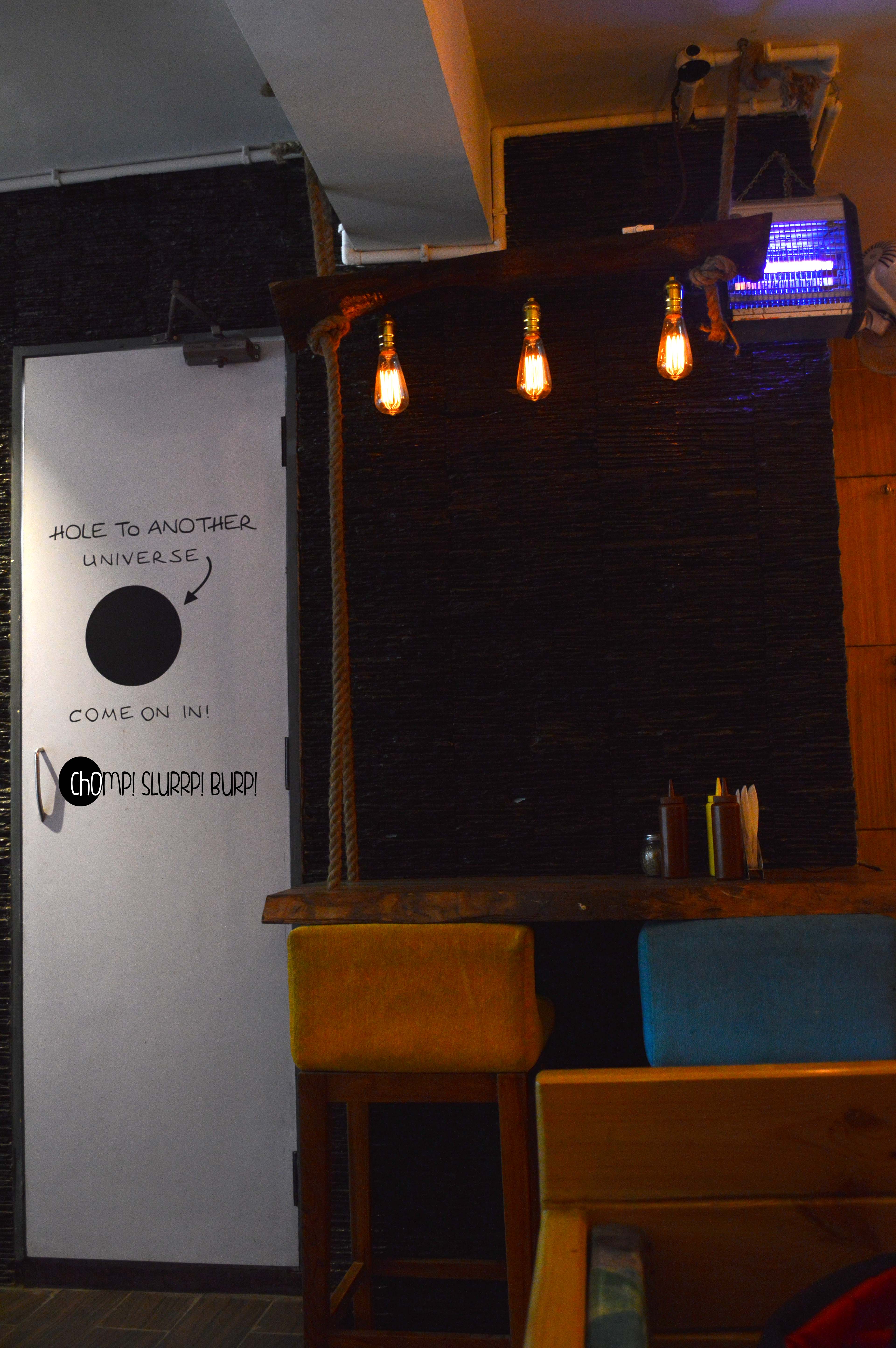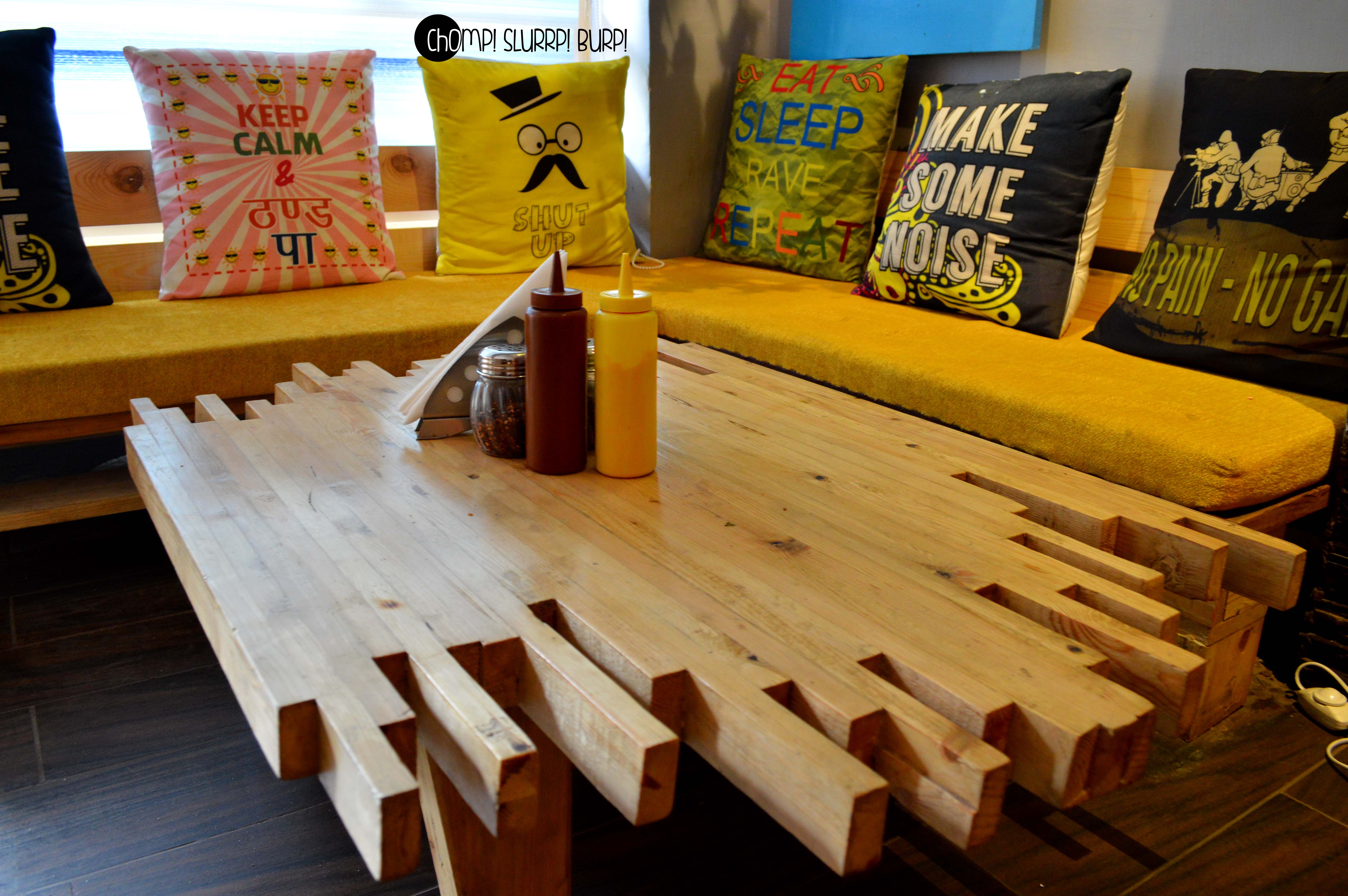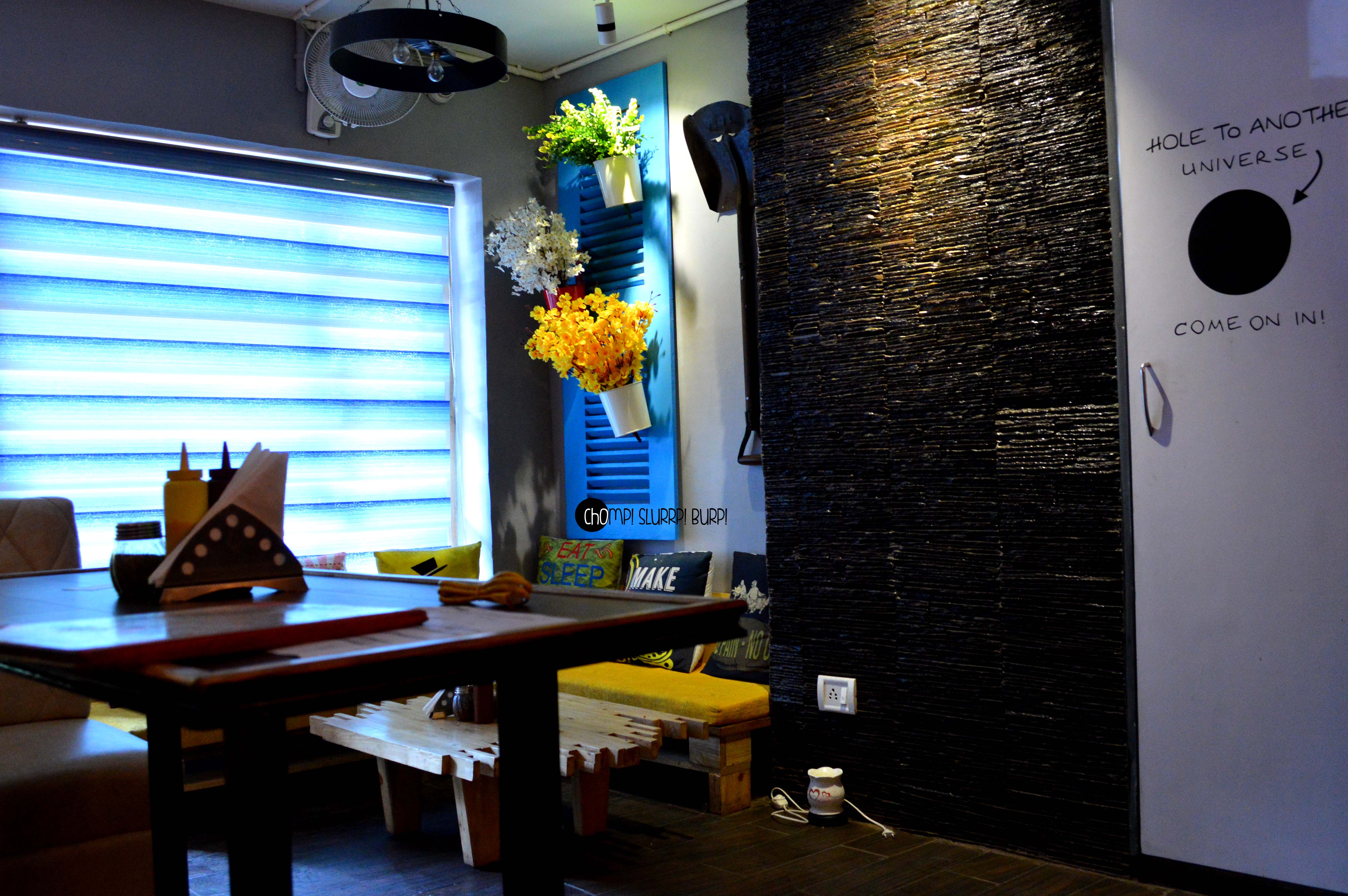 The interiors are done up most exquisitely. Leather clad couches, low seating, textured walls added with rustic pieces – flower pots, jute ropes, filament lamps and Edwardian carved chair backs. The amalgamation of colors and textures work very well together.