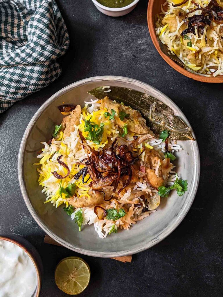 Chicken seekh kebab biryani – so well balanced, so aromatic and topped with fried onions!