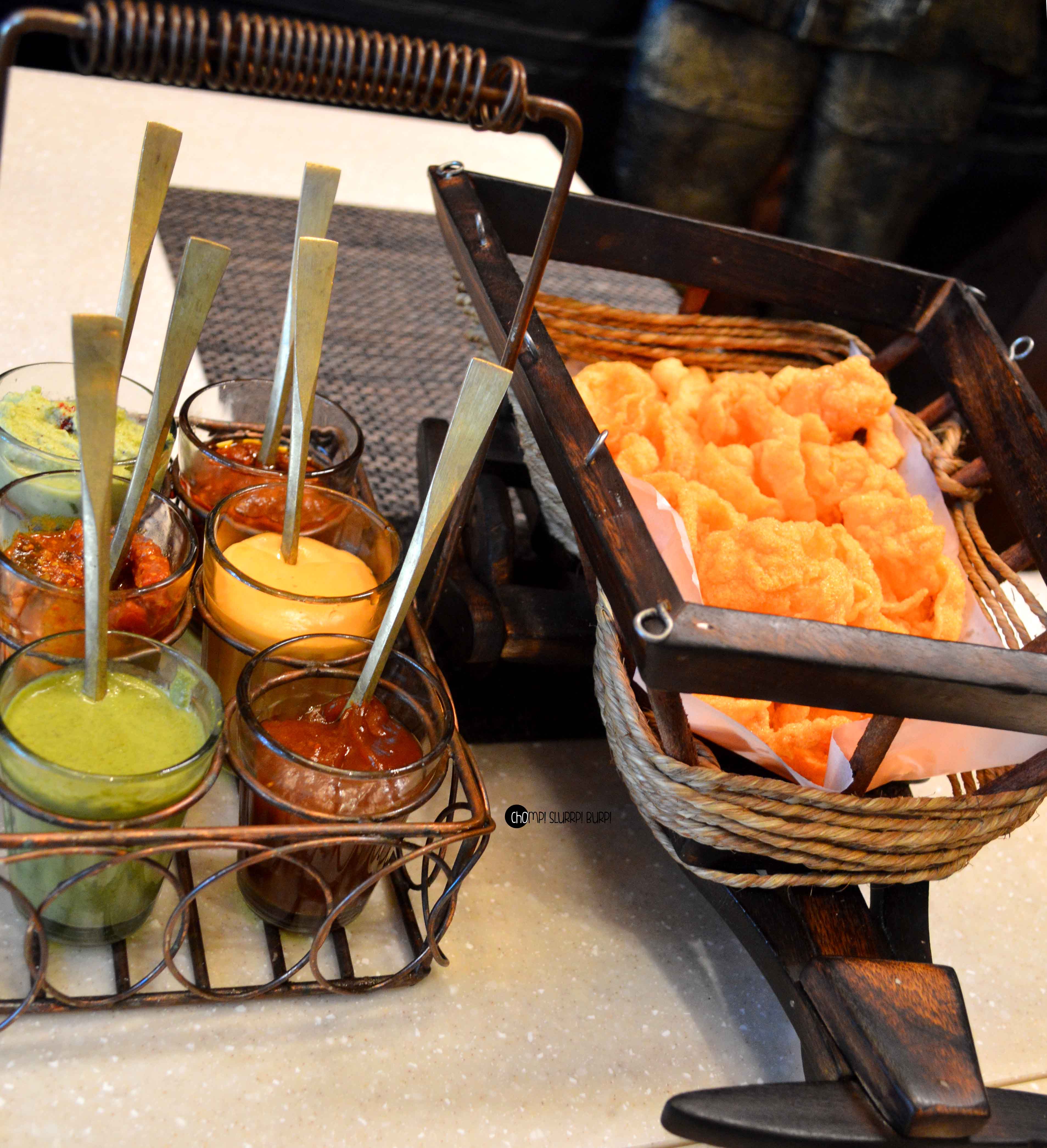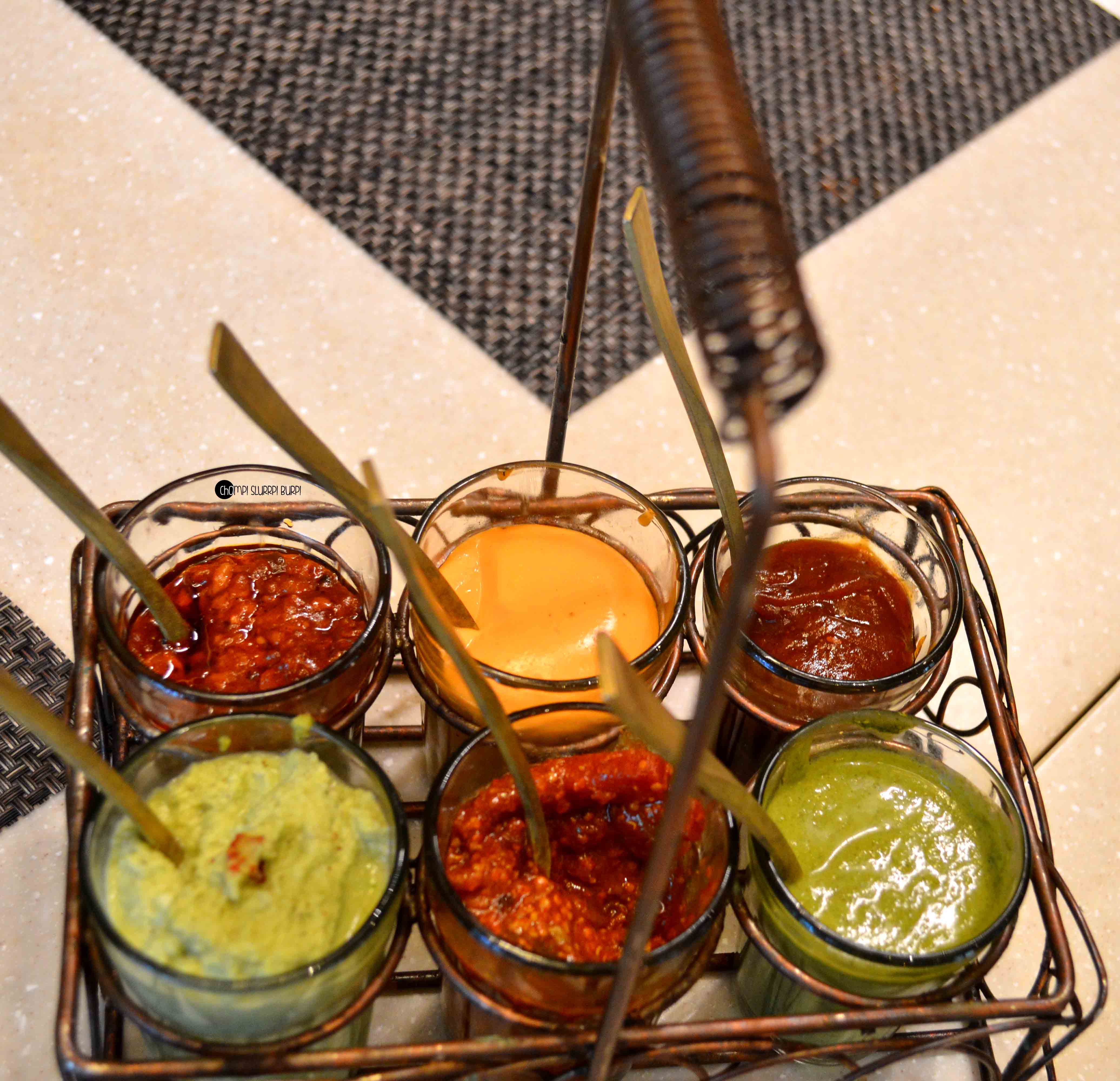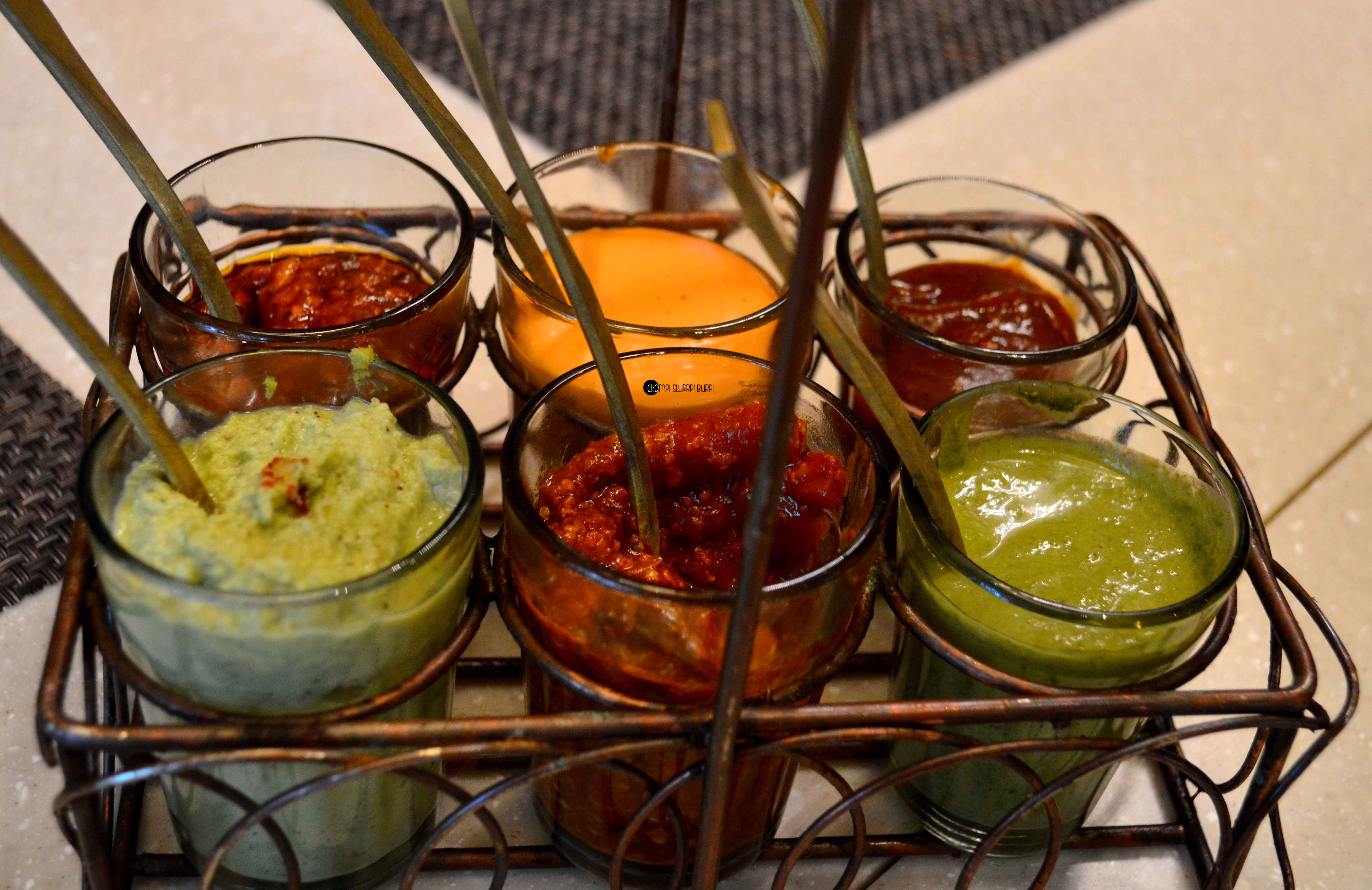 We were courteously escorted to our table and started our meal with crispy papadum served in a working miniature wooden cart and a beautiful assortment of chutney served in chai glasses – mint, tangy mix pickle, coconut, tamarind, roasted bell pepper with mayonnaise and chilly – the tamarind and coconut chutney were a hoot.