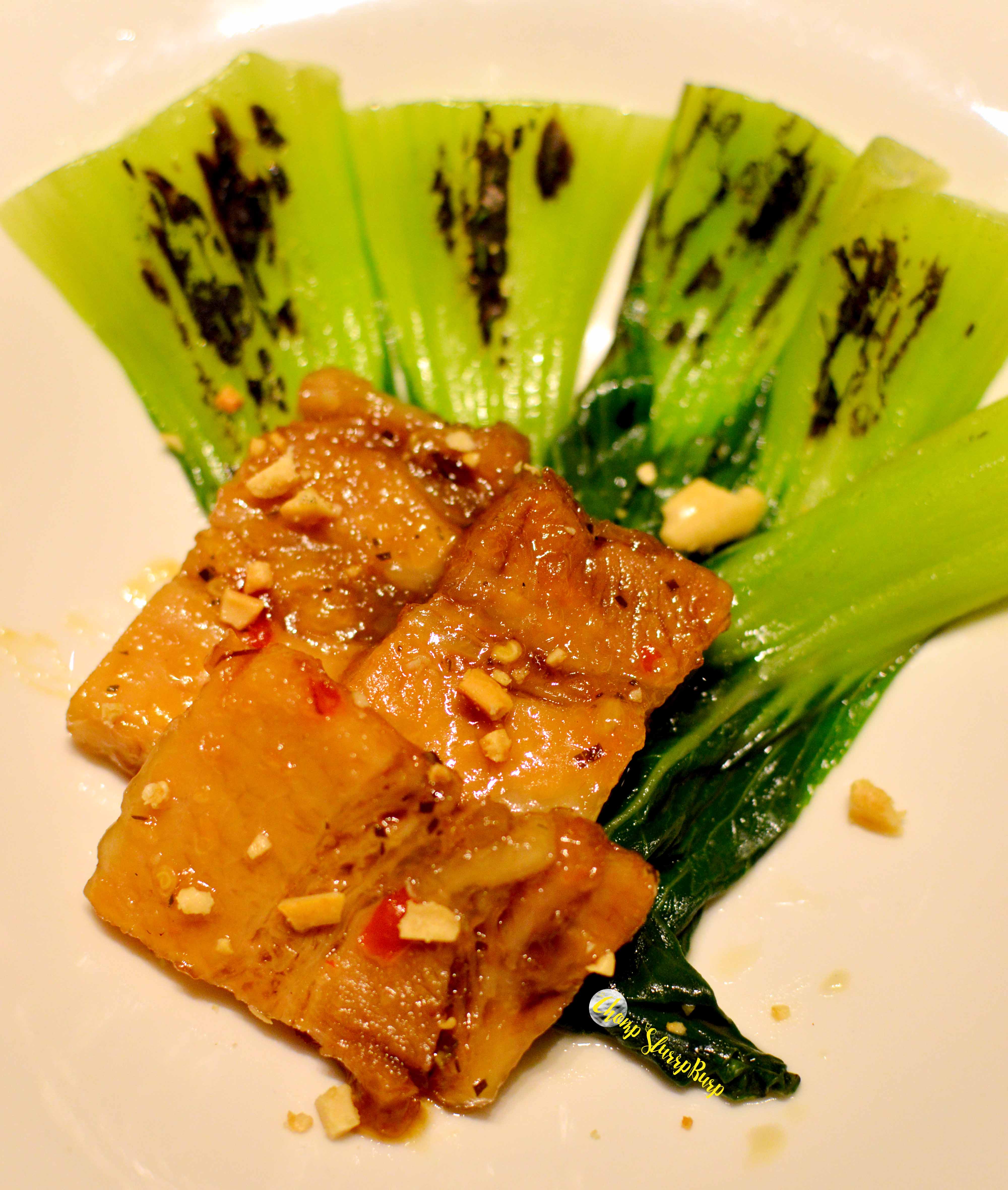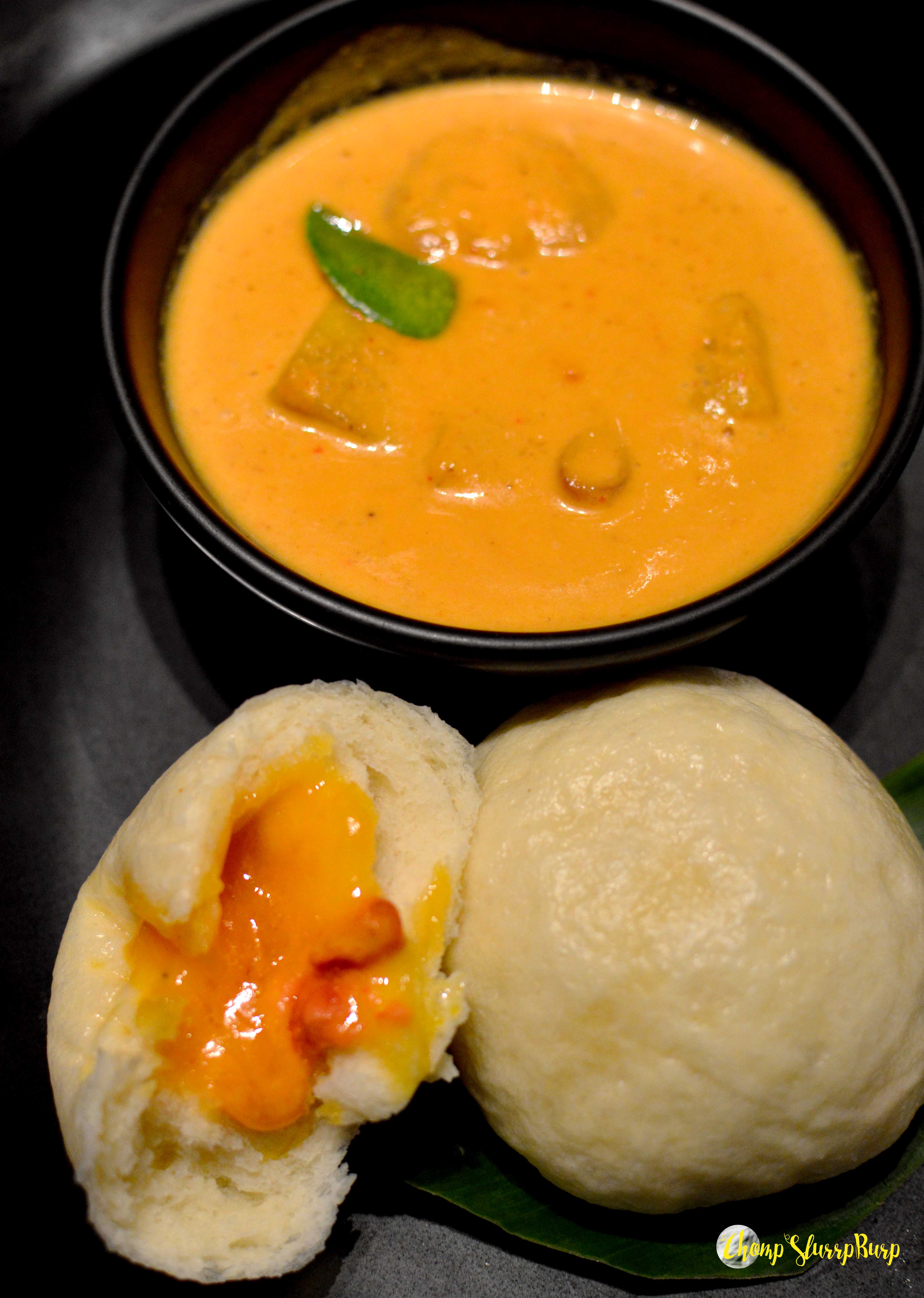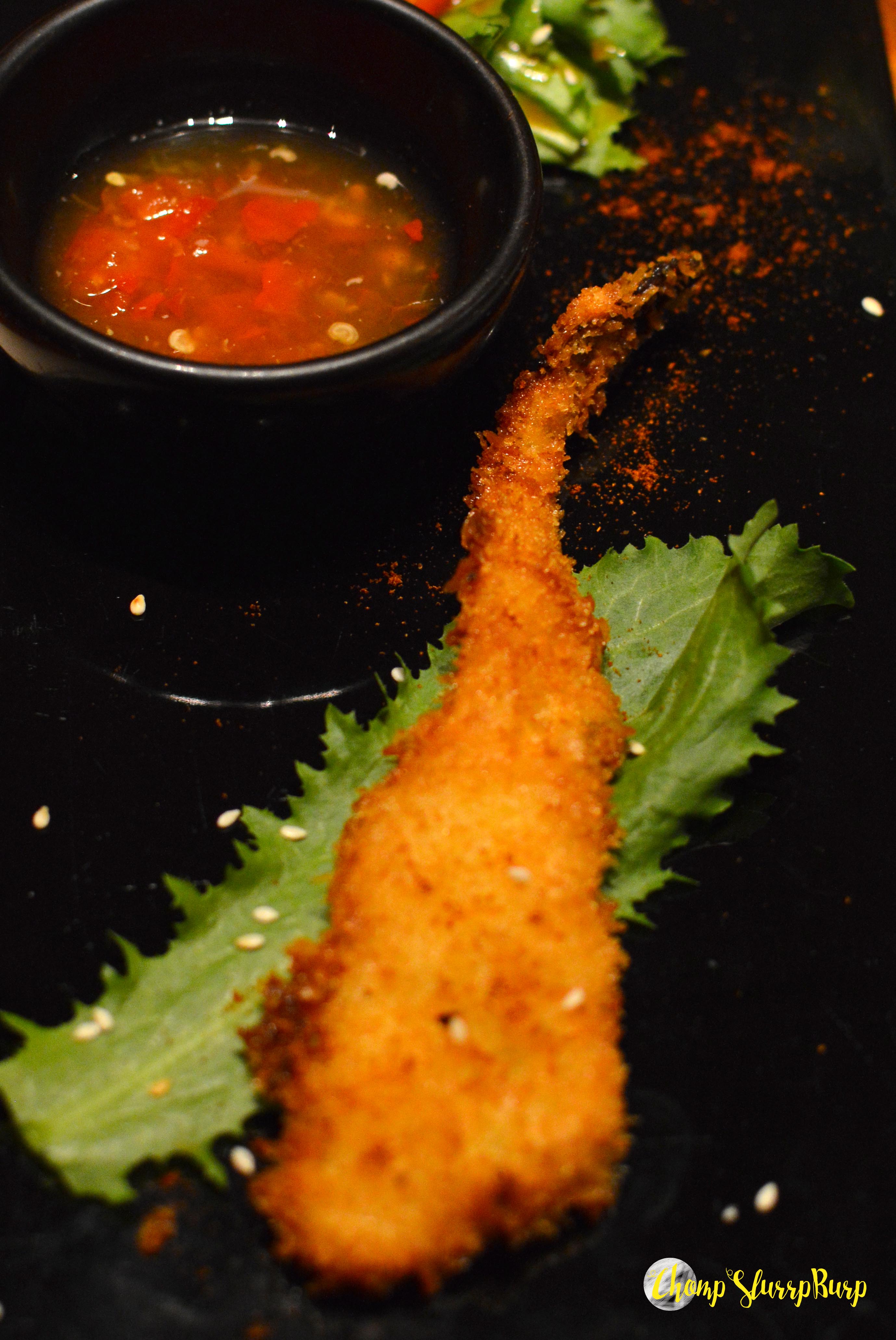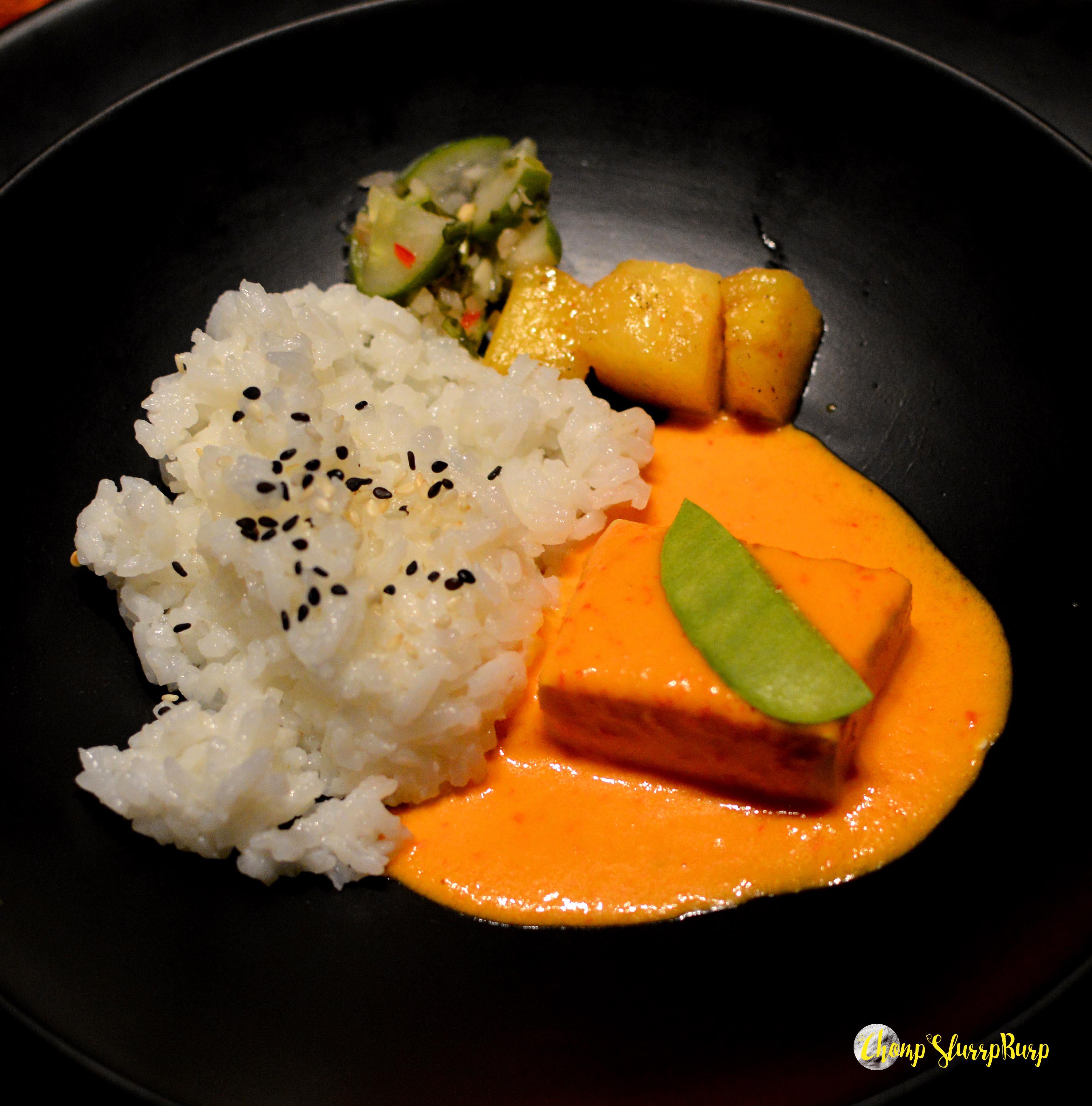 Appetizers included Taro and Water chestnut satay – batter fried water chestnuts and taro skewered up and tossed with a palatable sauce. Pork belly with Som Tam glaze and charred pokchoy heart – sliced pork belly glazed with the sweet sauce and peanuts served with steamed bok choy greens. Crispy Bombay Duck with frisee lettuce and tomato namprik – an absolute delight, crispy on the outside with soft meat in, served with a sweet chilly sauce.
