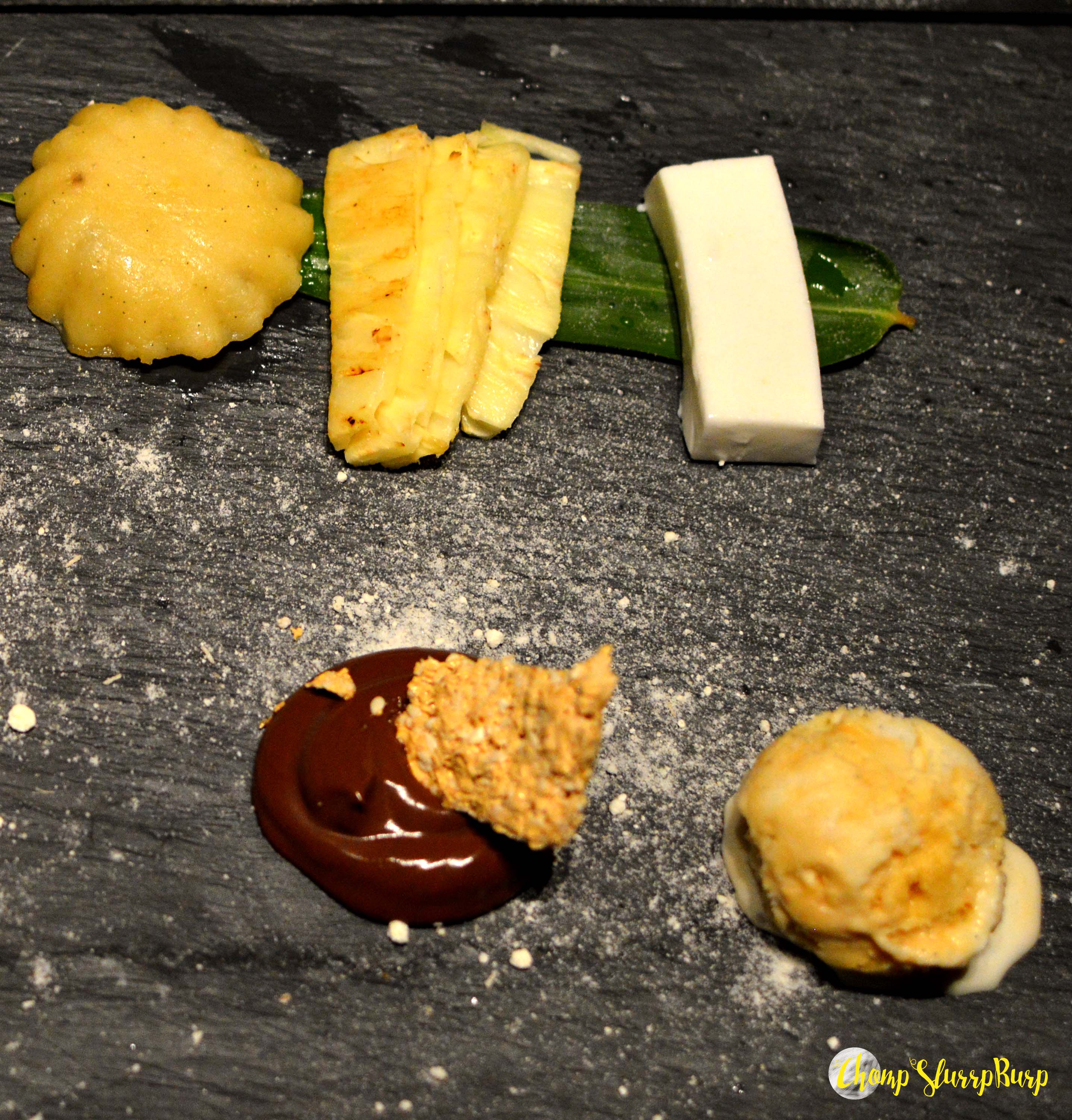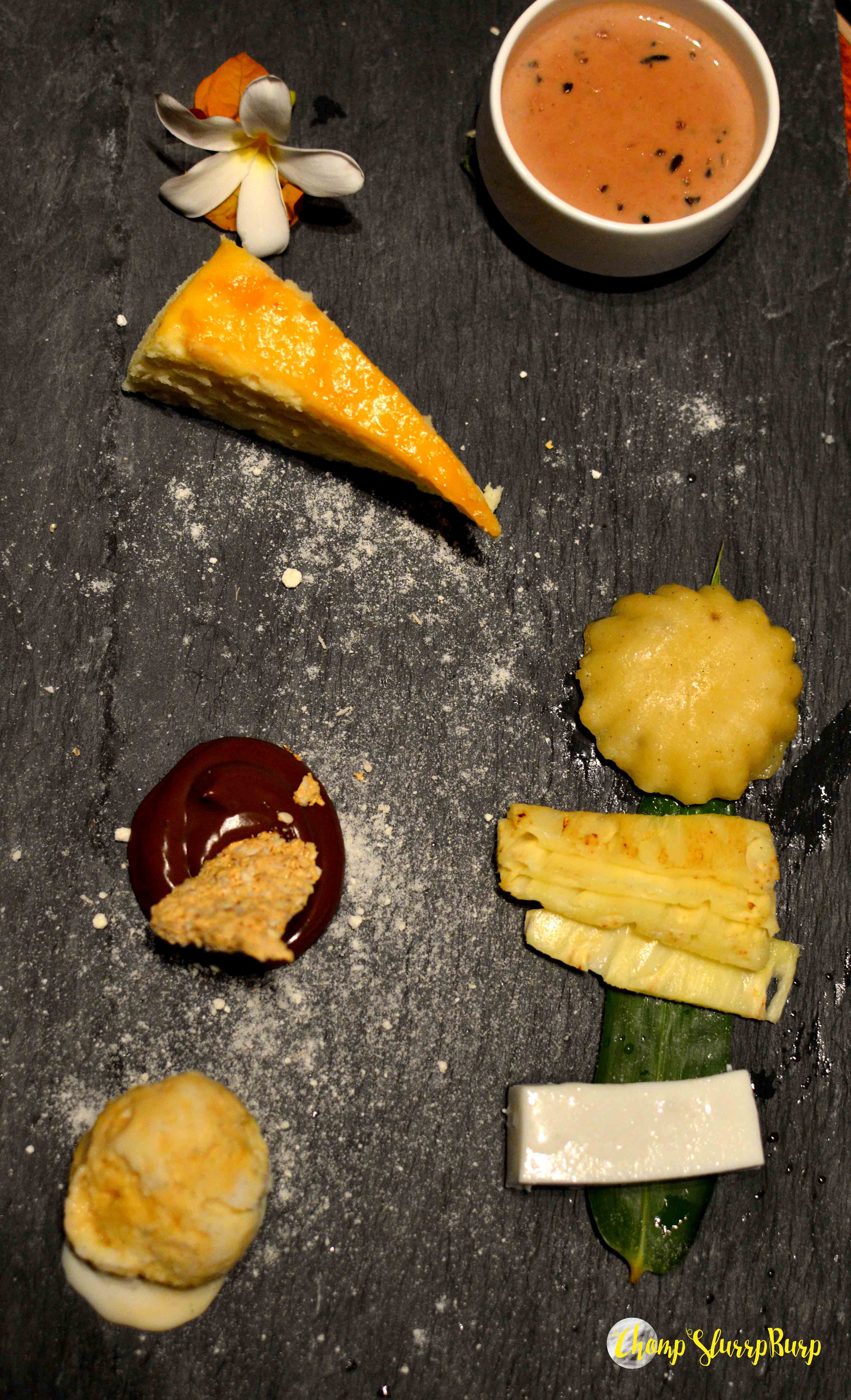 The dessert platter – Black rice pudding, black pepper infused Chocolate Ganache with sesame gajak and honeycomb ice cream, Japanese cheesecake with apricot glaze, Puto, coconut jelly and dalle infused pineapple. My favourites from this exotic platter – the cheesecake with apricot glaze, home made ice cream, chocolate ganache and the coconut jelly. Absolutely divine!