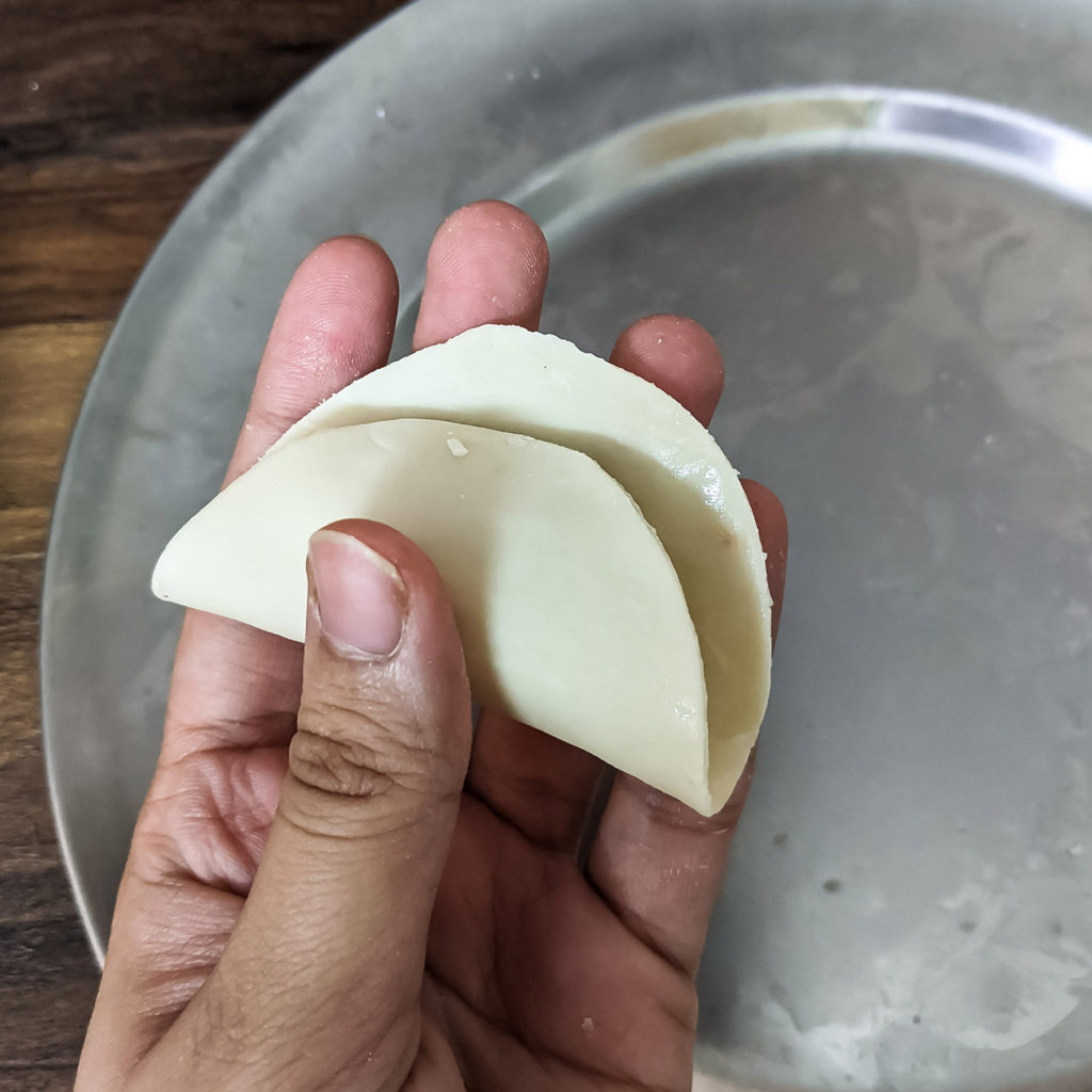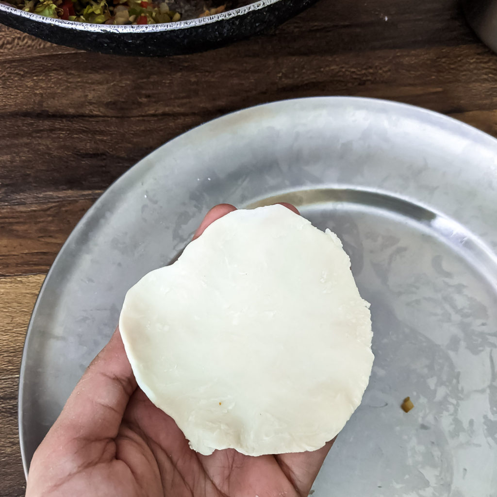 - Take one rolled out dough, place a spoonful of the filling and place in the centre. Lightly apply water to the edges, to ensure proper sealing. Much like making a Gujiya.