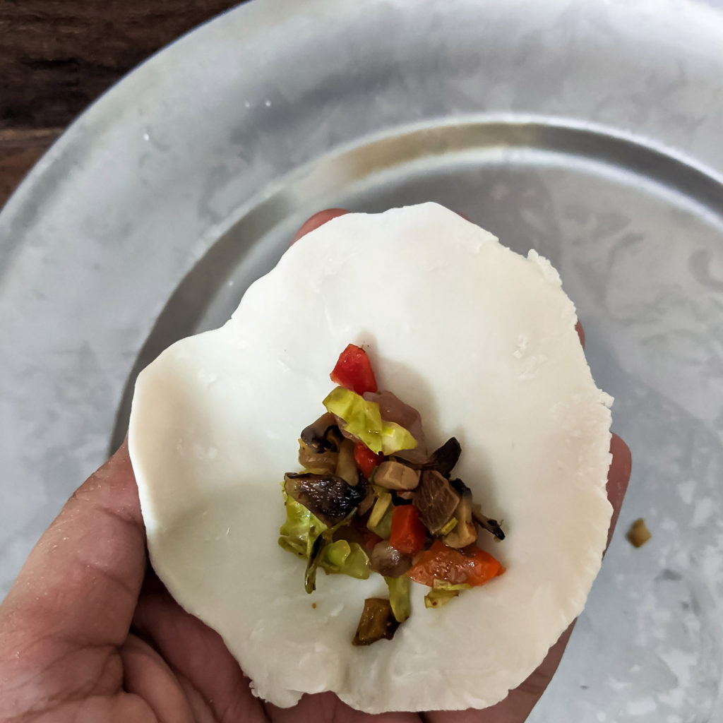 - You can roll each dumpling individually, or take the pasta route. To roll individually, divide your dough into 1 inch balls and roll one at a time. Else, take a handful of dough, and roll into a thin sheet. Use a bowl with a sharp rim to cut perfect round wrappers for your dumplings (roughly 3 inches in diameter)