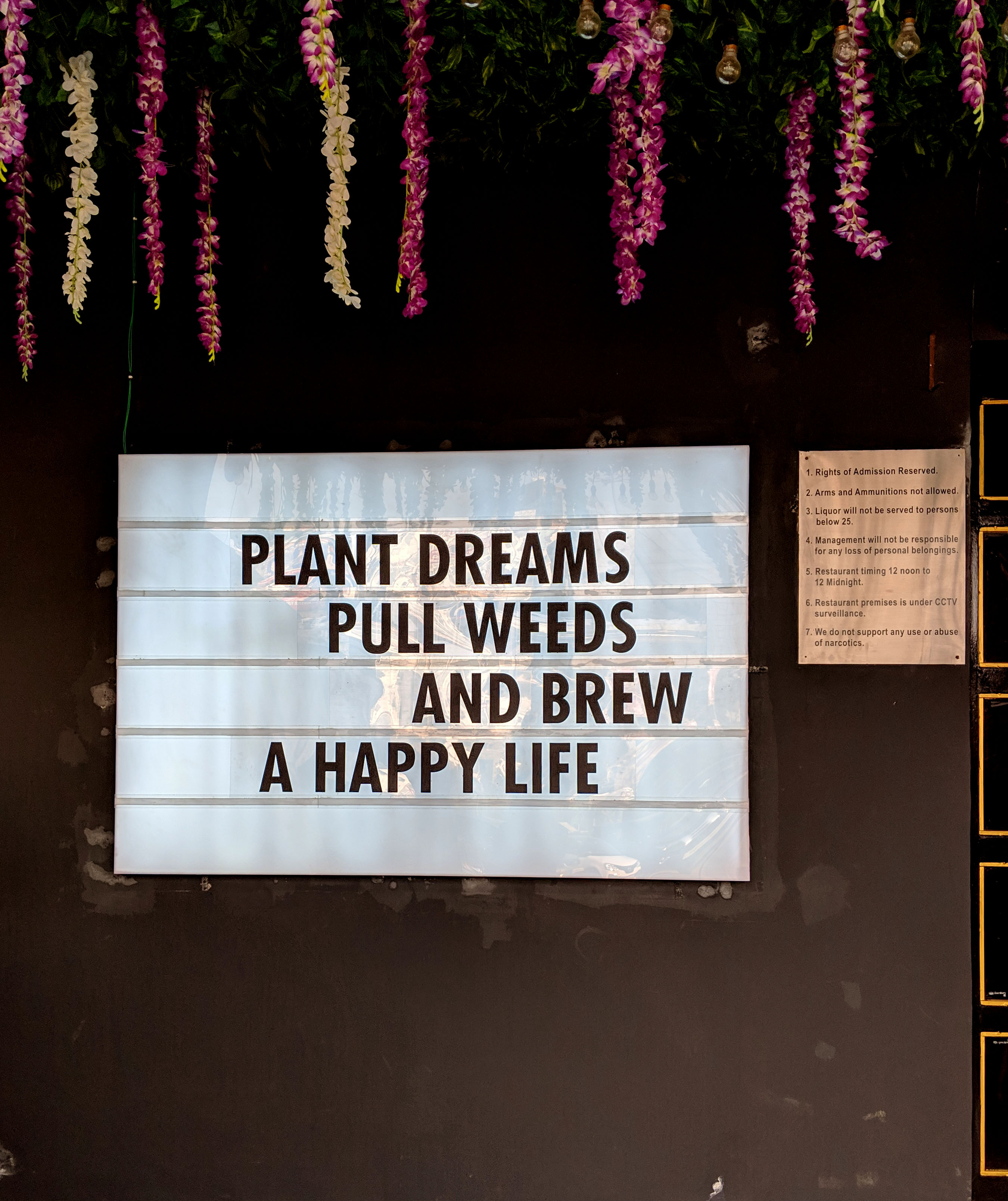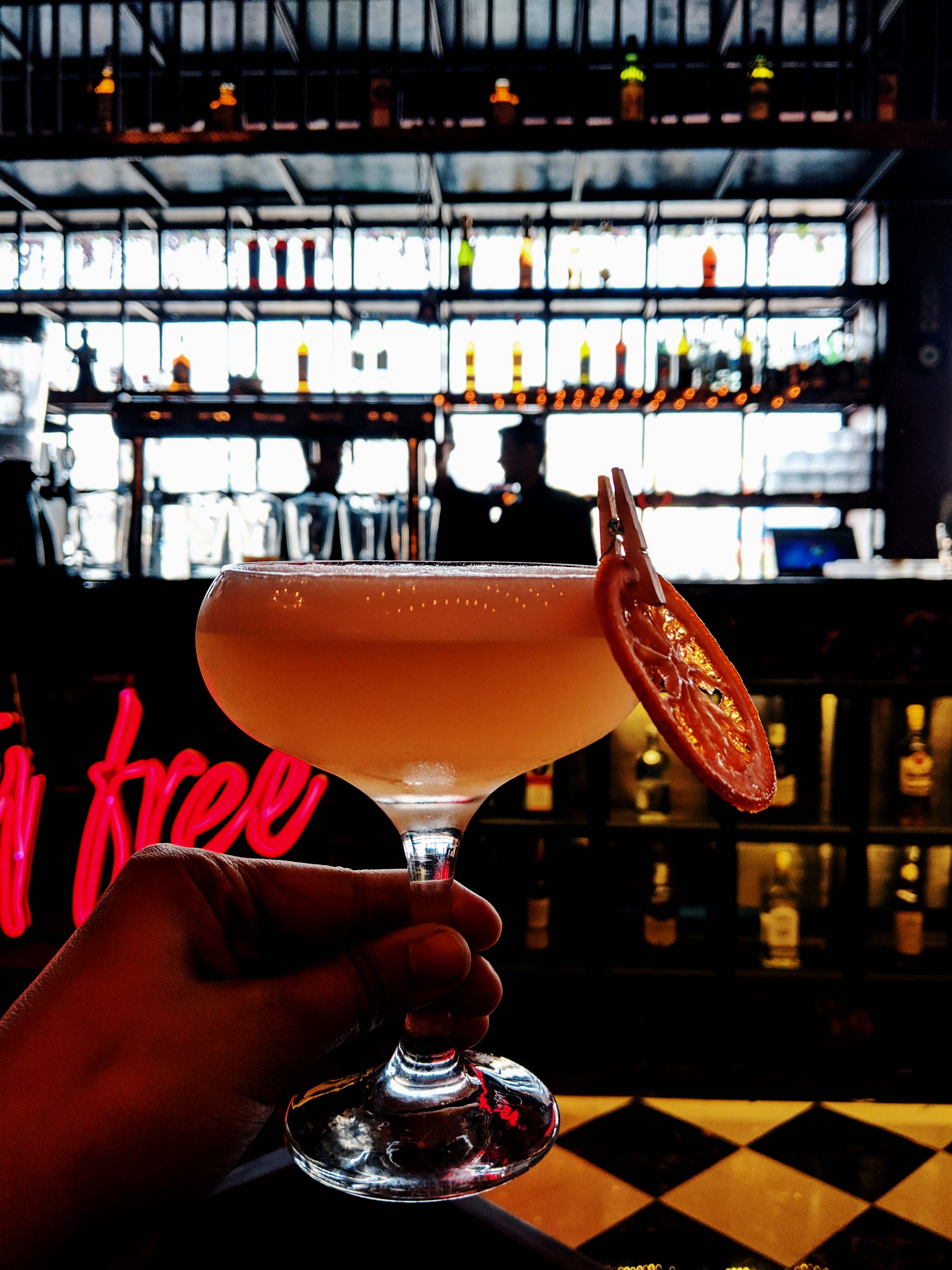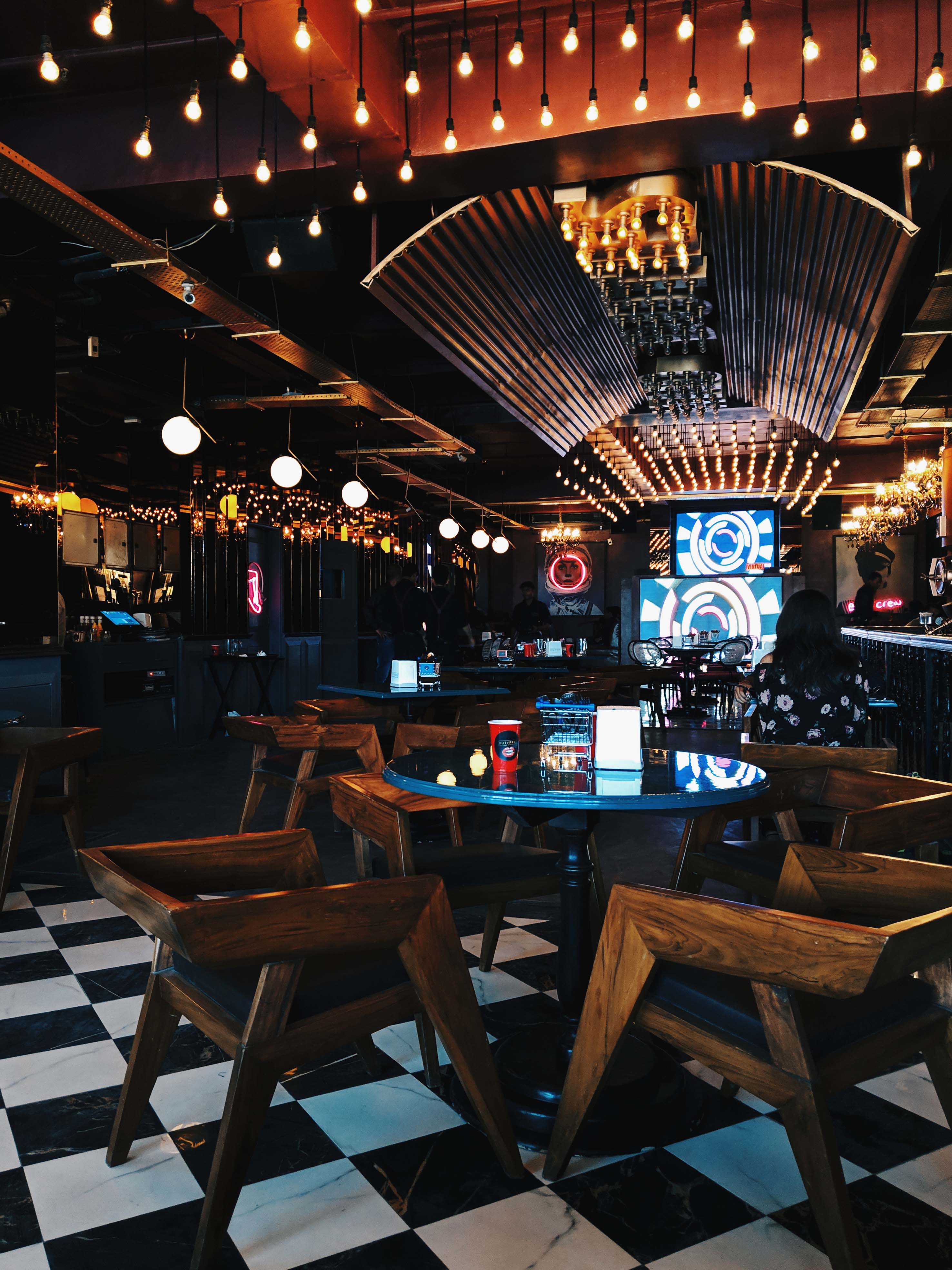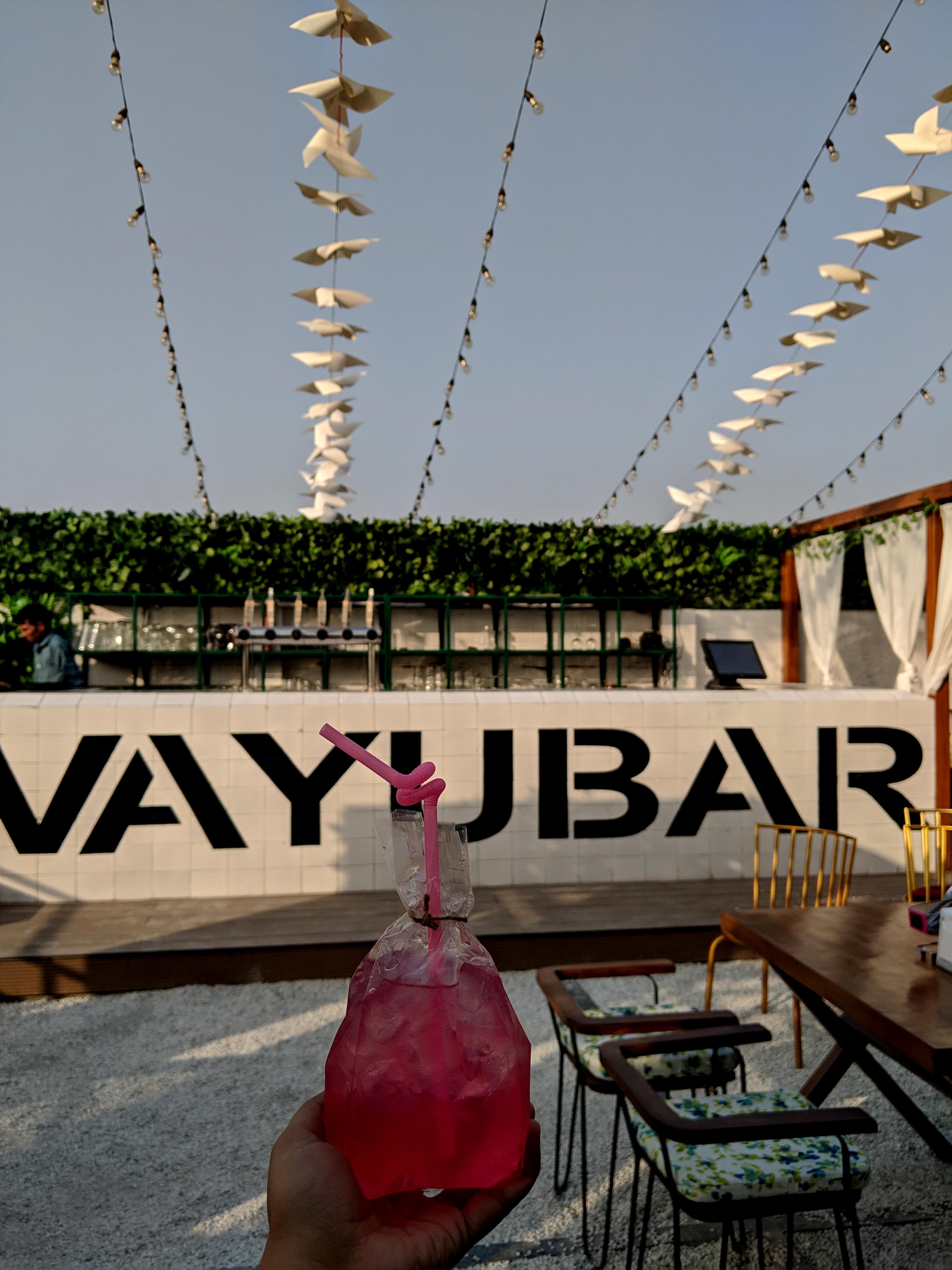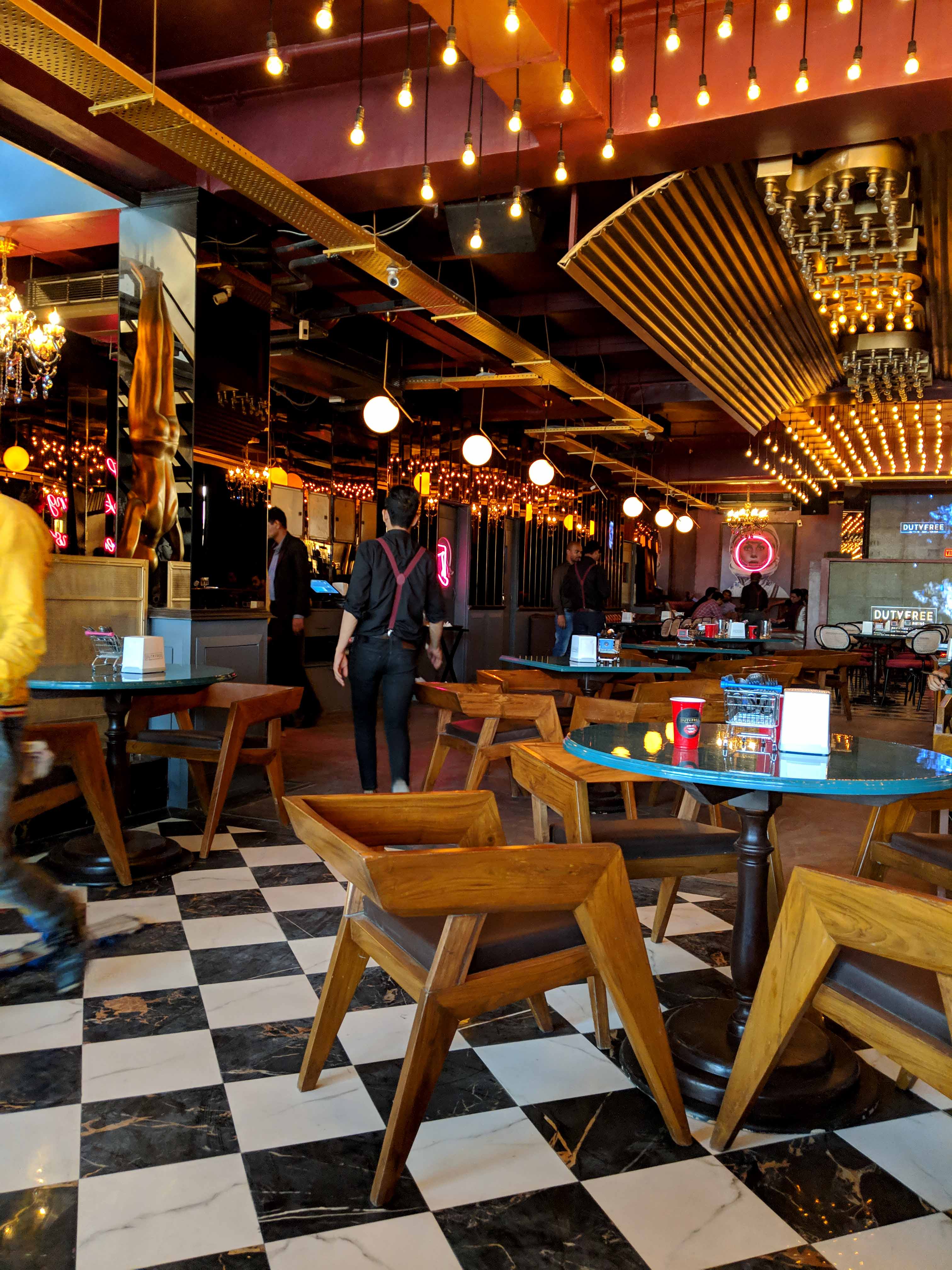 Despite and in spite of the fact that Duty Free’s first outlet was in such close proximity, the first time I visited them properly was at this sprawling new property. Duty Free Vayu Bar is spread over two floors with a gorgeous rooftop. Koffee with Karan’s anthem “Stop Making Sense” sprawled at the entrance and a gorgeous bar. The terrace works as a great date spot during the date with white pebbles, and flowy curtains and transforms at night.