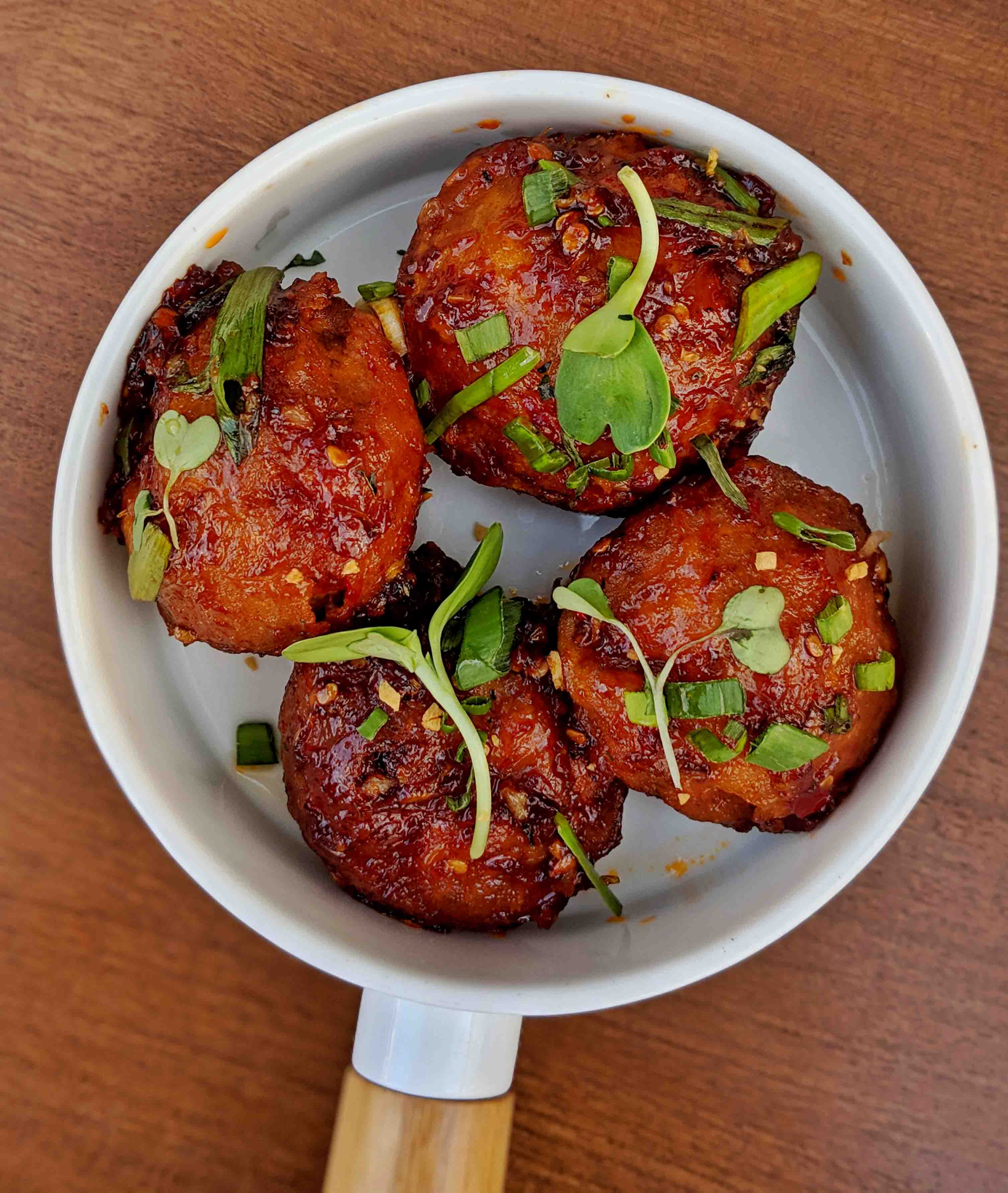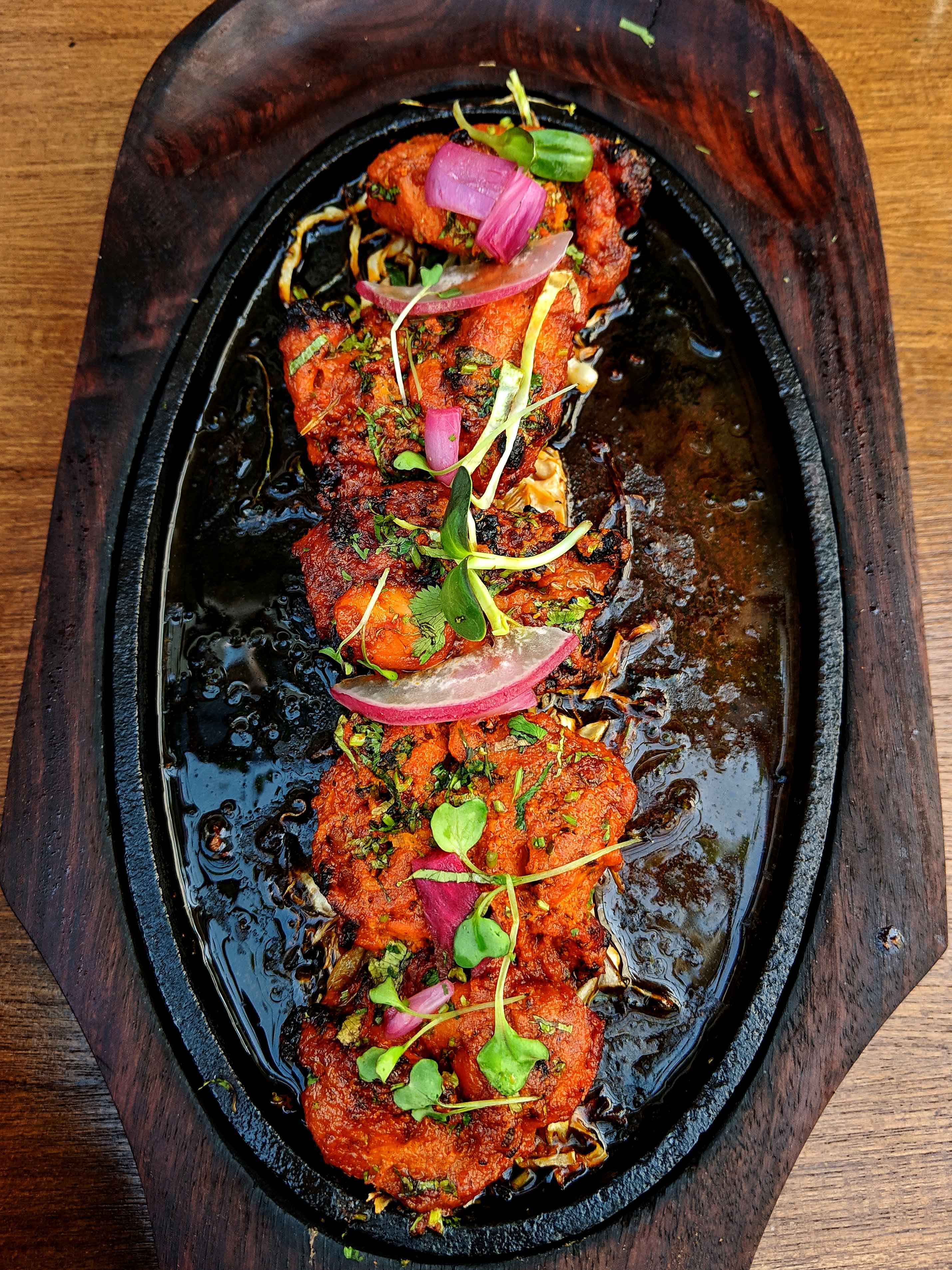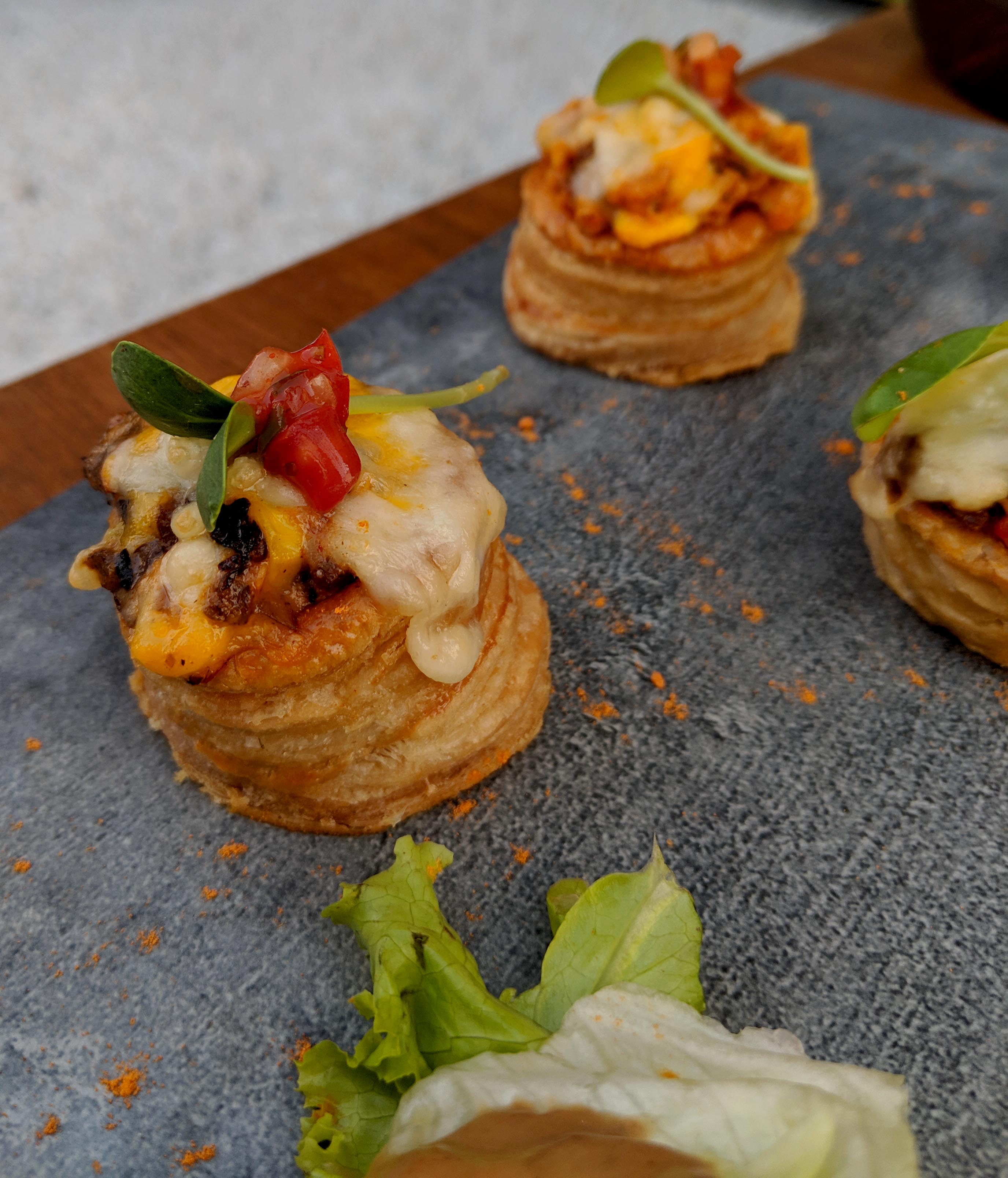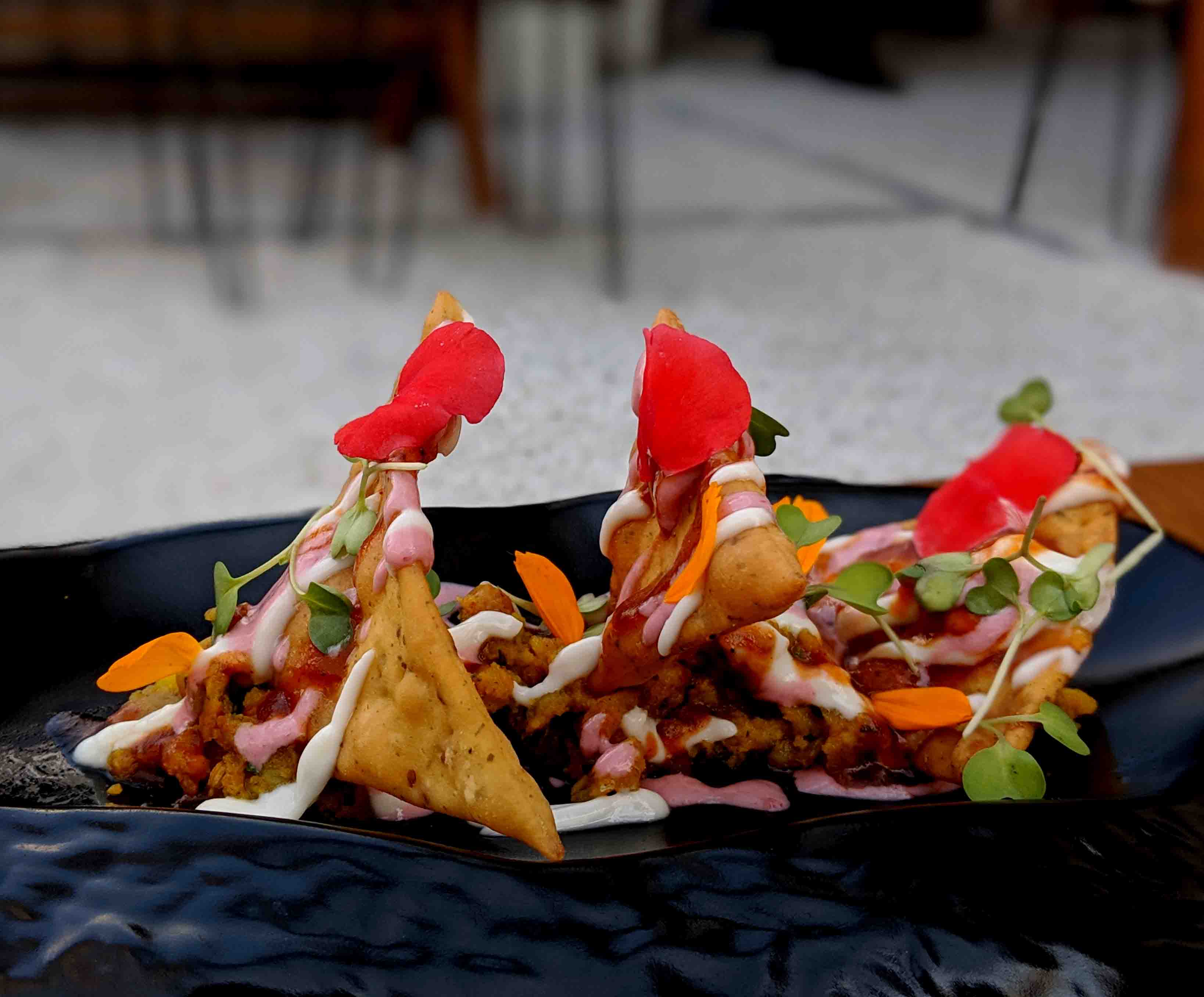And then a stunning preparation of Sharabi Chicken tikka. Succulent chicken tikka pieces, served on a sizzler plate, Flambeéd with whiskey. Deconstructed Samosa Chaat – crispies with masala aloo, yogurt, chutney and topped with rose petals. This novel kind of samosa chaat is spicy, an explosion of flavors and textures. Mongolian Mushrooms – button mushrooms stuffed with herbs and cheese, coated, fried and tossed in a sweet and spicy sauce. The mushrooms were among my favourites from Duty Free. Lots of textures, creamy flavours of the mushrooms. Vol au Con – puff pastry topped with vegetables, cheese and baked. The puff pastry should have been flakier and more buttery but would otherwise make for a great bar bite.