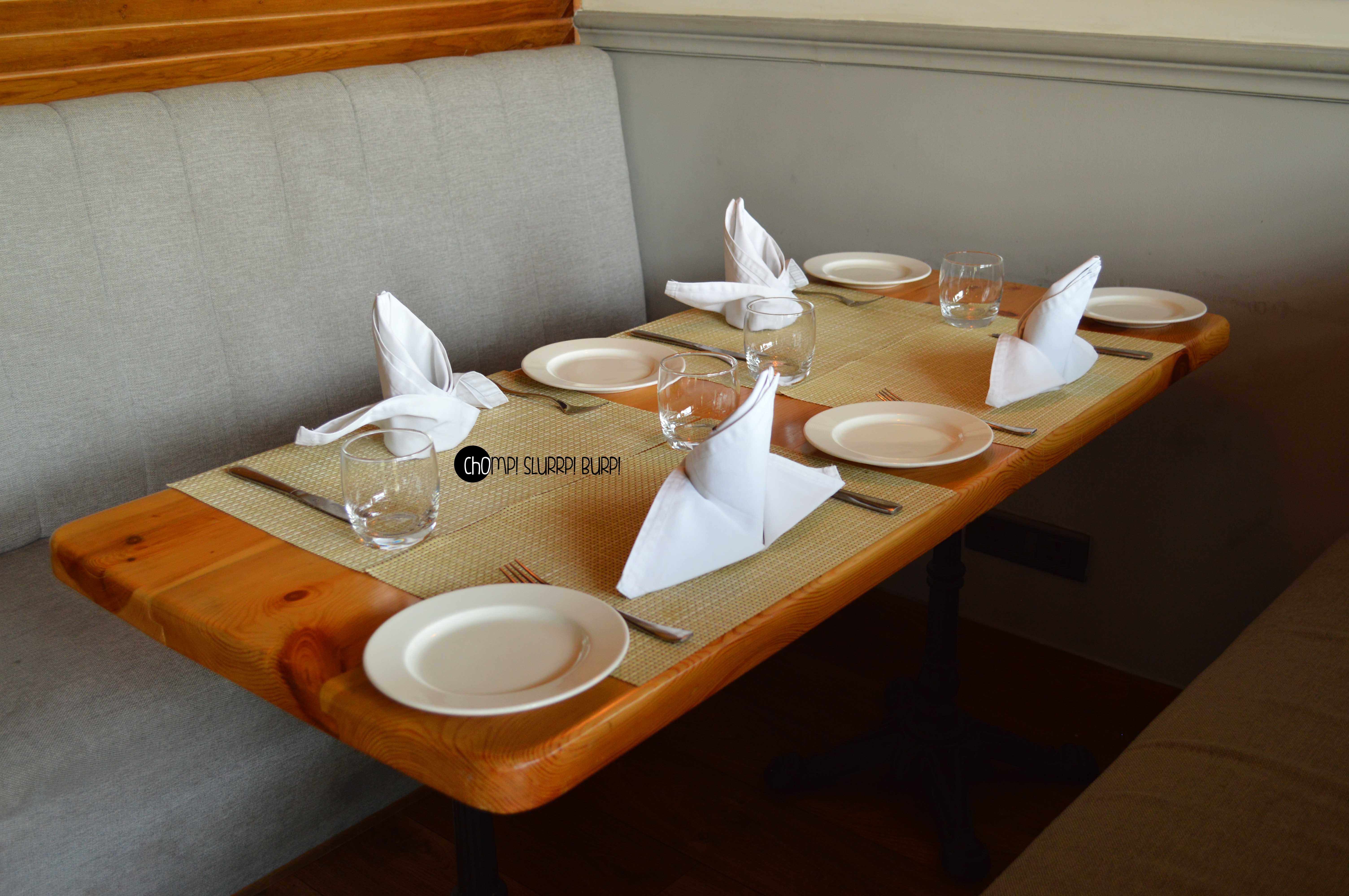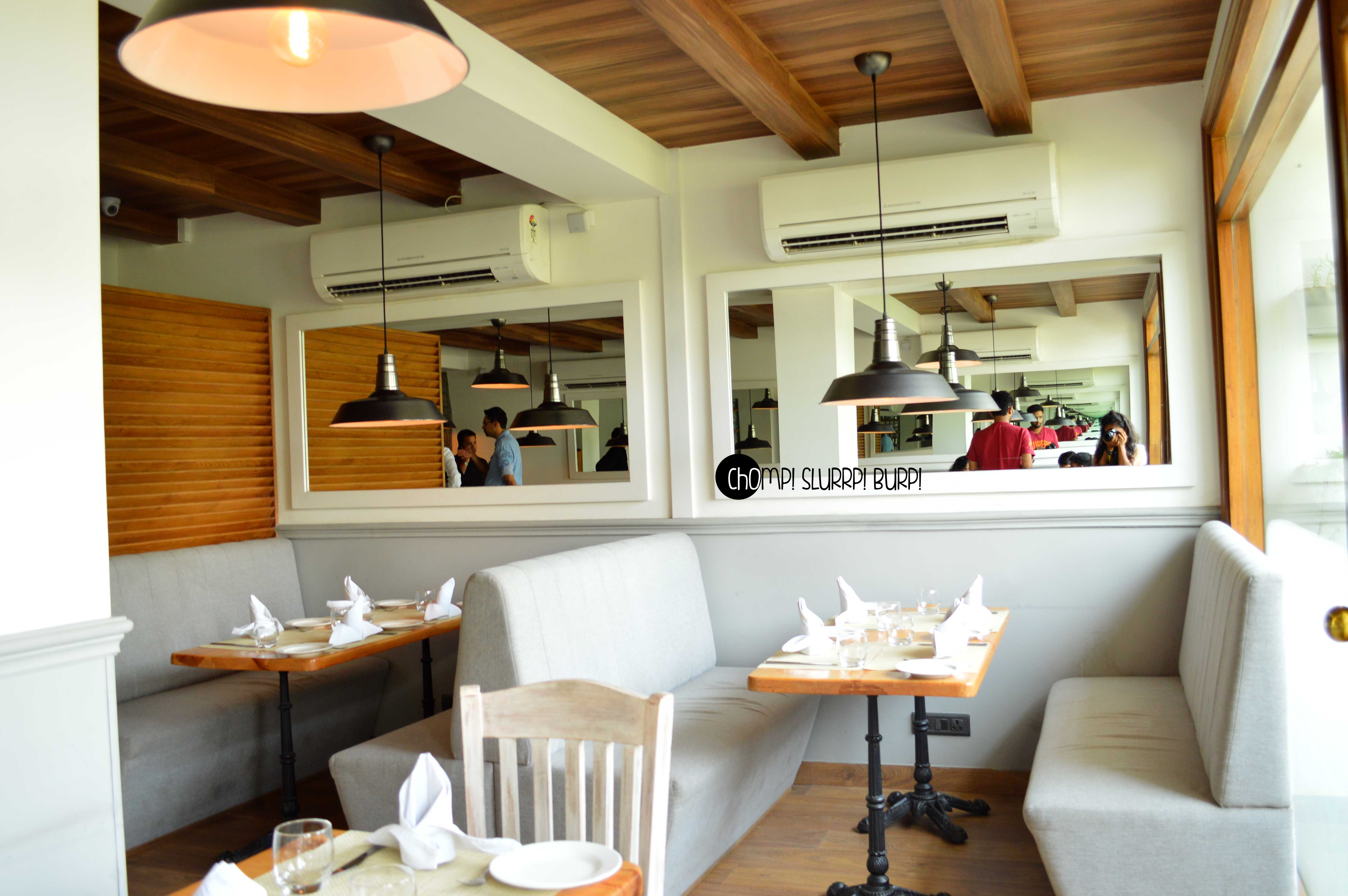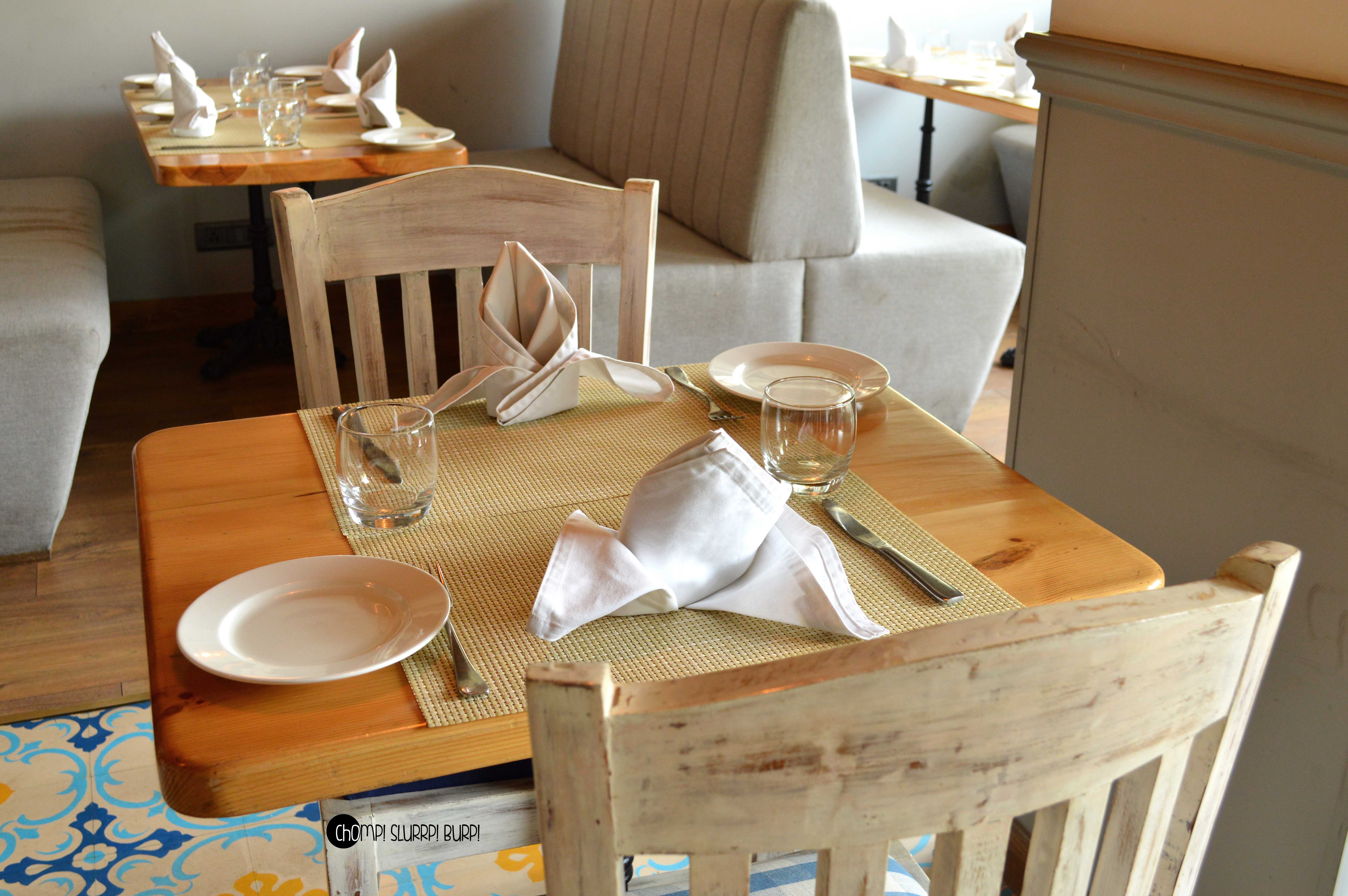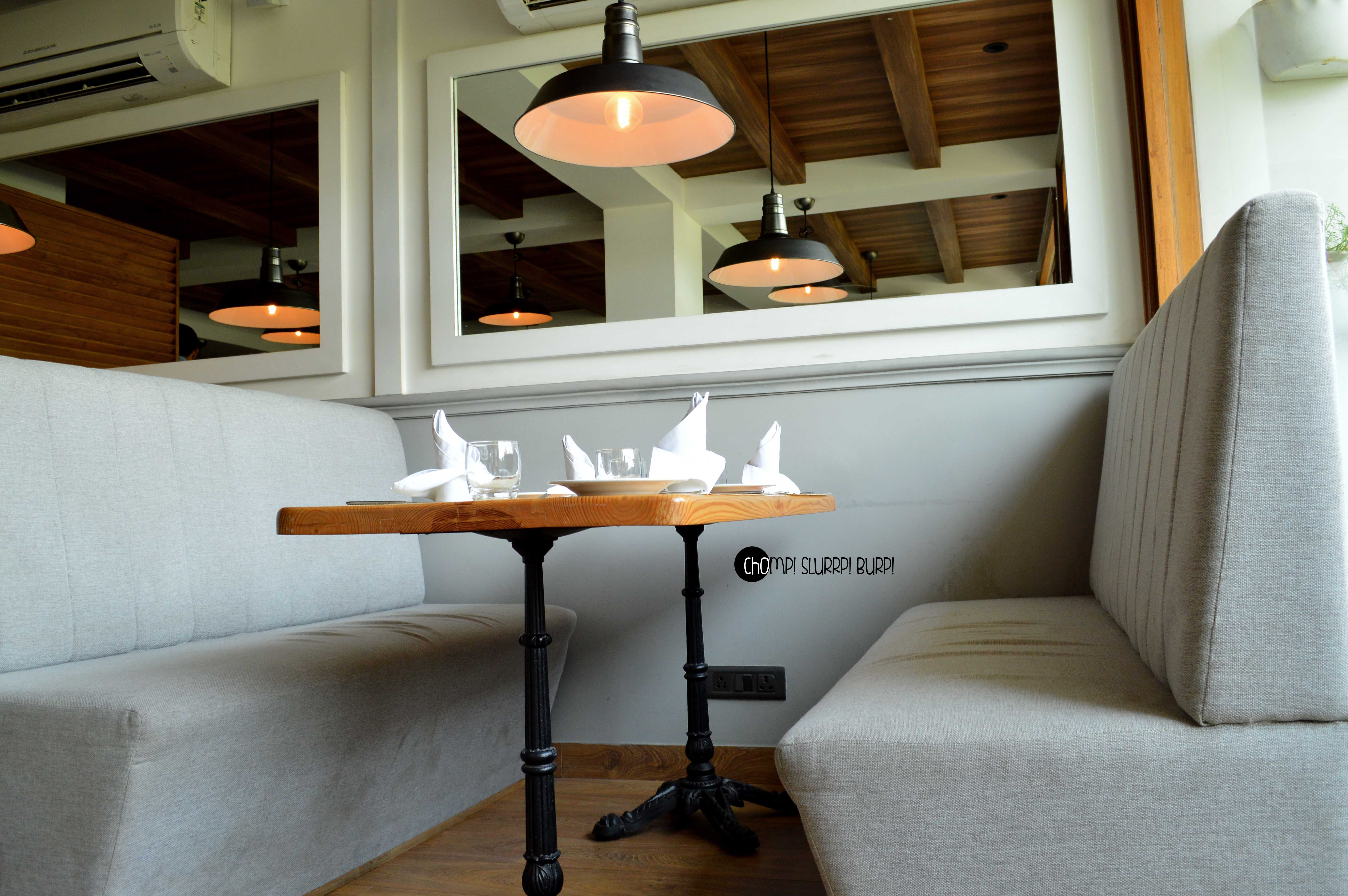 Coming to Dirty Apron – the place is not gigantic but the vibes are. The restaurant is spread over two floors – the first houses the bar, a wood brick fire oven and plush seating option. With sunlight beautifully bathing the place, the place is well lit and the huge mirrors and windowpanes make the ambiance very elegant.