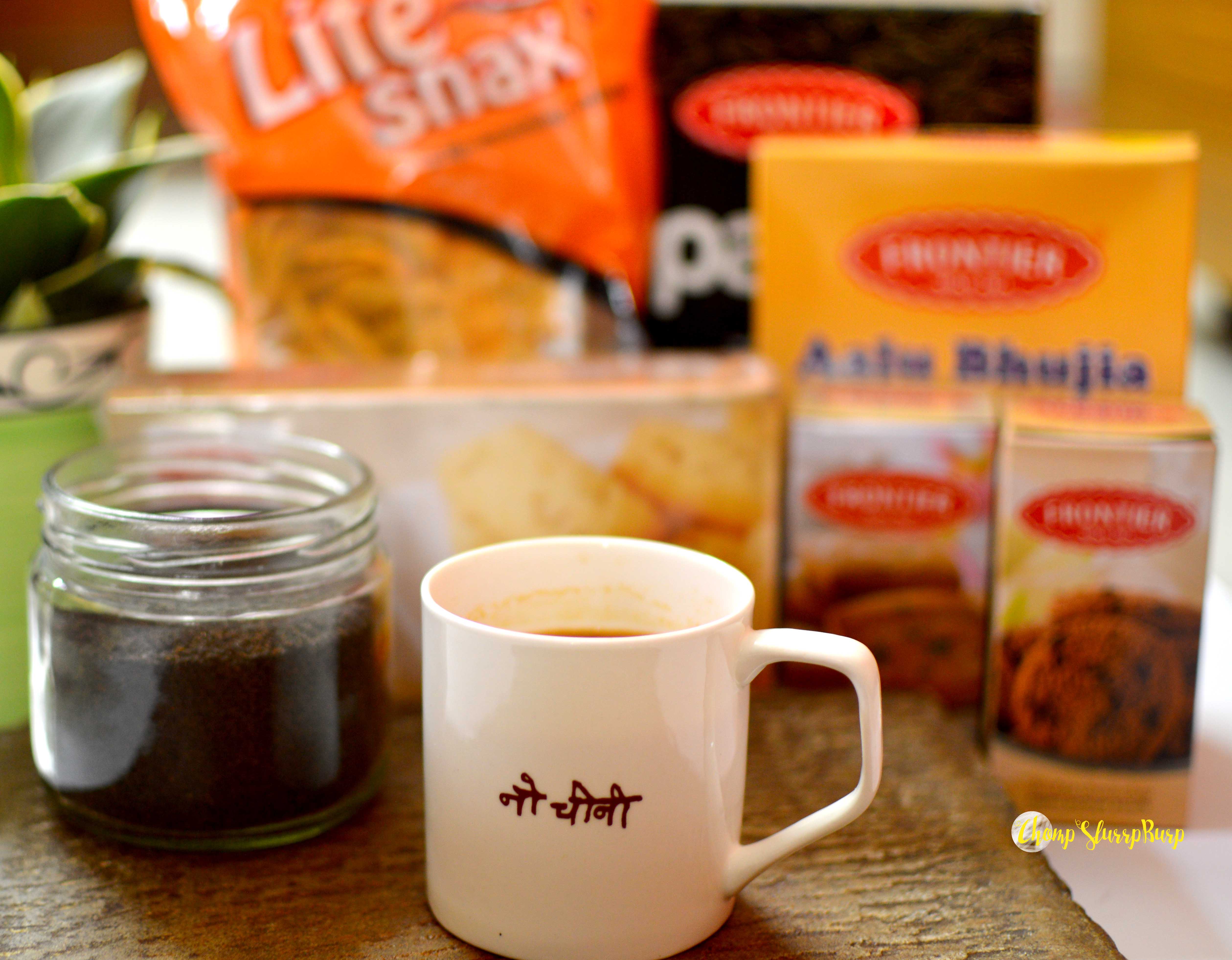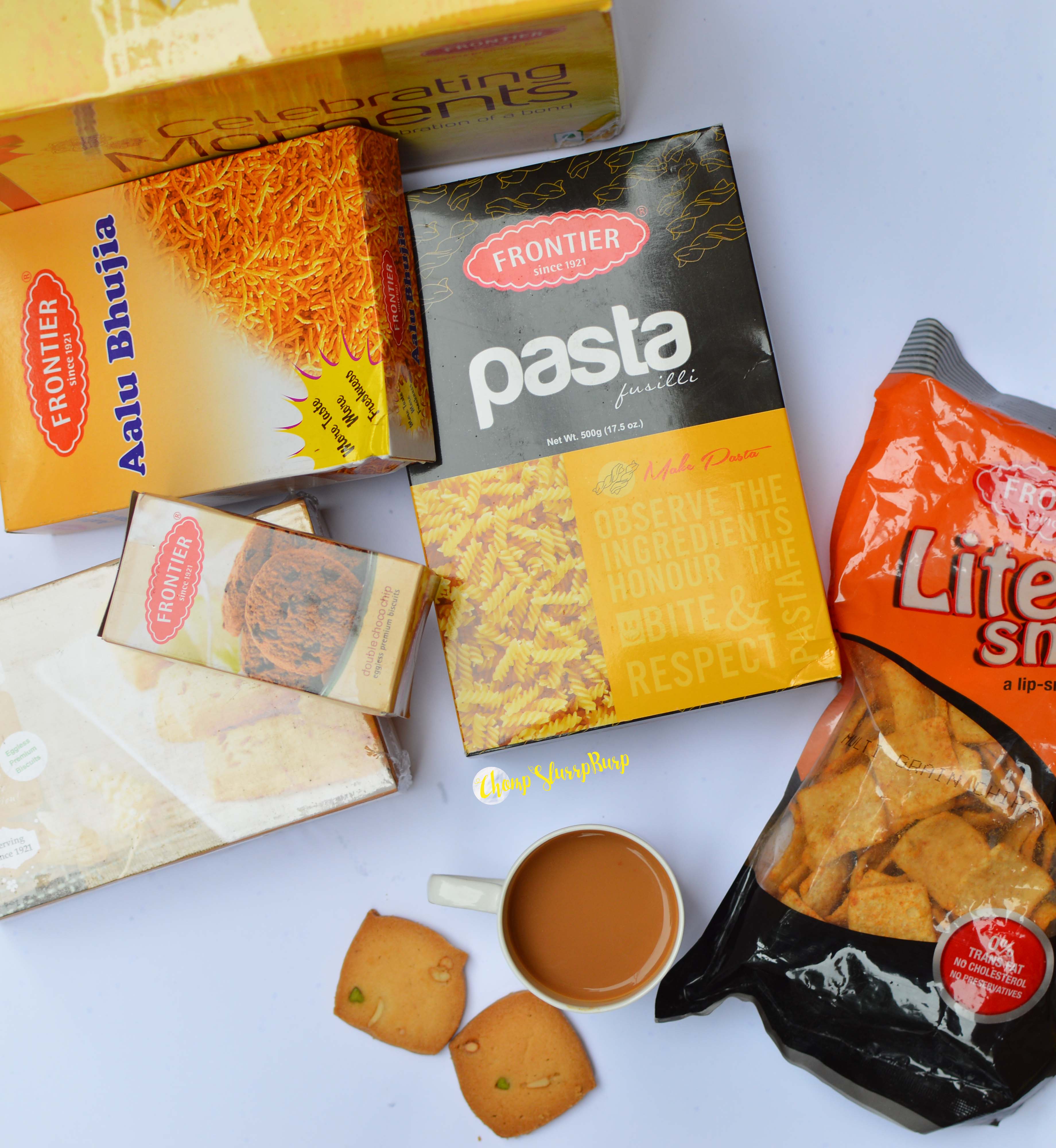 Frontier Biscuits have been tea time favourites for a long, long time now with eggless premium biscuits, cookies and savory snacks. Recently got a hamper full of love from Frontier and had the most fun with it. Lite Bite snacks, a fusilli pasta box, aloo bhujia, chocolate chip cookies, pista biscuits, jeera biscuits and tea.