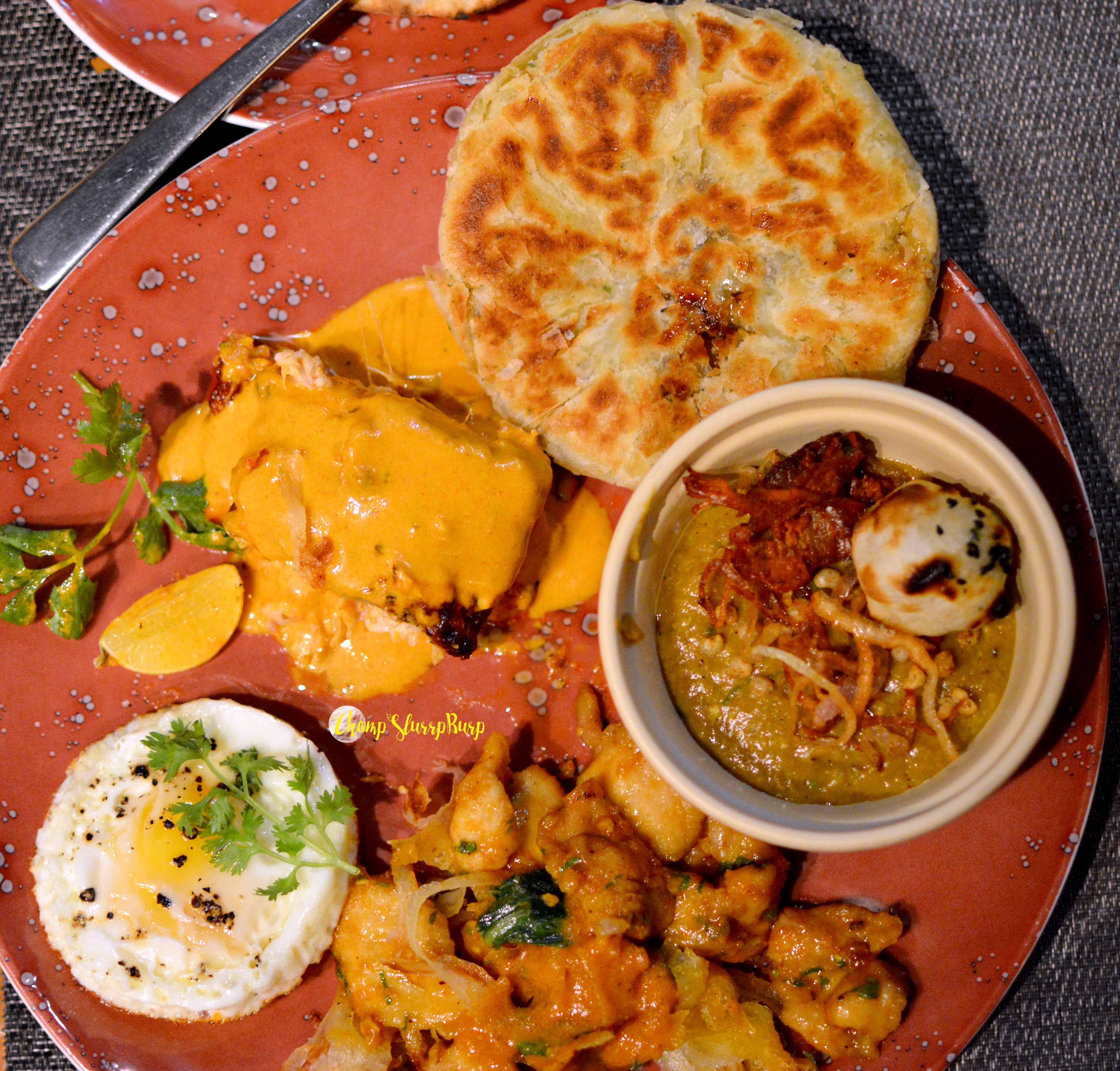 Churry Kutti ‘Crumbled bread’ chicken and egg – the chutty kutti comes on a bed on crumbled, soft layered parantha with delish bits of succulent chicken and a fried egg. This too comes with a tomato base gravy to add more zing to the superb dish. A special mention to the breads – 5 grain roti for the conscious but what you absolutely can’t miss the chur chur naan stuffed with rum soaked rains and spinach and raw mango sweet and spicy chutney.