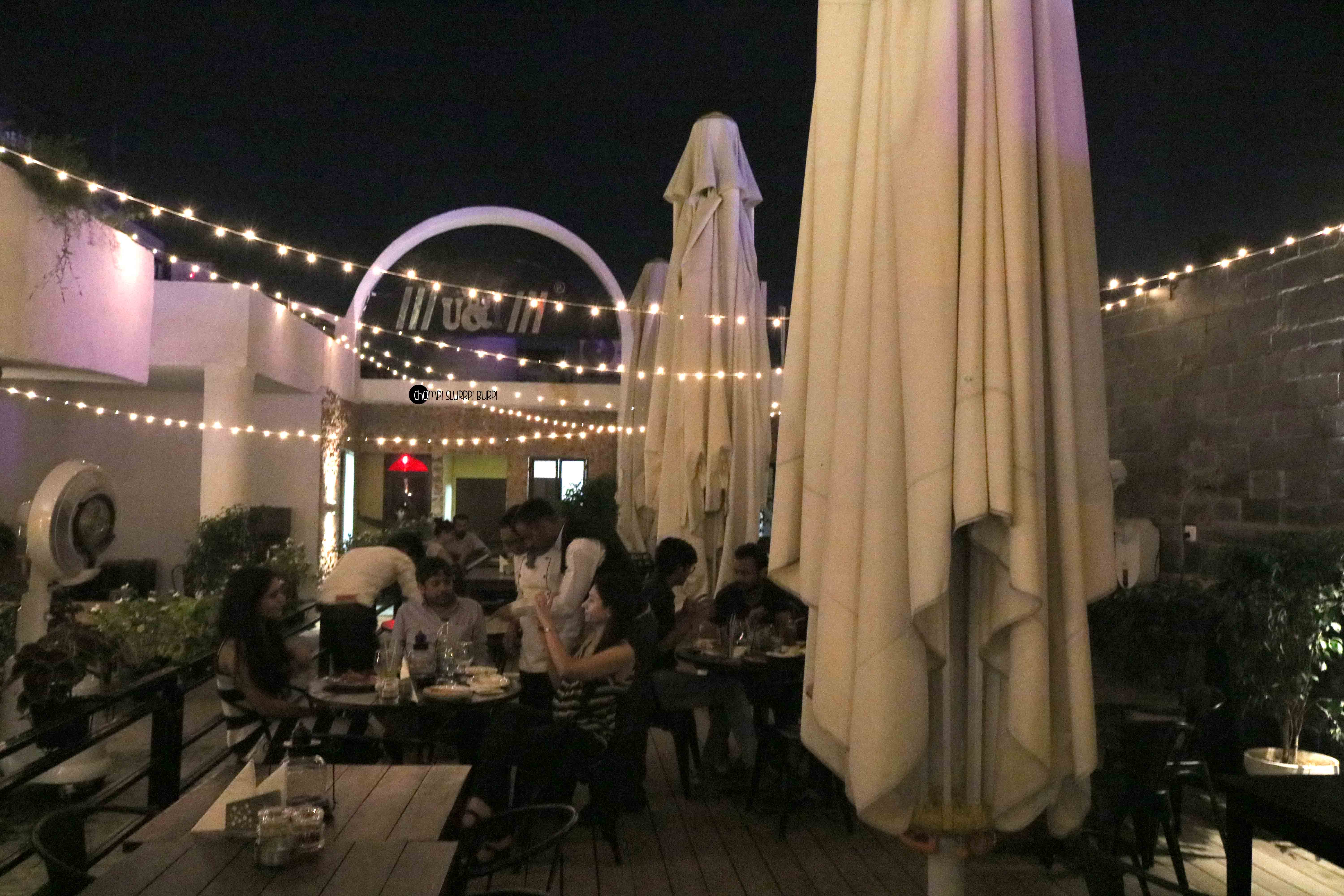The first floor is a casual dining place with high stools, comfy seating and a bar, basically like the popular bistro concepts with a DJ. The second floor beautiful, it is an open terrace with firefly lights with a view of the entire area.