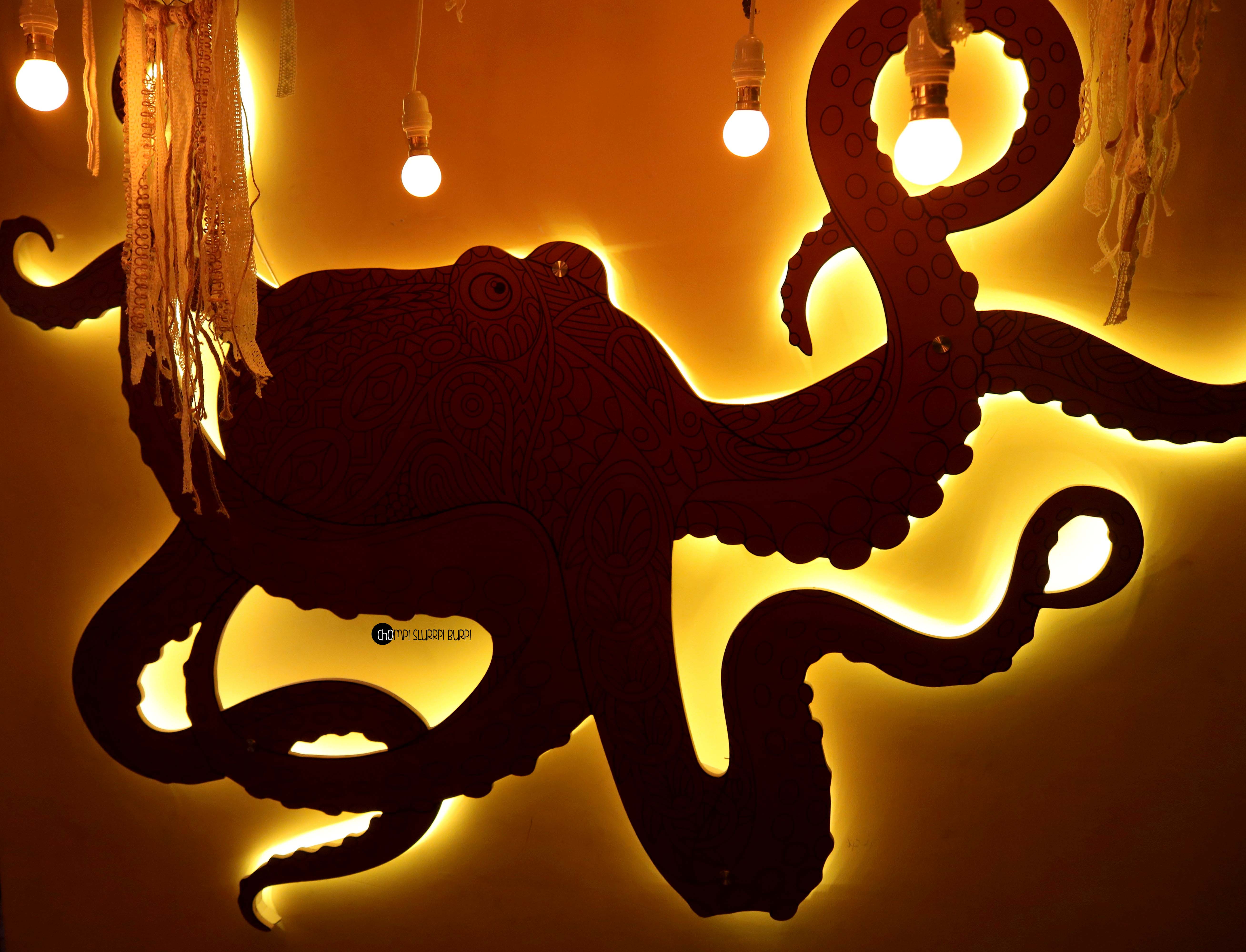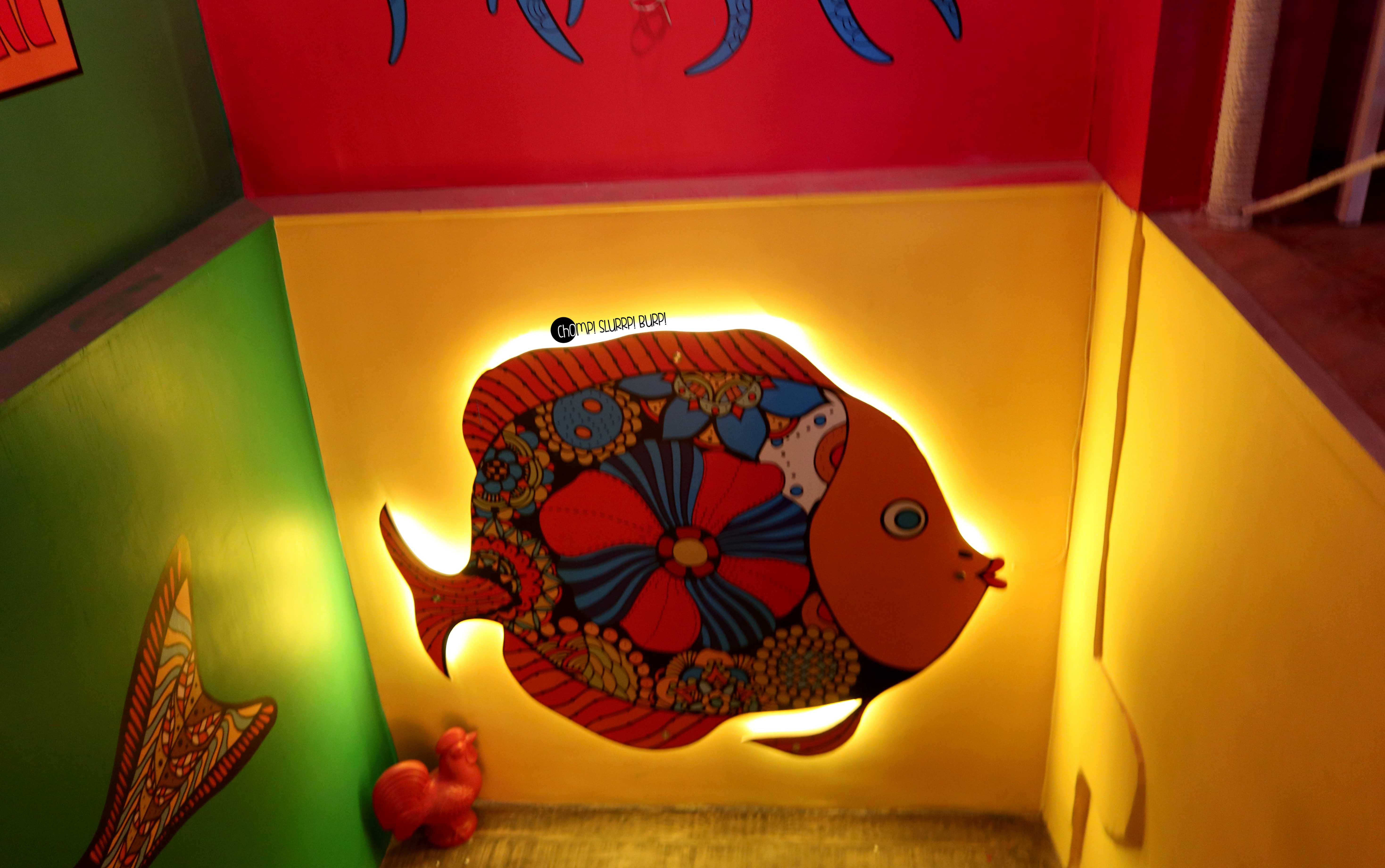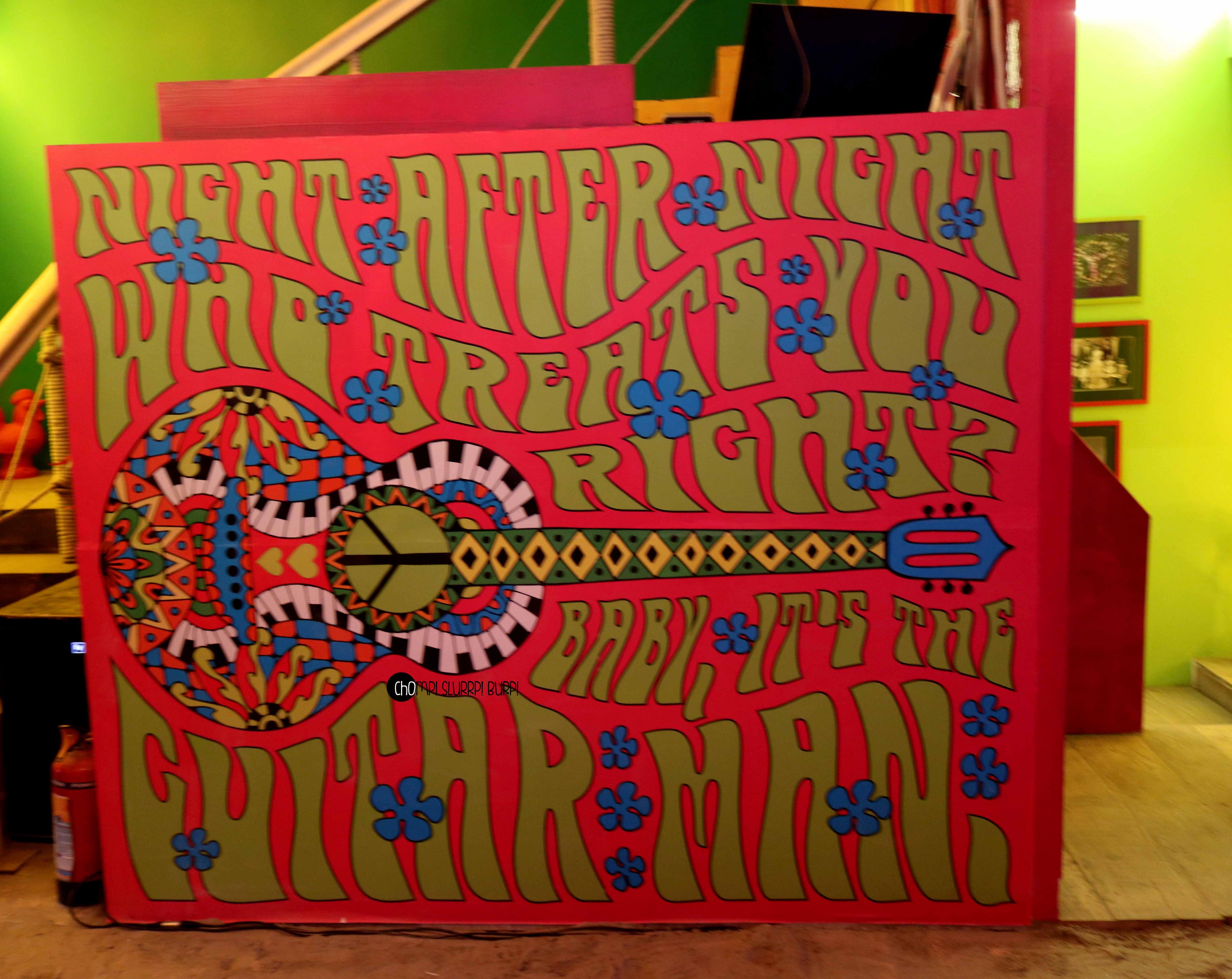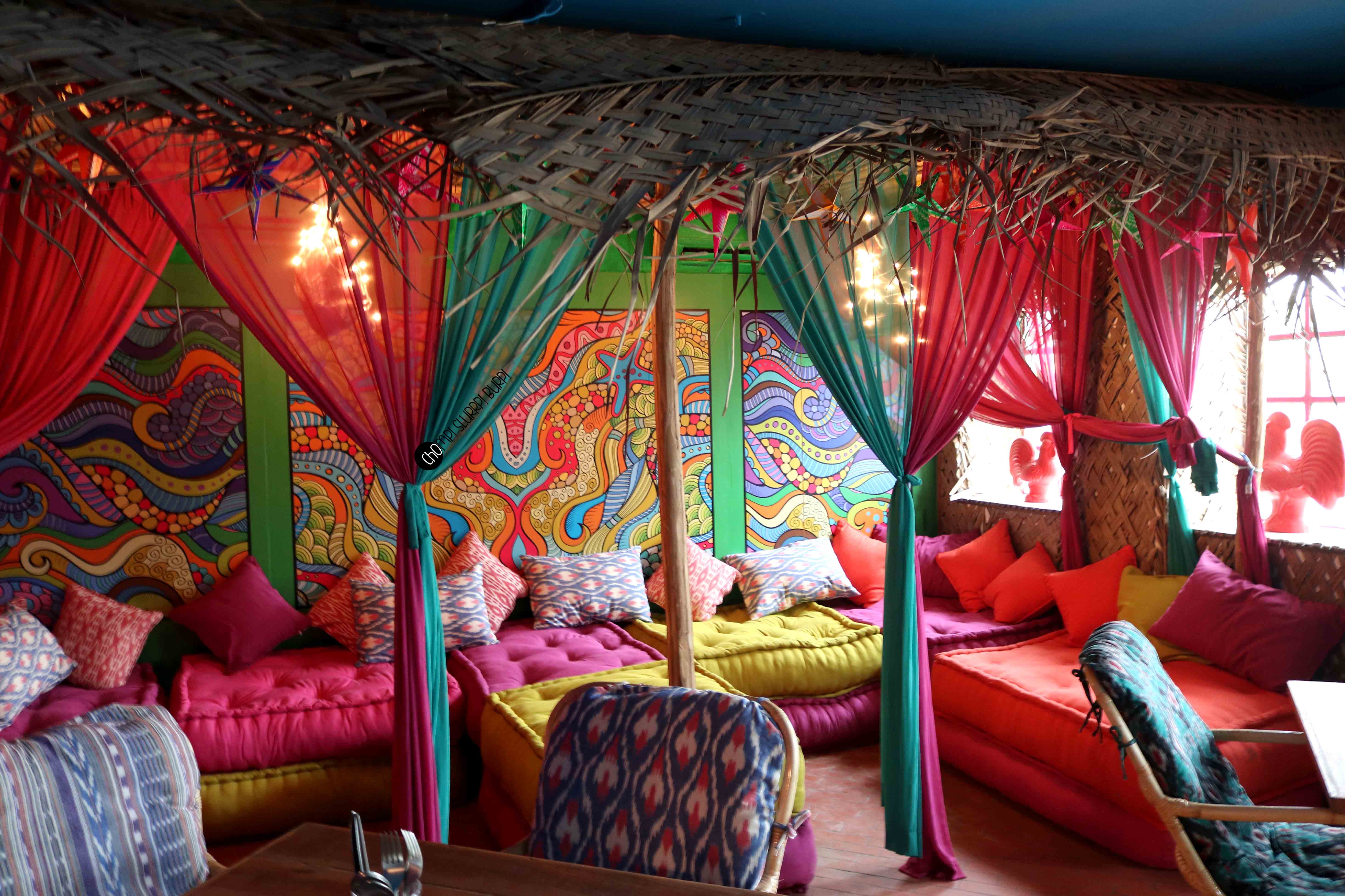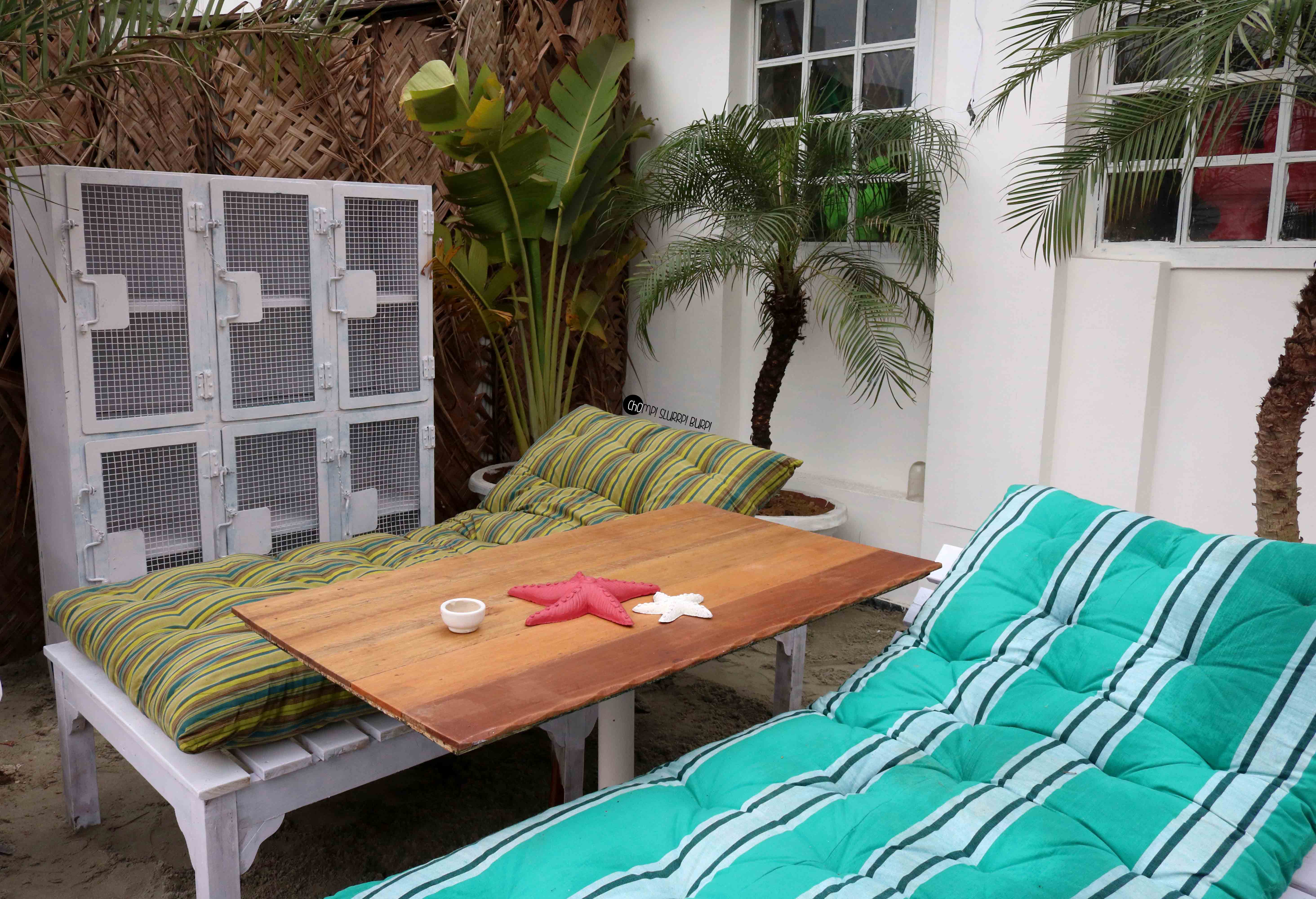 The restaurant adorned with quirky installations, bright colors and decorative elements such as fairy light, hippe signs, even a hammock in the balcony. They have tried to recreate the Beach feel with sand on the floor & a wall with a motion picture of the beachside, while this could look great in the evening, at lunch it was offsetting the entire feel.