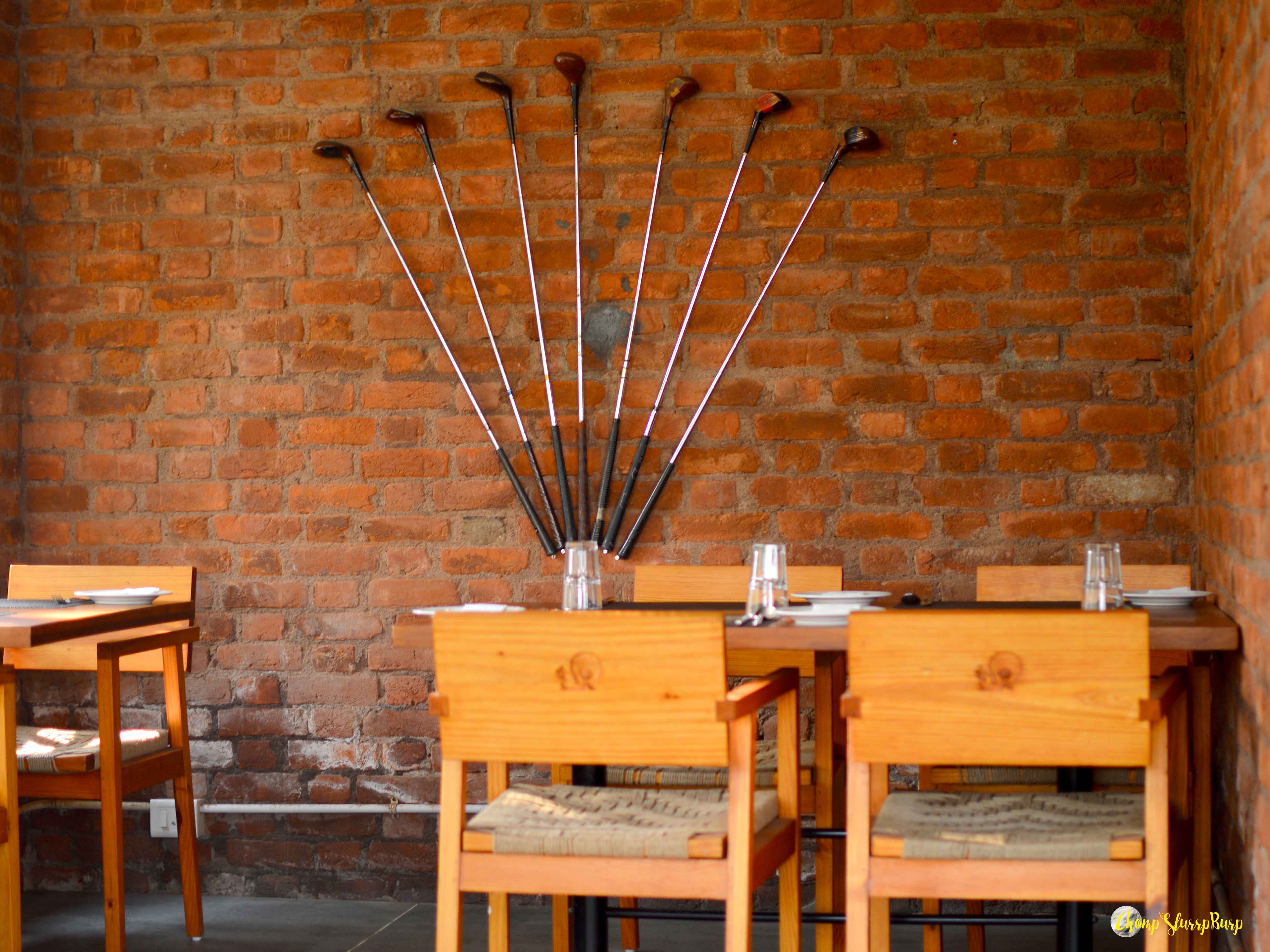 It was one of those days which were meant only for good food, lots of sunshine and after literally an hour of contemplating where to head to, we came across this gorgeous place on Zomato. A gorgeous cafe located inside a Golf Course with an Imperial style menu and beautiful rustic ambiance. Red brick walls, golf clubs, books, and board games and the lush greens of the Golf Course, dine at this quiet and quaint Cafe.