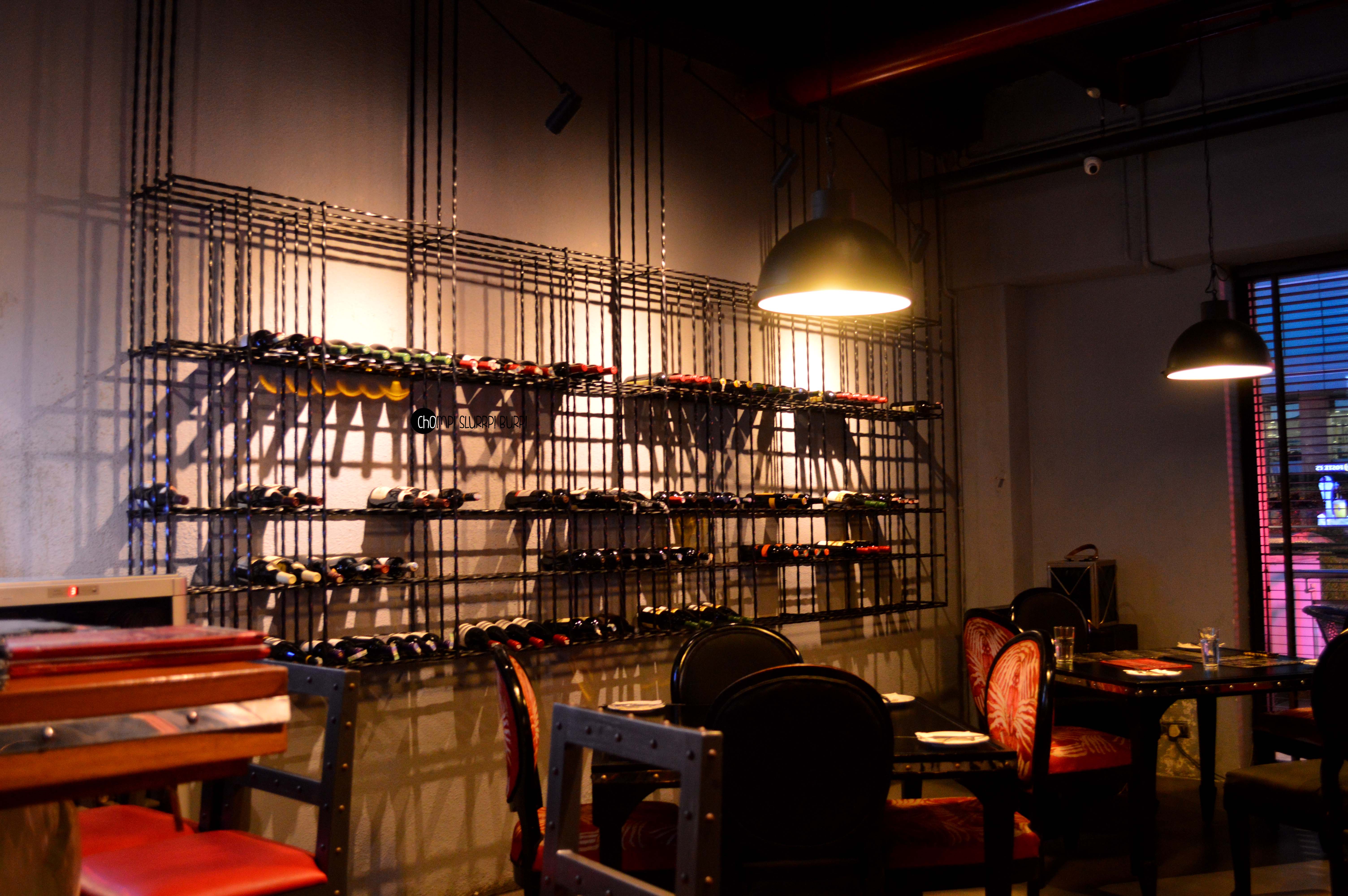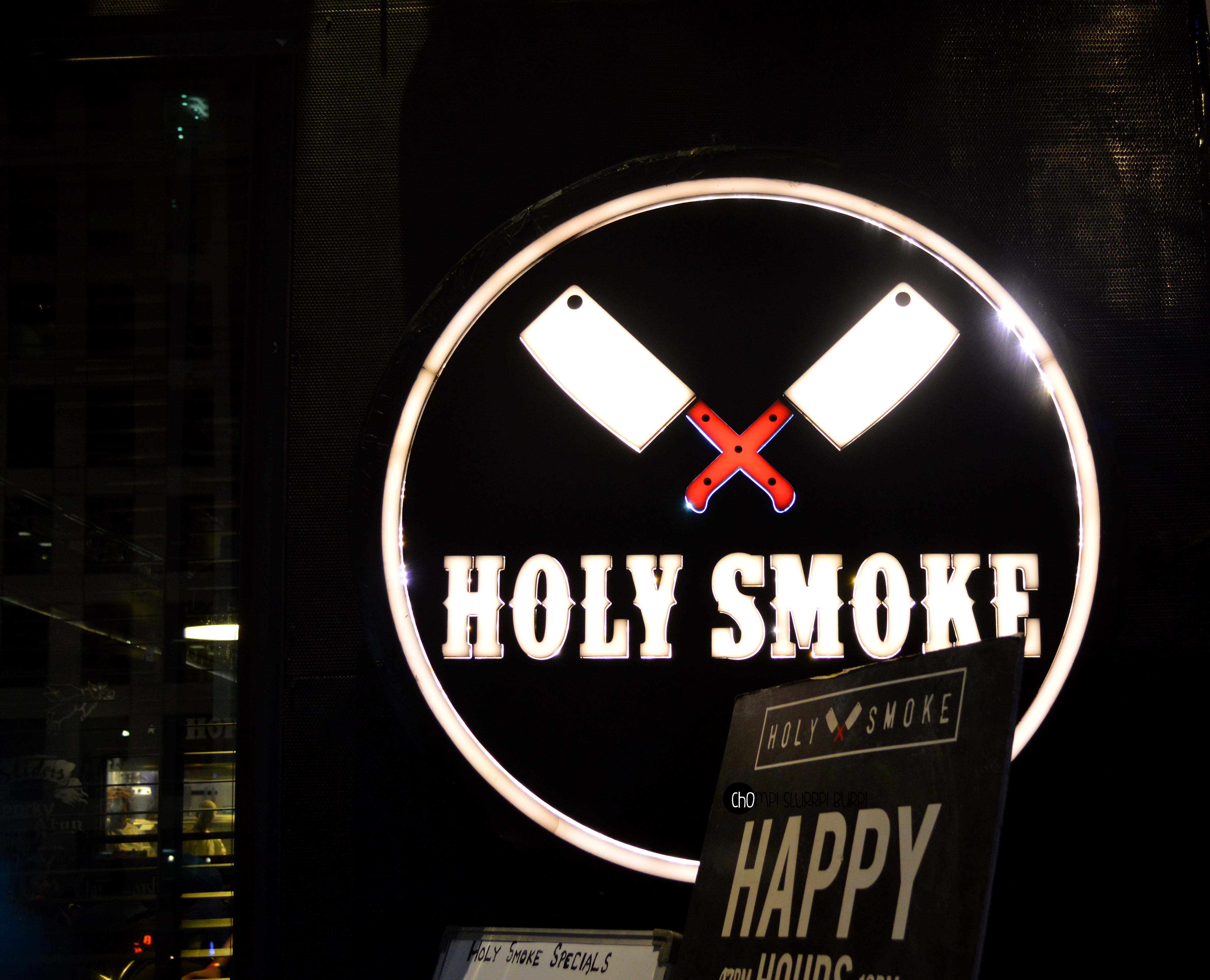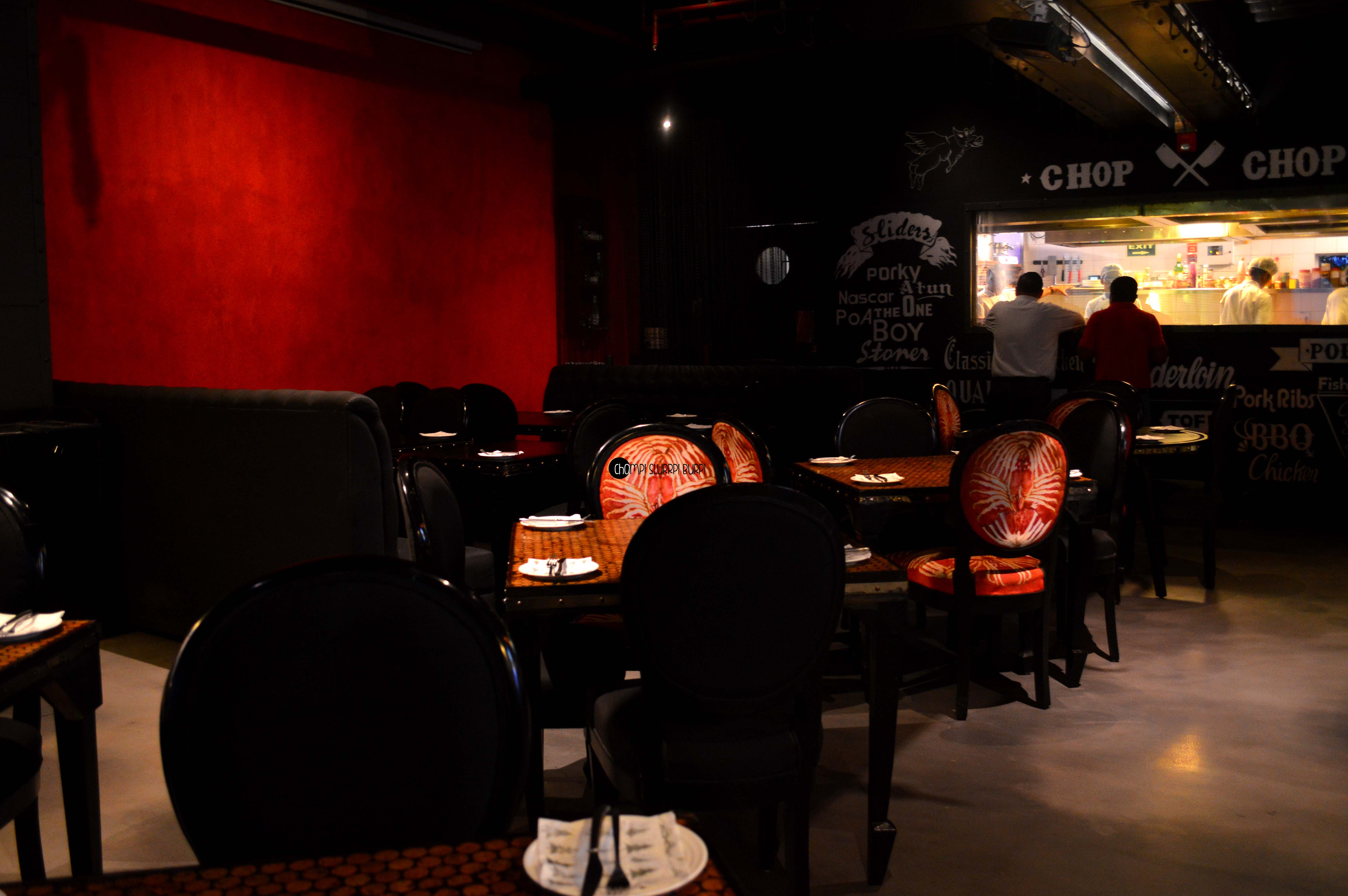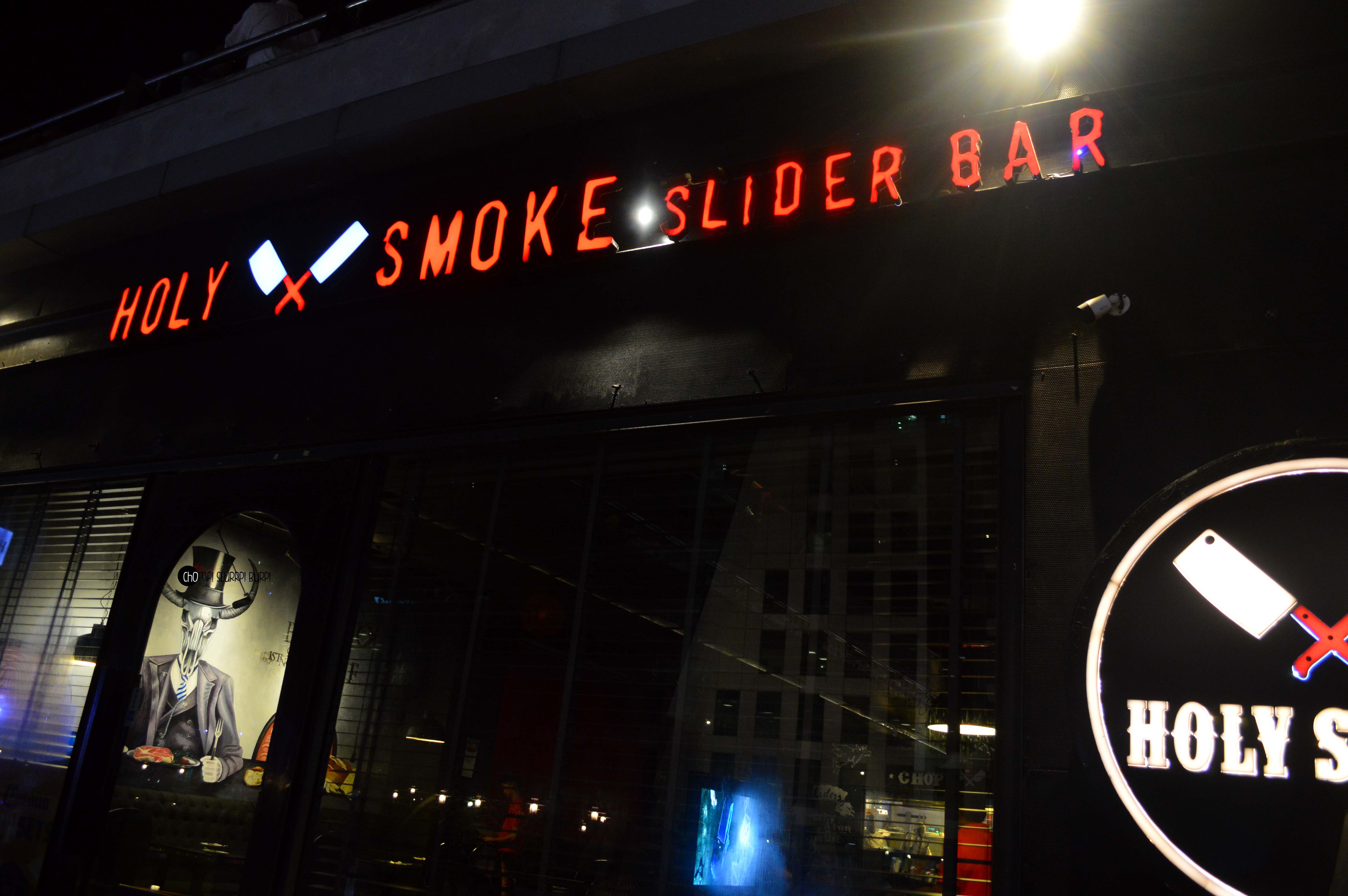 Holy Smoke is one of its kind slider bar offering tantalizing steaks and a range of American favorites. Two butcher knives welcome you to work on your appetite and get ready to tear apart some mean meats. The place is a haven for meat lovers with a really cool graffiti of a meat eater, chairs covered with steak print, dungeon like chains, an open kitchen and big black tables for those with bug appetites. They also have a full fledged bar and an exquisite wine collection to accompany your meats.