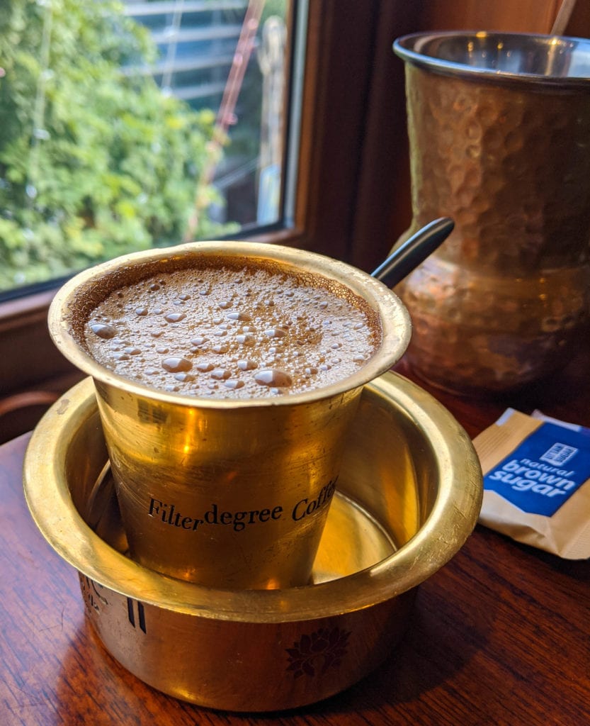 Our breakfast order was simple – Mushroom Chettinad Dosa and Vegetable stew with appams. Chettinad, from the state of Tamil Nadu is the food of the community called Nattukotai Chettiars. They use a variety of whole ground spices, sun-dried meats and salted vegetables. They also use rice-based breads – dosa, appams, idiyappams and more. The palate is generally very flavourful and on the spicier side.