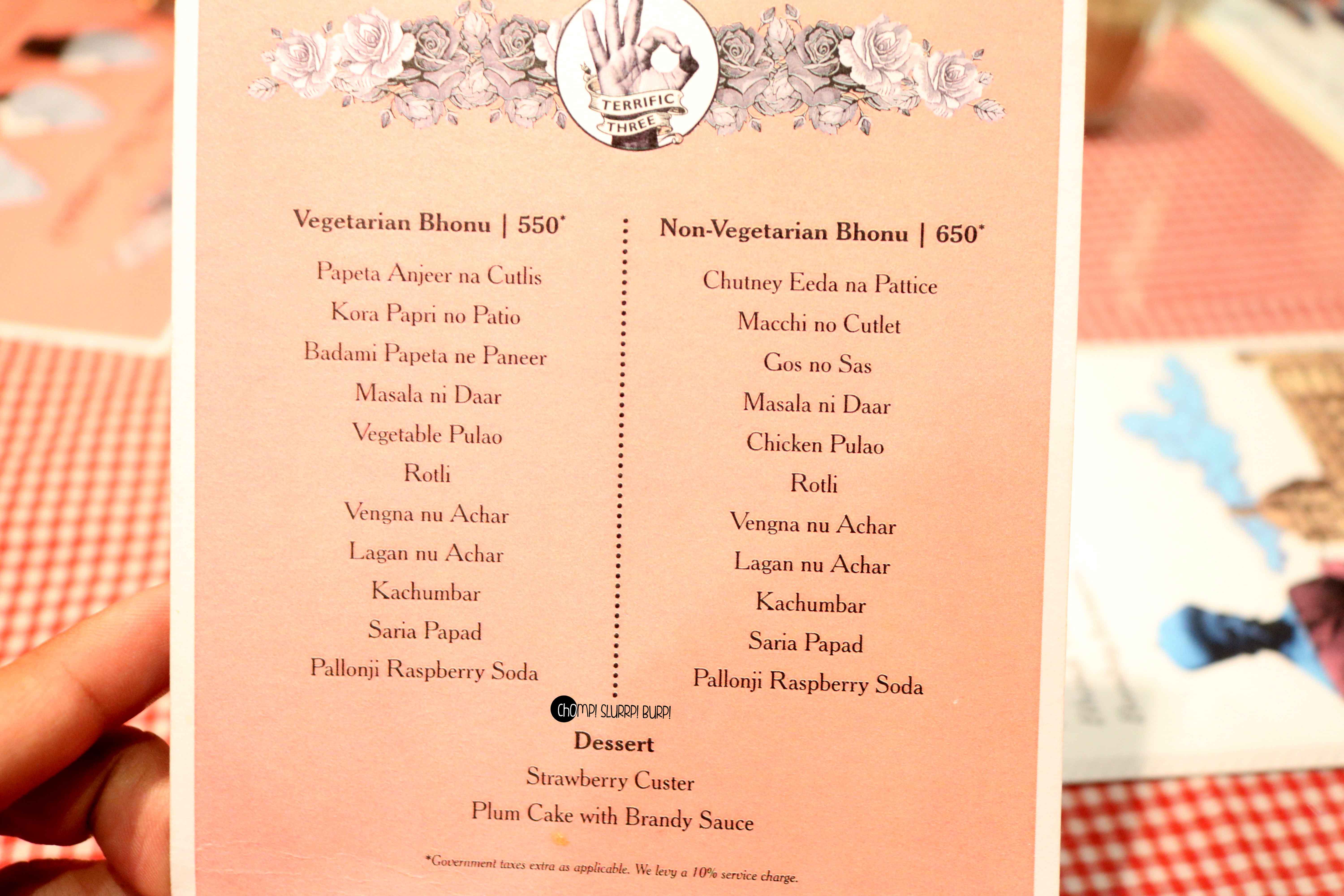 SBOW serves the feast in an elaborate thali, The menu for the Non Veg Bhonu is Chutney Eeda na Pattice, Macchi no Cutlet, Gos nu Sas, Masala ni Daar, Chicken Pulao, Rotli, Vengna nu Achar, Lagan nu Achar, Kachumbar, Saria Papad, Pallonji Raspberry Soda, Strawberry Custor and Plum cake with Barandy Sauce.
