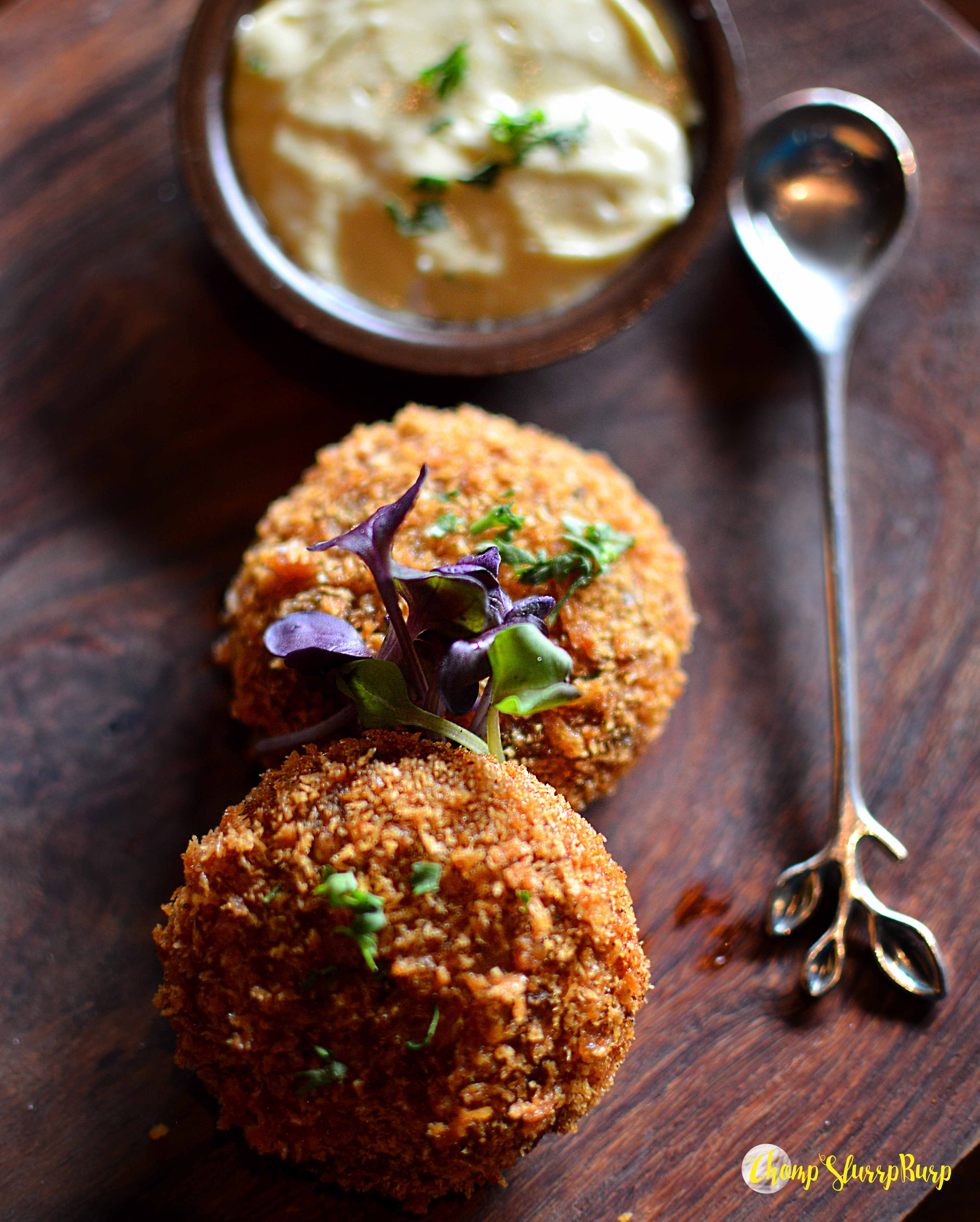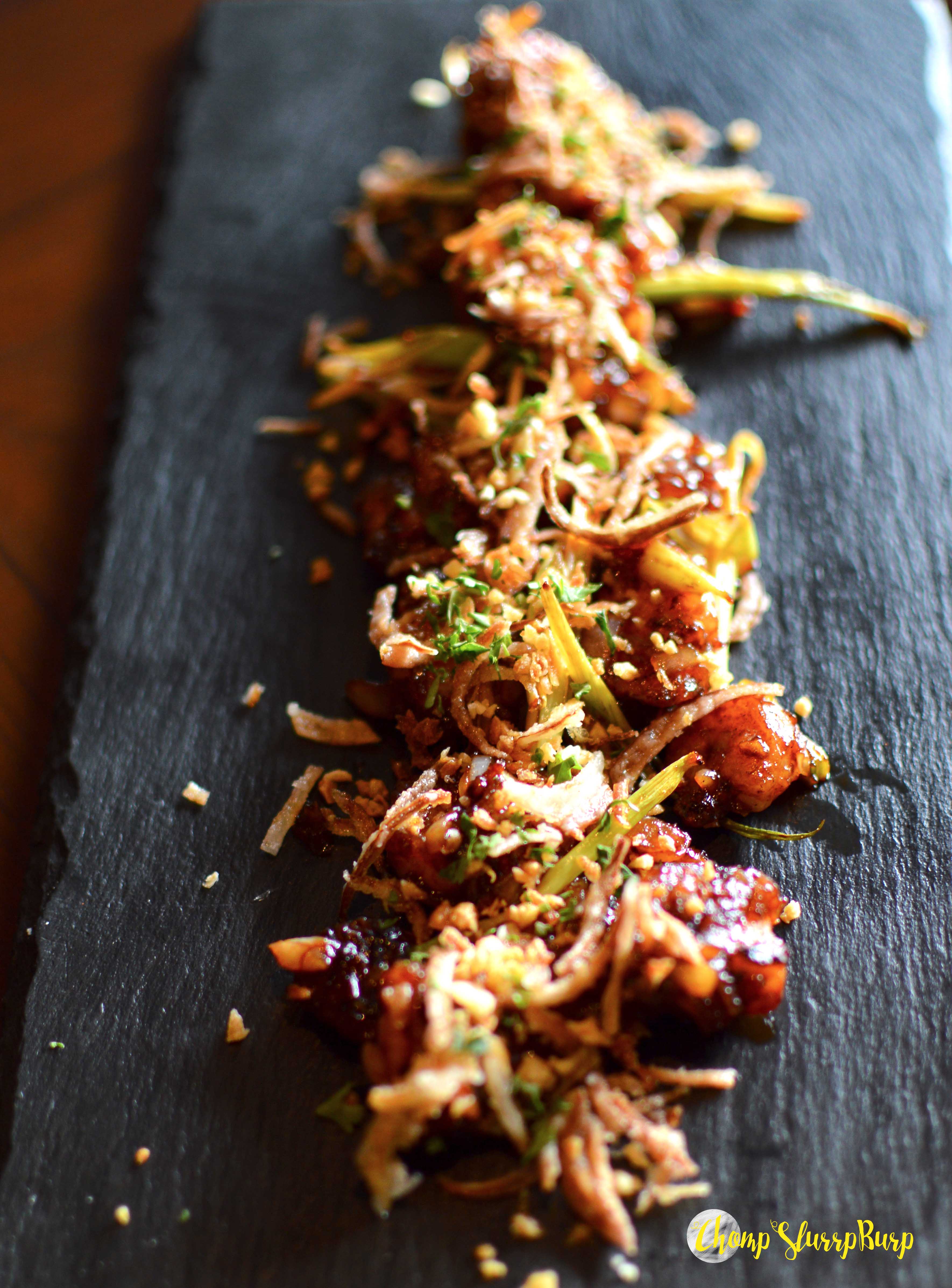Galauti Sliders – what new could have been introduced with galauti kebabs, and here comes the most awaited fusion. An open cocktail burger, tomato, onion ring, succulent galauti kebab topped with mint mayonnaise and olives. The bun could use a lot of work but an excellent prep. Burnt onion prawns – a house specialty, shrimps tossed with a sweet and chilly sauce, spring onions and burnt onions shreds. Perfect bar bite. Pulled Pork samosa – now don’t kill me but unless I see samosas with a meaty filling I don’t order it. A buttery puff pastry with a toothsome filling of pulled pork and served with a spicy mayo dip. Bengali crab cakes – minced crab meat made into soft patties and a crusty top, the brittle meat did not quite appeal to me. Petite Gouda Naans – mini naans have become too mainstream stuffed or topped with cheese. Stuffed with Gouda cheese and served with a sweet tomato and onion chutney. The naans needed to be a lot more cheesy to be impactful. Lots of molten cheese and this dish has the potential to become a hot bar bite.