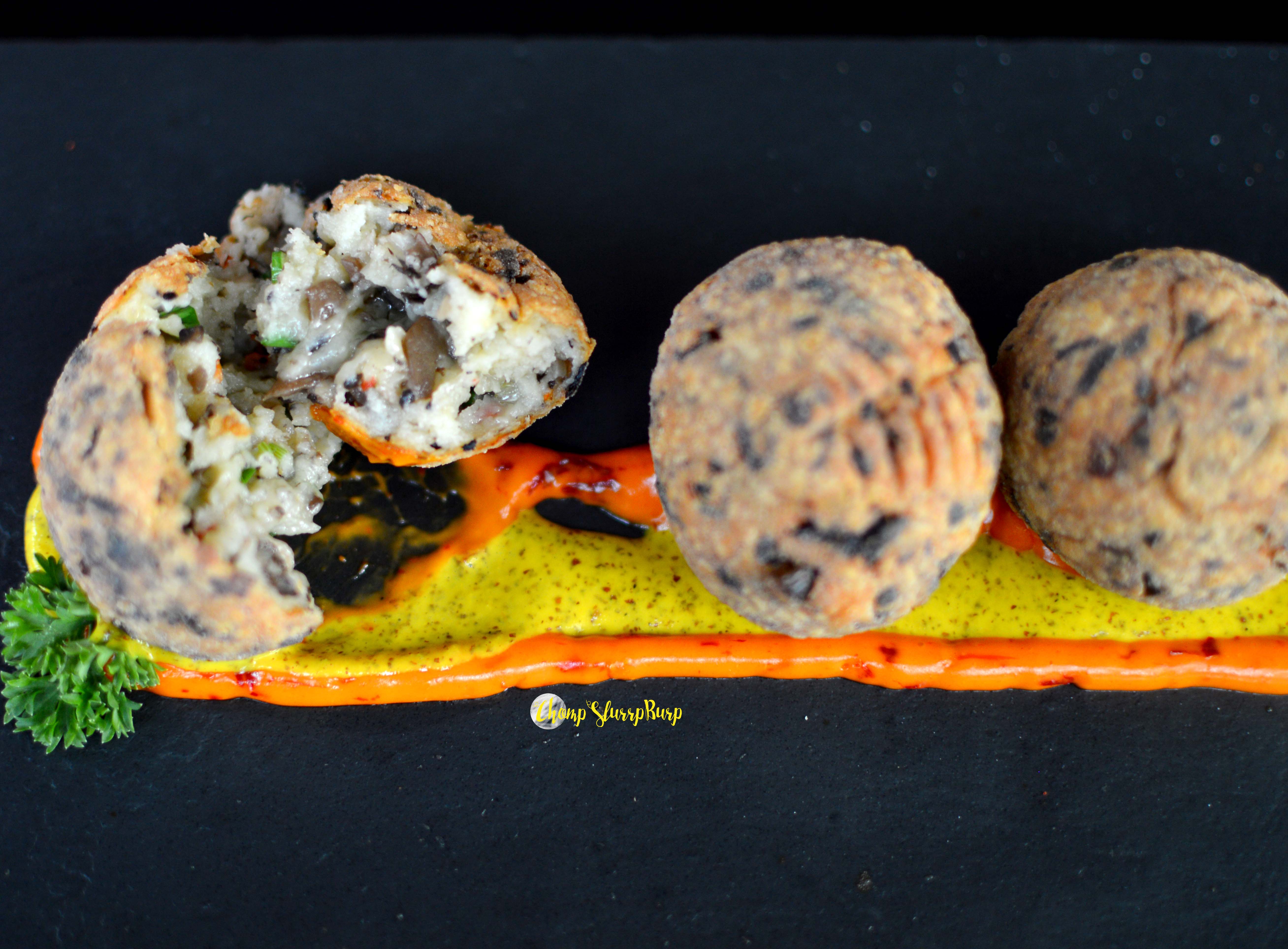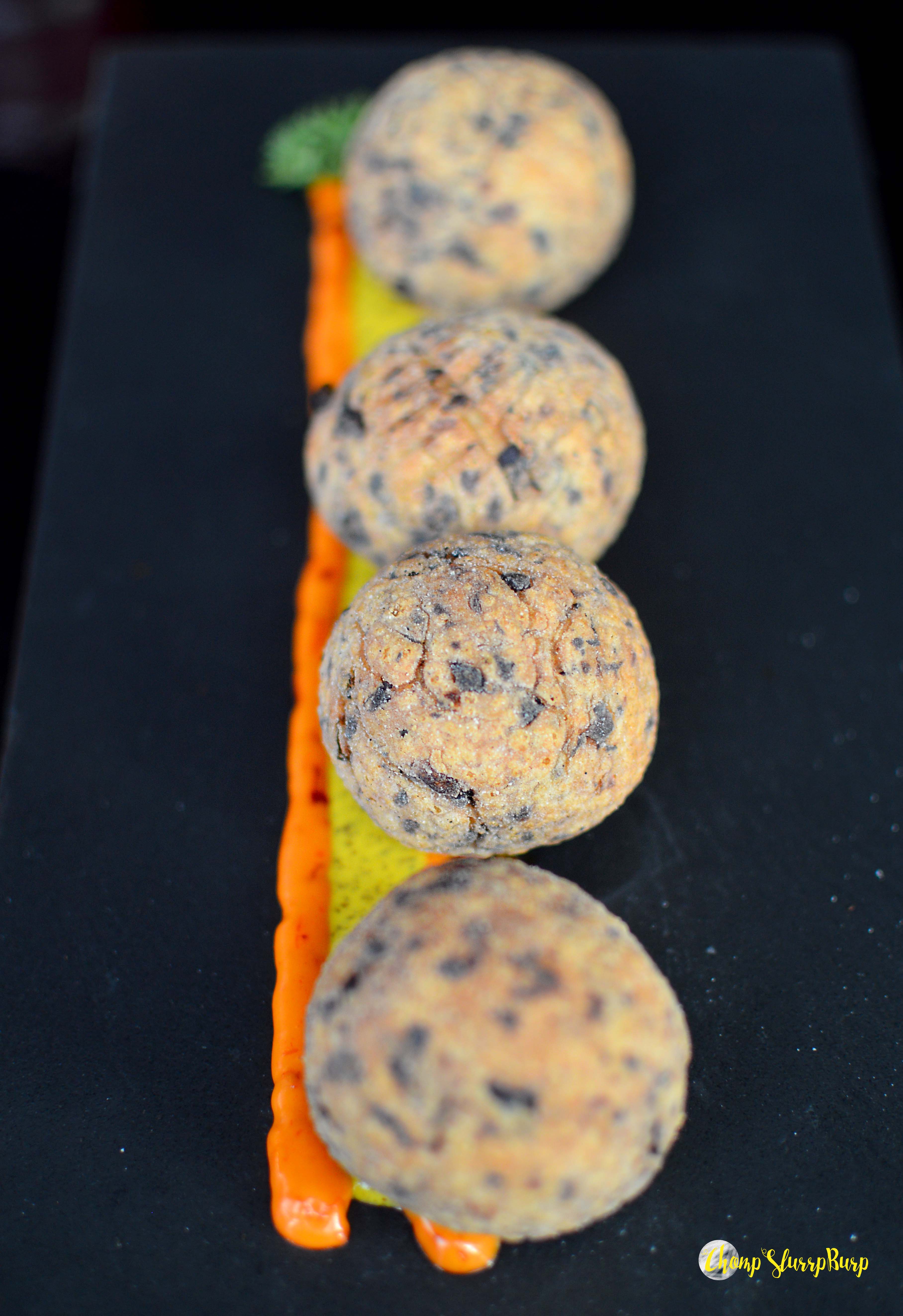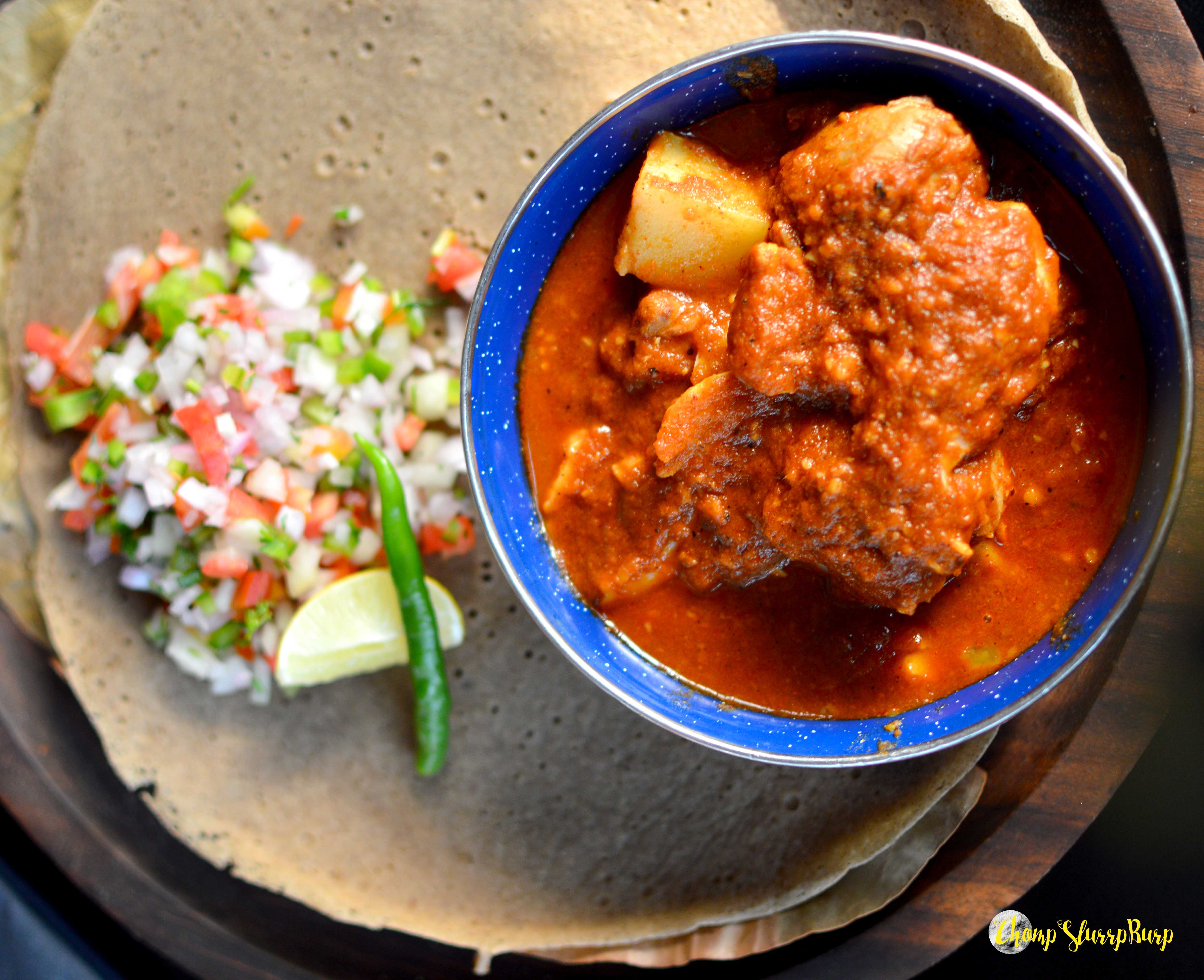 We had reached for late lunch, so the tandoori options were busted. We opted for a Shoe Roll and Ethopian dorawat with injera. We intended to also order dessert but were bursting after. The shoe roll – fluffy dumplings of choux pastry, cheese, mushrooms and black pepper, served with fresh kasundi and a cheddar and chilly dip. Crispy balls filled with delicious cheese and crunchy mushrooms, the winning bet was the fresh, fresh kasundi which supplemented the shoe roll only too well. Ethiopian dorawat with injera – a traditional fiery African chicken stew served with a soft pancake. A huge multi-grain soft pancake, with a very home like spicy thick gravy, succulent on the bone chicken and potatoes and an onion, tomato and cucumber kachumber salad with chillies and lemon dashes.