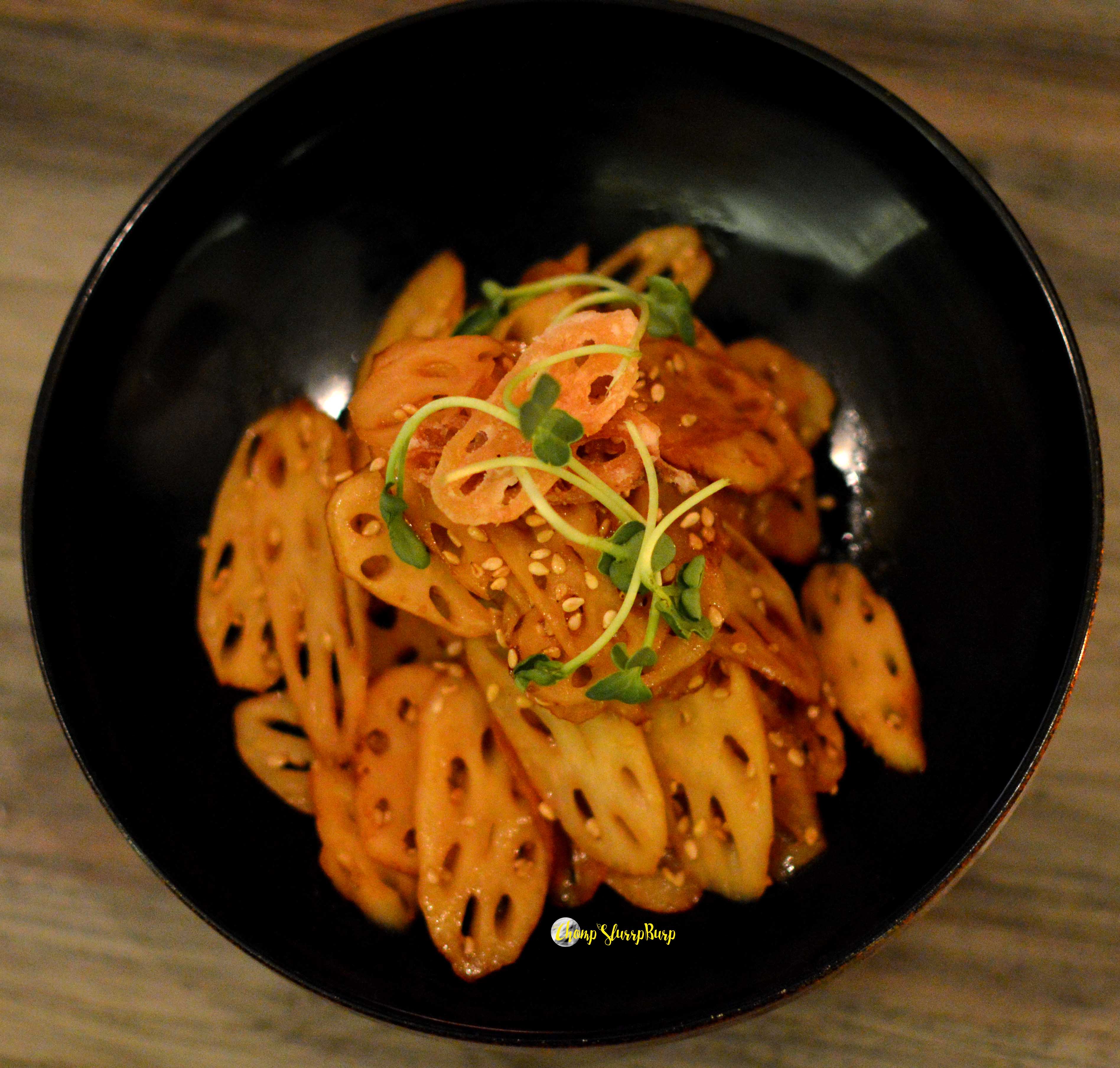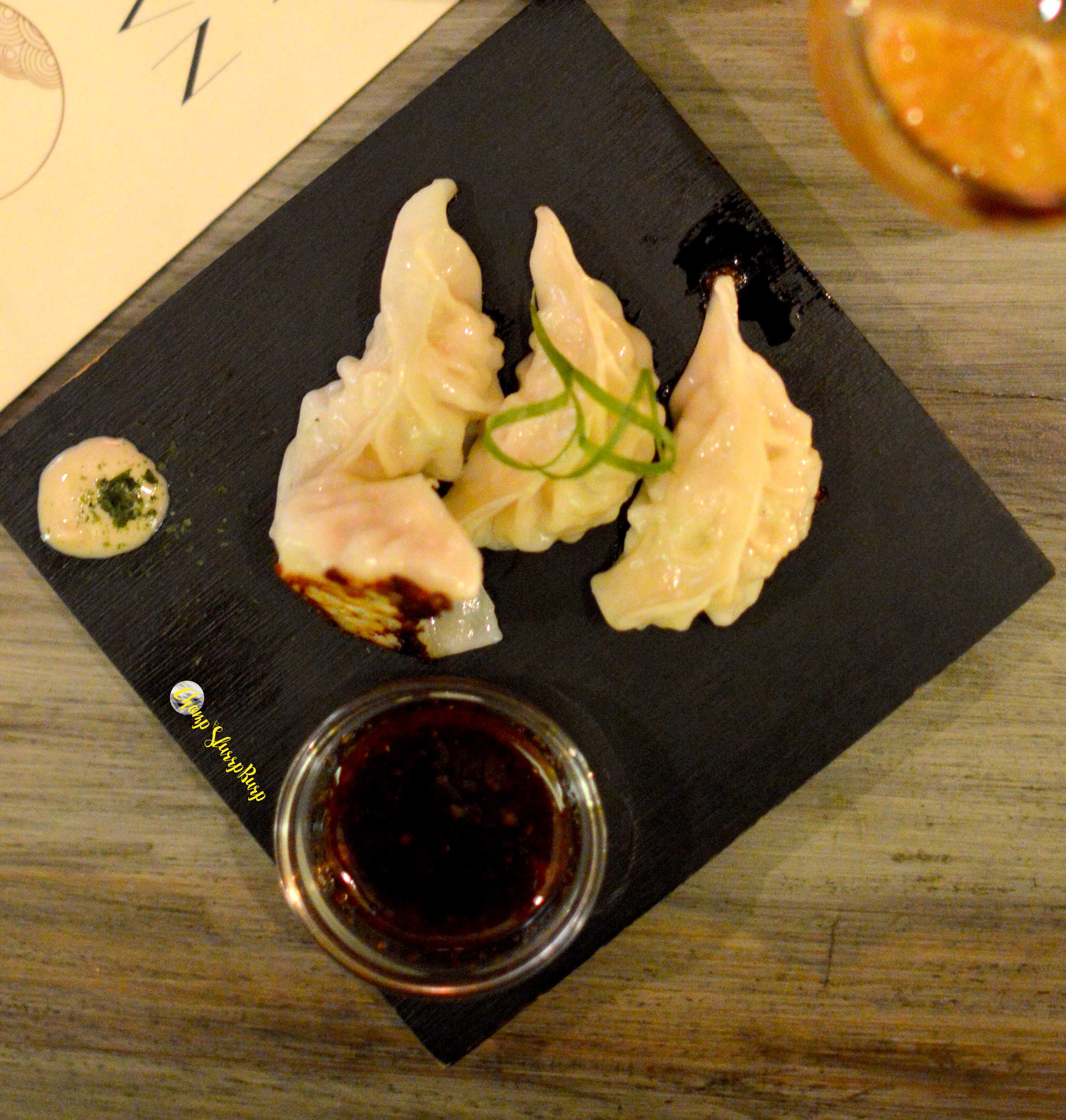 Course 2 – For appetizers we chose Caramelized lotus roots with sesame and soy – this subtle dish really brings out the root flavours – thinly sliced lotus stem, caramelized to a slight sweetness and topped with sesame seeds, this crunchy entrée is great as a bar bite. Chicken Gyoza – thin skinned dimsums stuffed with savory chicken and pan fried to a slight crunch. Slump the dimsums in soy to enjoy these masterful delicacies.