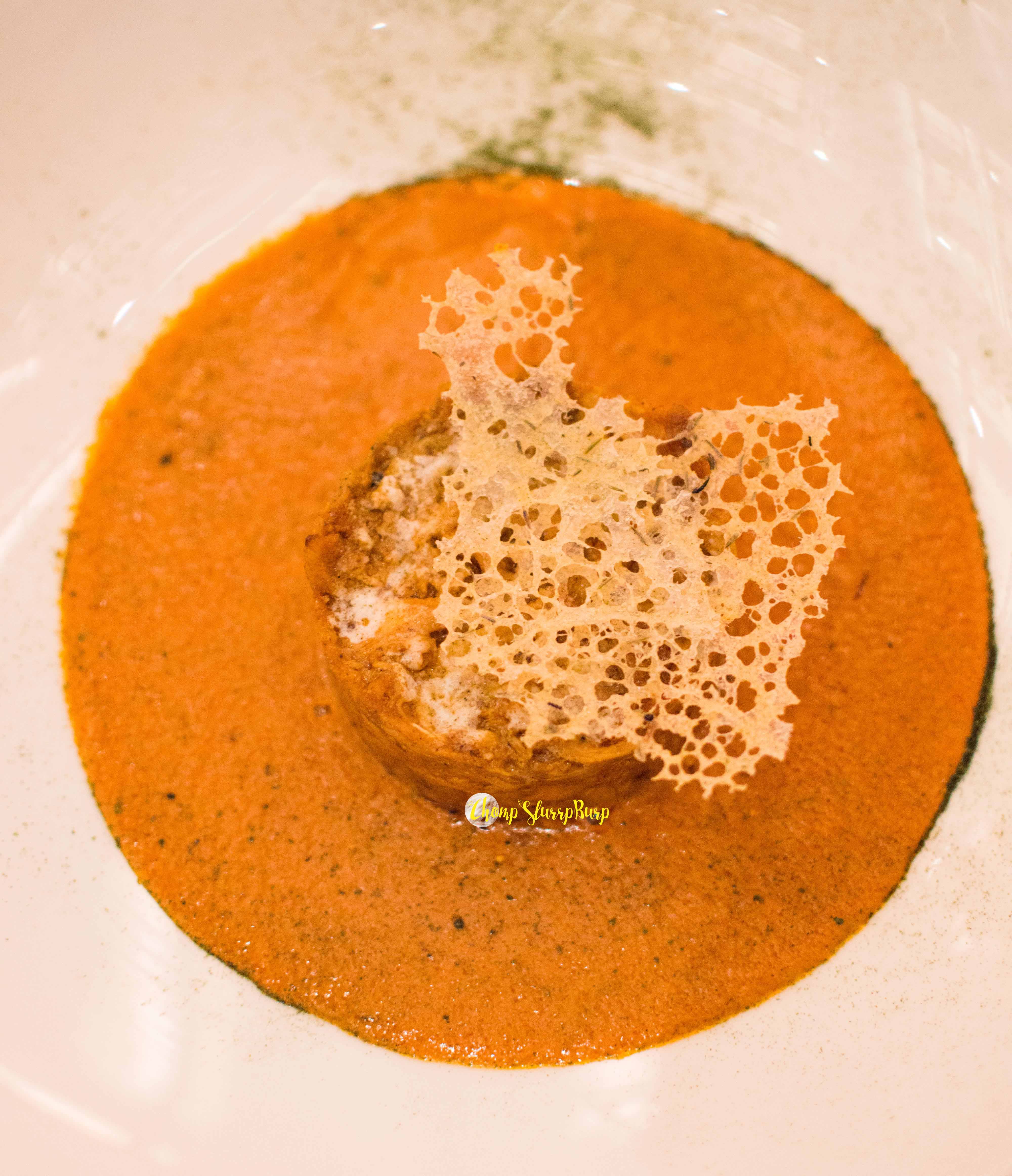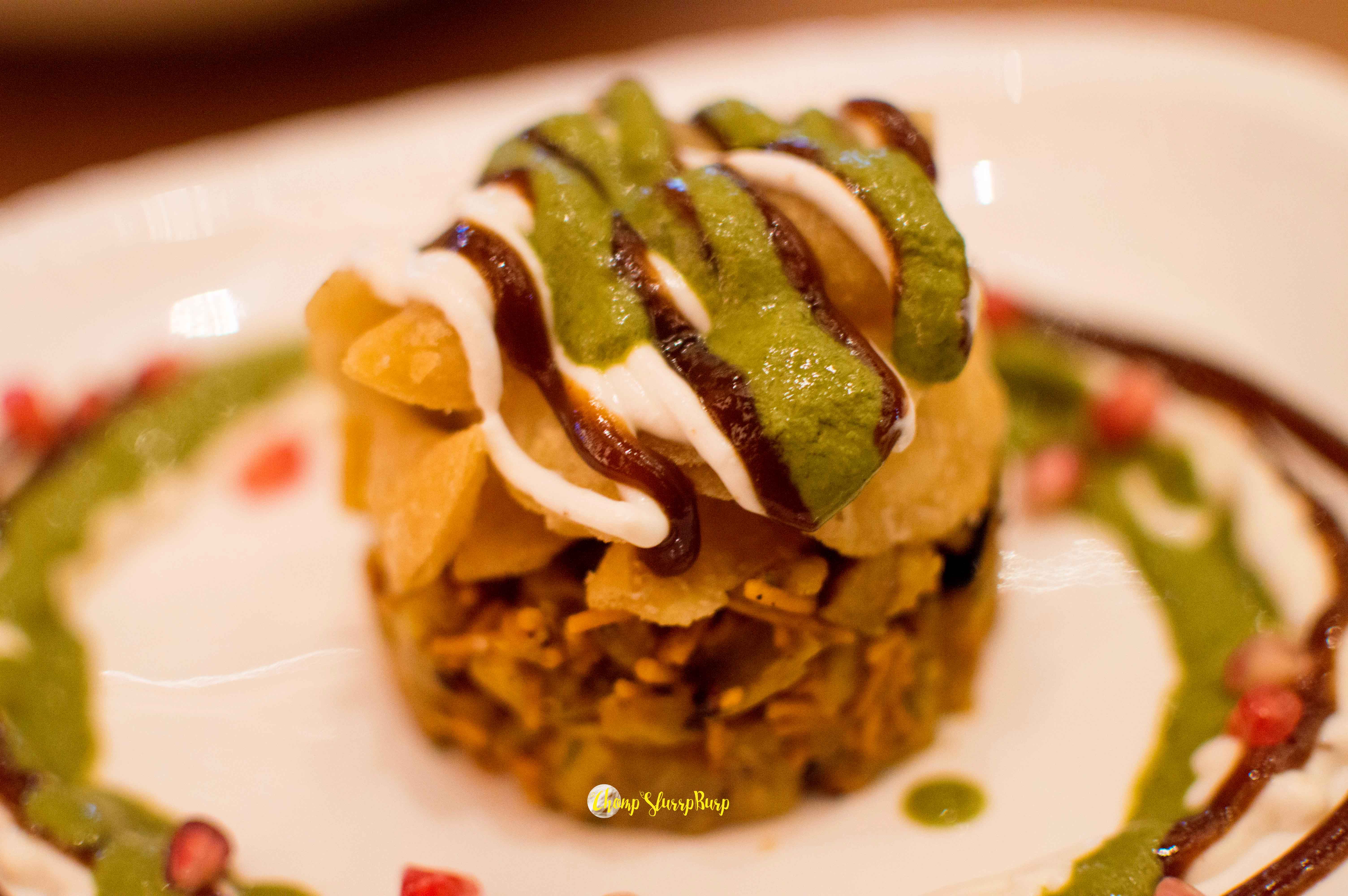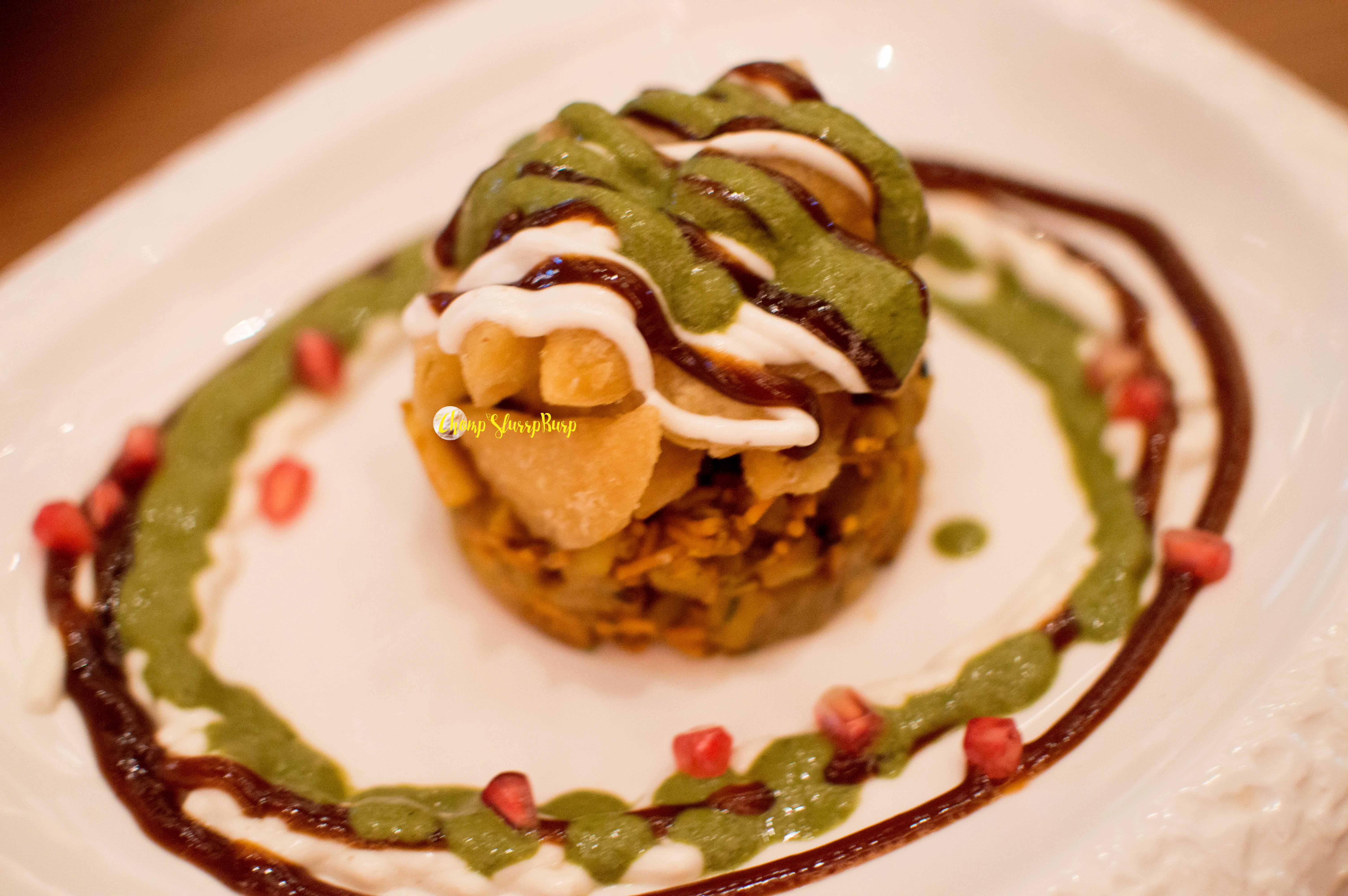 Goat cheese ki tikki – a soft tikki made out of goat cheese, clubbed with pear, mint chutney, pomegranate seeds and a crumbly pate sable – an excellent take on aloo tikki. Crispy aloo chaat – crispy airy aloo, puffed with air and served with sev an chutney, another super crunchy take on the street version.