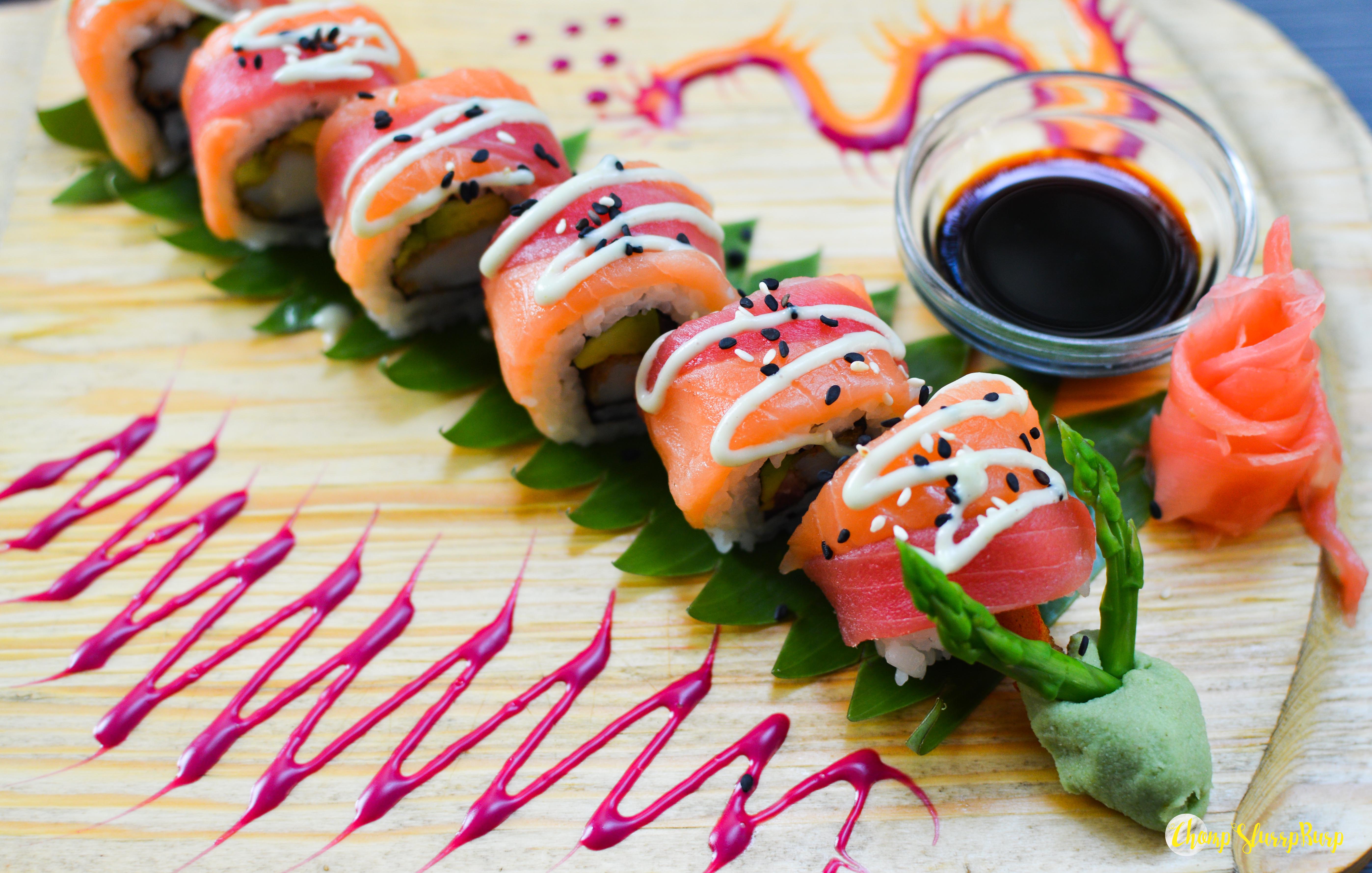 Prawn Suimai – minced prawns in an open dumpling topped with fresh coriander leaves. The dumplings were a little bigger than bite-sized but really juicy and fresh prawns with a crunch intact. Assorted mushroom bao – these were spectacular; freshly steamed and piping hot stuffed with a crunchy mix of mushrooms. Dragon roll – this dragon roll was huge, and by huge, it really was difficult to get through the enormous thing in one go. Fresh salmon, crab meat, sesame seeds, asparagus and avocado topped with spicy mayo. The sushi was fresh, but it just had too much going on to be impactful.