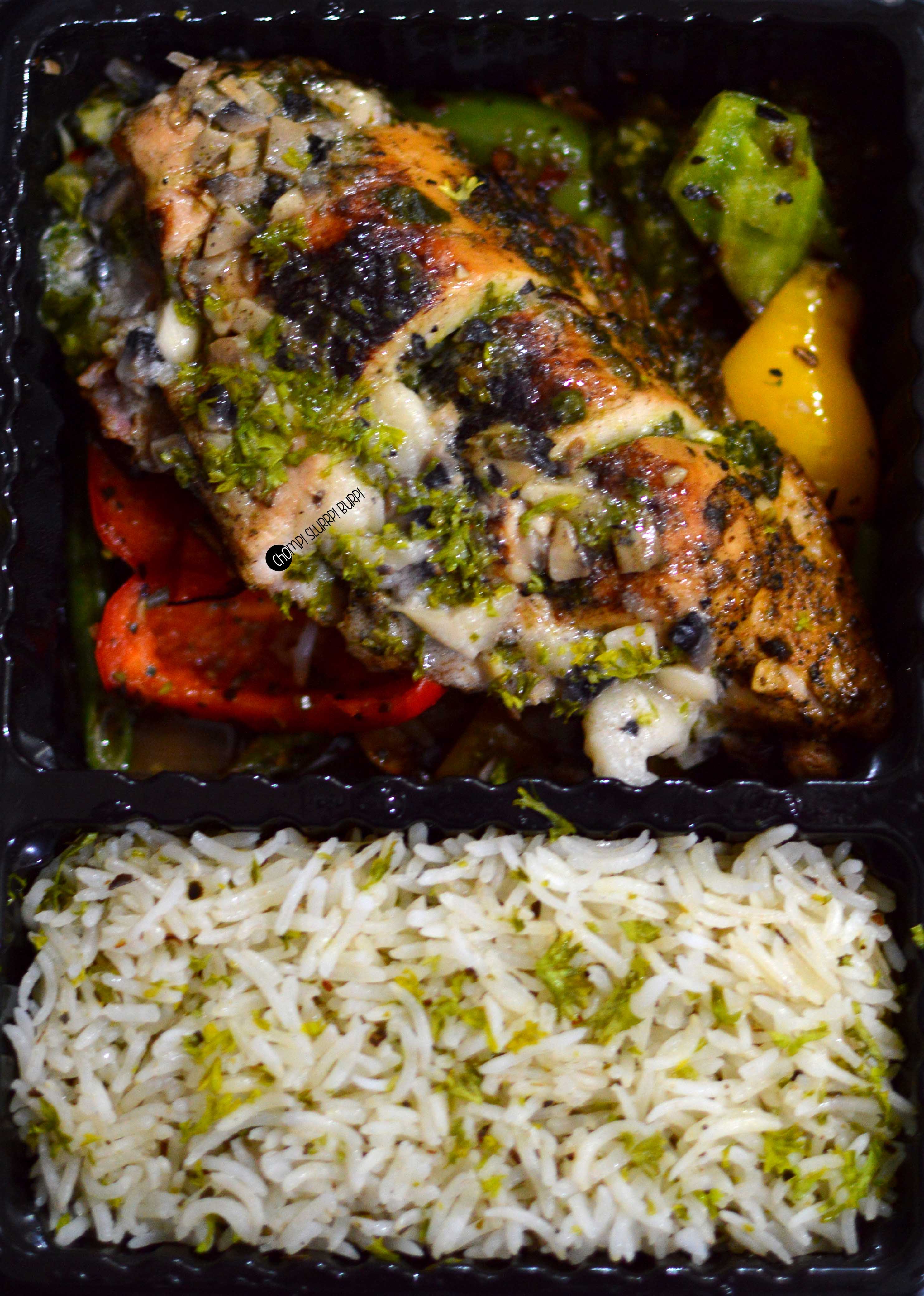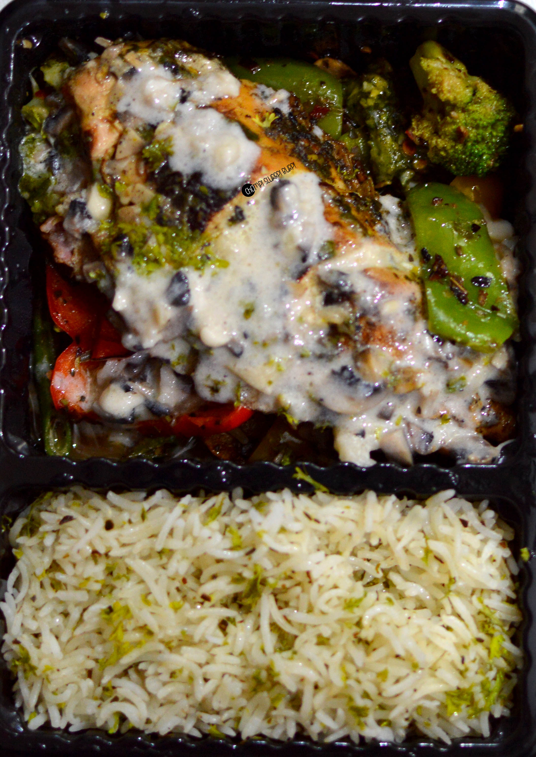 Parmesan chicken – spinach, corn and mushrooms stuffed in a grilled chicken breast topped with a creamy mushroom sauce accompanied by fresh, sauteed vegetables and herbed rice. Perfectly grilled chicken breast with a generous stuffing of greens and parmesan cheese. Top it with the creamy mushroom sauce for that extra zing.