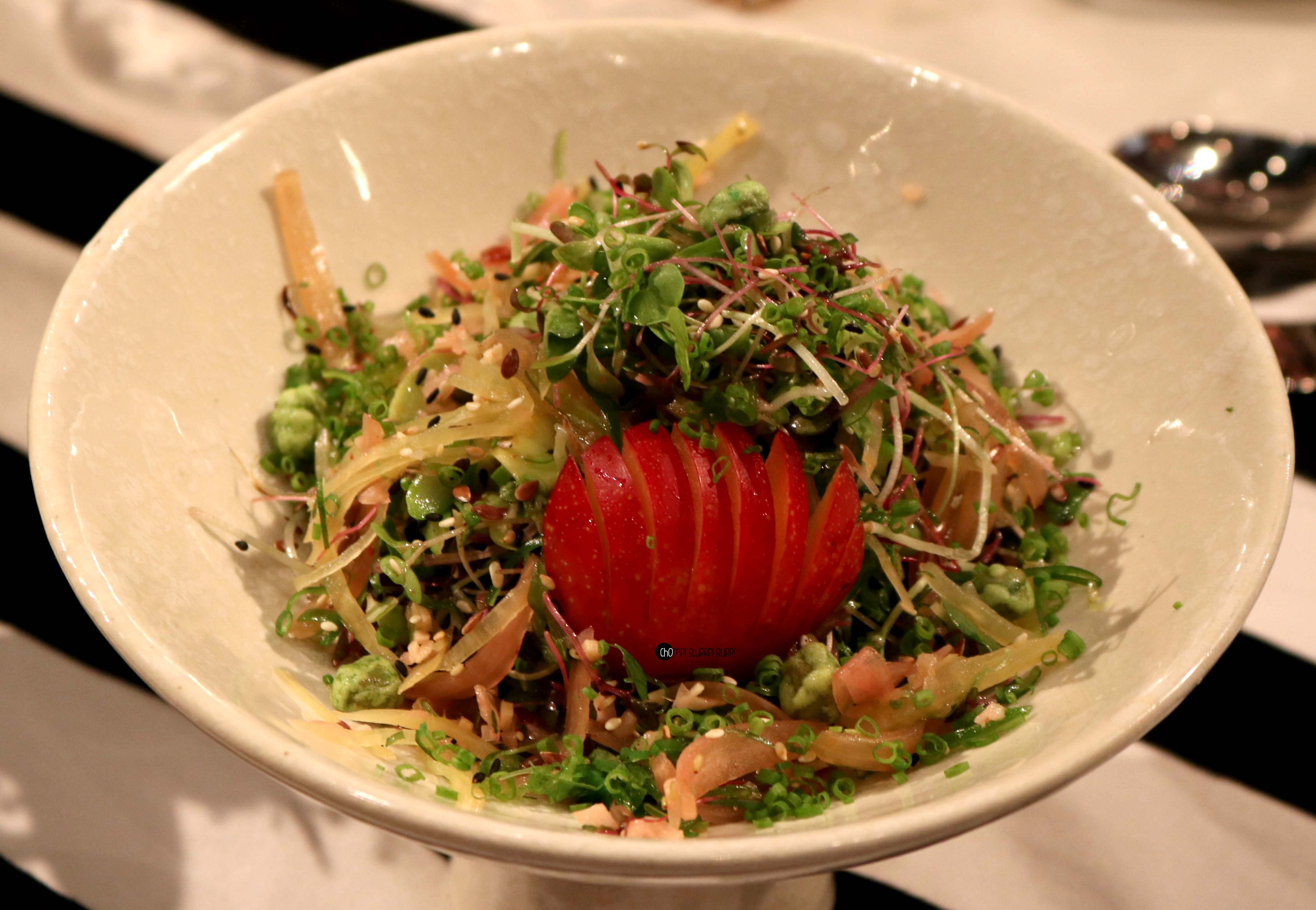 We started off with Micro cress salad, Tuna Tataki and Mango sushi.The intricate presentations are to die for, Micro Cress Salad a hot favorite with tiny, delicate greens, seasonal fruits and plum dressing. A very light and balanced salad.