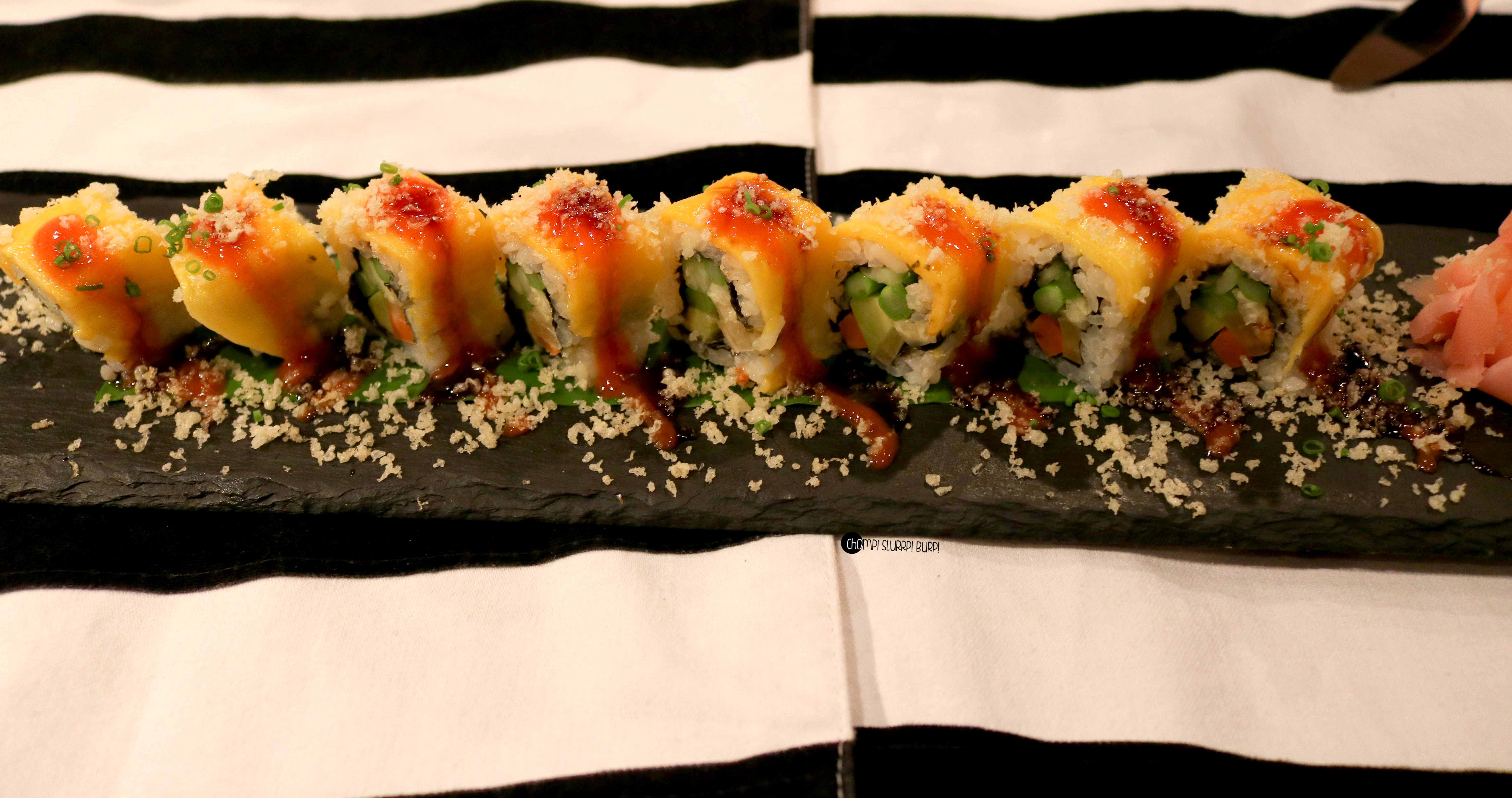 Mango Sushi was an ambrosial affaire, radish, cucumber asparagus inside the roll of sticky rice and with fresh Mango pulp on top. This dish was the best vegetarian dish I liked and was ordered countless times!