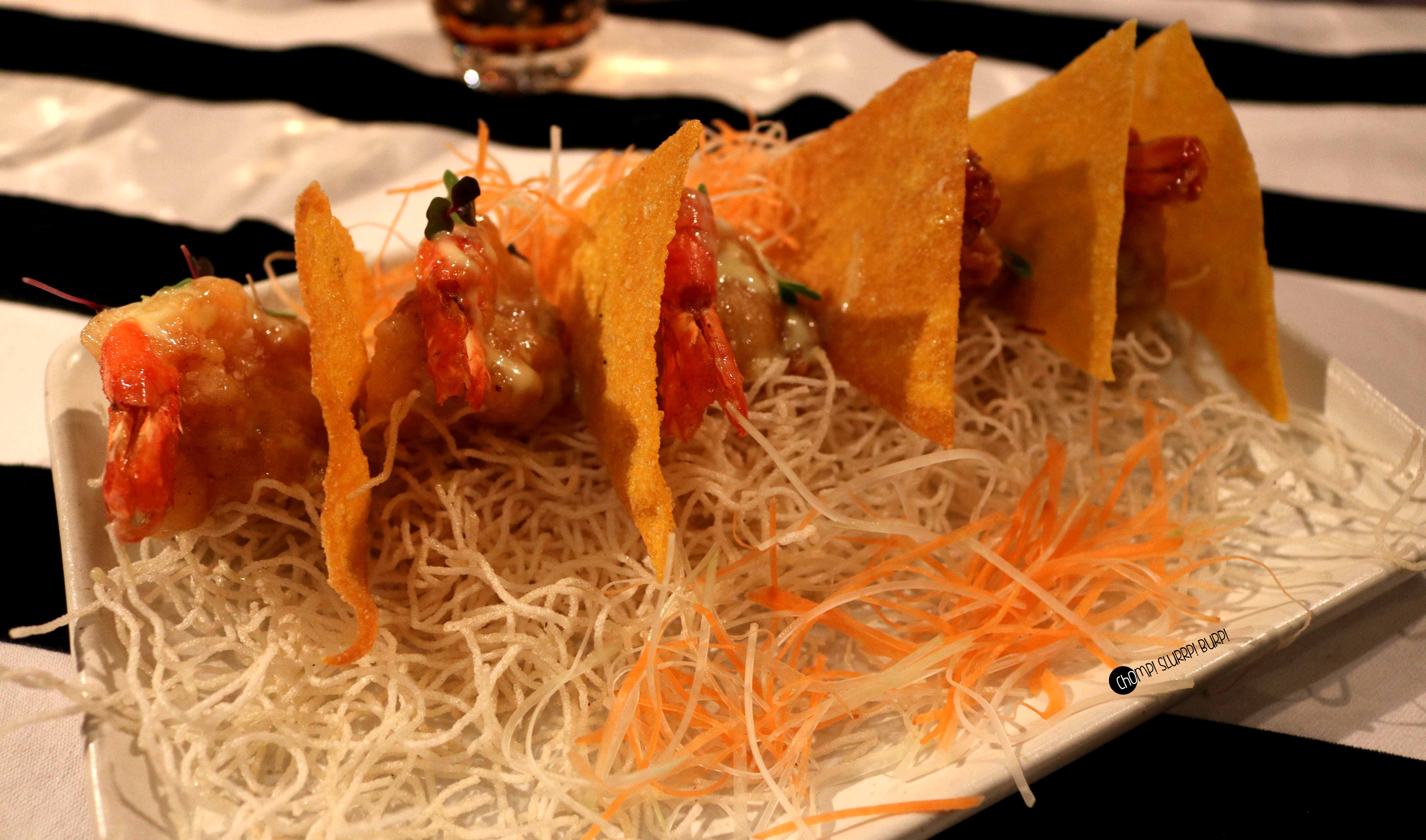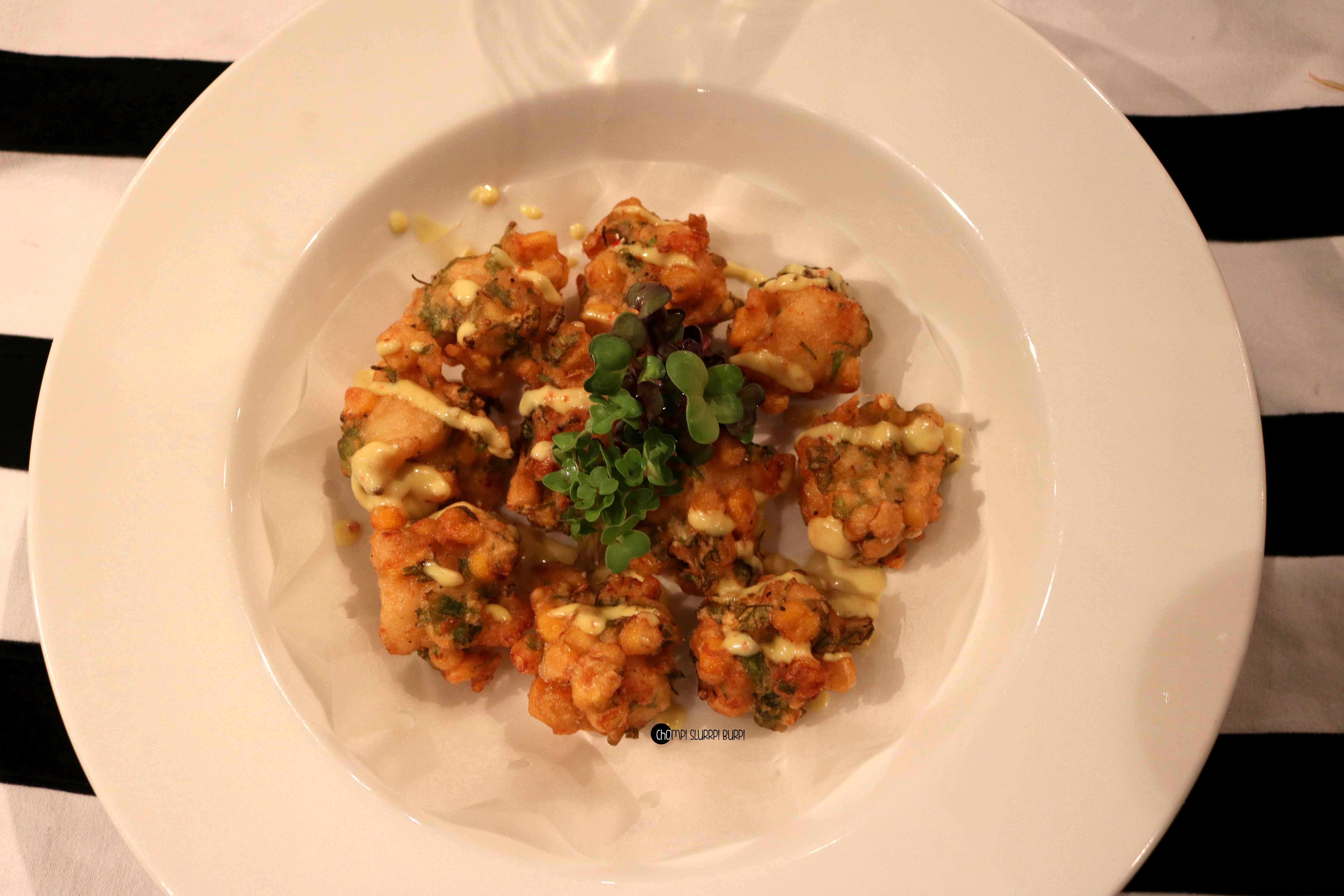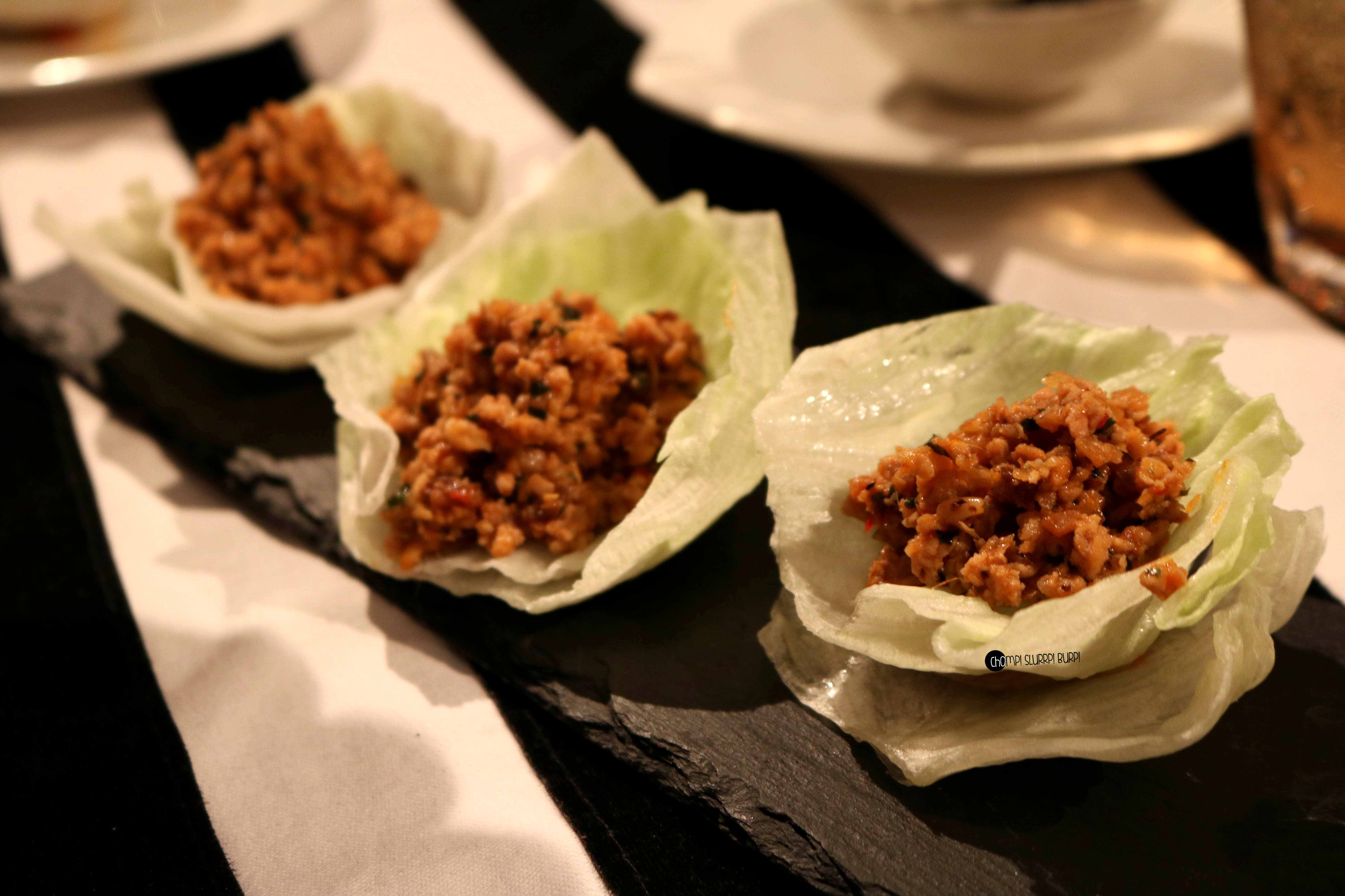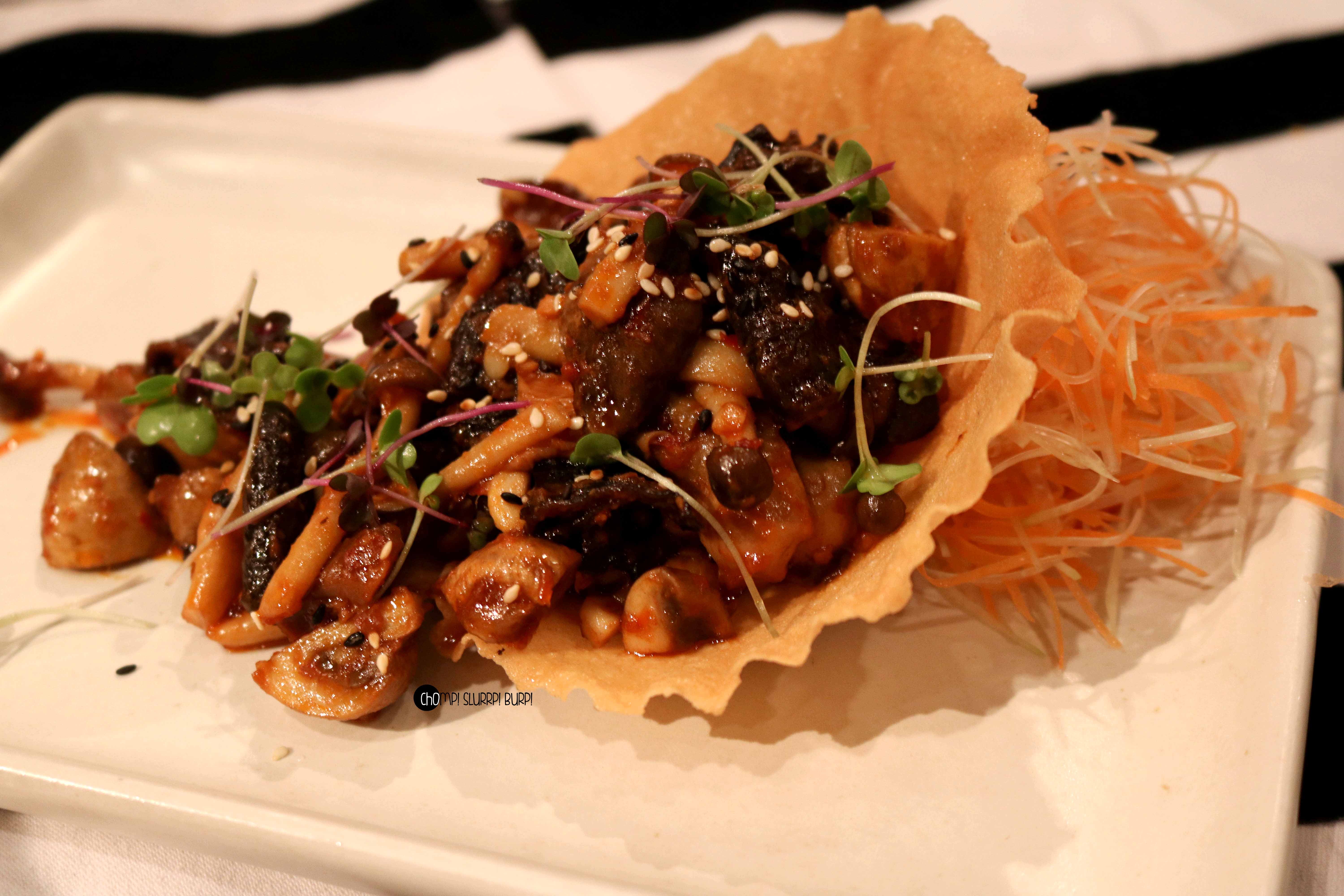 Some other Appetizers devoured were, Mushroom salad which had Shitake, Button and Enoki mushrooms tossed in barbecue sauce, Spicy mince chicken cups and Rock Corn Tempura.