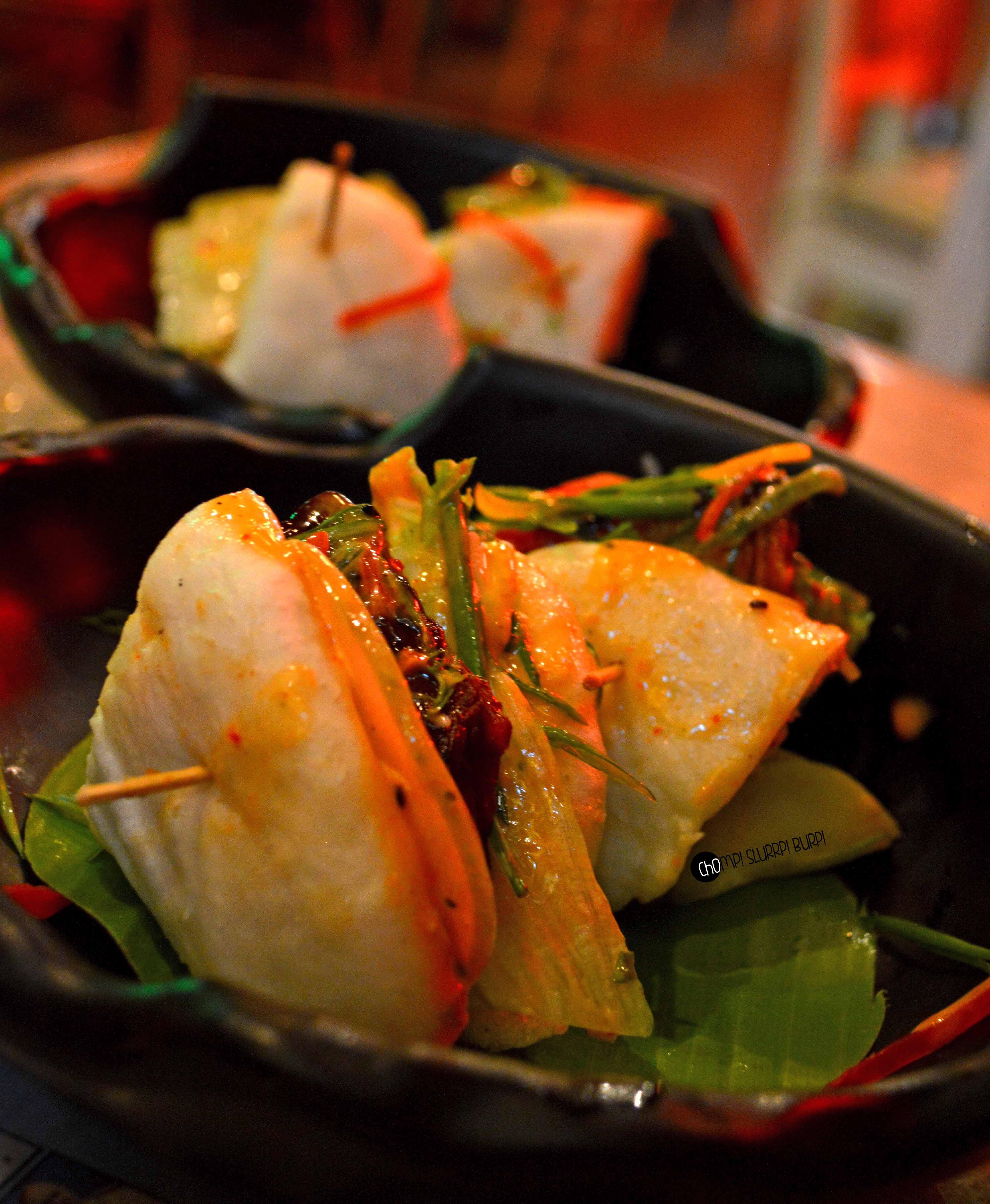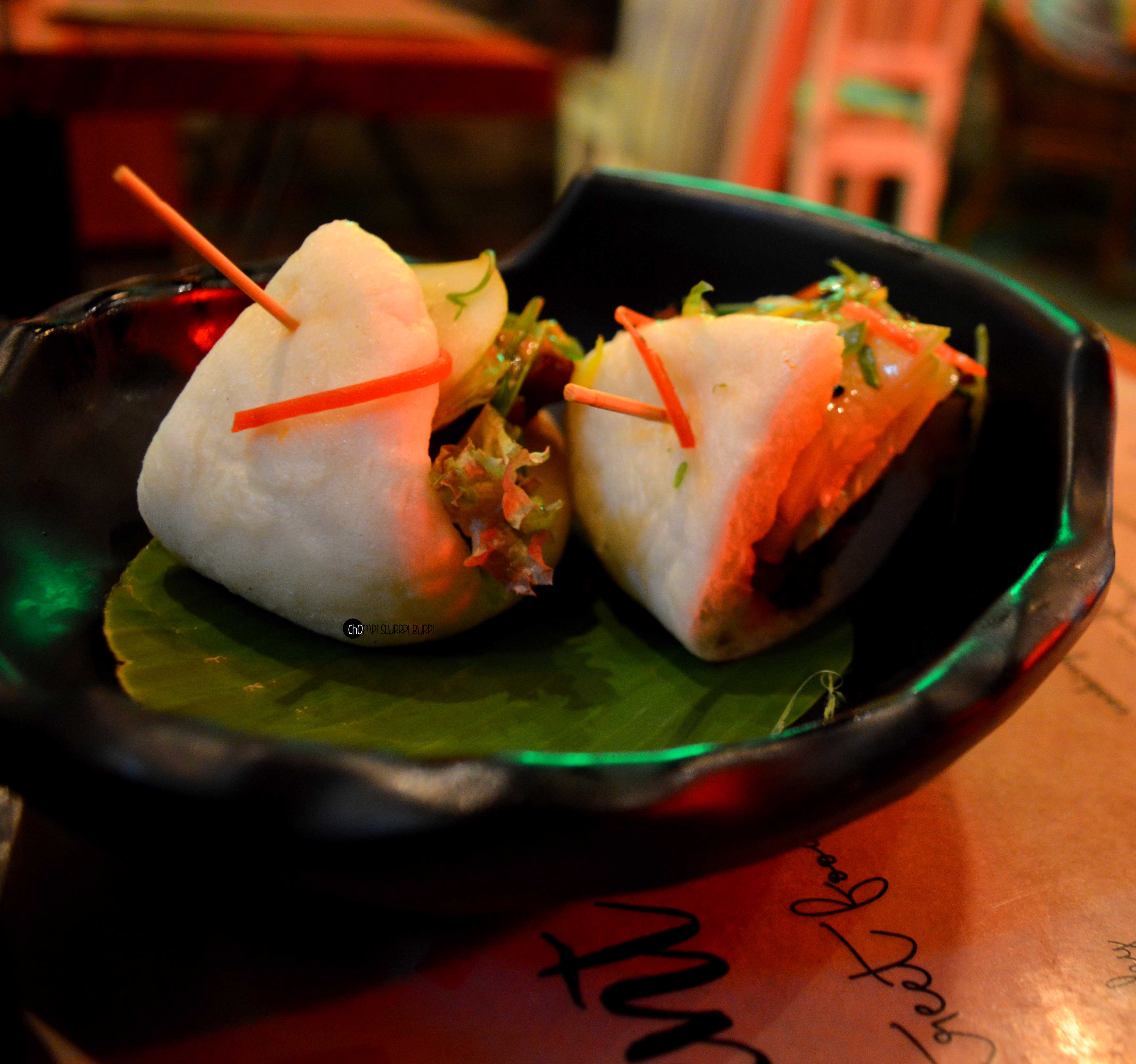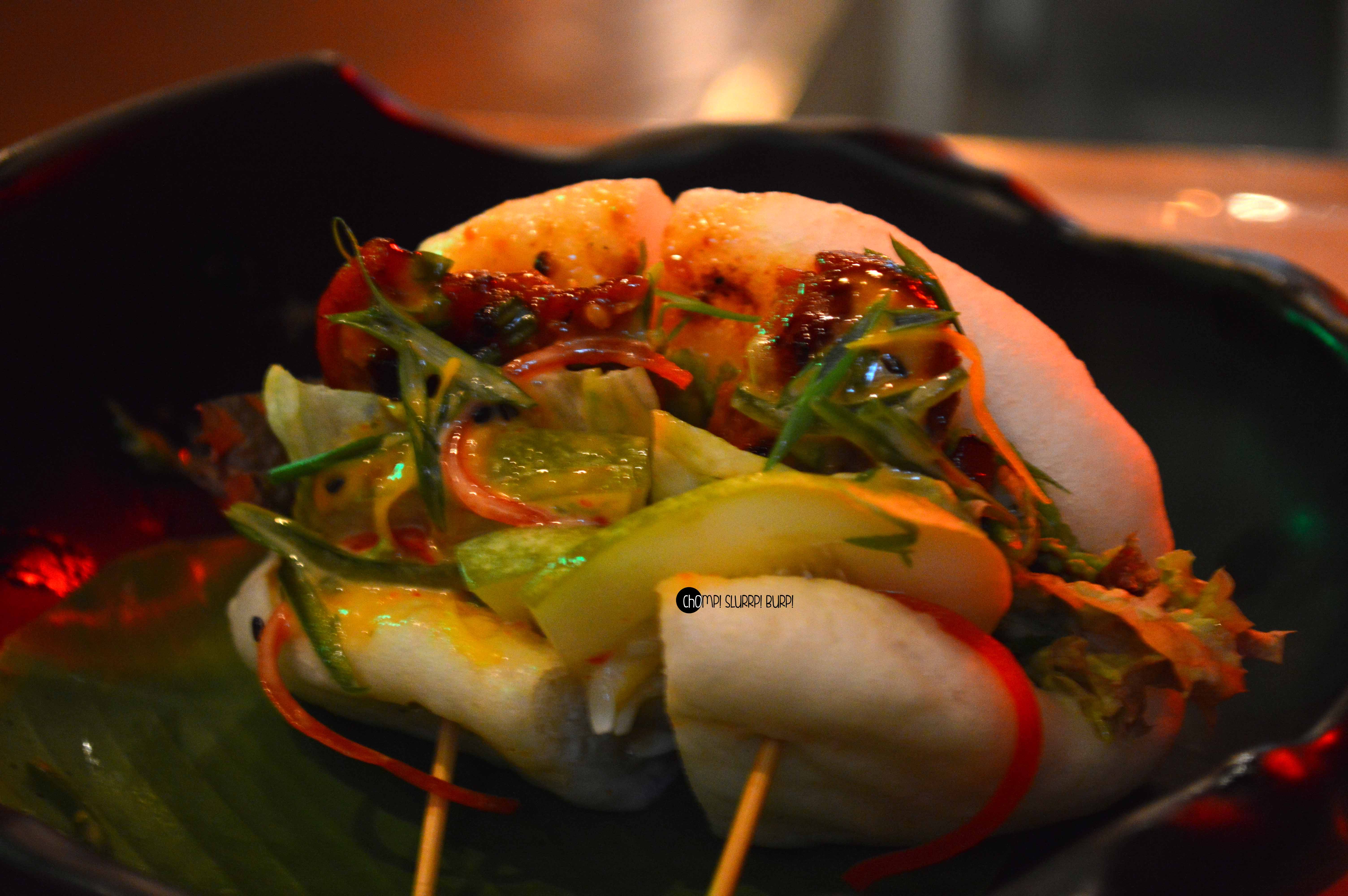 We gorged on their shareable dimsums and baos both. The dimsum basket came with tiger prawn dimsums, pork gyoza and spicy chicken dumpling. The dimsums were steamed to perfection and stuffed generously with fresh, succulent meat. The spicy chicken dumpling was soft and flavorful but the chicken could have had more profound flavors. The pork gyoza was gently pan fried and stuffed with stir fried minced pork. The tiger prawn dumpling was what stood out of the three – a translucent skinned dumpling with minced tiger prawn – the freshness of the prawn was brought out very well with the skin and seasoning.