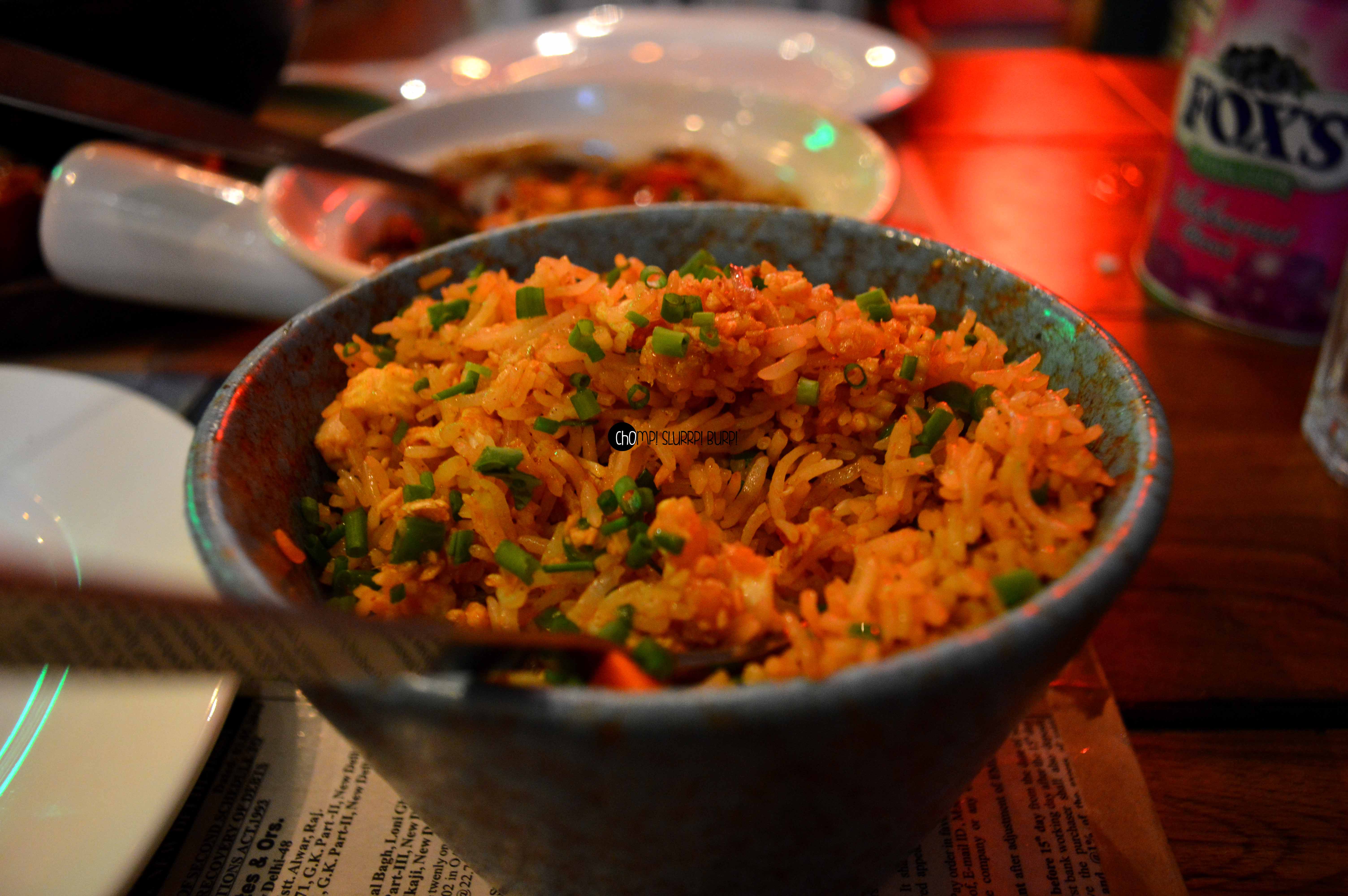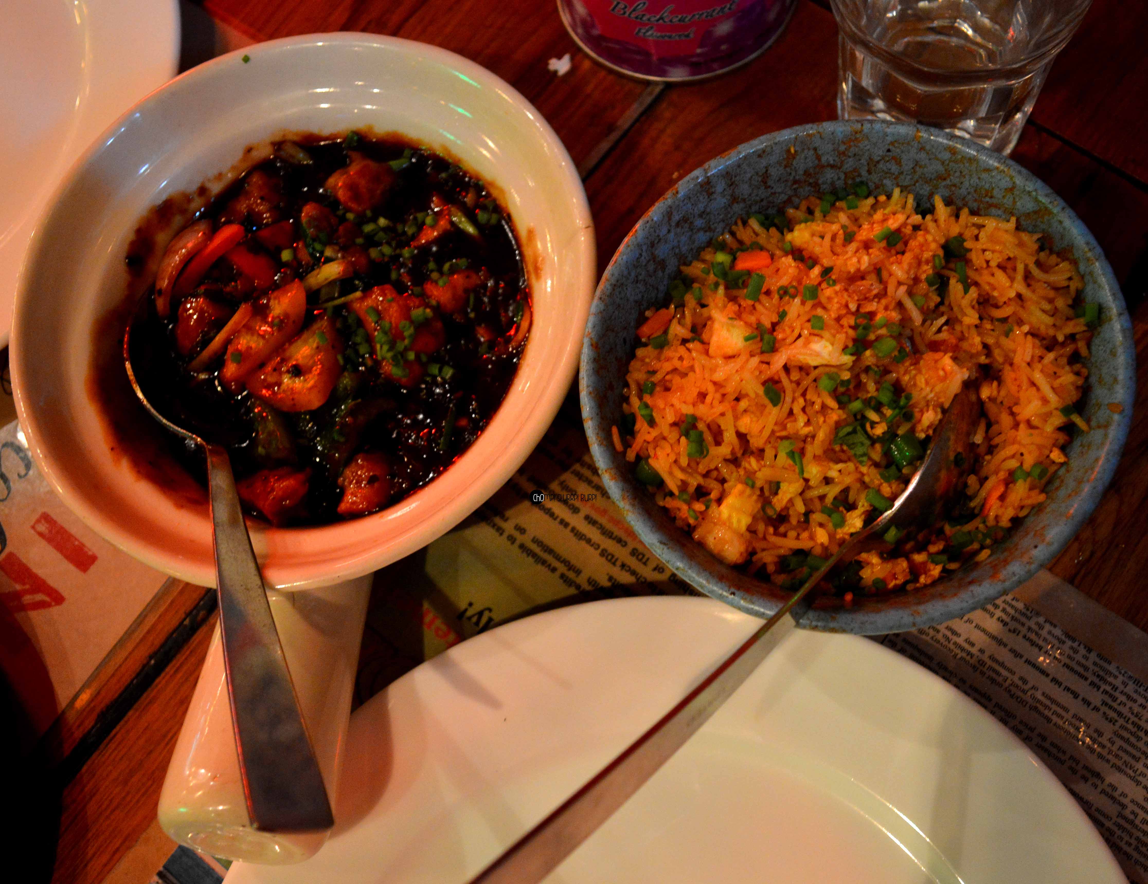 For mains we got our hands on chicken Khao Suey, chicken fried rice and diced chicken in black bean coriander sauce. You can prepare your khao suey seasoned with peanuts, burnt garlic, lemon and spring onion sprigs. We seasoned ours with some peanuts, loads of burnt garlic and a dash of lemon juice. The lemongrass had a flawless perfection and the consistency made it all the more palatable.