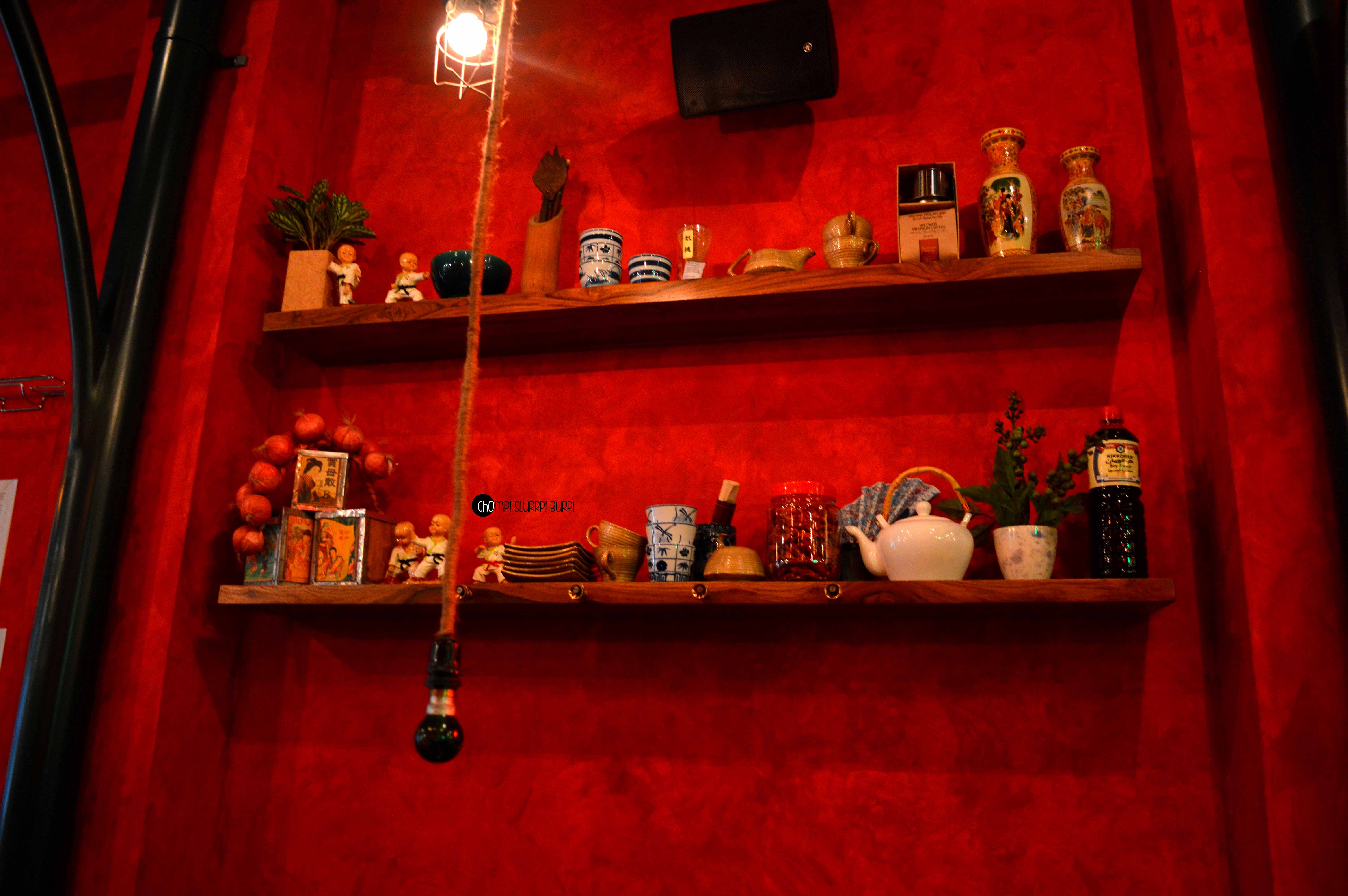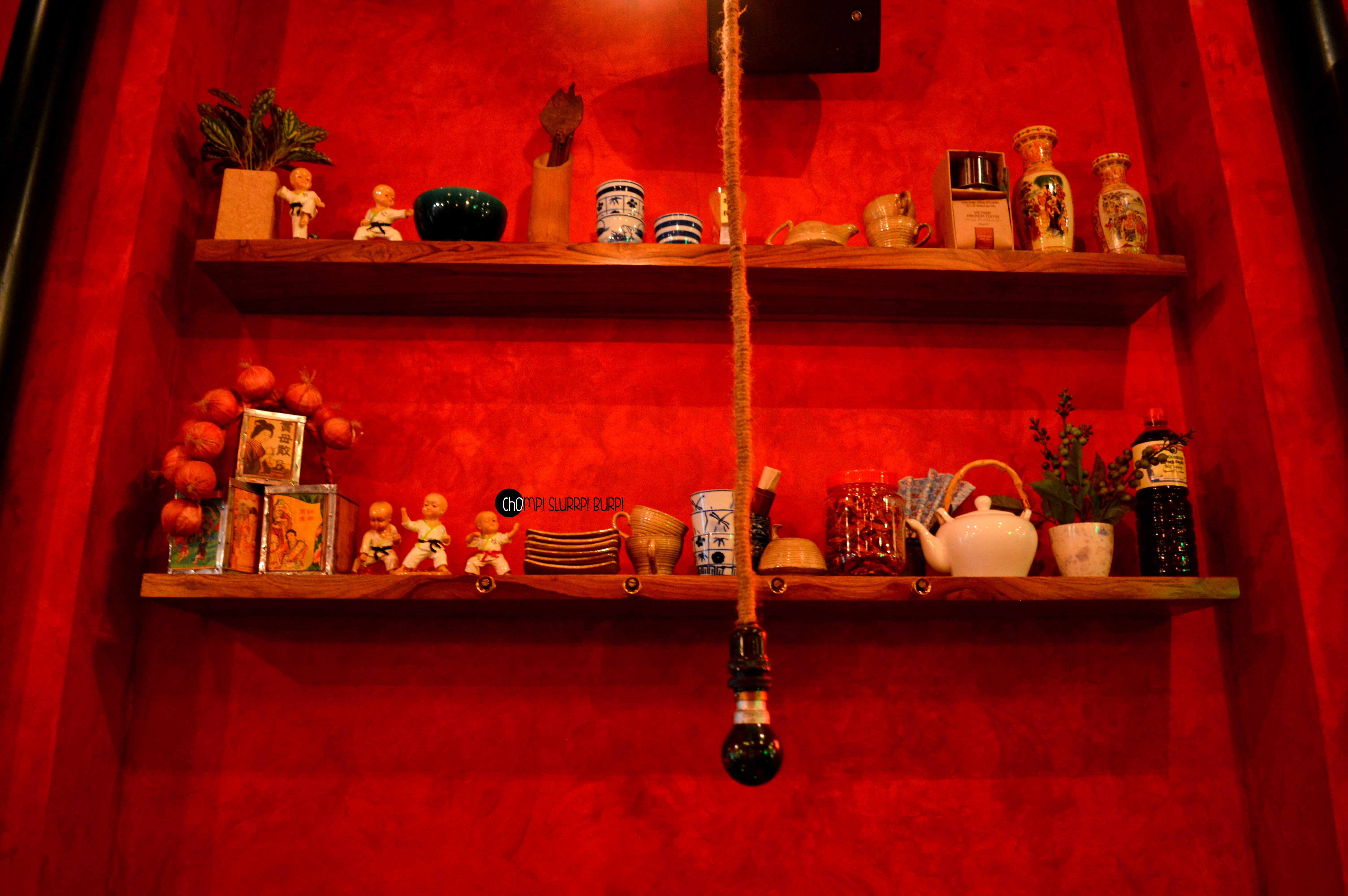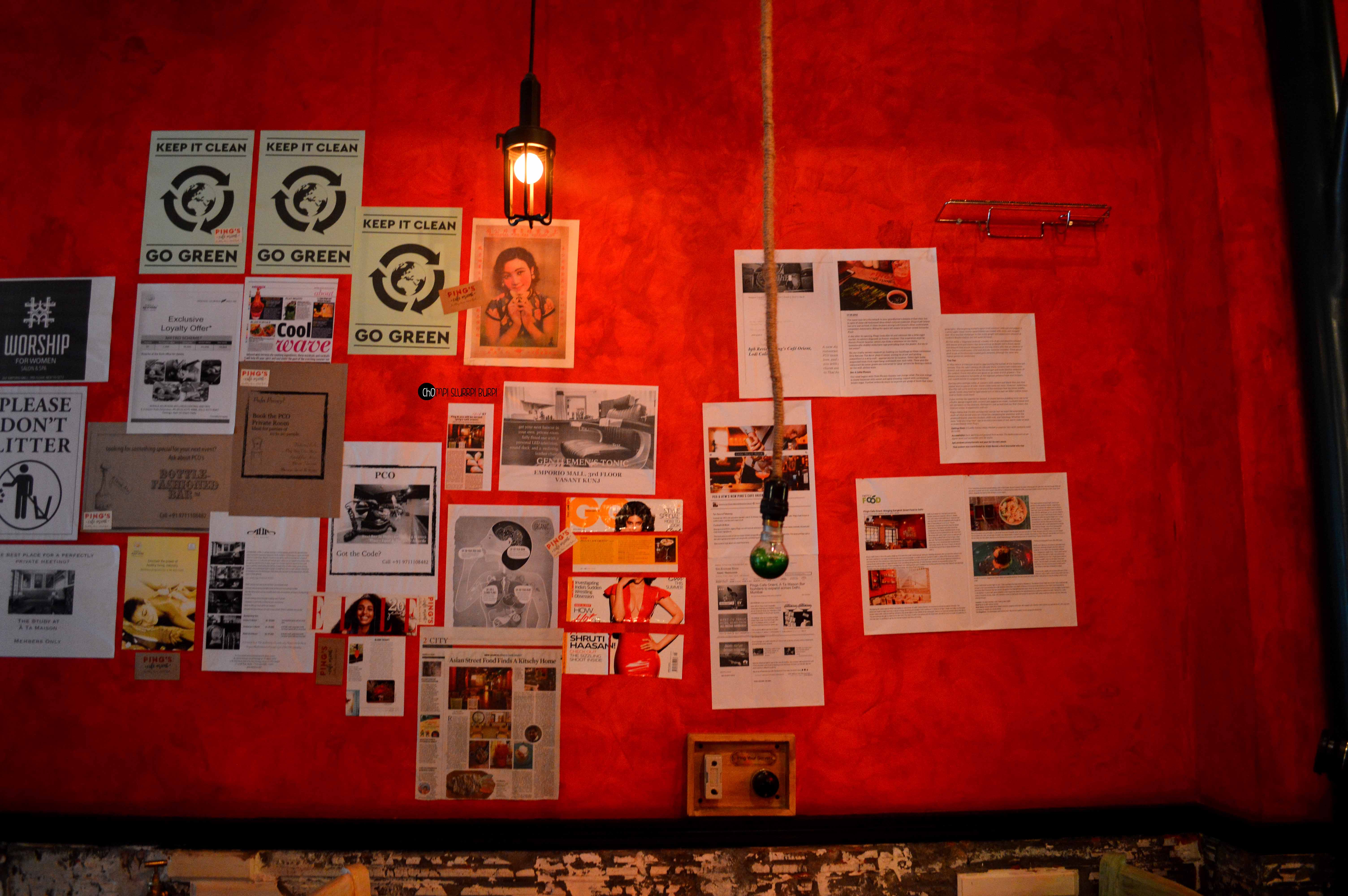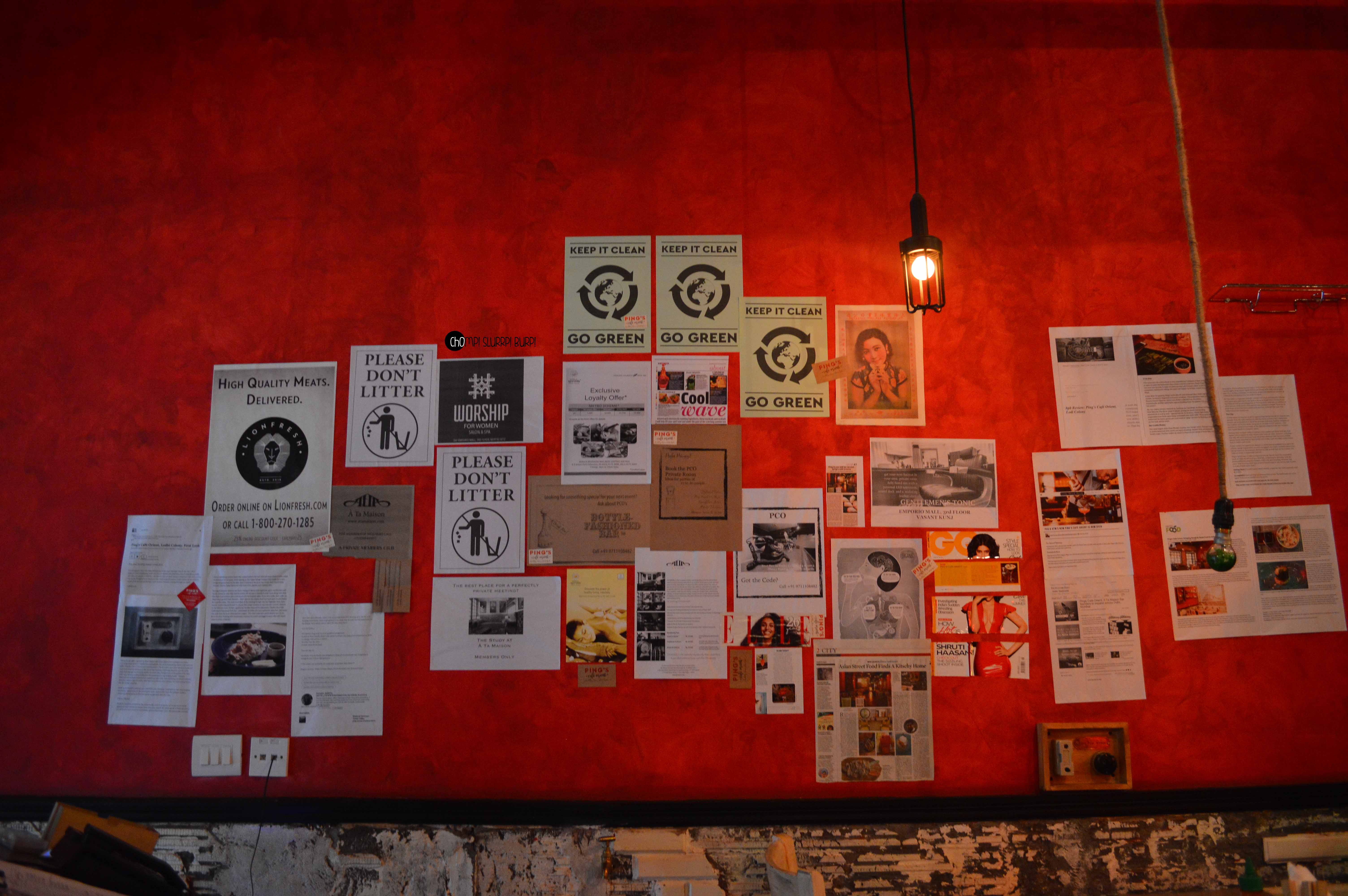Tucked inside a street in Lodhi Colony is Ping’s Cafe Orient by PCO which immediately hauls you from the rarely peaceful Delhi street to a feet tapping, bright street in ChinaTown. The interiors are done very tastefully in the cosy little cafe – red walls papered with advertisement and flyers with lamp posts and arched mirrors. The antiquities that are lined in the cafe are most exquisite – tea pots, cutlery and bulbs. You can quite literally ping your server by pressing the switch next to your table.