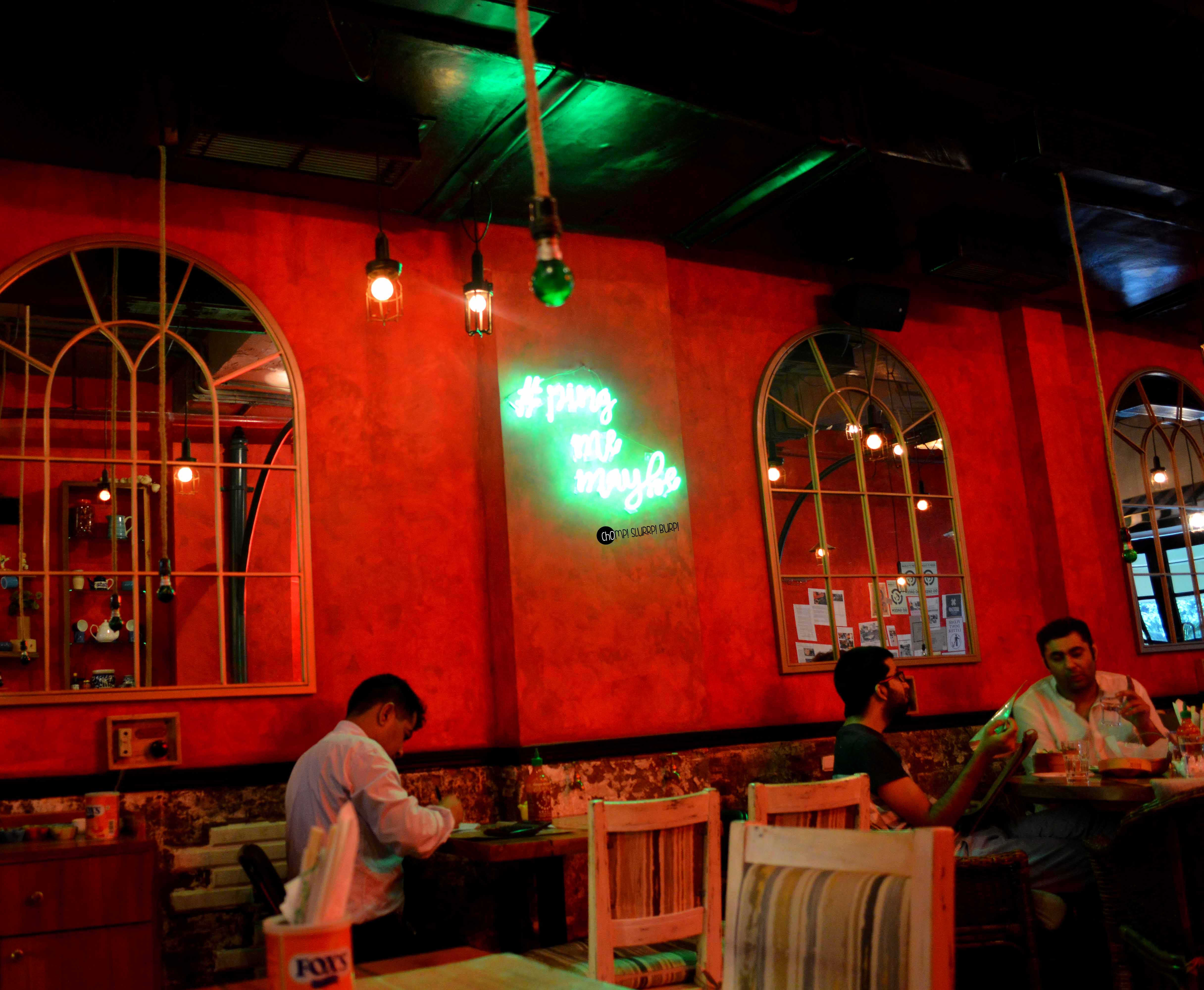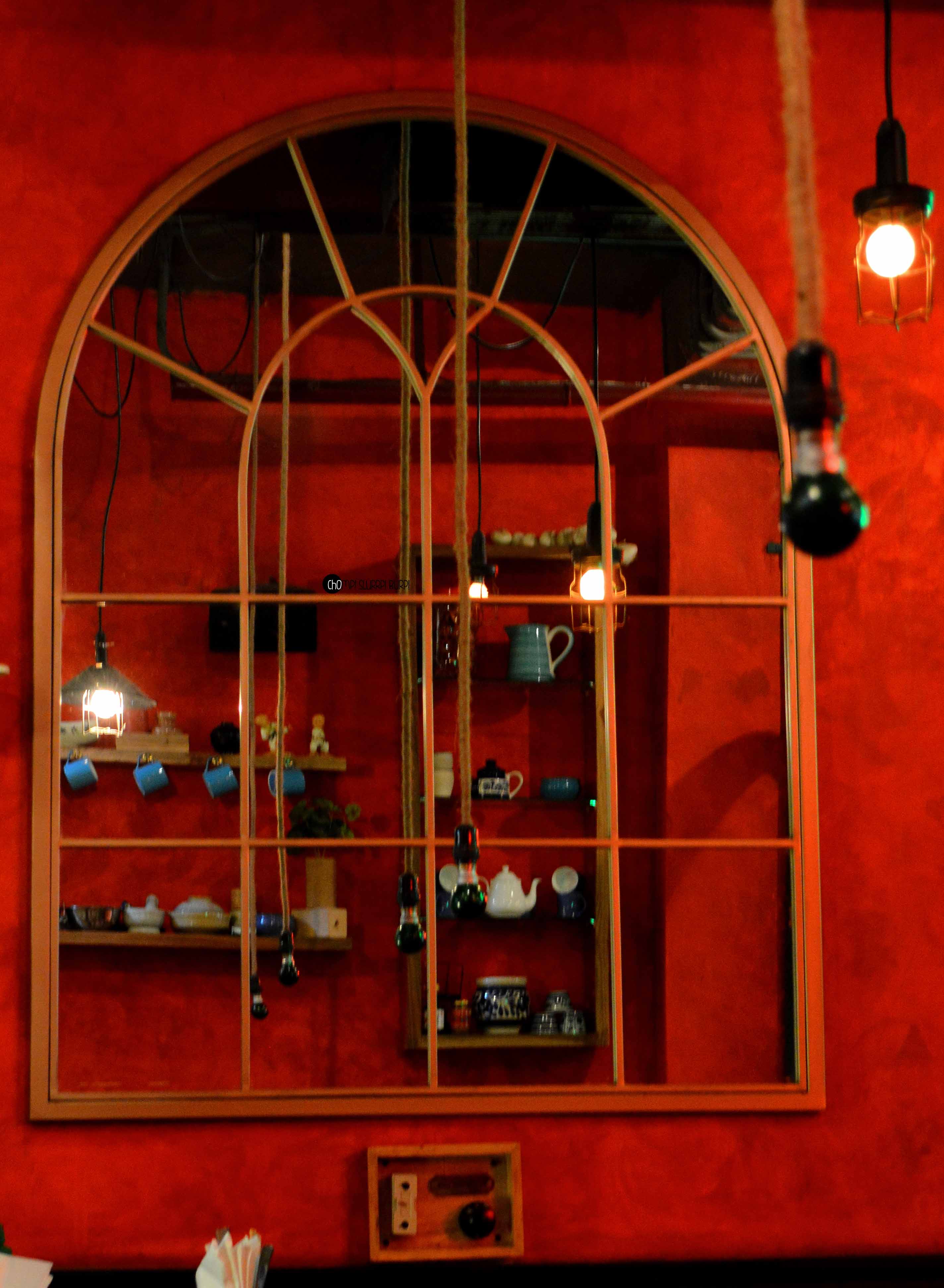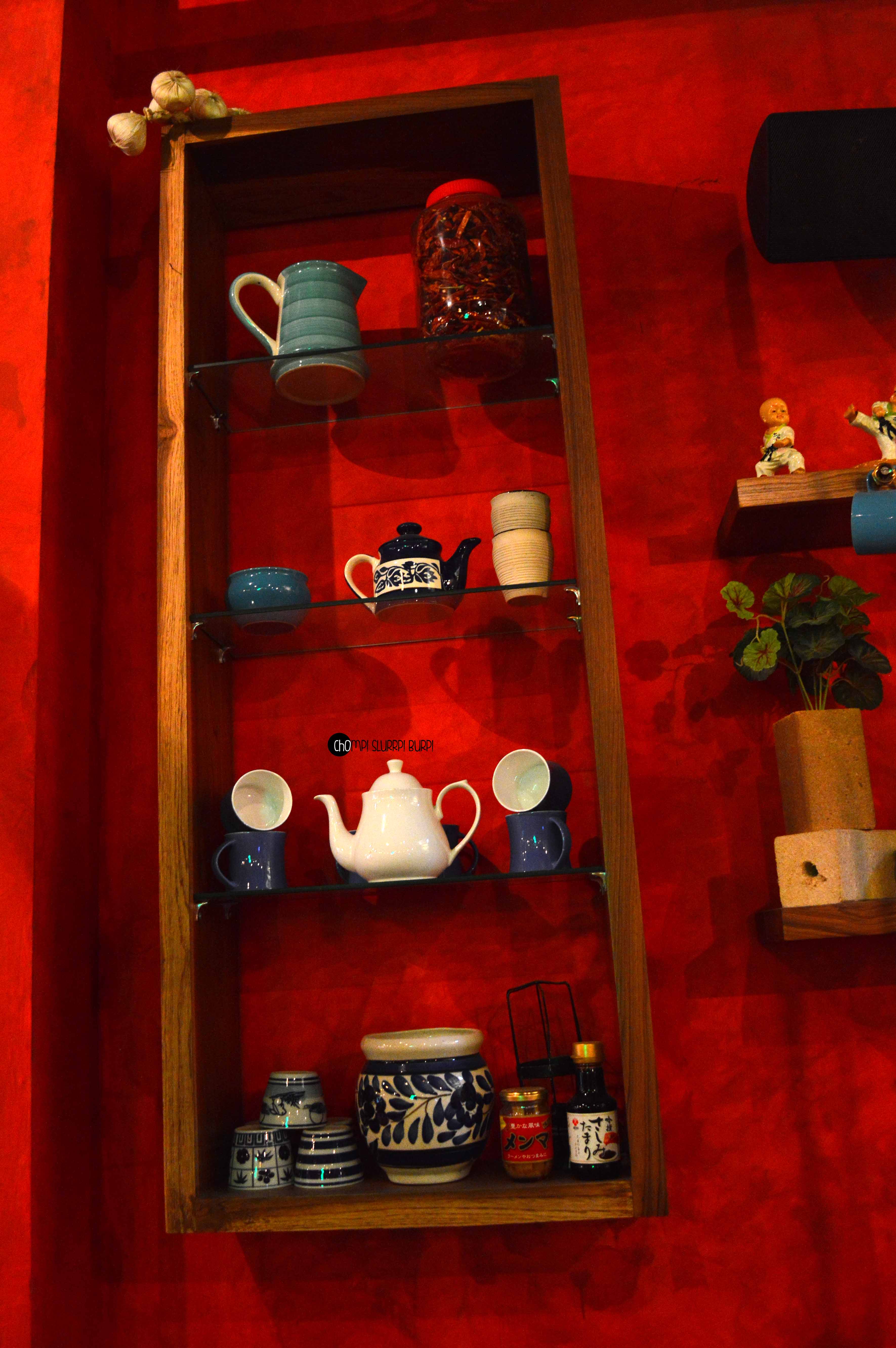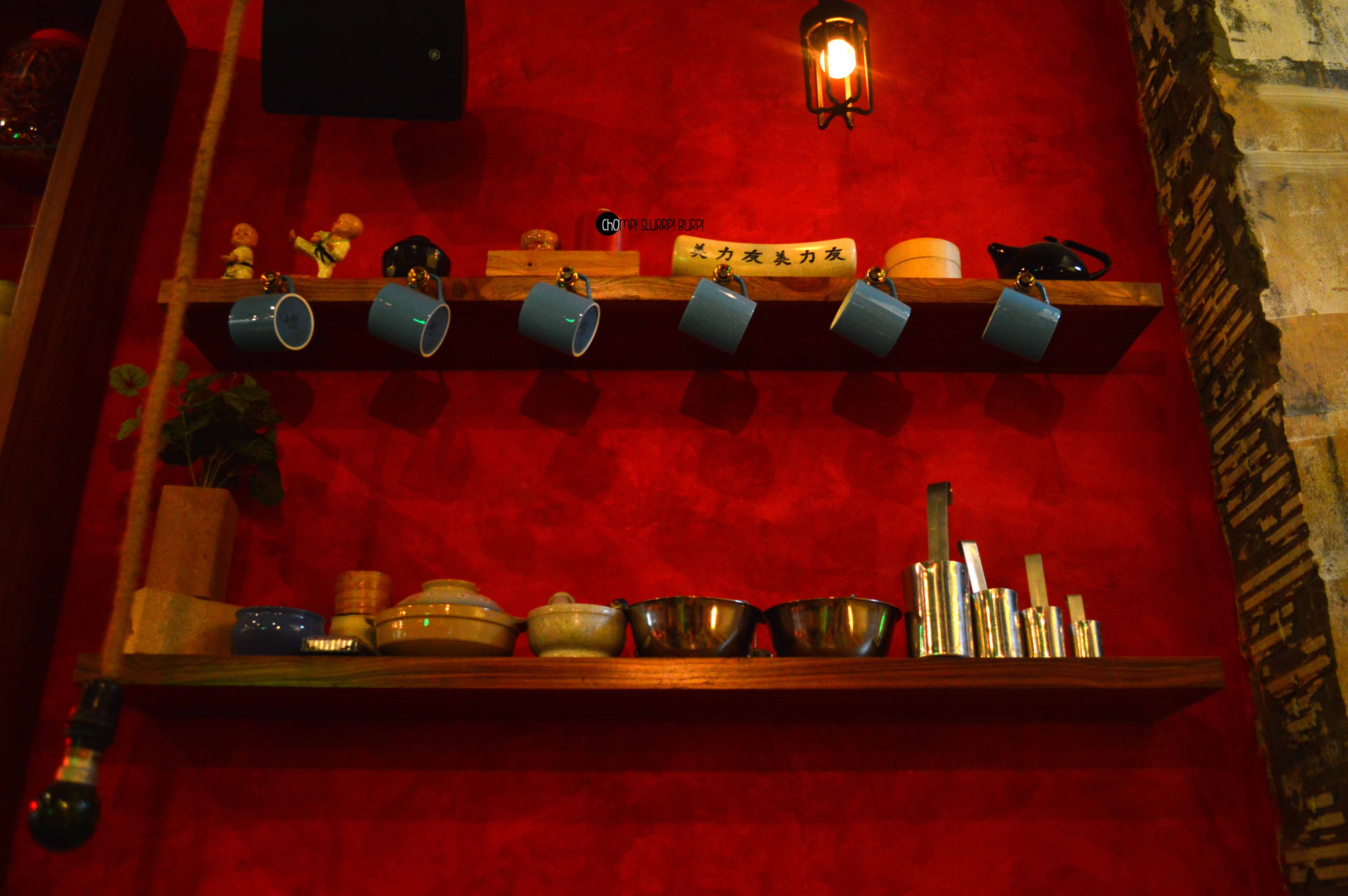 Tucked inside a street in Lodhi Colony is Ping’s Cafe Orient by PCO which immediately hauls you from the rarely peaceful Delhi street to a feet tapping, bright street in ChinaTown. The interiors are done very tastefully in the cosy little cafe – red walls papered with advertisement and flyers with lamp posts and arched mirrors. The antiquities that are lined in the cafe are most exquisite – tea pots, cutlery and bulbs. You can quite literally ping your server by pressing the switch next to your table.