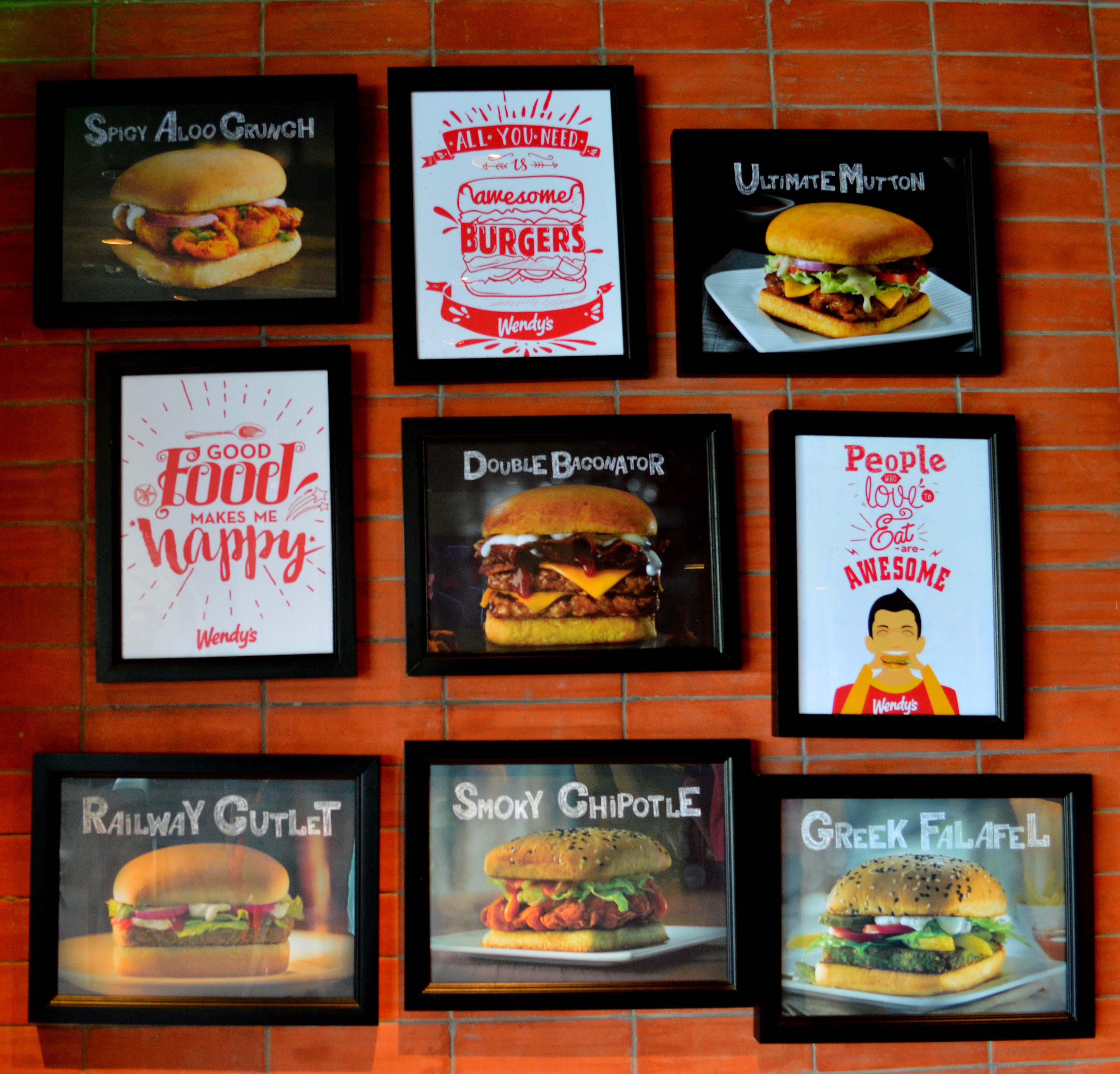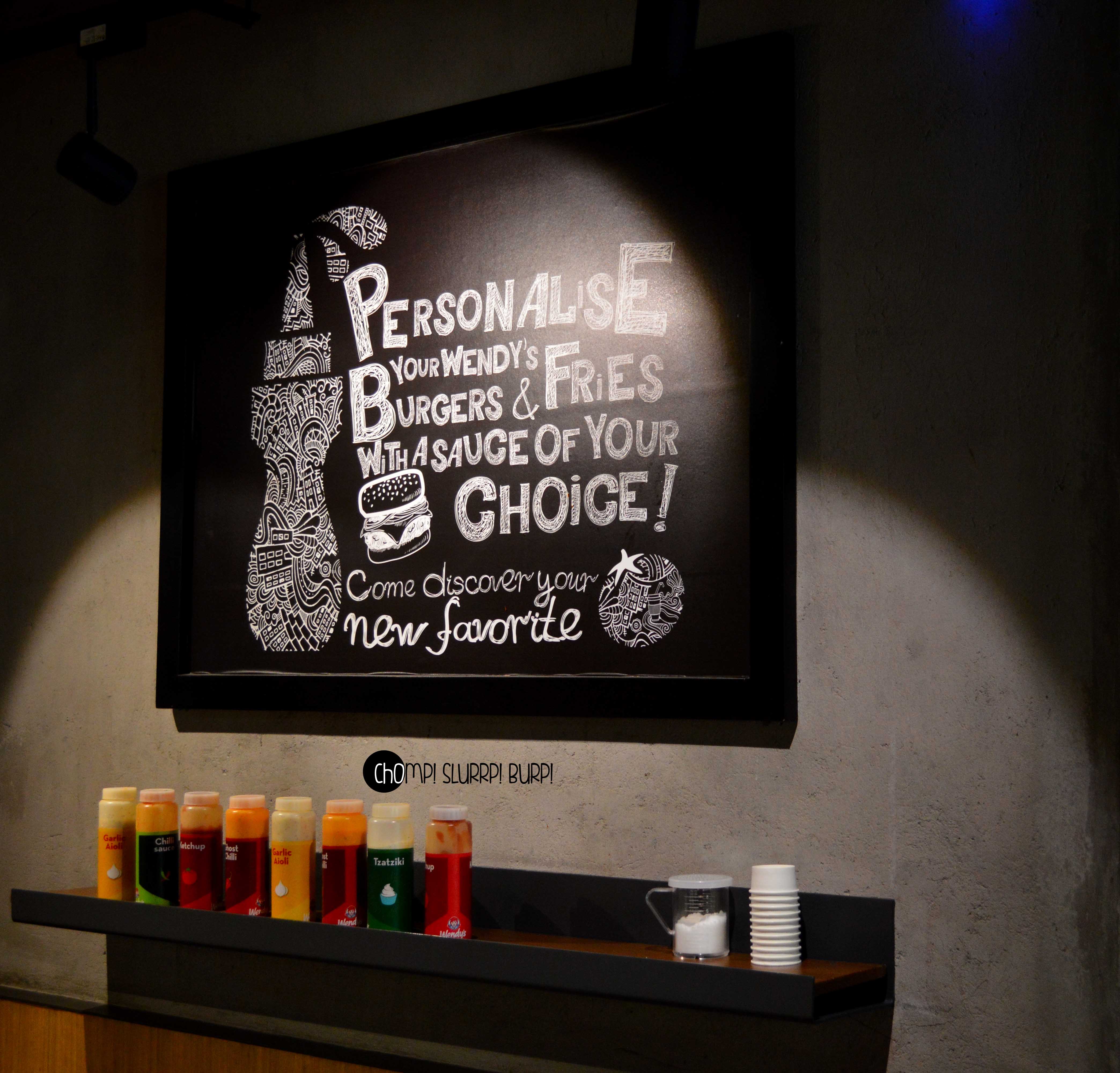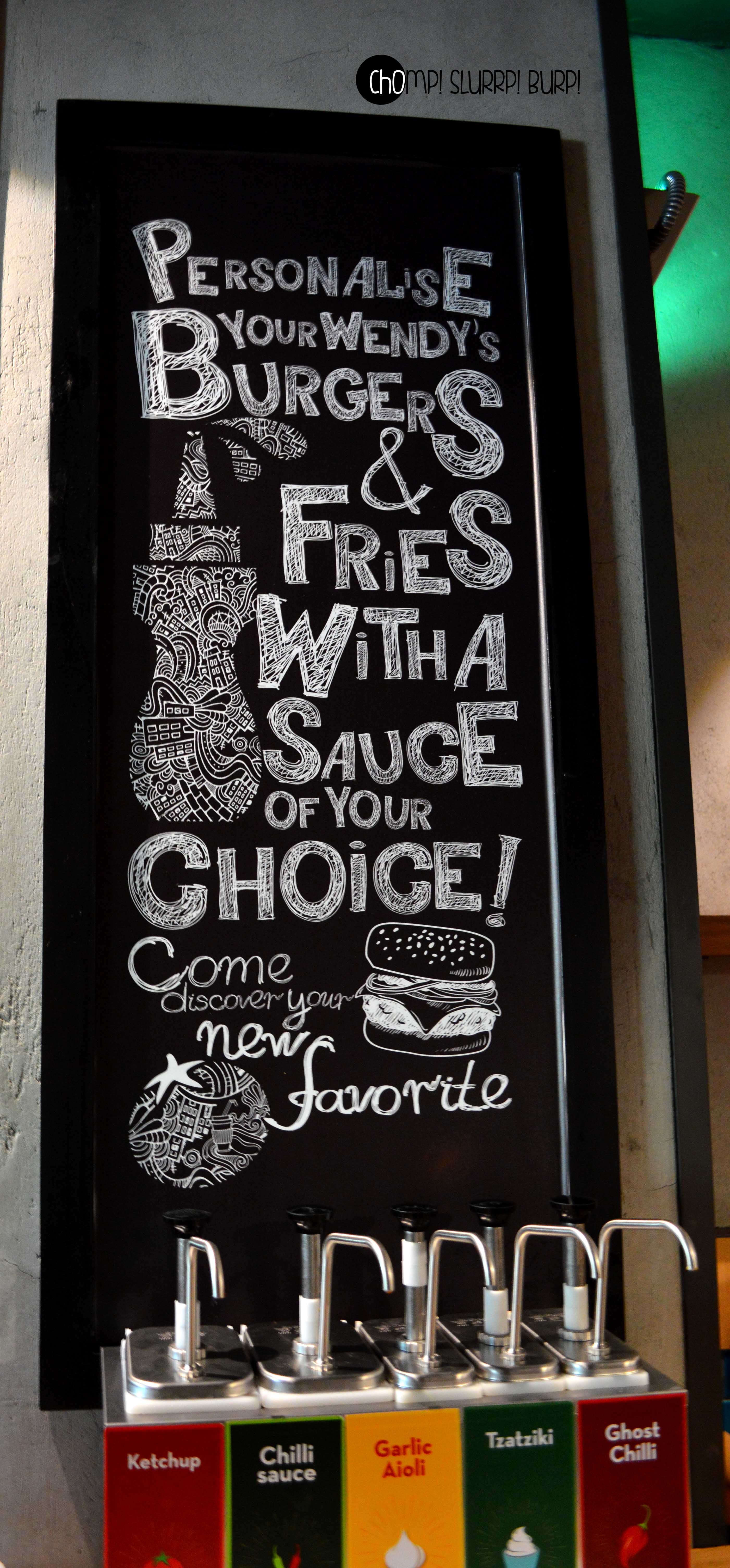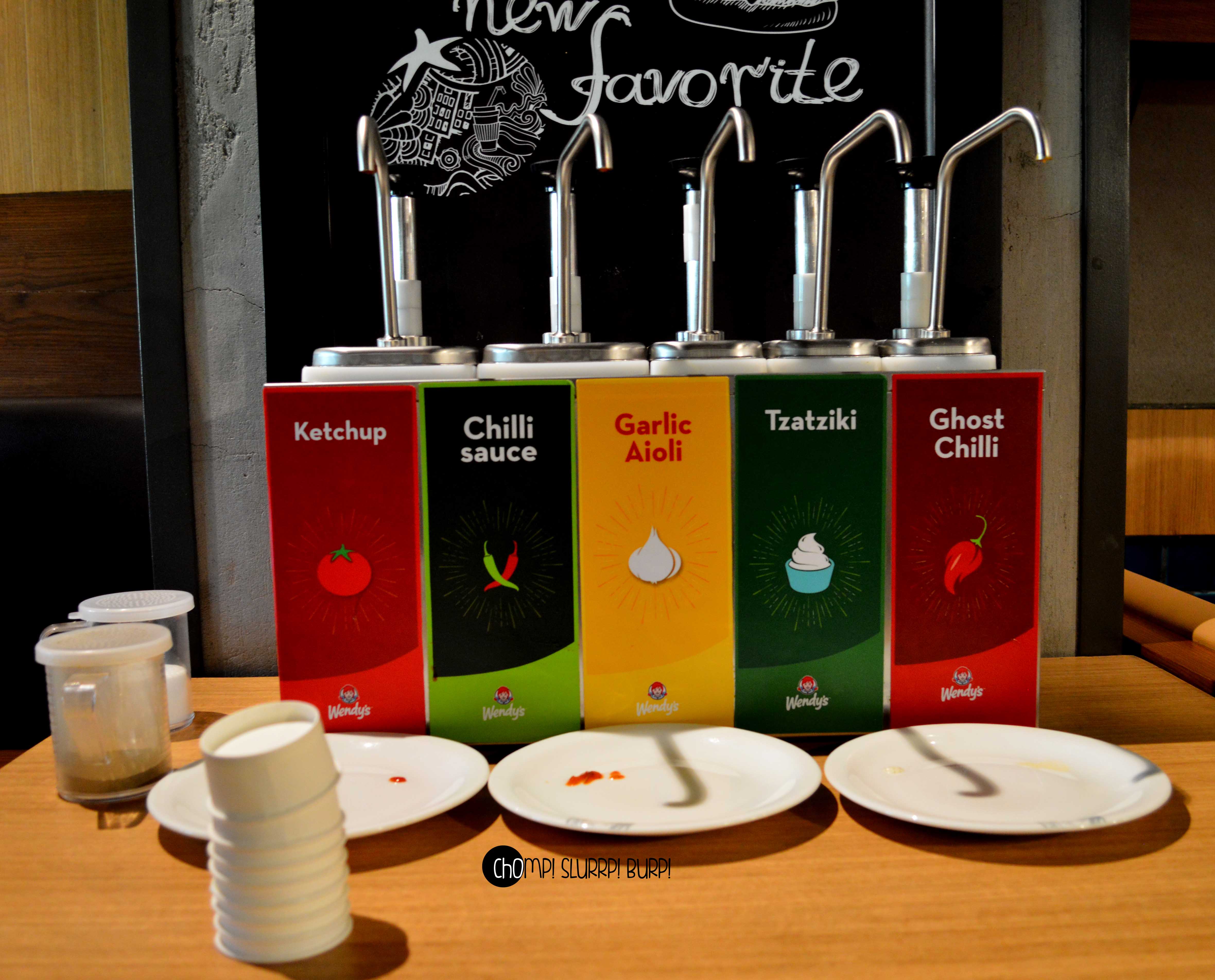 The place has a raw, rustic feel with graffiti cemented walls, teak tables, fixtures and lamps. Like most QSRs these days, you order on the counter and your order is served on your table. Wendy’s offers the most exquisite variety of sauces – ketchup, chilli ketchup, ghost chili, tzatziki and garlic aioli. You can either use them as a side dip or customize your burger with the dressing of your choice.My favourites were the very refreshing tzatziki and garlic aioli.