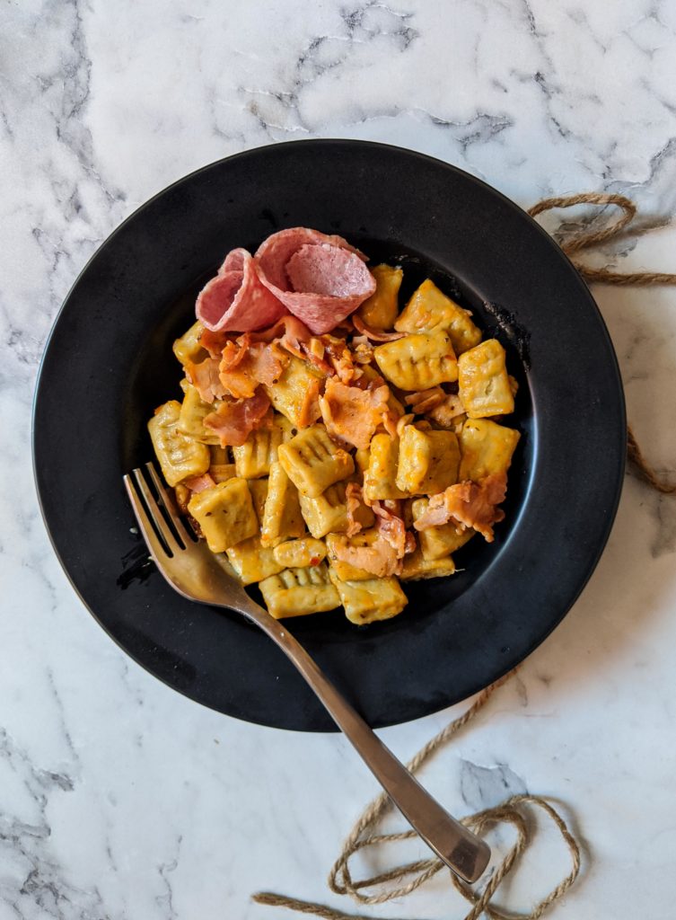 The idea of sweet potato gnocchi has always intrigued me. And after a rather successful batch of potato gnocchi, it was only a matter of time. Sweet potato gnocchi turned out to be slightly less fluffy than the regular one. Unlike all the Tasty videos, sweet potatoes here aren’t as orange in colour. But even whiter, so you won’t get that gorgeous colour, but a little sweet tinge of “shakarkandi”. Mine turned out to be a shade of yellow because of the organic egg that I used. Tossed it with 40% less fat bacon, and some tomatoes. Pretty neat for brunch, eh?