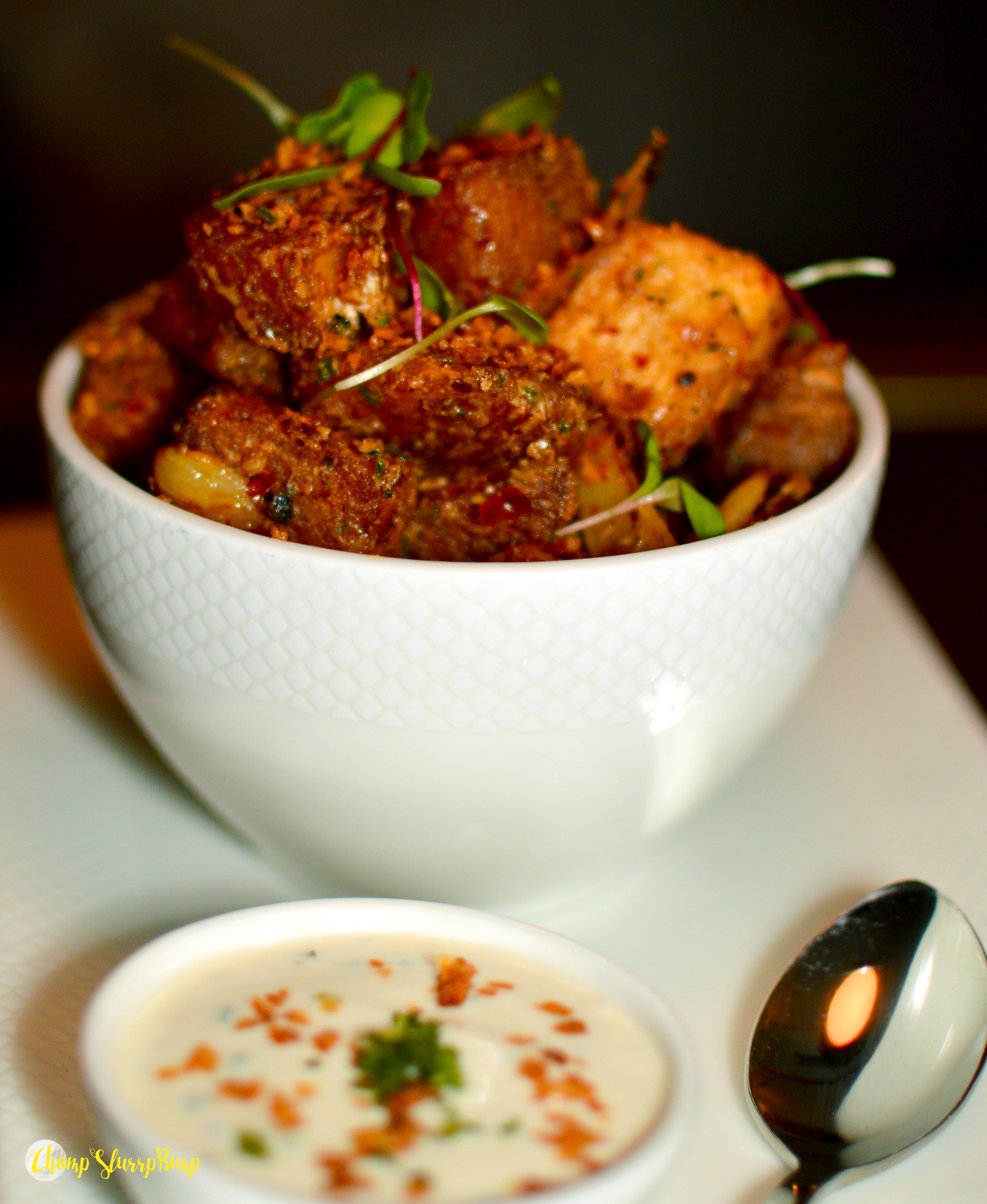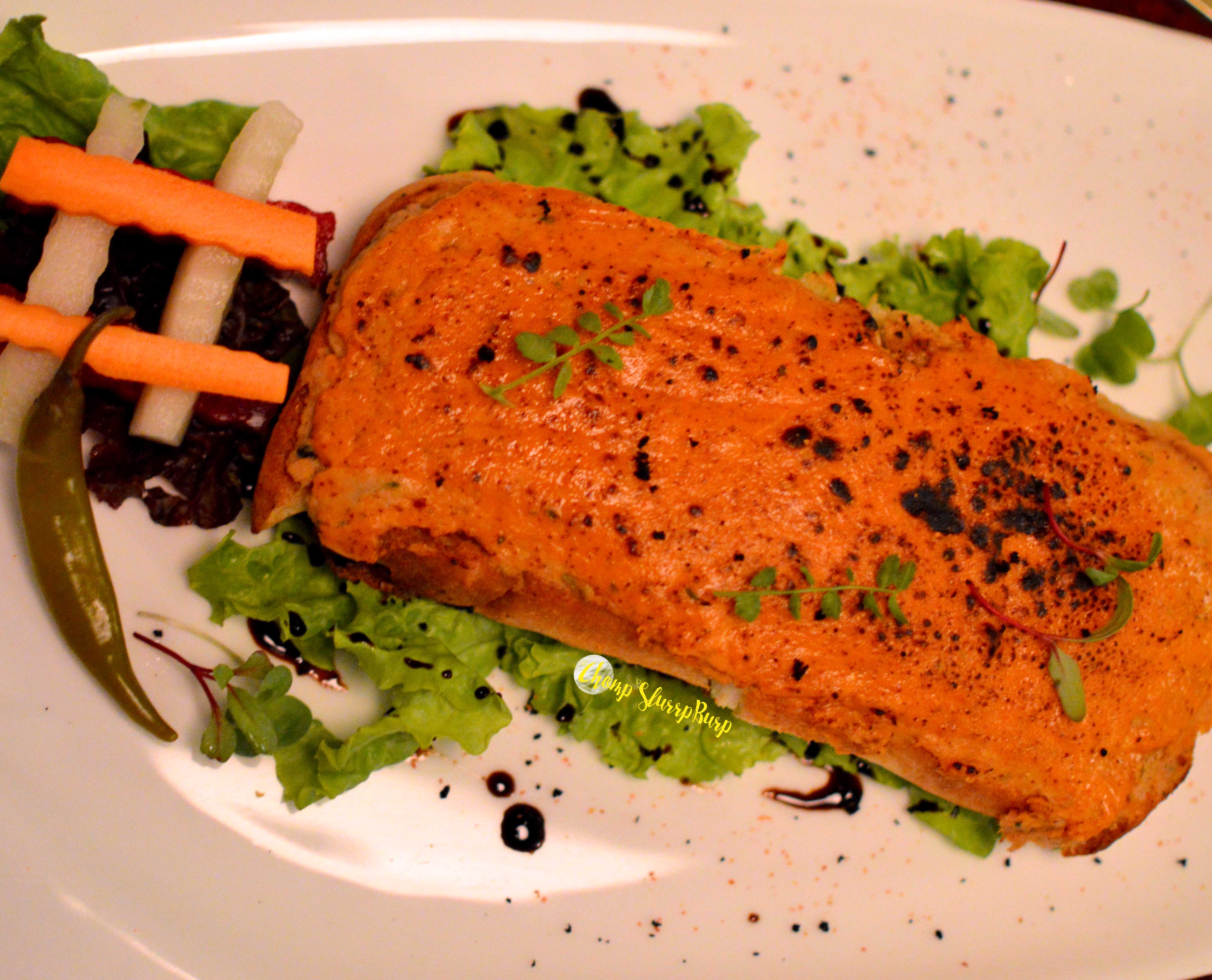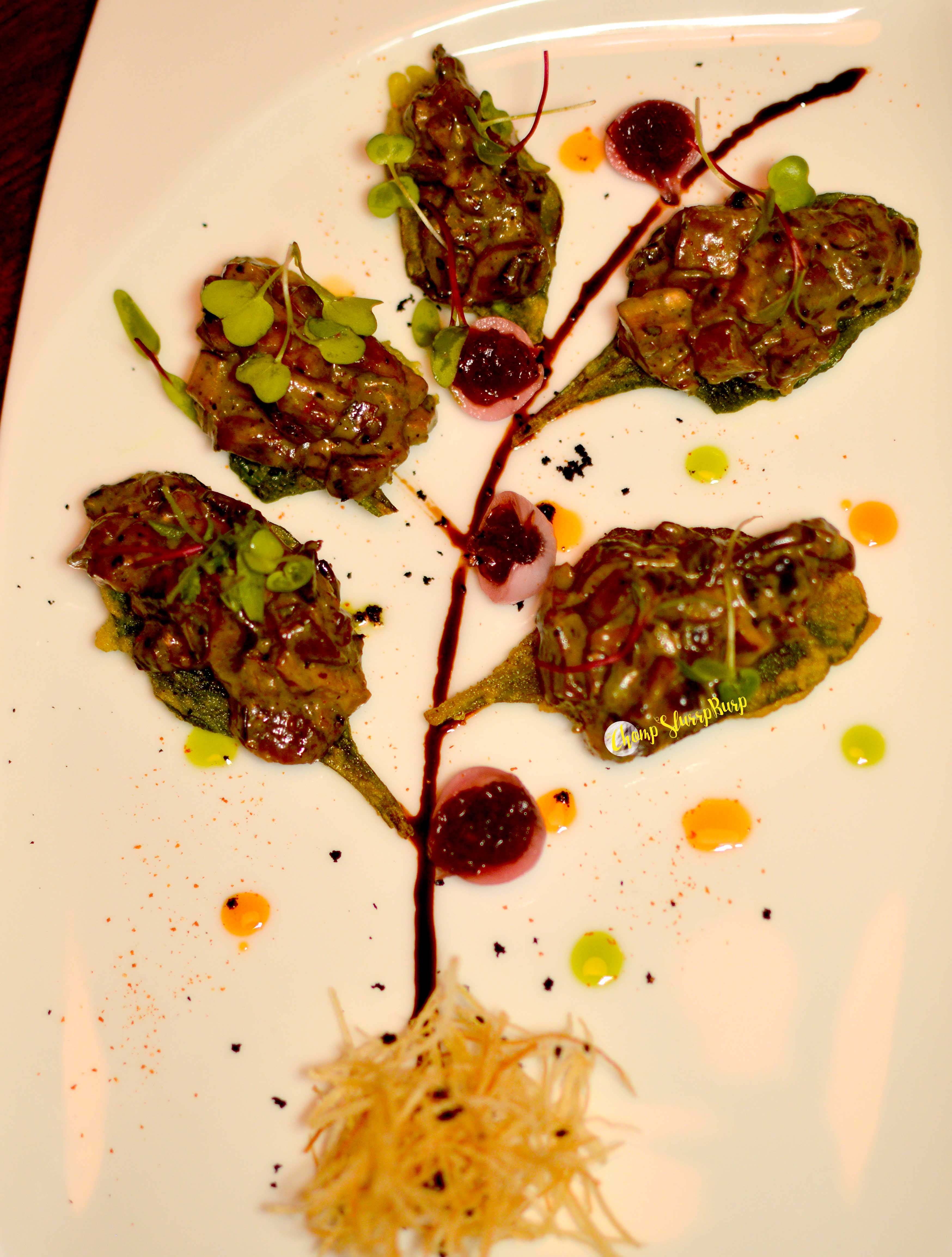 We started with Cassava Cubes – cassava roots coated with cornflour and tossed to a crunchy bite with chives, paired with sour cream spiked with burnt garlic, they will make for insanely good bar nibbles. The Spinach and Mushroom Tree – plated like a real tree with spinach leaves tempura fried and topped with mushroom ragout, balsamic vinegar and red onion marmalade, with ginger juliennes for roots. One of the classiest and so well curated dishes I have had in the longest time. Chicken leg mousse – a fresh baked bread, topped with smooth chicken mousse and dusted with traditional fermented Welsh cheese.