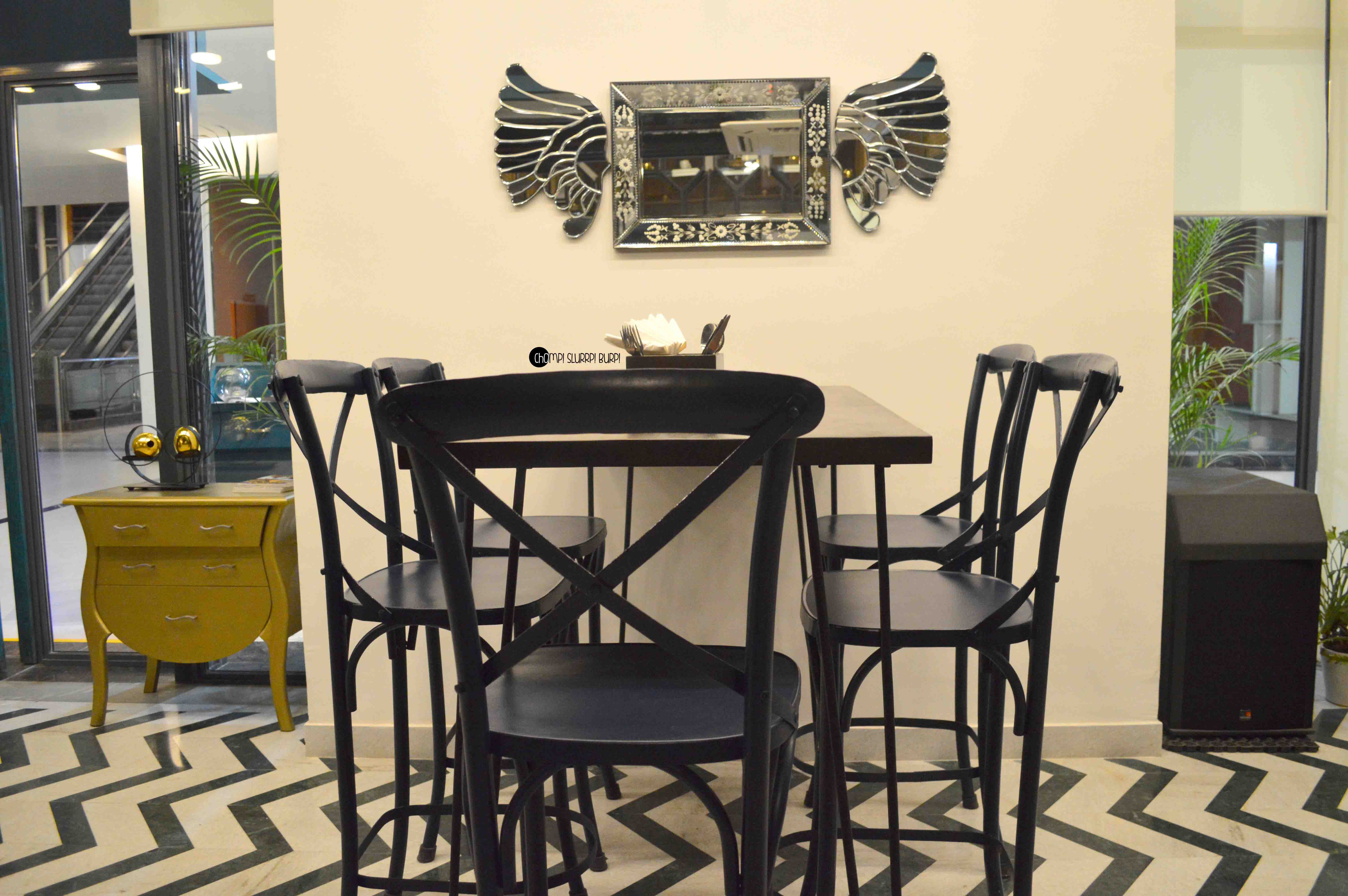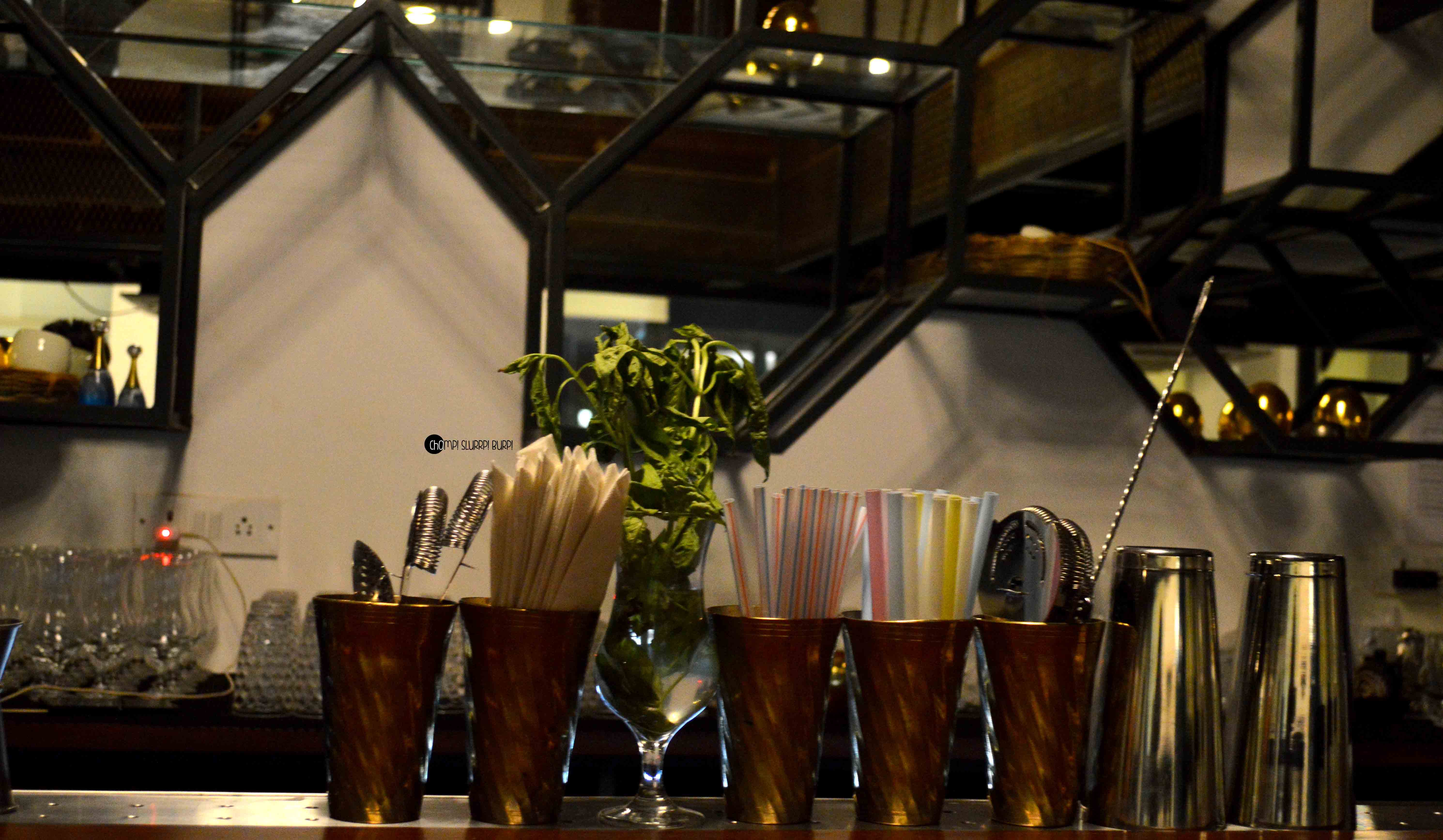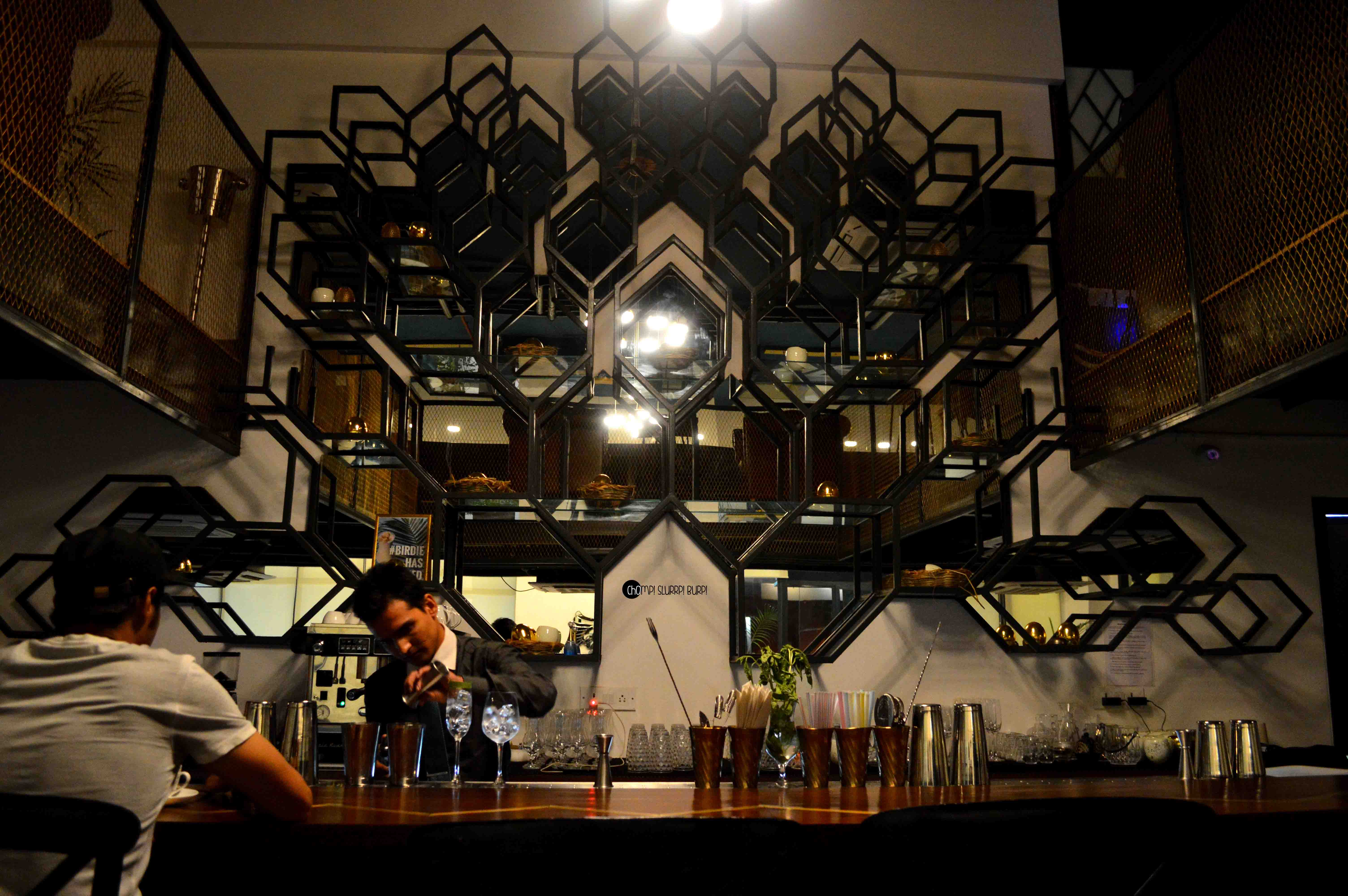Birdie Num Num brings back local Indian flavors and ingredients dowsed with some mind boggling mixology and a well planned decor. Located at Golf Course Road, they are set to open their doors next month. The place is prominently bathed in shades and hues of blue adding to the opulence against white. The chevrons and hexagons make for quite a wicked backdrop against the bar.