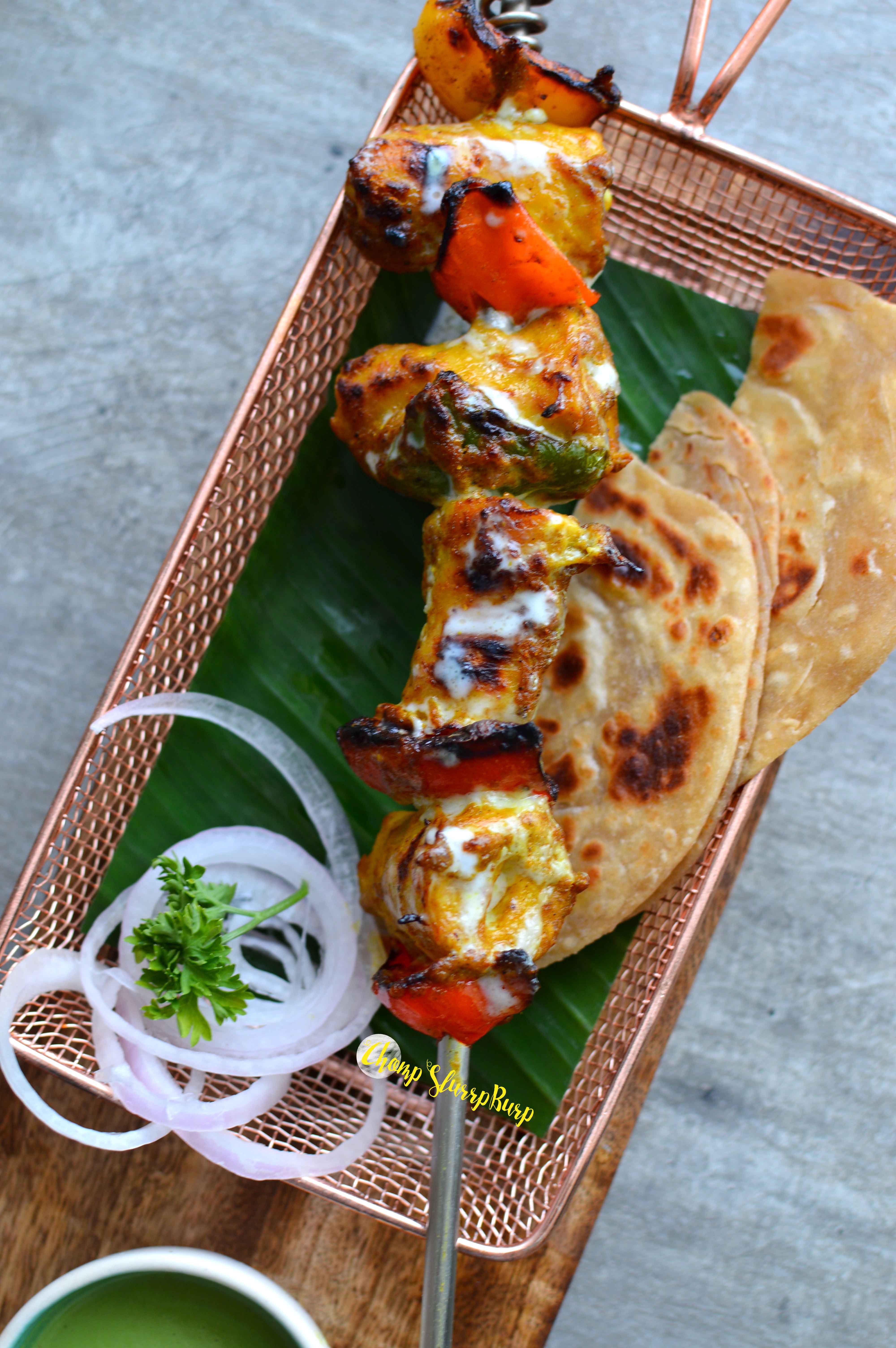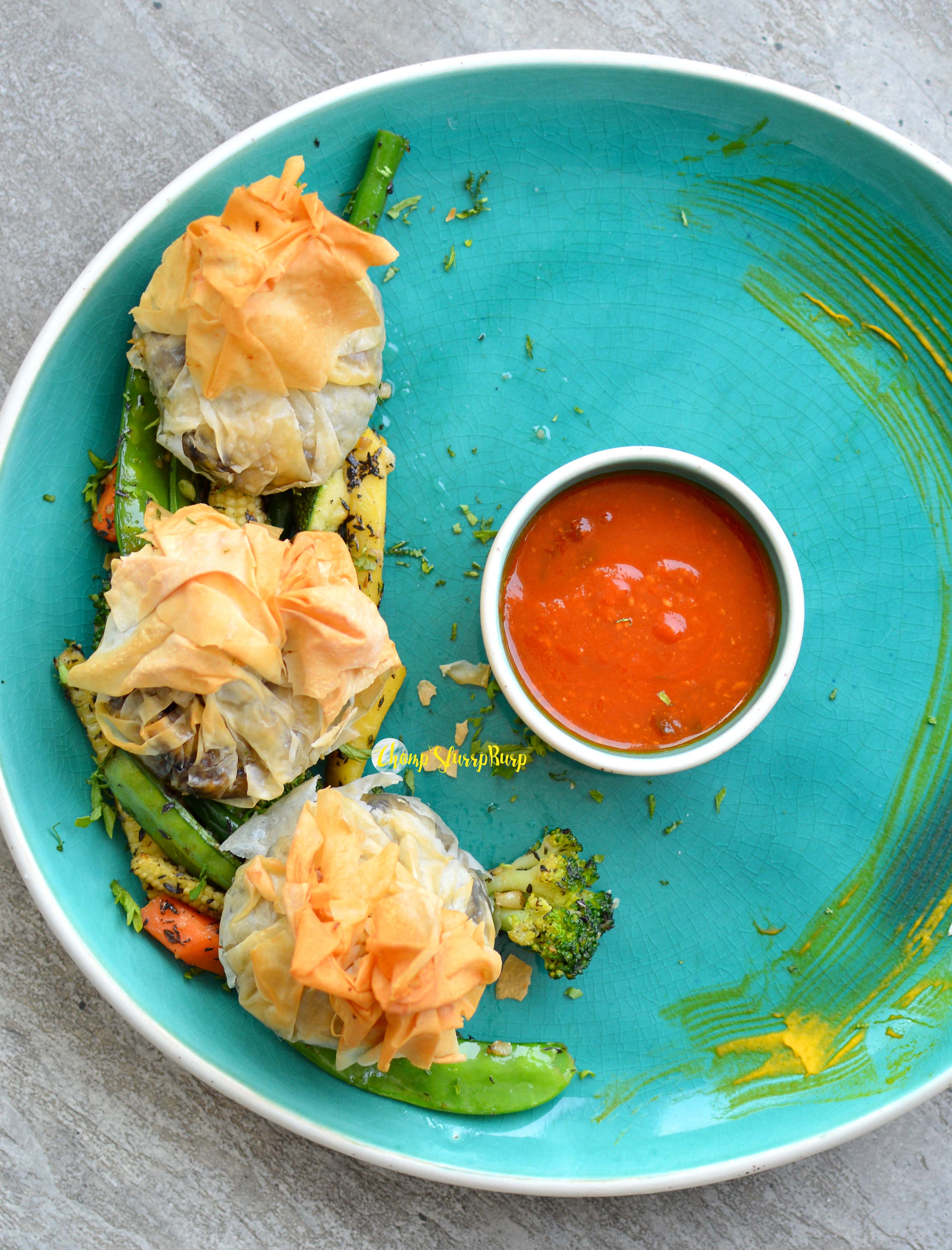 Story of mushrooms – beautiful mushroom phyllo bags, grilled vegetables and fresh tomato sauce. The medley of mushrooms with a bit of cheese is an excellent bite. Noor Mohammadi style mutton seekh – this was mind blowing! Served with paranthas, these seekh kebabs were pound and grilled to perfection. Mixed with spices and the melt in mouth texture makes these an easy win for the day. Soya Boti Kebab – soya chaap, bell pepper lightly brushed with cream and served with paranthas. The soya chaap should have been more succulent and creamier. Thai shrimp cakes – minced prawns, sweetcorn with lemongrass, deep fried to a yummy crunch and served on coleslaw and micro greens. The coleslaw didn’t quite add up with the delicious Thai flavors, but the cakes are delish. Chicken Espetada – chicken pieces well marinated and grilled, served with a fresh green salad.