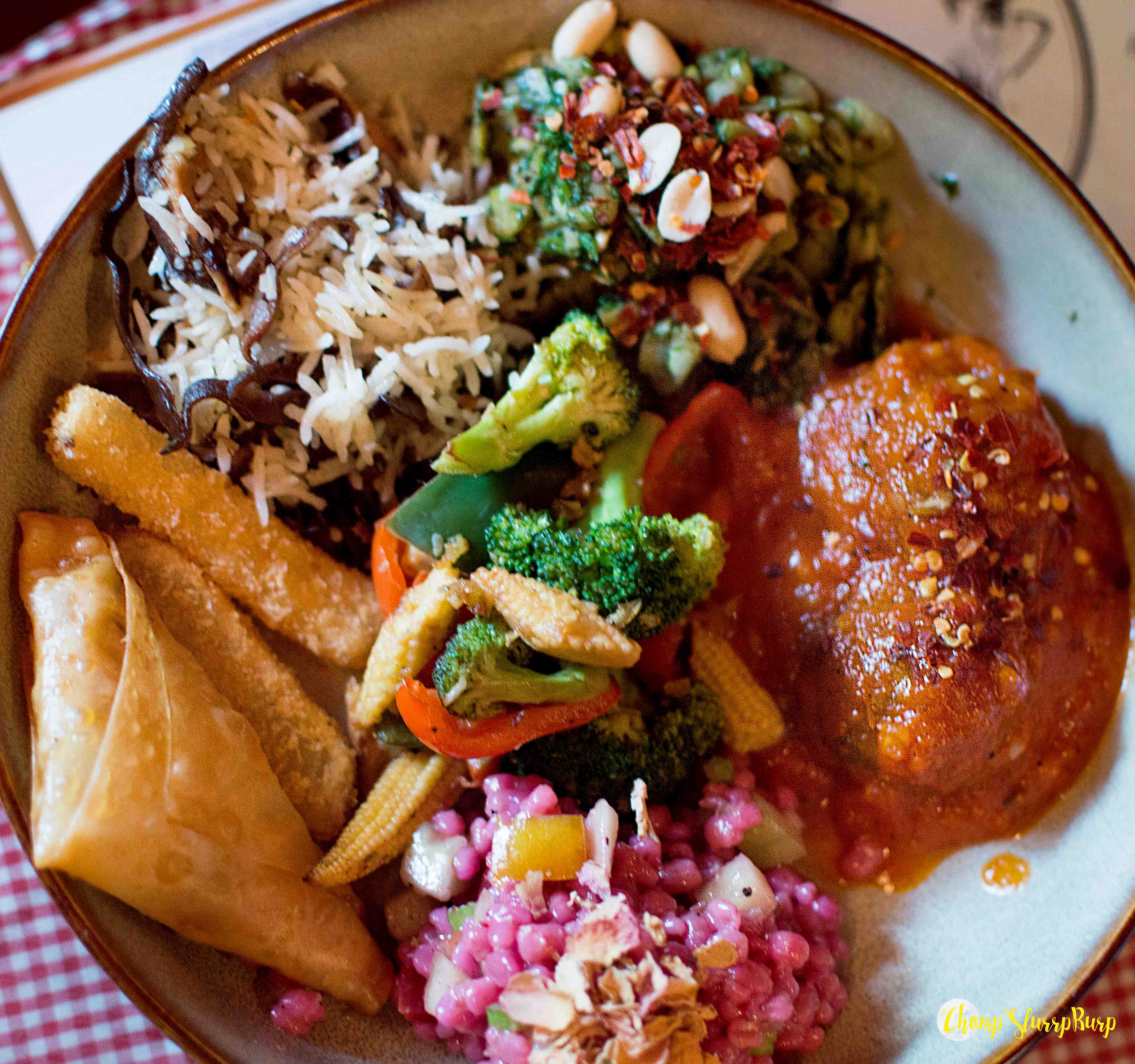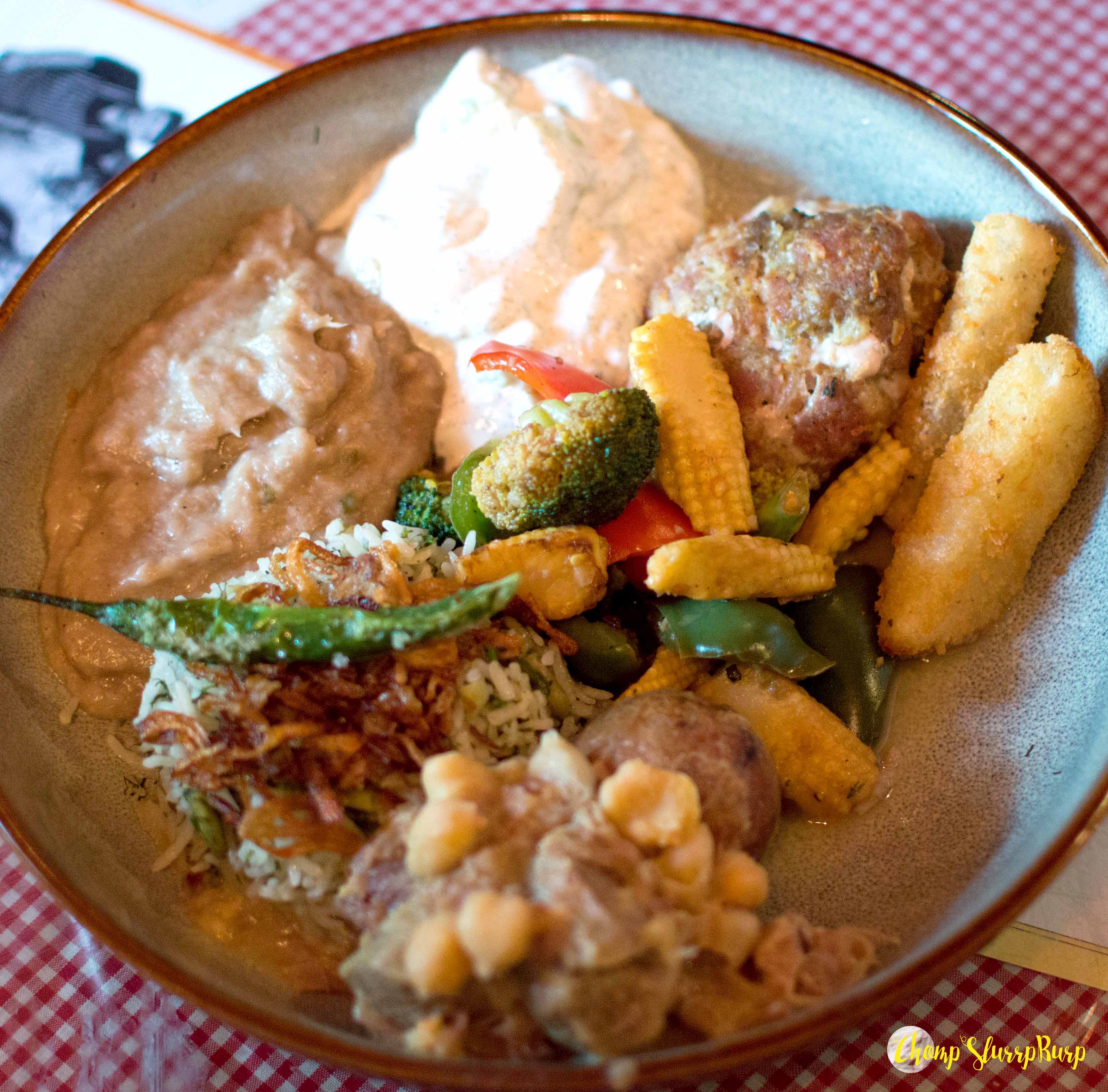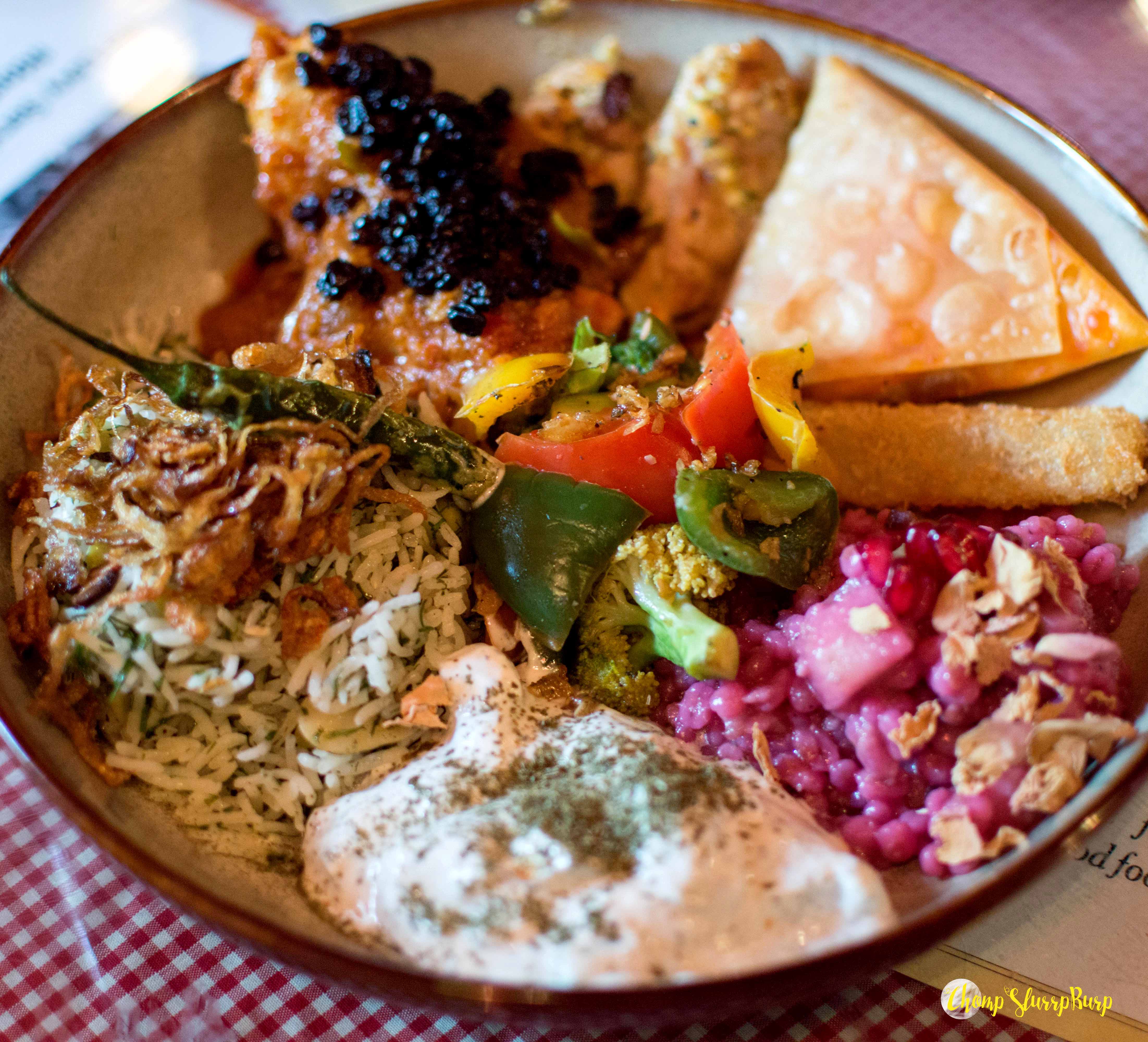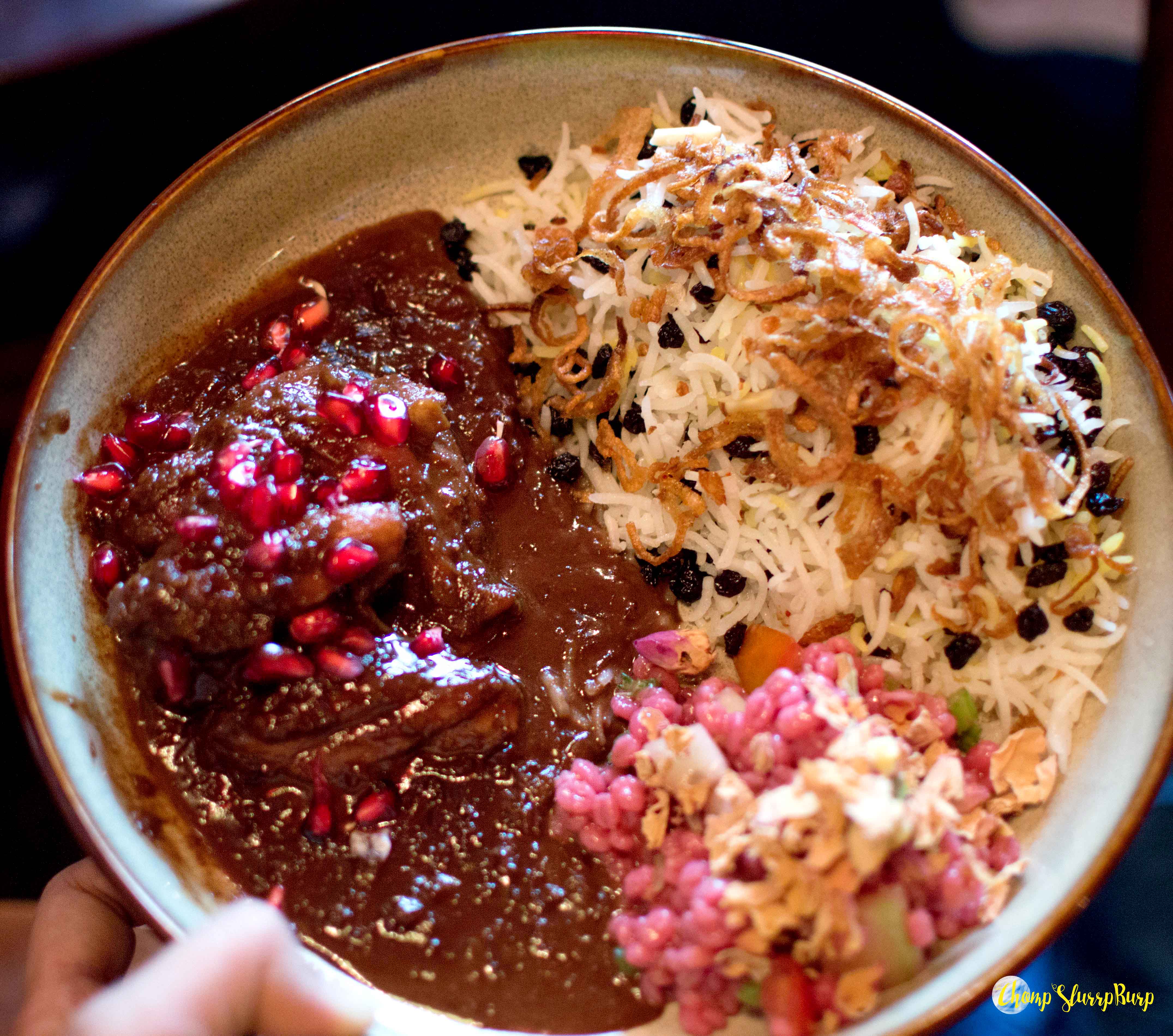 The meal bowls – Vegan bowl – spicy vegan kufte with a thick tomato gravy, three mushroom rice, sanboose – mixed veggies in a crisp pastry, sauteed vegetables, barley and cucumber salads, fava beans and potato sticks. Persian chicken bowl – served with chicken in tomato sauce with berries and fava bean rice. The chicken sanbooseh, much like samosa with minced chicken and a buttery, crisp patty. Persian mutton bowl – black lime mutton shank with chickpeas, mutton cutlet and mutton haleem. Fesenjan – chicken cooked with walnut and pomegranate, this sweet and sour chicken with a thick gravy is a little pungent which gives it its uniqueness.