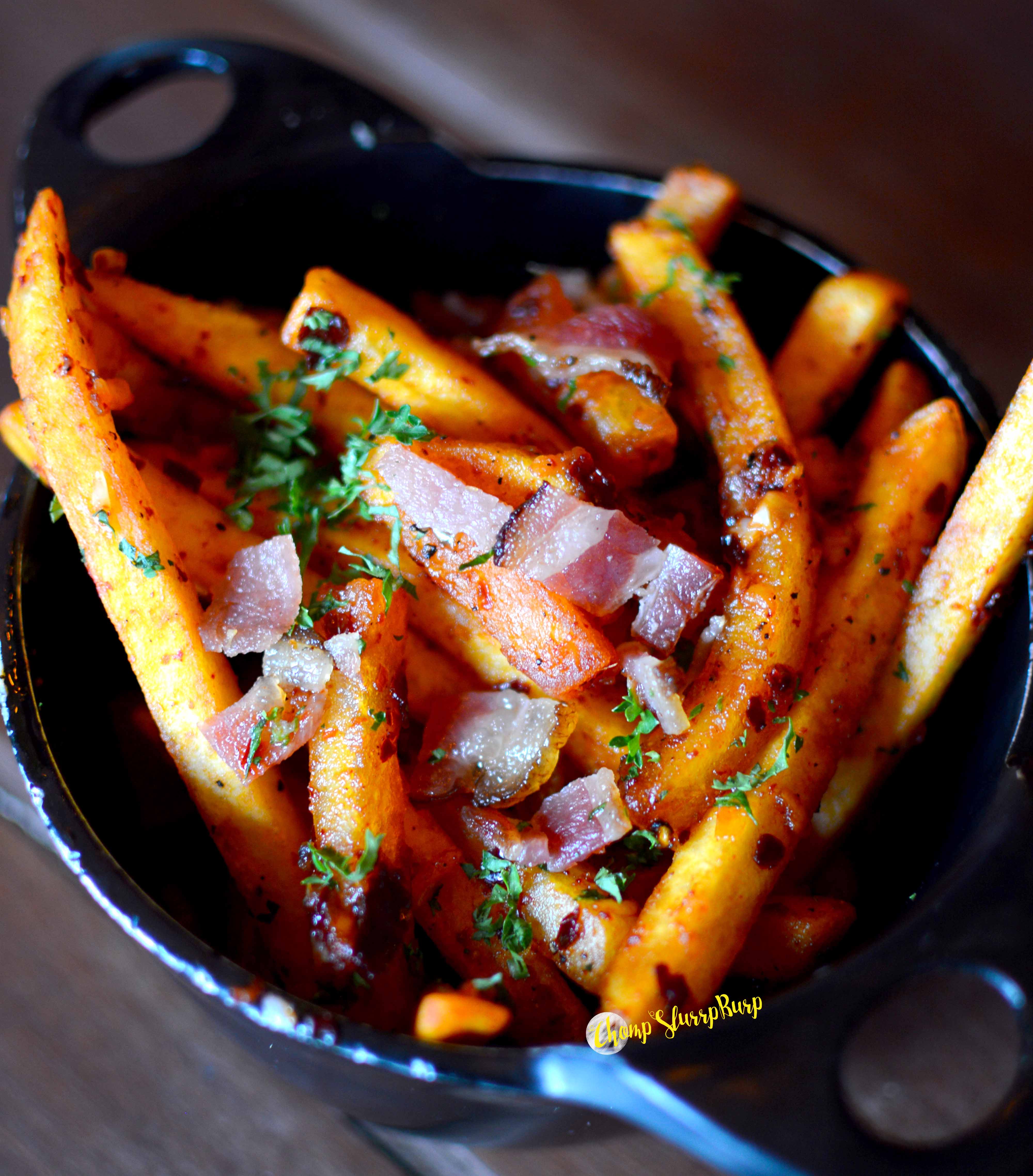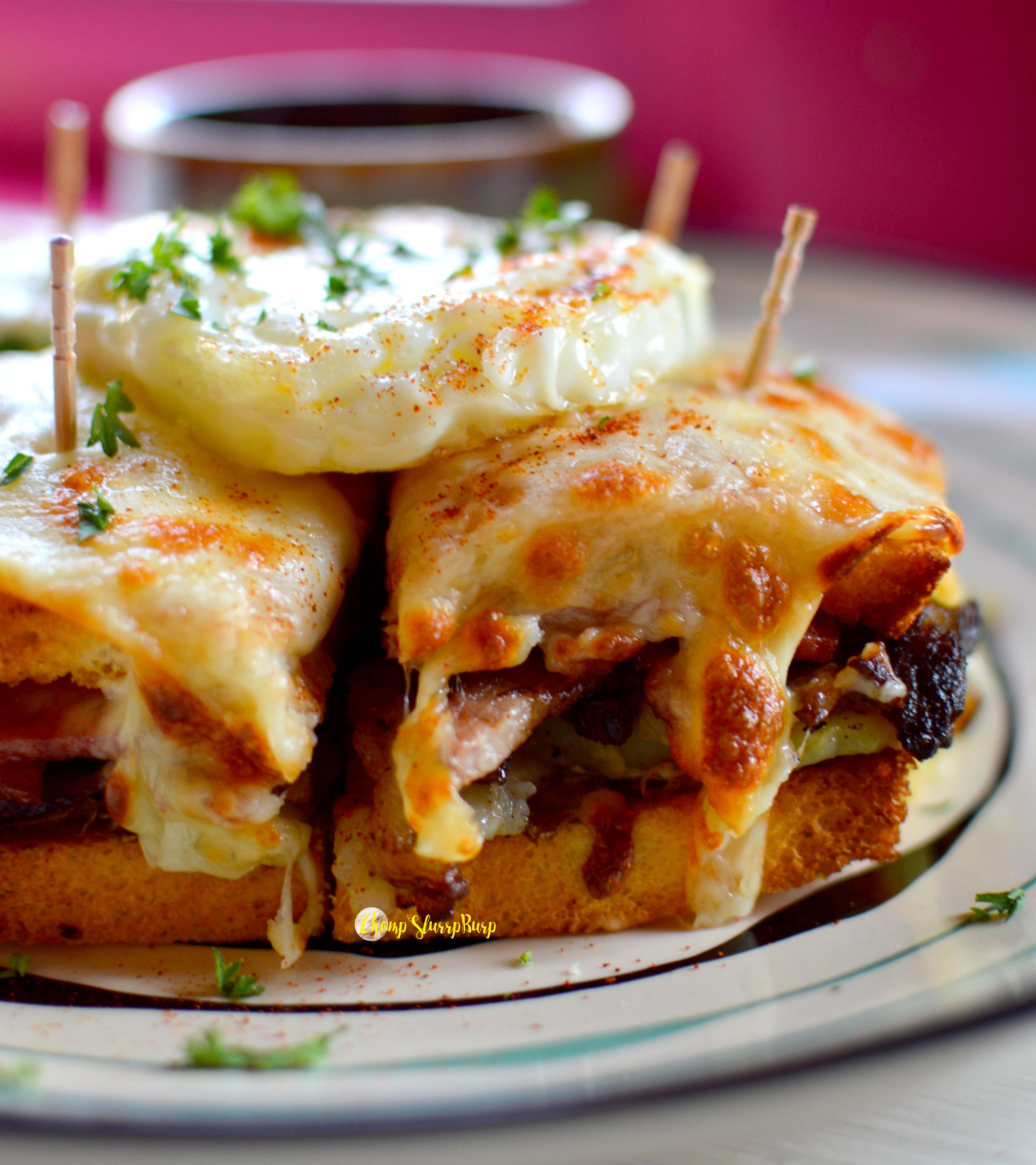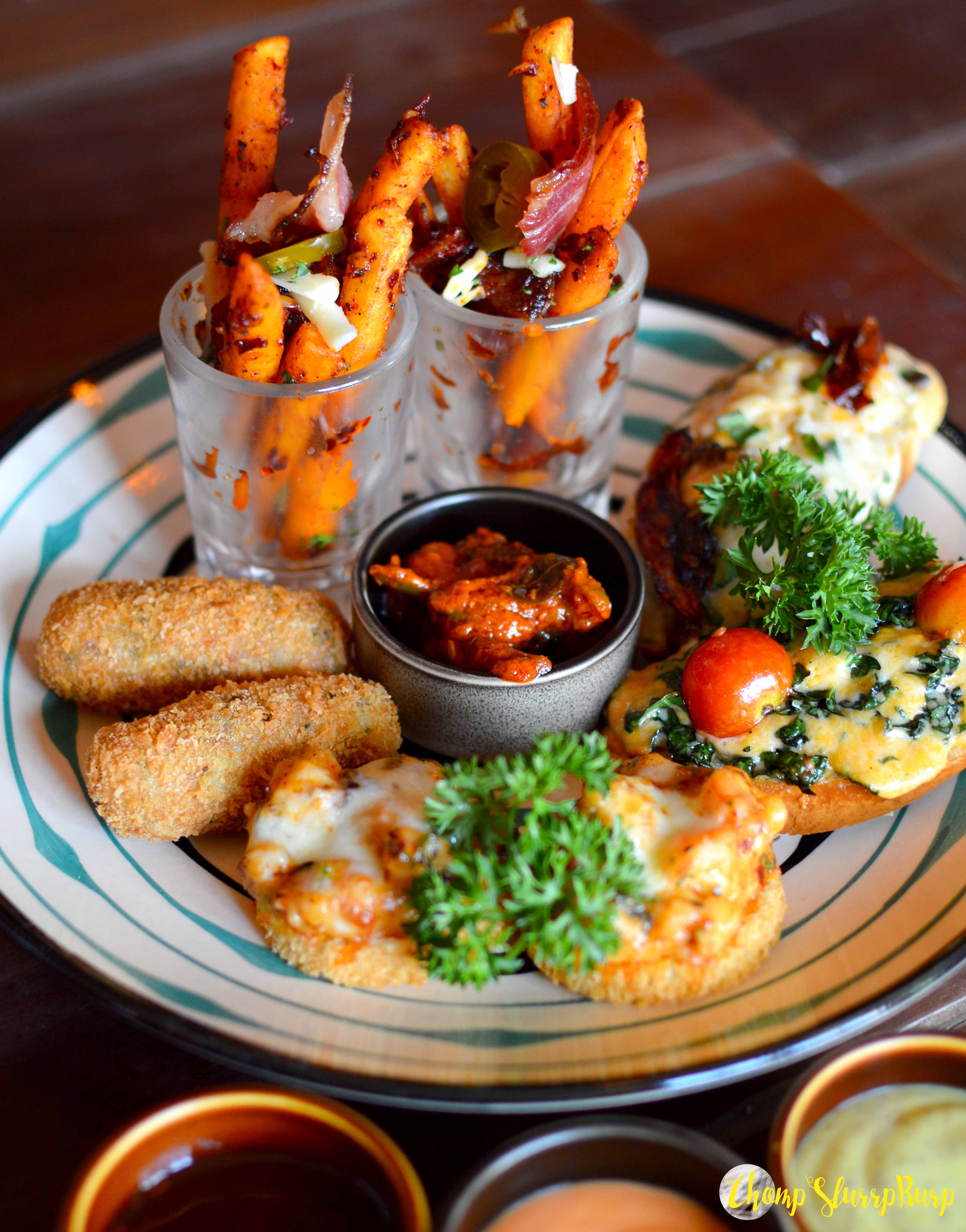Vinhad’alhos Stuffed Mushrooms – button mushrooms stuffed with herds, yellow cheddar and baked with a splash of white wine, again a very cheesy bite balancing the flavors with the herbs. Almondegas de Pixie Fish Cakes – Baked in cutesy silicon cups, these fish cakes topped with cheese and crunchy greens makes for a very tantalizing and fusion bite. Francesinha Pork Sandwich – this club sandwich is what dreams are made of. Toasted bread sandwiching succulent pork belly, sticky smoked bacon, baked with lots of cheese and topped with a fried egg. The meaty cheese loaded sandwich paired with one of their cocktails is ideal for brunch.