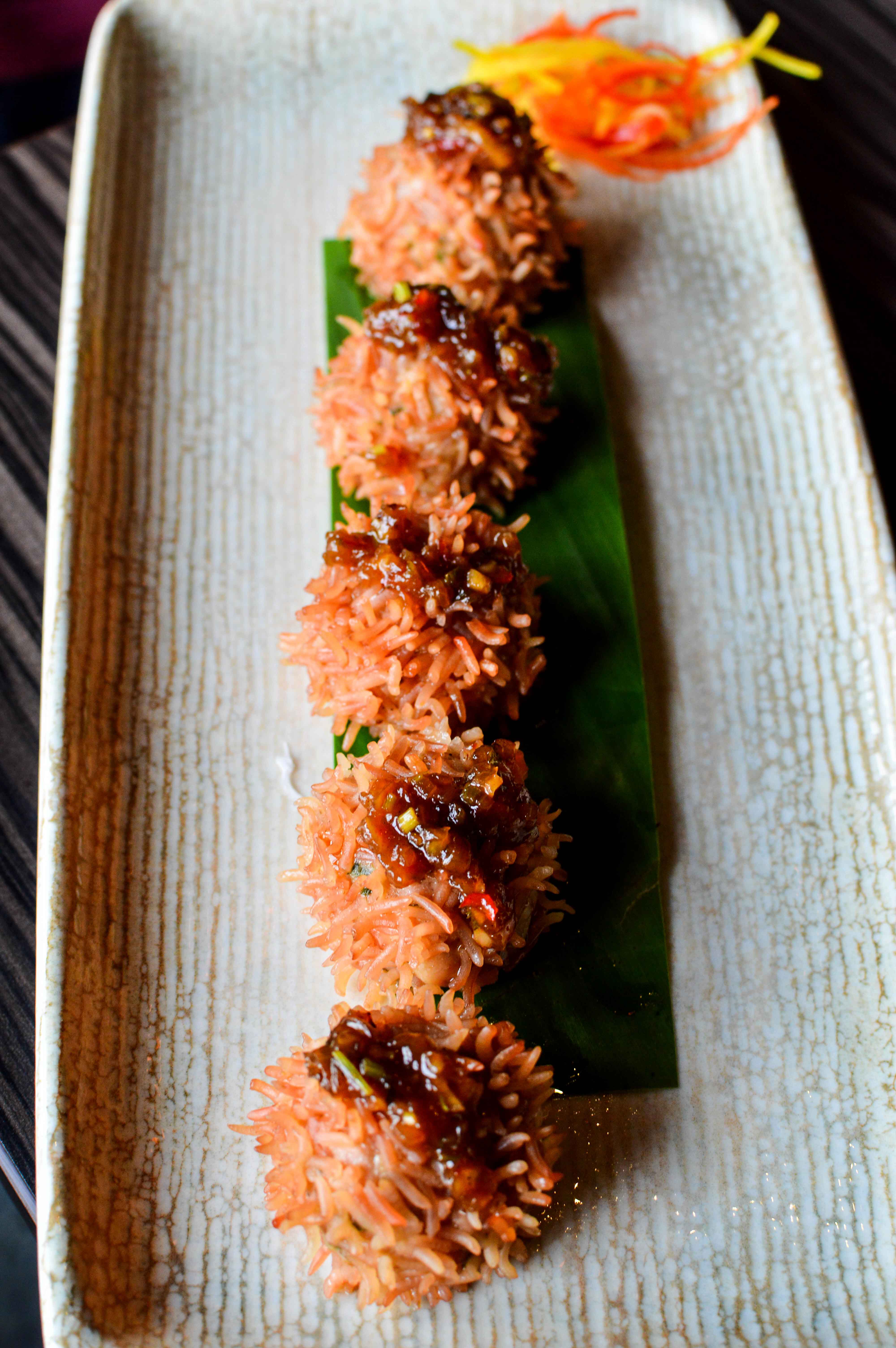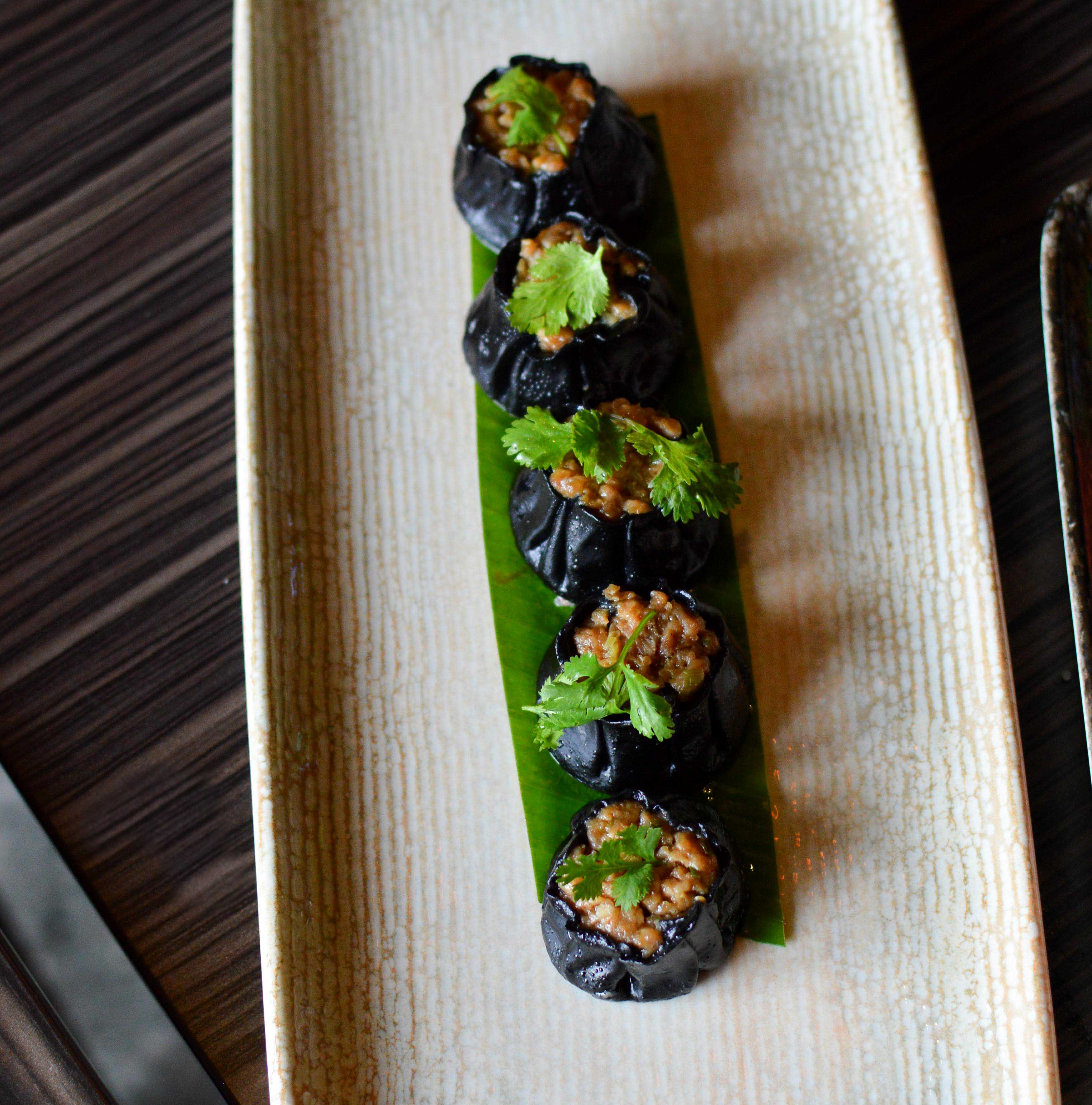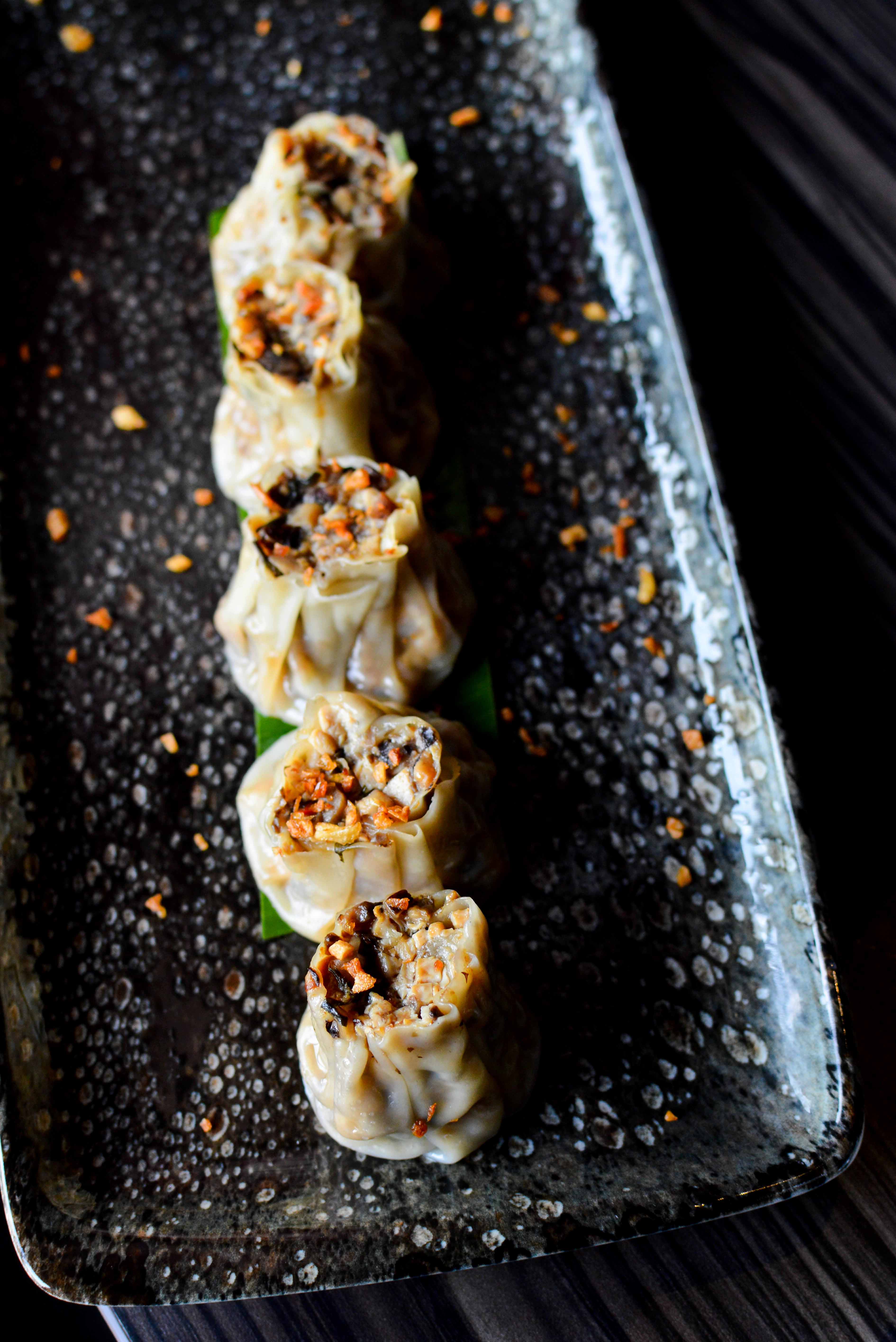 We were amazed by The Naked Cactus. Well done chicken rolled into balls with rice stuck on it like a cactus. The tummy sauce with it added another level of flavor but the dish was complete on its own. Peek-a-Boo was another spectacular preparation. Assortment of mushroom, steamed in a perfect thin skin. Topped with fried garlic, this was an absolute winner. Prawns Bloody Mary Hargao were served in a sort of weird egg tray with shells. A little disappointing, prawns were apparently marinated in bloody mary mixture before steaming them. They were served with coriander broth that didn’t go too well with dimsums. Lamb Sui Mai – another charcoal preparation. This was insanely good. Succulent meat, in a charcoal black skin, steamed to perfection.