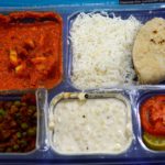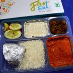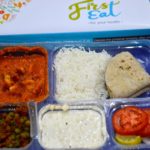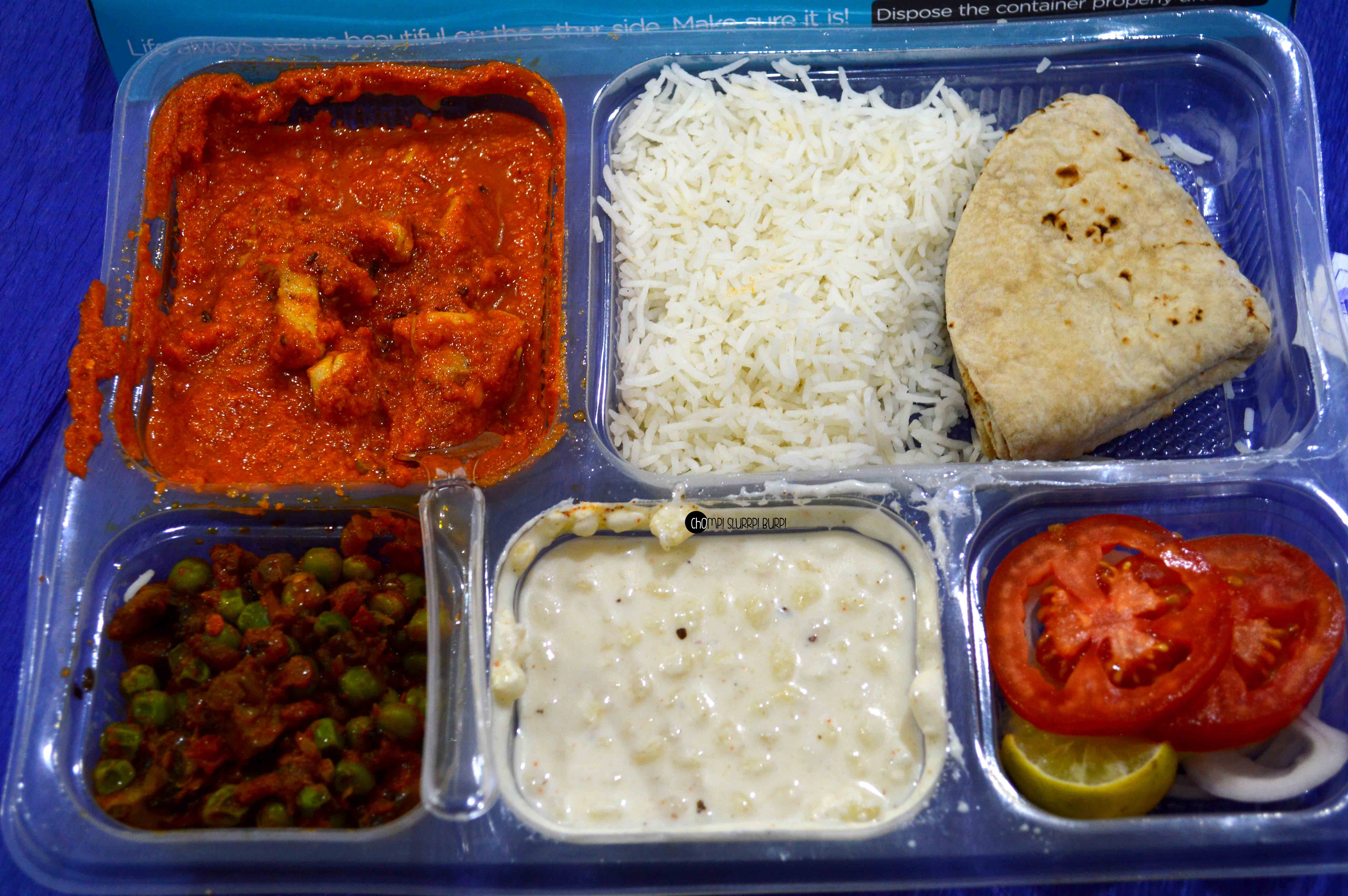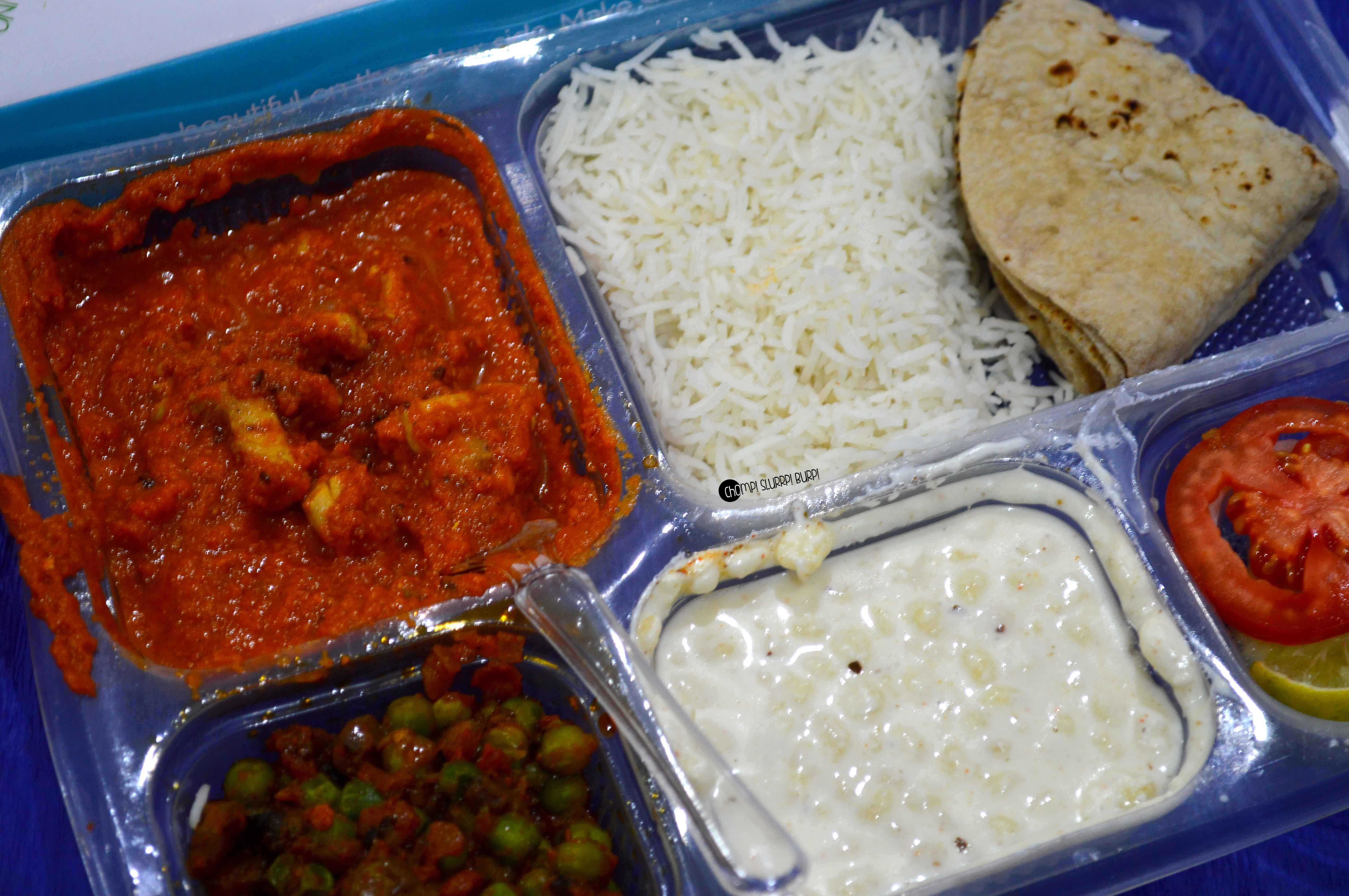 I tried out their vegetarian and non-veg thalis. The packaging is peppy and very neat. Both thalis come with a chicken/paneer curry dish, a vegetable of the day – matar mushrooms today, rice, roti, raita and salad.